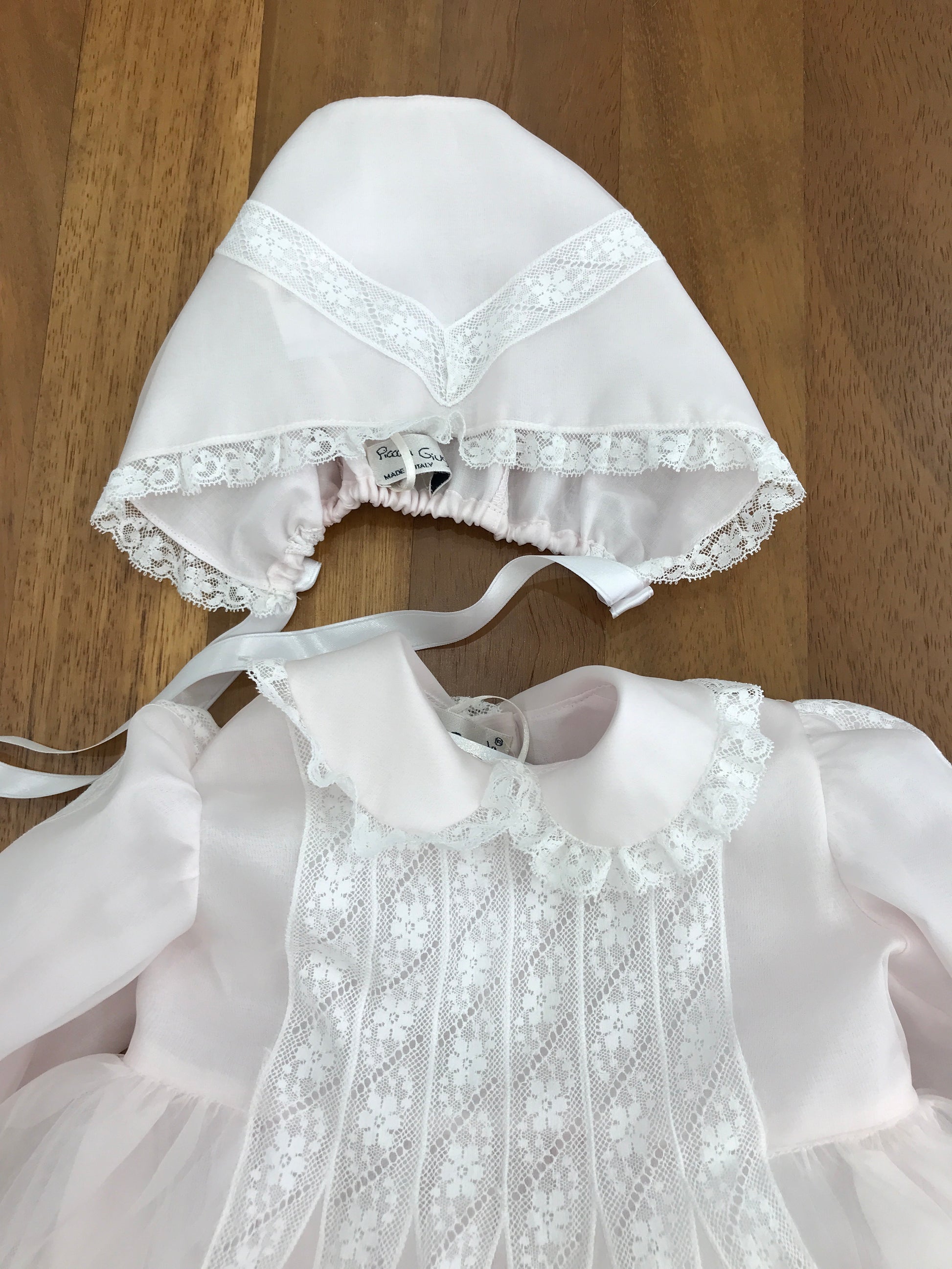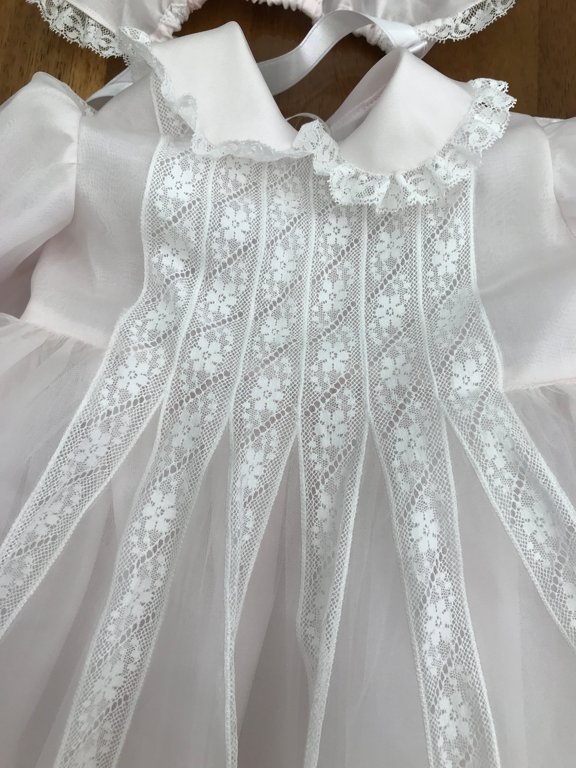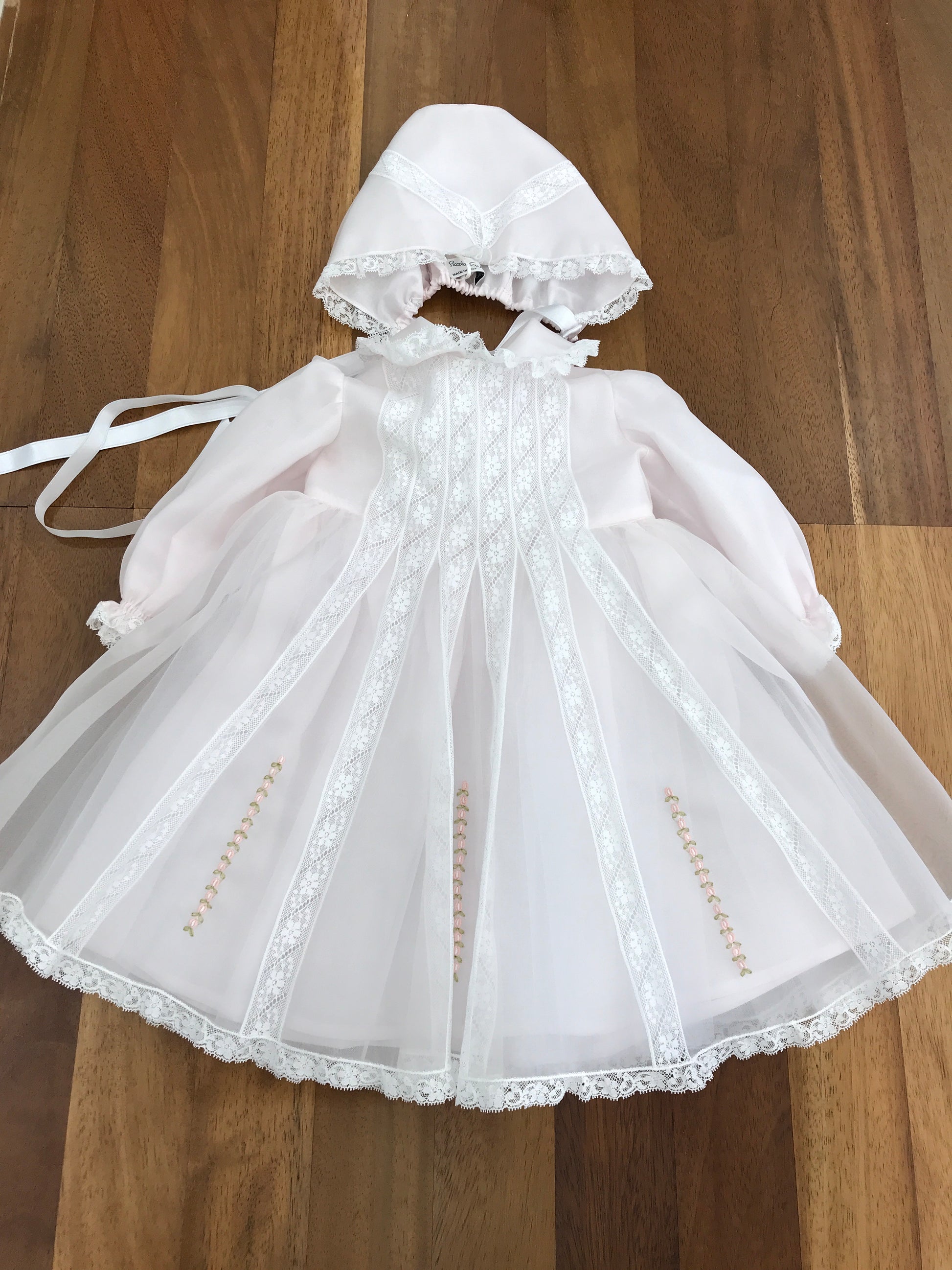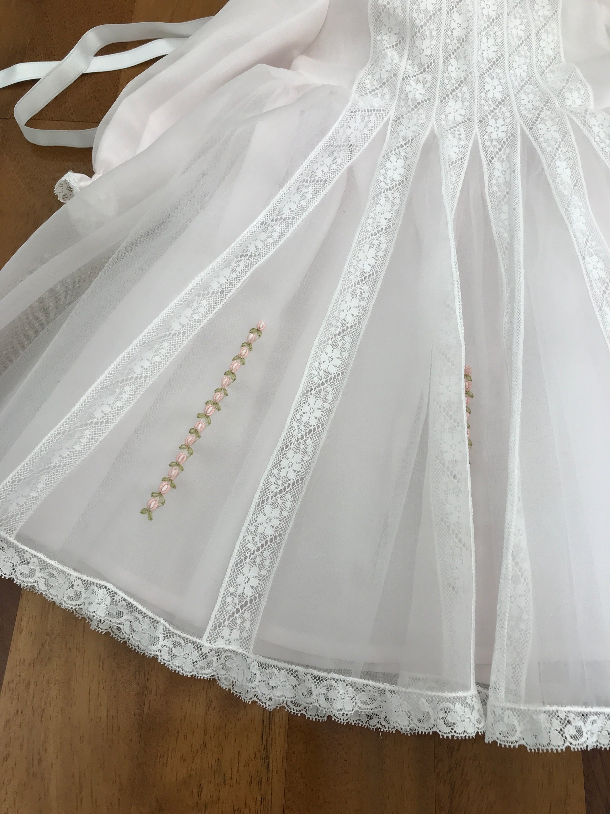 Questo abito realizzato in organza di seta presenta maniche lunghe e una gonna piramidale a ventaglio che crea un effetto voluminoso e sofisticato. Sulla gonna è applicato un raffinato inserto in pizzo Valençienne, decorato con una catena di piccoli fiorellini ricamati a mano, che aggiunge un tocco artigianale e prezioso al design. Gli stessi dettagli in pizzo sono riproposti con cura anche sul corpetto e sulle maniche, garantendo coerenza estetica e un’eleganza senza tempo. Questa combinazione di tessuti pregiati e lavorazioni manuali rende l’abito un capo unico e sofisticato, perfetto per occasioni speciali.