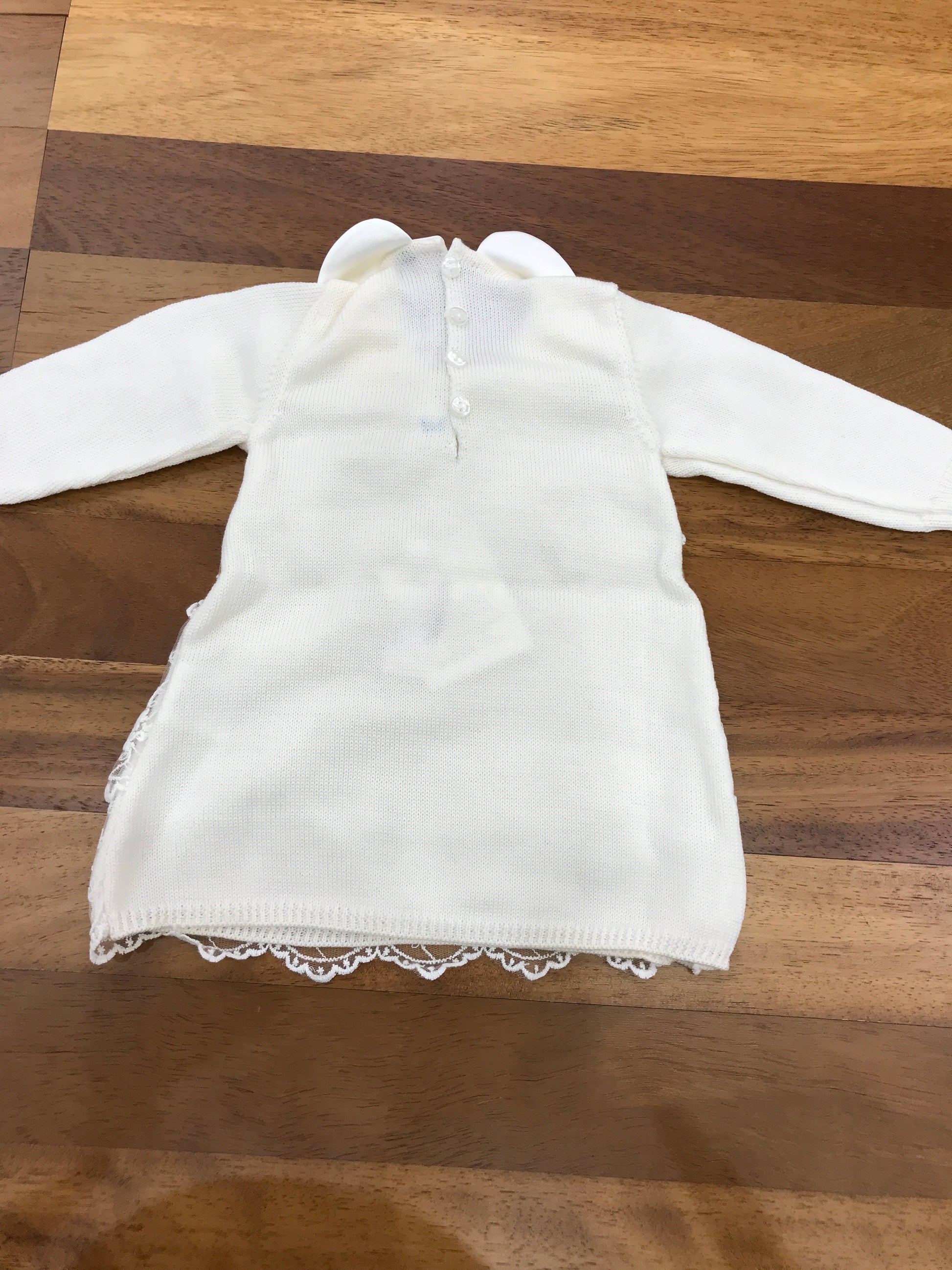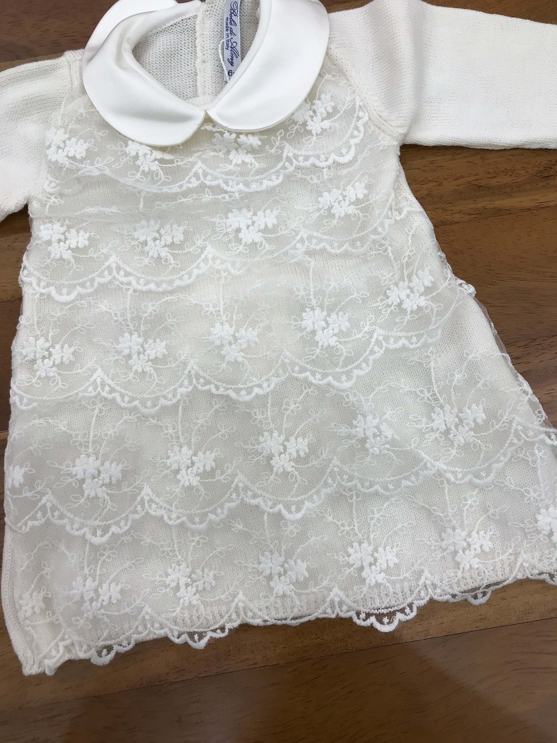 Questo abitino in lana per bebè è arricchito da un delicato merletto ricamato che copre l'intera superficie del capo, completato da un elegante colletto in raso.