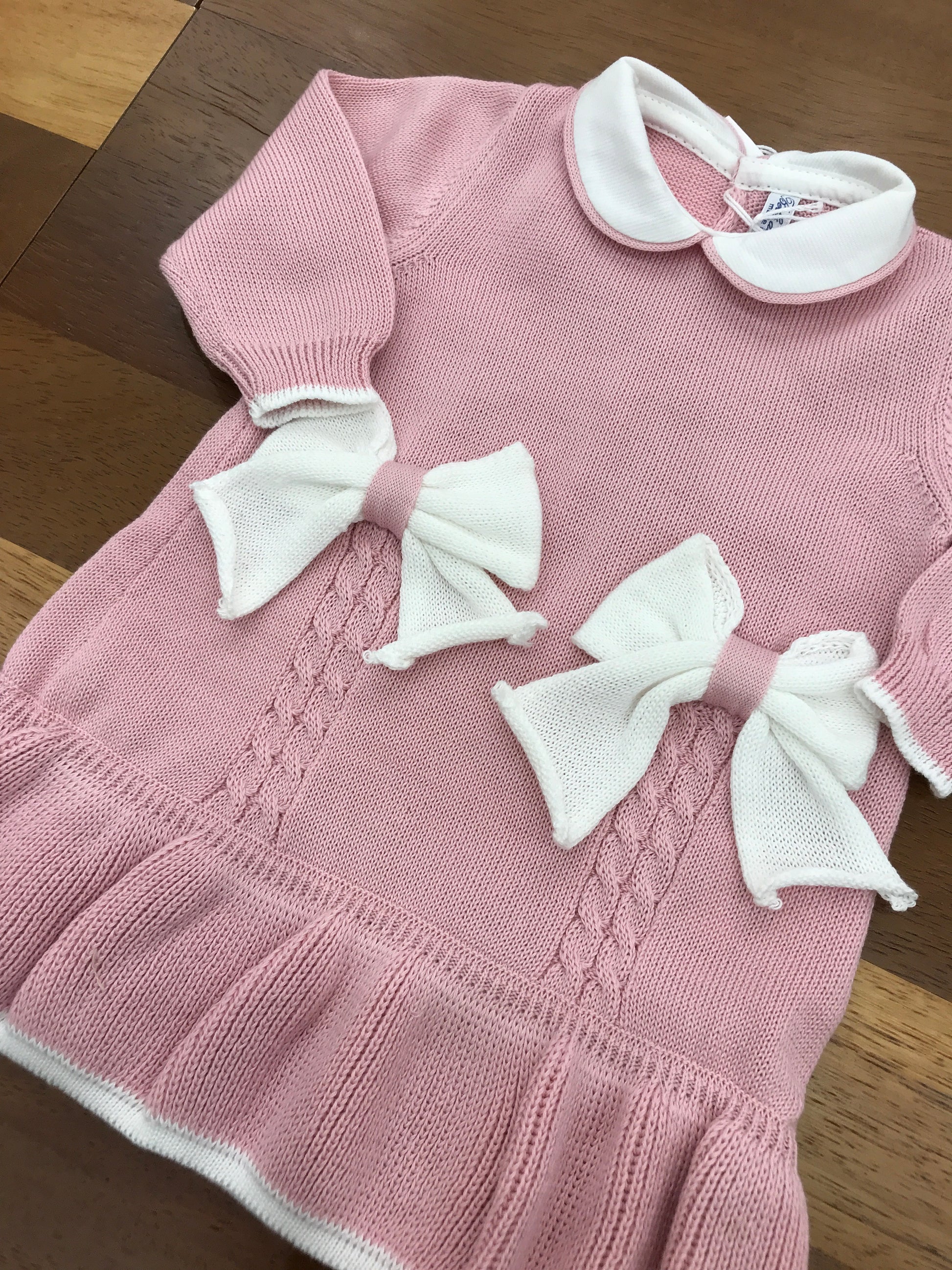 Delicato abitino in filo per neonata, caratterizzato da una raffinata tonalità di rosa antico. Il capo presenta eleganti fiocchi bianchi posizionati sul davanti, completati da un colletto bianco e da preziose rusche che ornano i bordi. Dettagli di trecce ricamate sottostanti i fiocchi conferiscono una lavorazione artigianale di qualità superiore, rendendo questo pezzo una scelta sofisticata per le occasioni speciali della piccola.