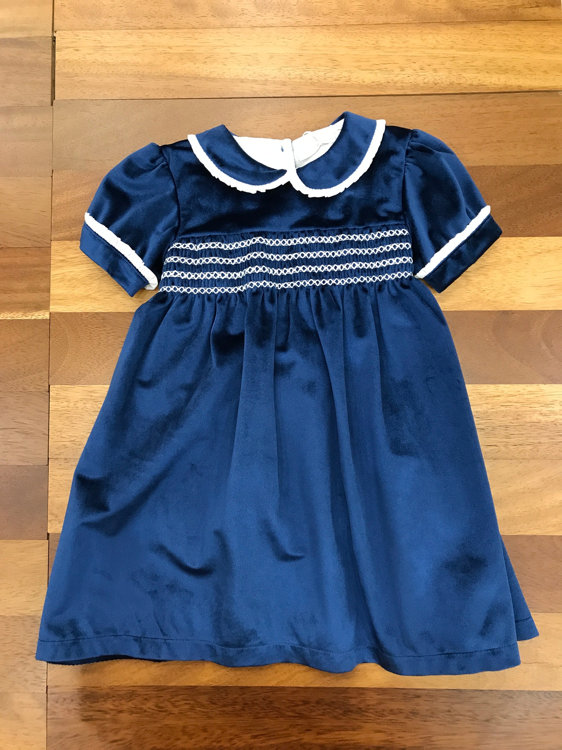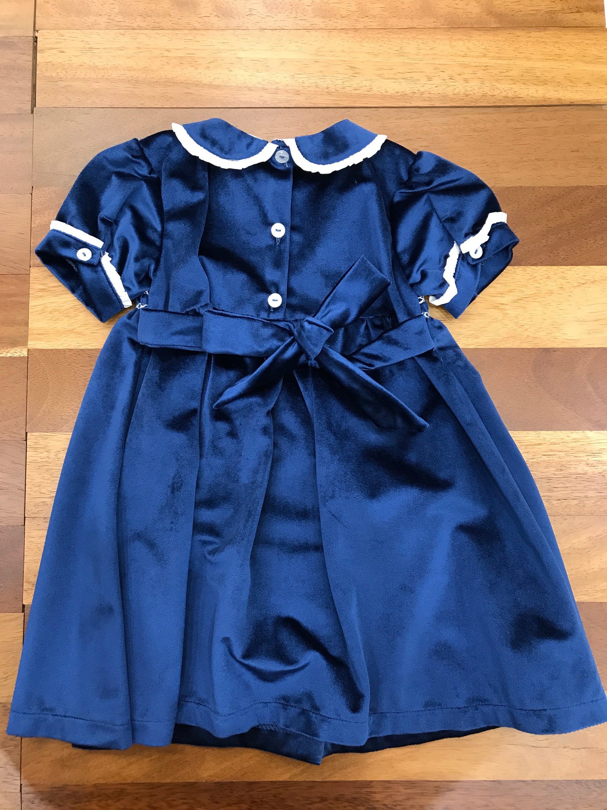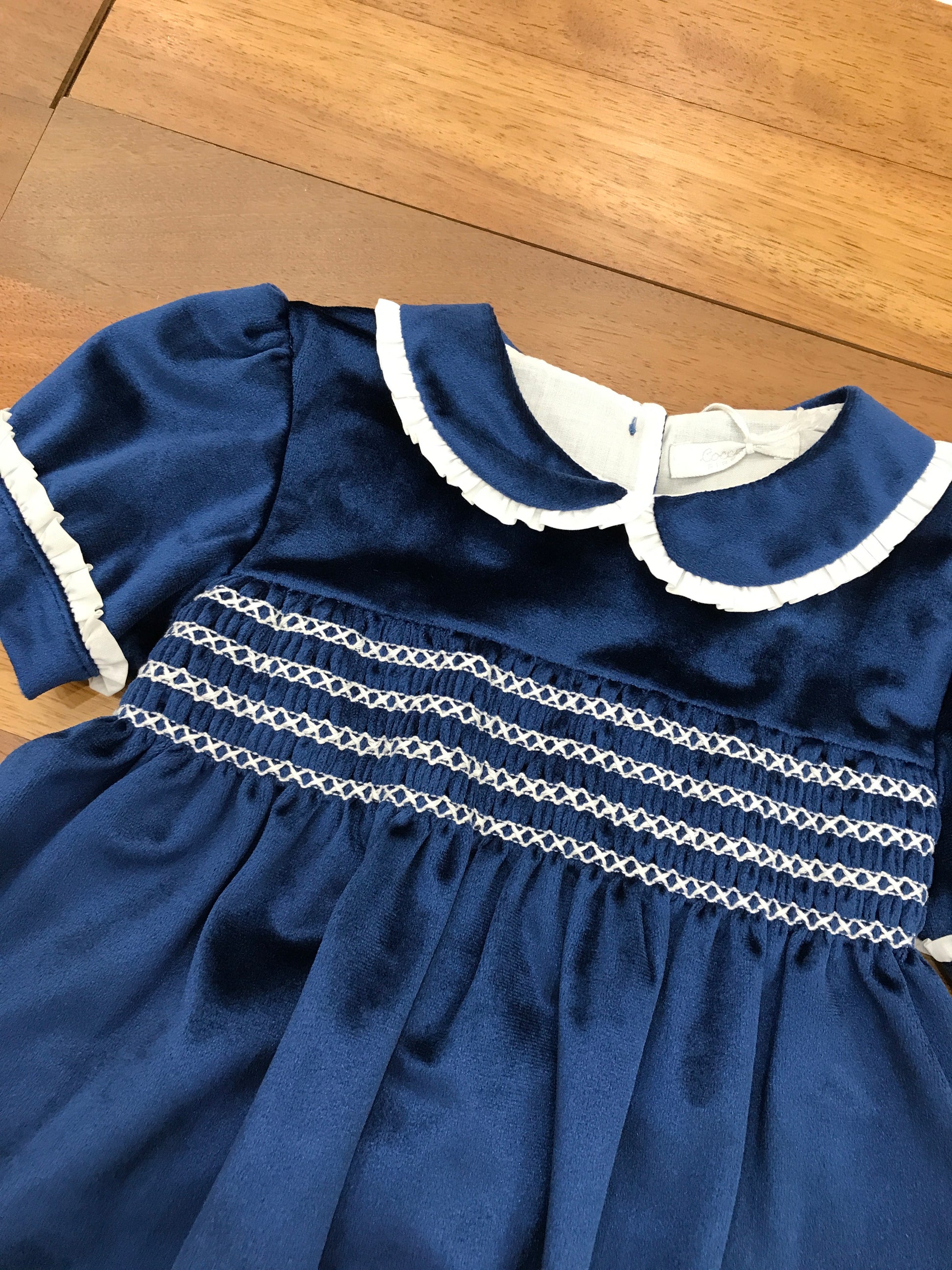 Elegante abitino in velluto blu caratterizzato da dettagli raffinati: colletto e maniche impreziosite da volant bianchi che conferiscono un tocco di delicatezza. Il corpetto presenta una pregiata lavorazione a punto smock, tecnica tradizionale che crea texture decorative e garantisce una vestibilità confortevole. Un capo sofisticato che unisce qualità artigianale e stile classico per le piccole signore.