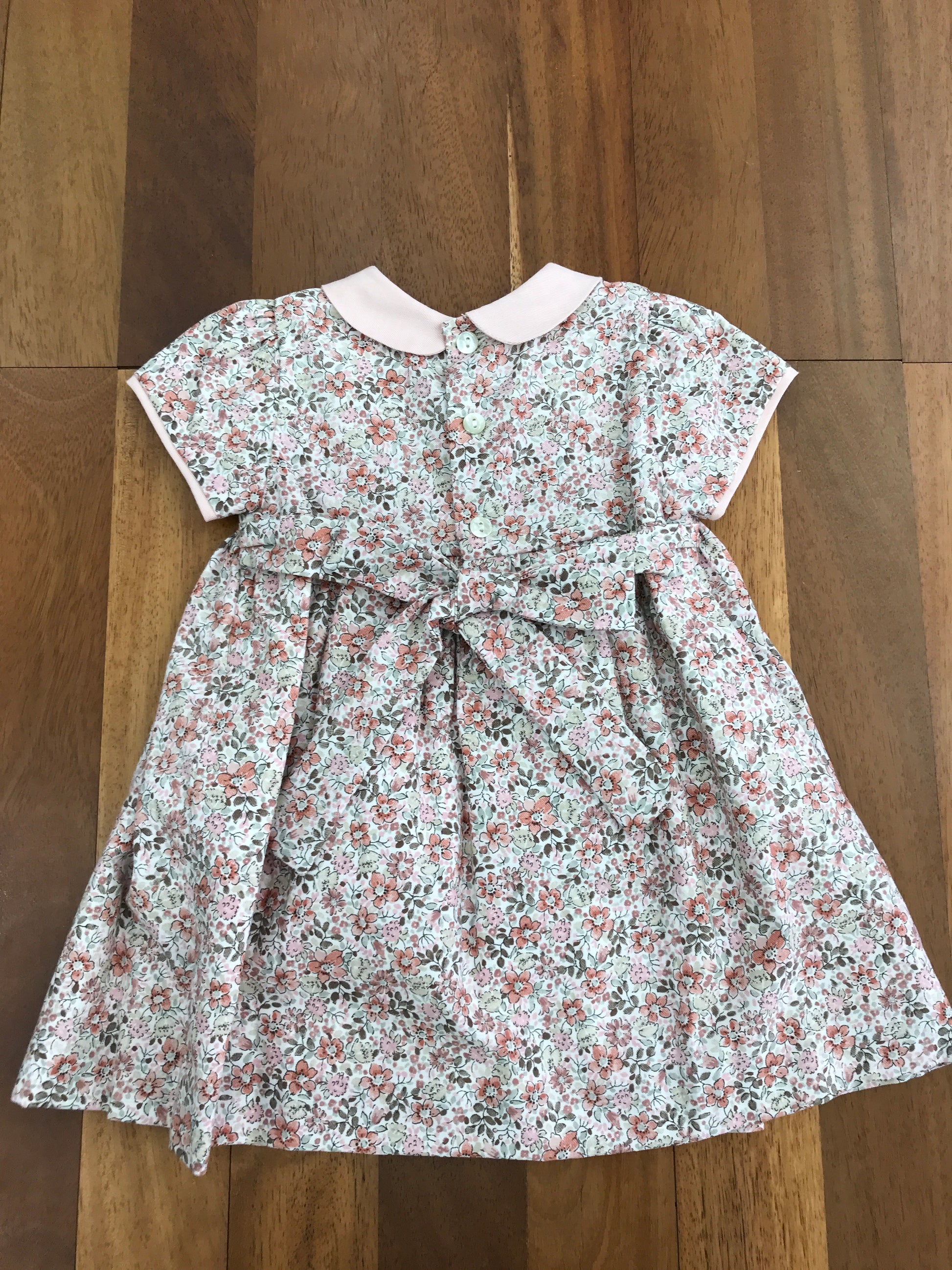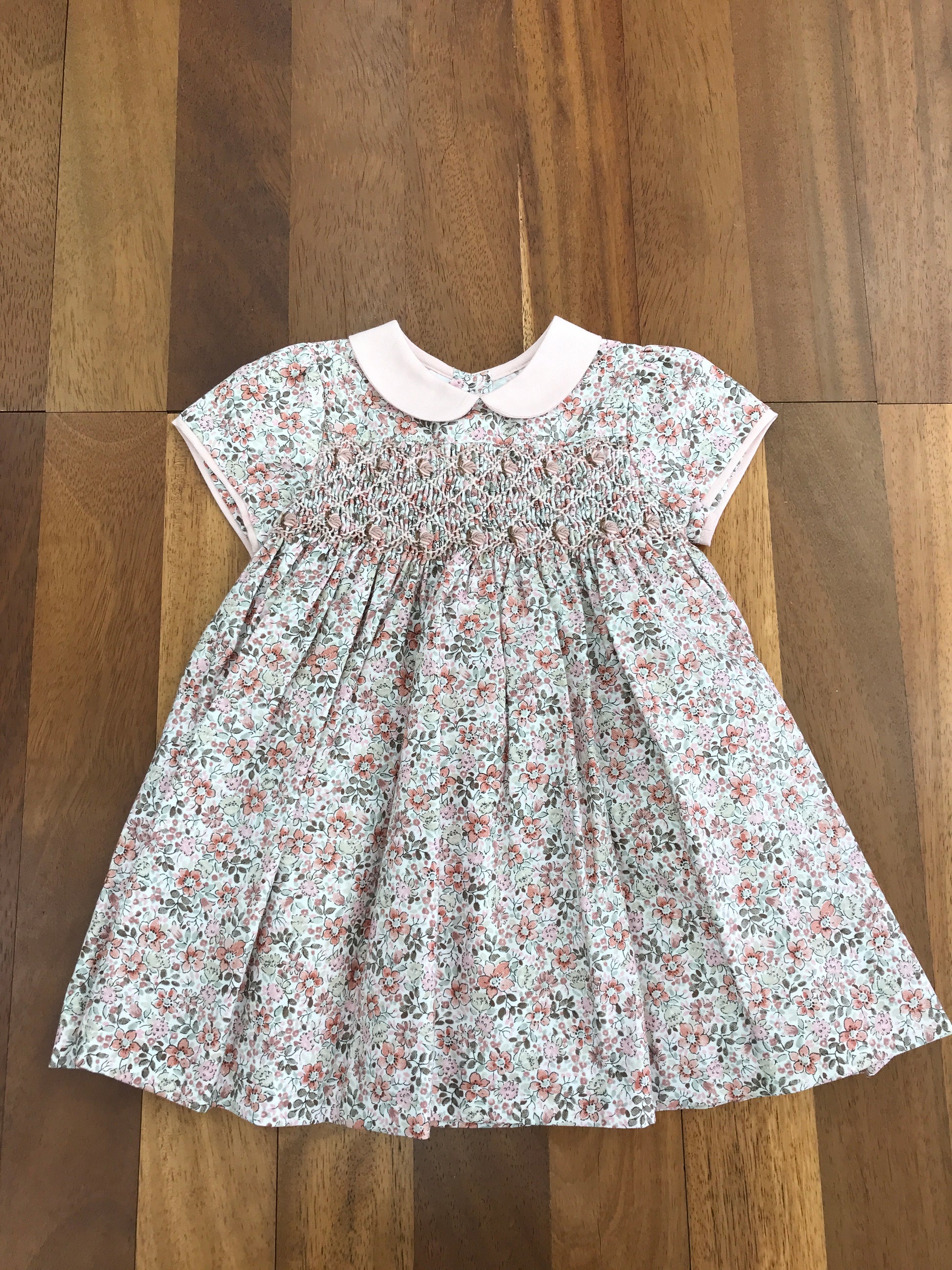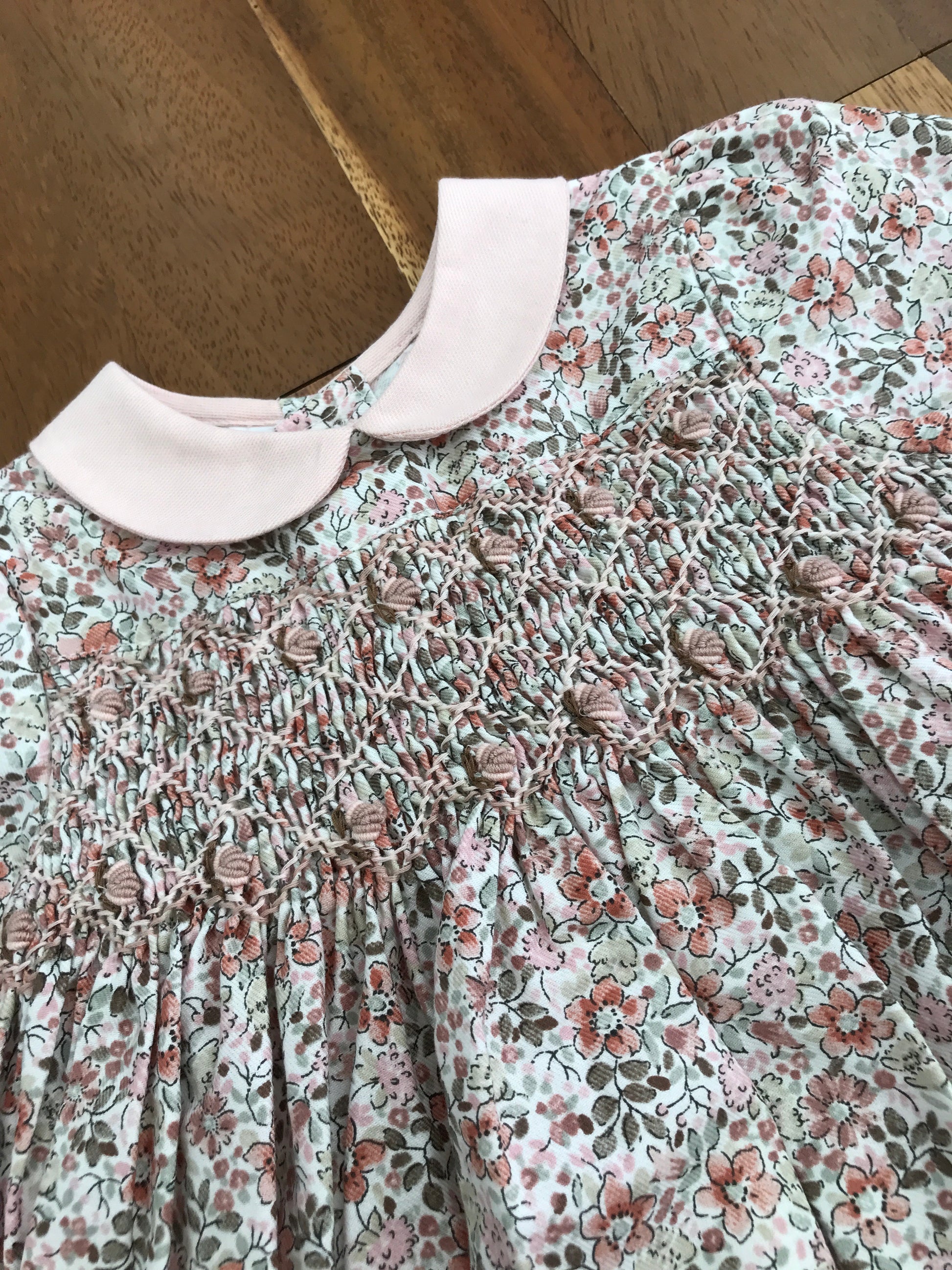 Questo abitino in caldo cotone offre comfort e stile con la sua mezza manica liscia e il collo tondo arricchito da un bordo in velluto. Il corpino, lavorato con punto smock, presenta una raffinata decorazione a rombi e roselline in sequenza, conferendo un dettaglio artigianale unico. Perfetto per assicurare morbidezza e un’eleganza discreta nelle giornate più fresche.