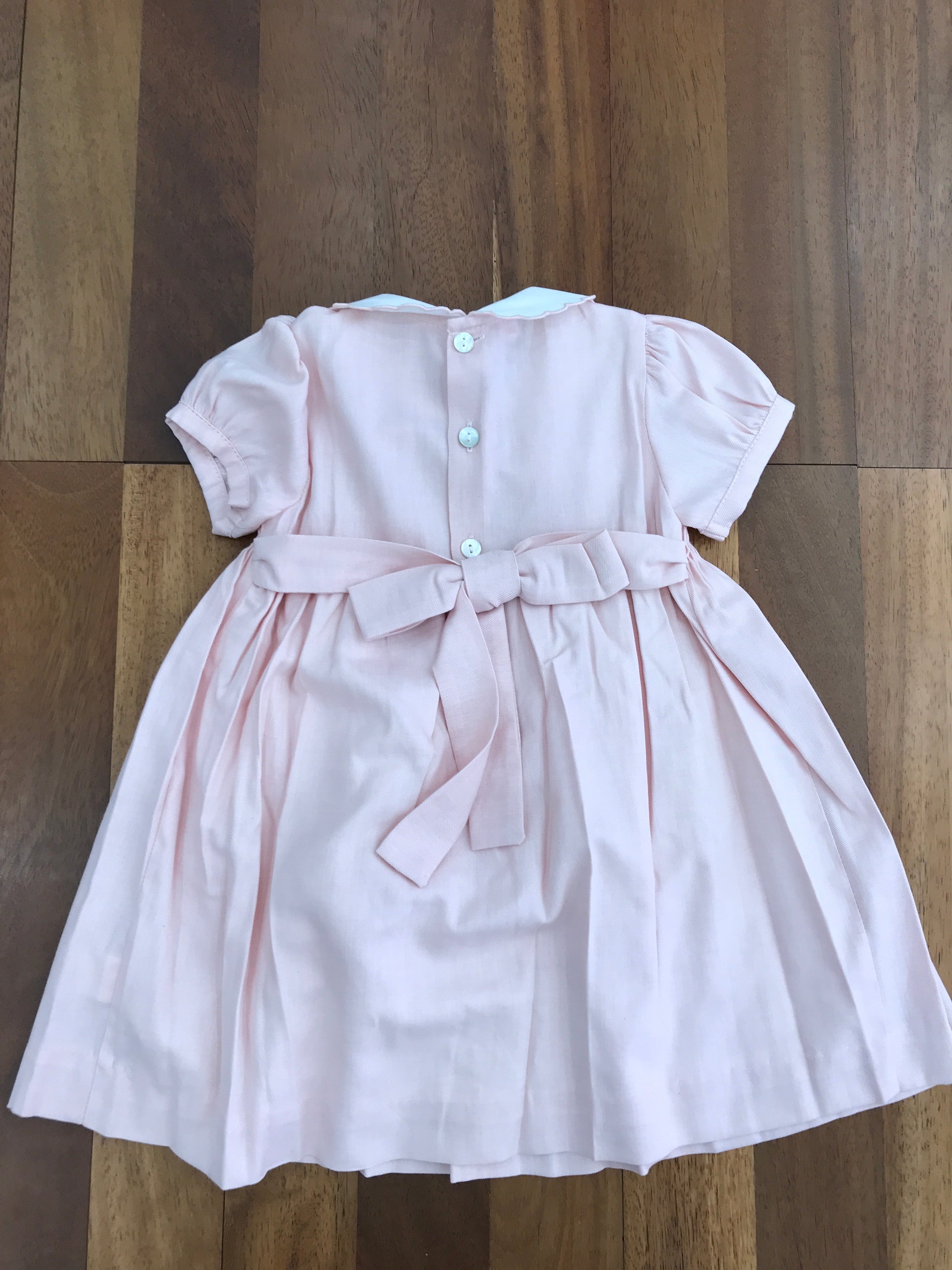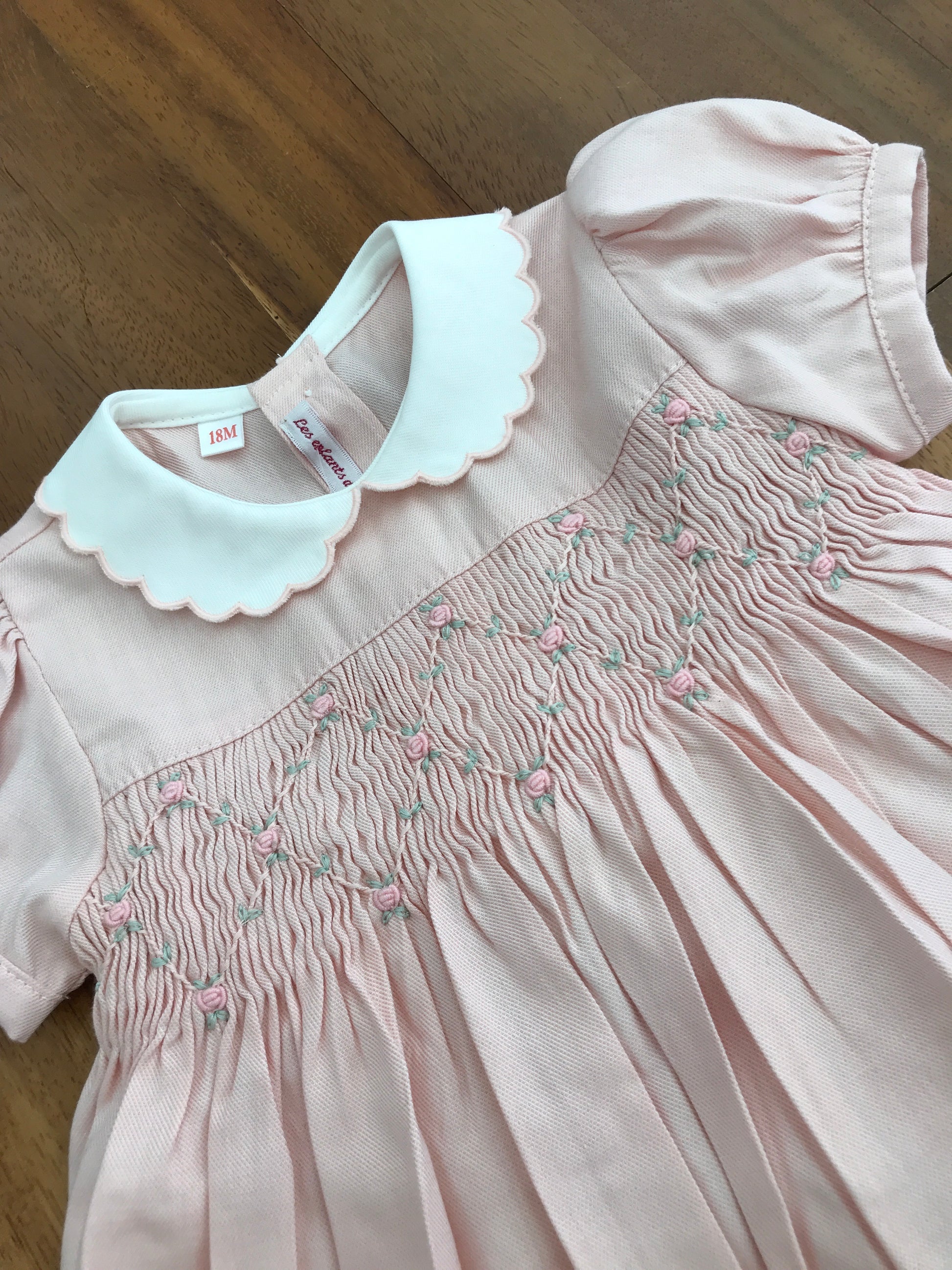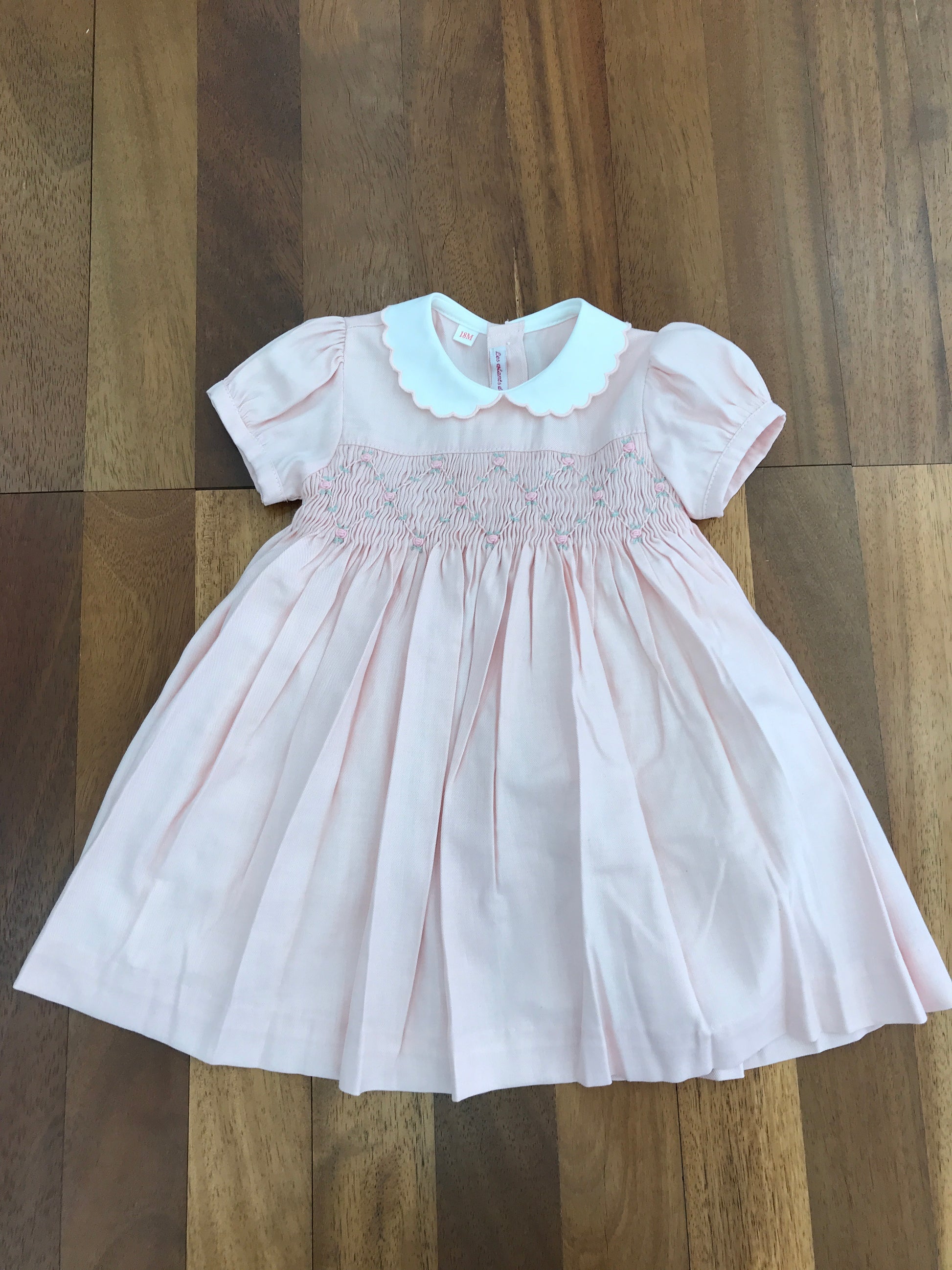 Abitino in caldo cotone con collo tondo smerlato e mezza manica a sbuffo, ideale per garantire comfort e stile. Il corpetto è realizzato con elegante punto smock arricchito da una raffinata lavorazione di rosselline a rombi. Sul retro si chiude con un delicato bottoncino e si completa con un laccio per formare un fiocco, aggiungendo un tocco di femminilità e praticità. Un capo curato nei dettagli, perfetto per le occasioni speciali dei più piccoli.