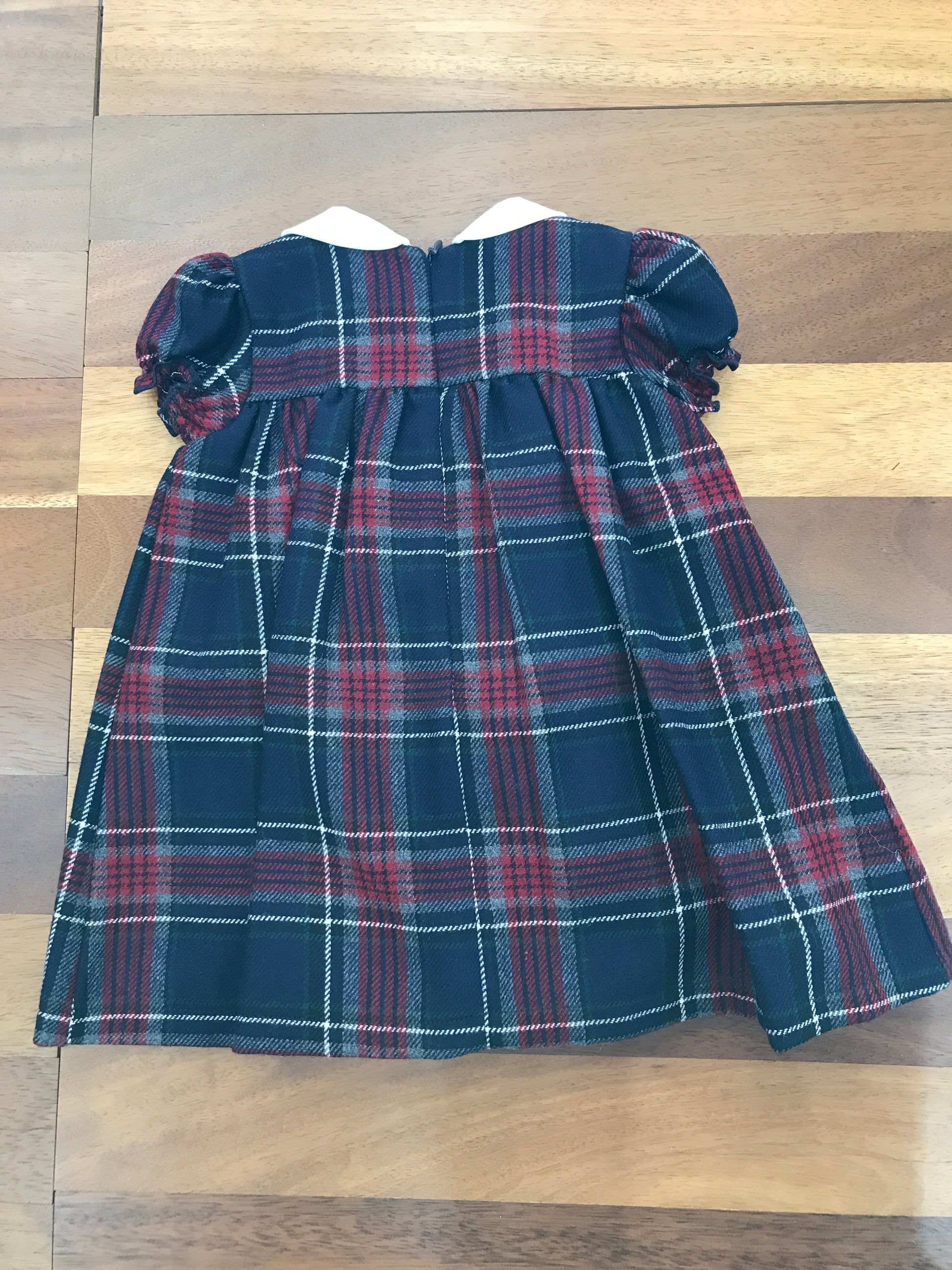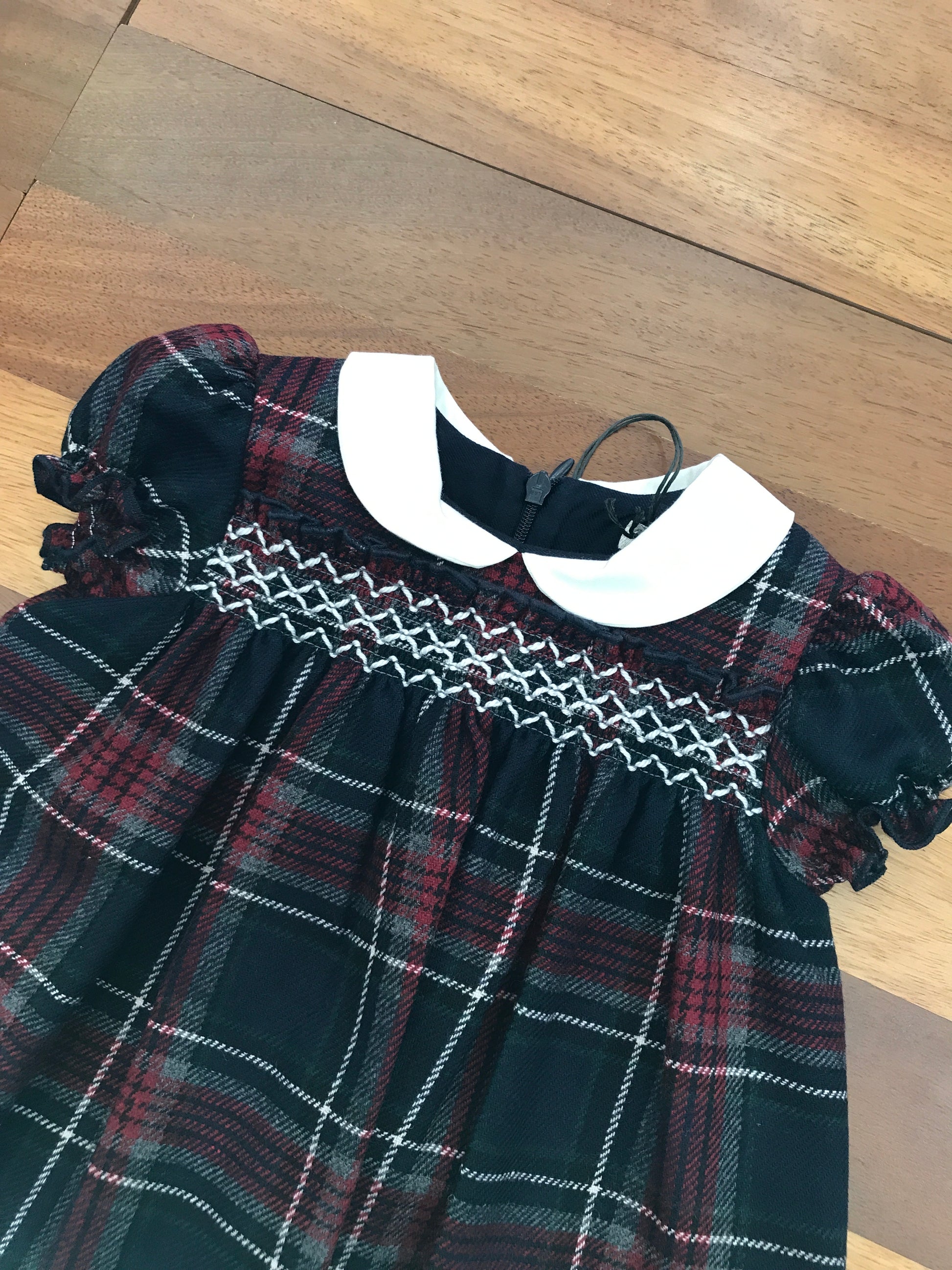 Questo delicato abitino Jo Milano presenta una raffinata combinazione di blu bordeaux e grigio in stile scozzese. Caratterizzato da maniche corte a sbuffo e un elegante colletto bianco, il capo si distingue per la pregiata lavorazione a punto smock sul corpetto, che conferisce una texture sofisticata e una silhouette ricercata. Un'opzione versatile per occasioni speciali.