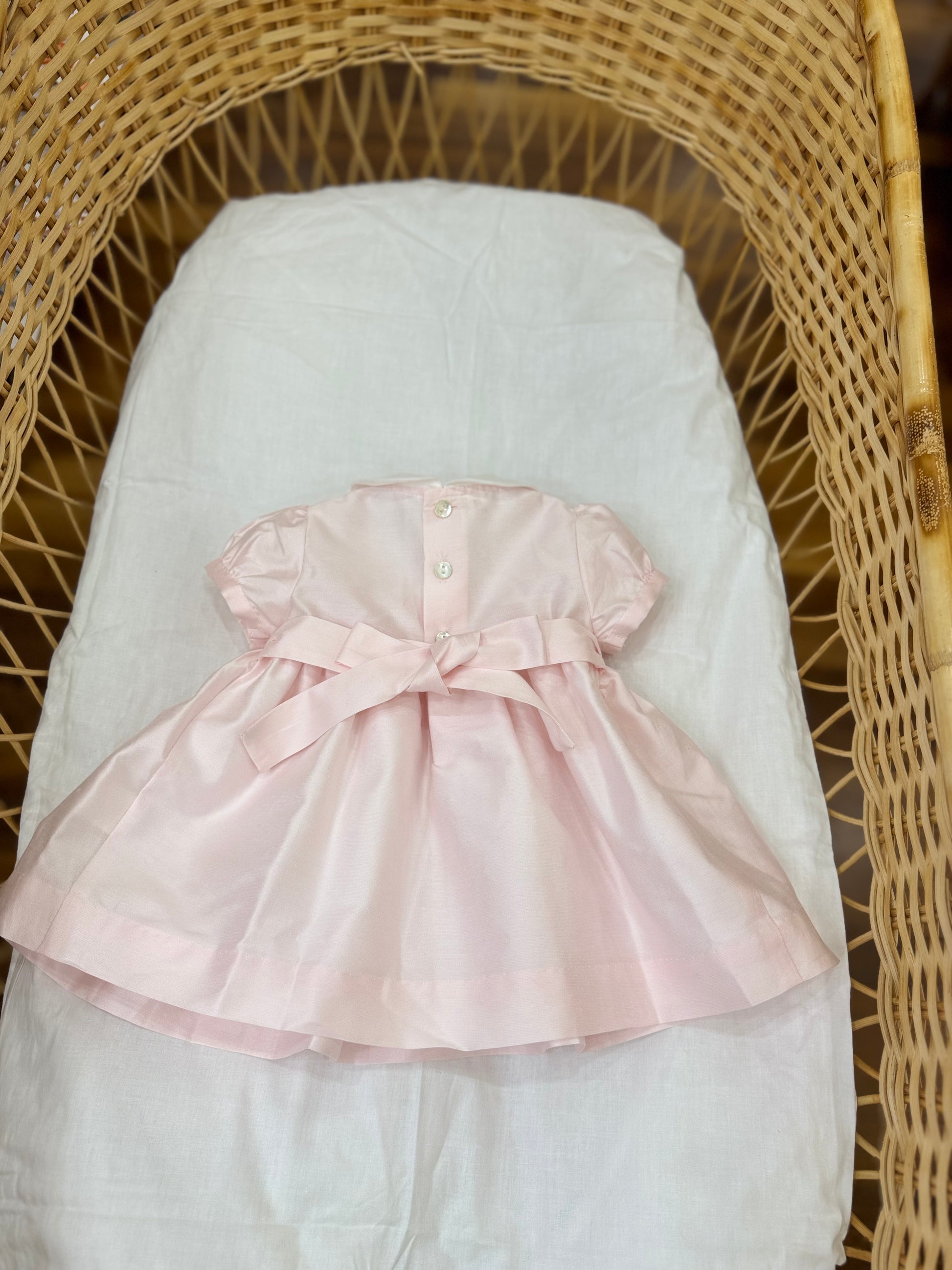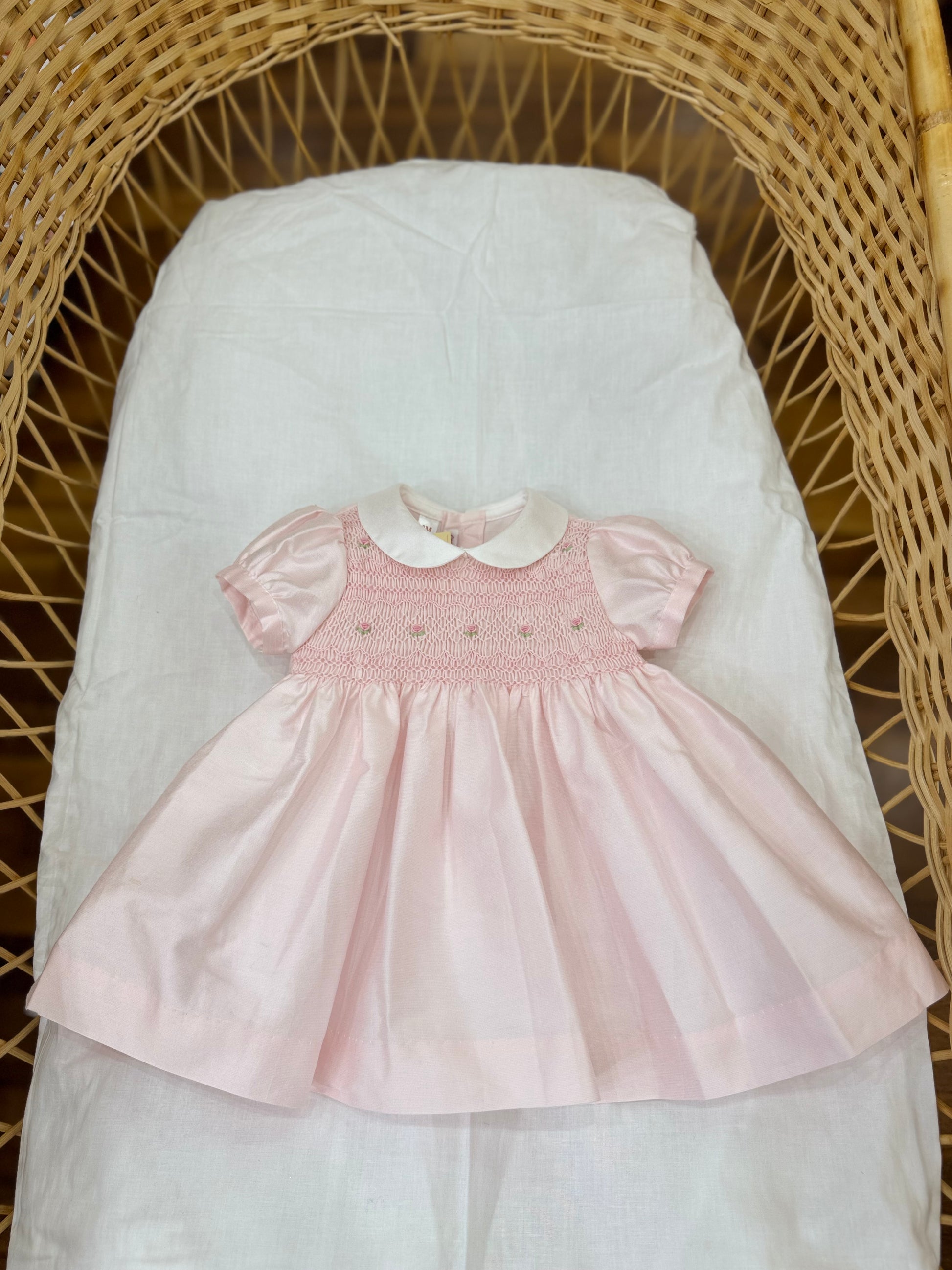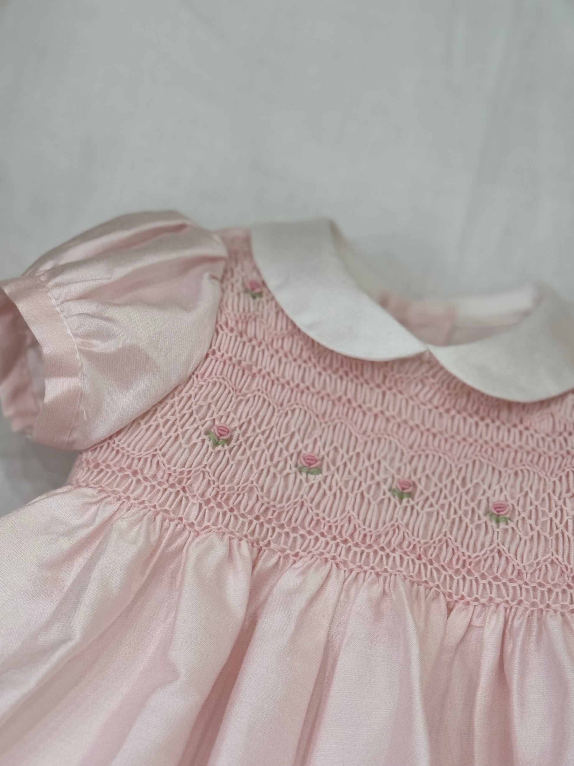 Questo abitino rosa in cotone è ideale per la prima uscita clinica, ma anche come cambio battesimo, primo compleanno o come damigella. Il meraviglioso corpetto è decorato a mano con punto a smock e roselline rosa, aggiungendo un tocco di eleganza senza tempo. Perfetto per un'occasione speciale.
