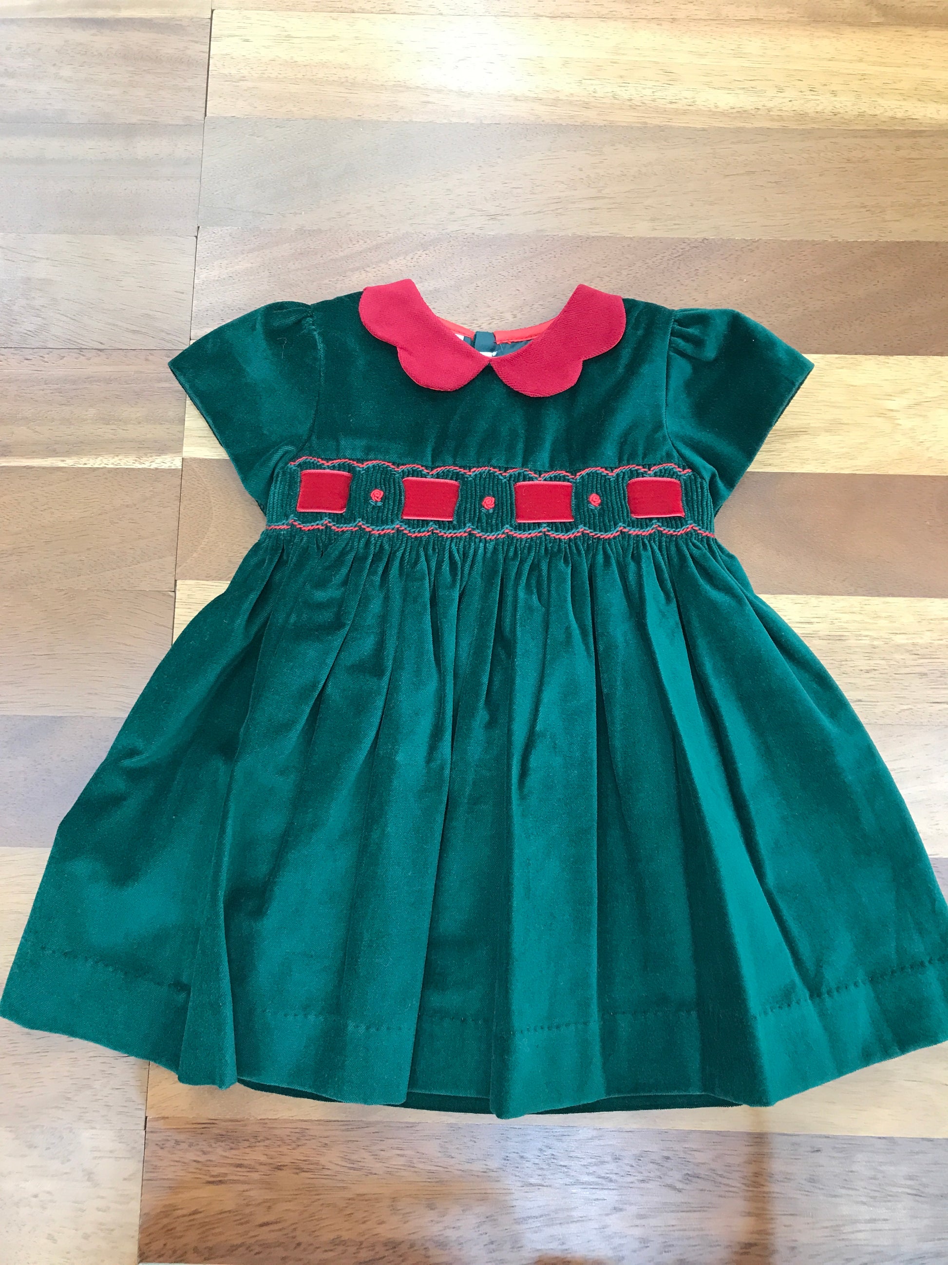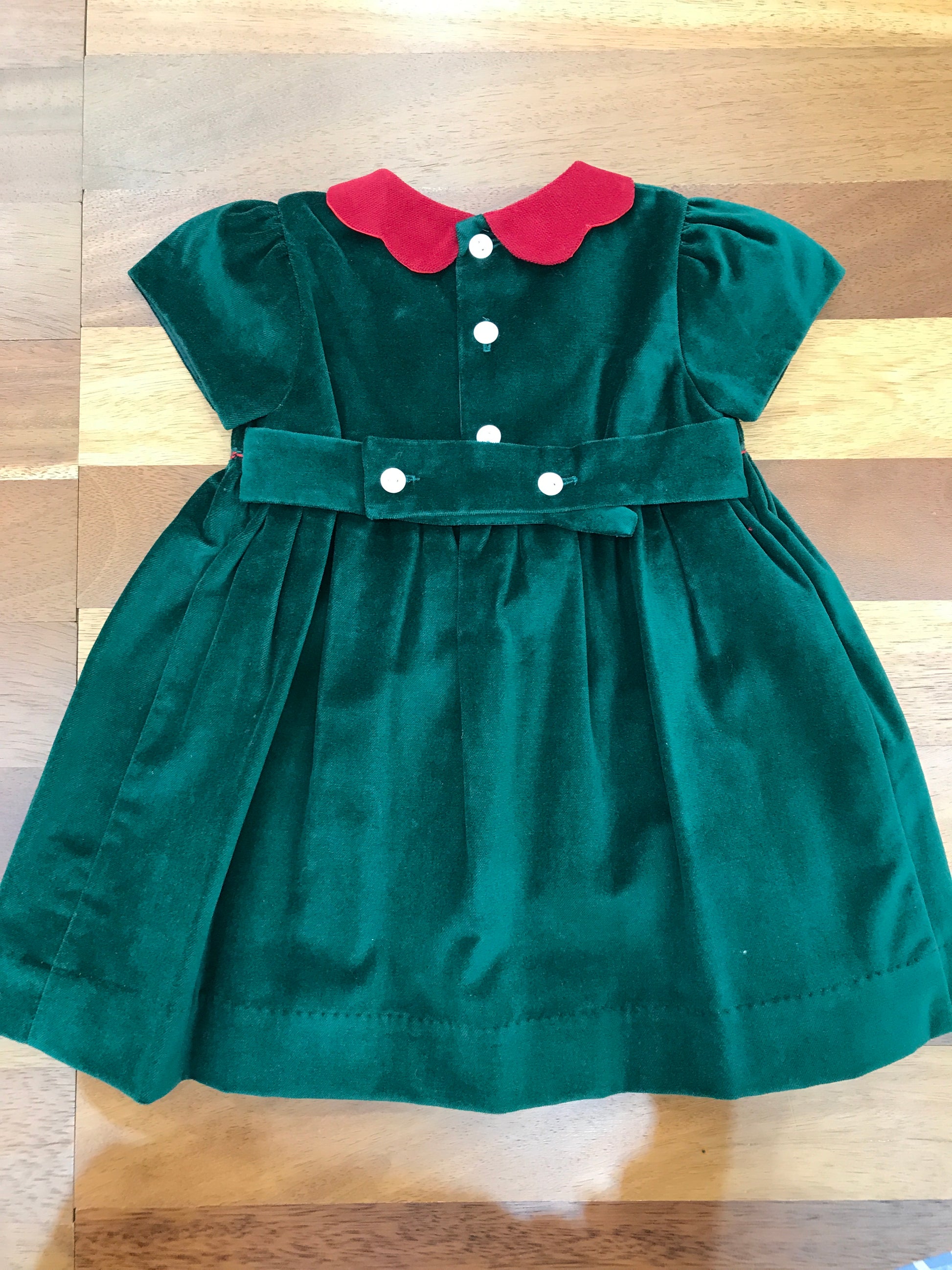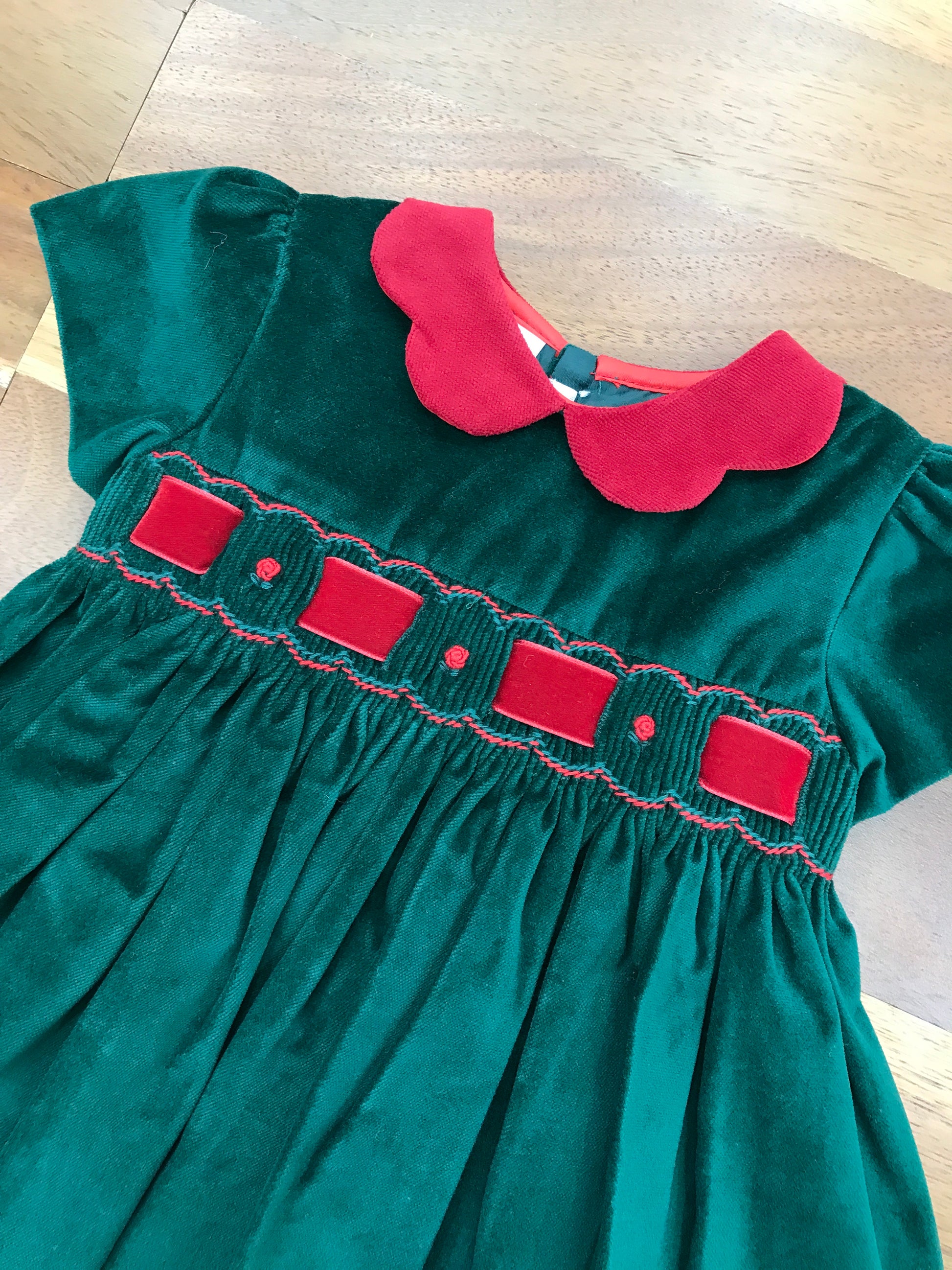 Elegante abitino in velluto verde con dettagli ricercati: corpetto impreziosito da un passanastro in velluto rosso e delicate rose rosse ricamate con tecnica smock. Il colletto smerlato rosso e le maniche corte a sbuffo completano un design sofisticato e raffinato, perfetto per occasioni speciali.