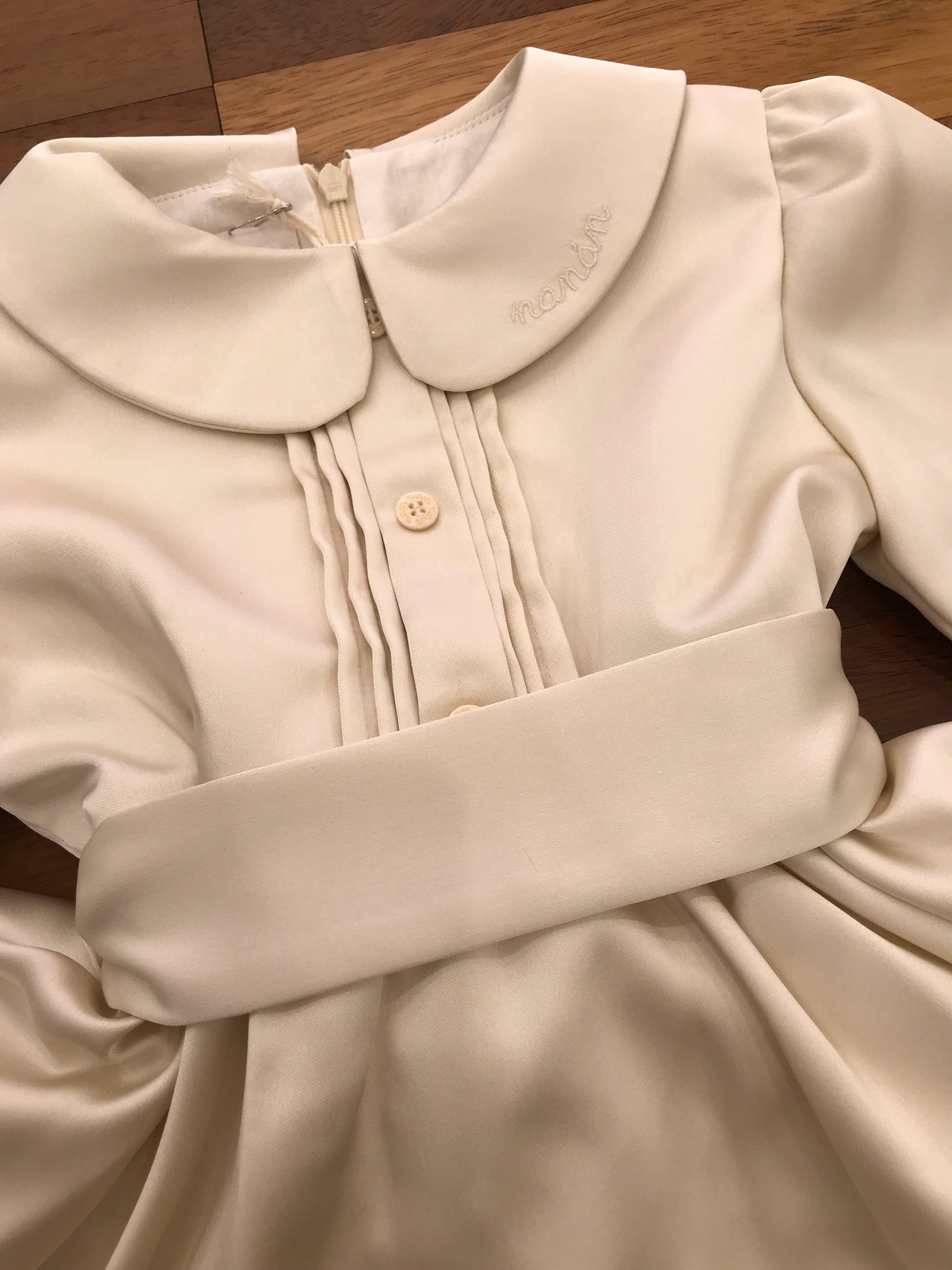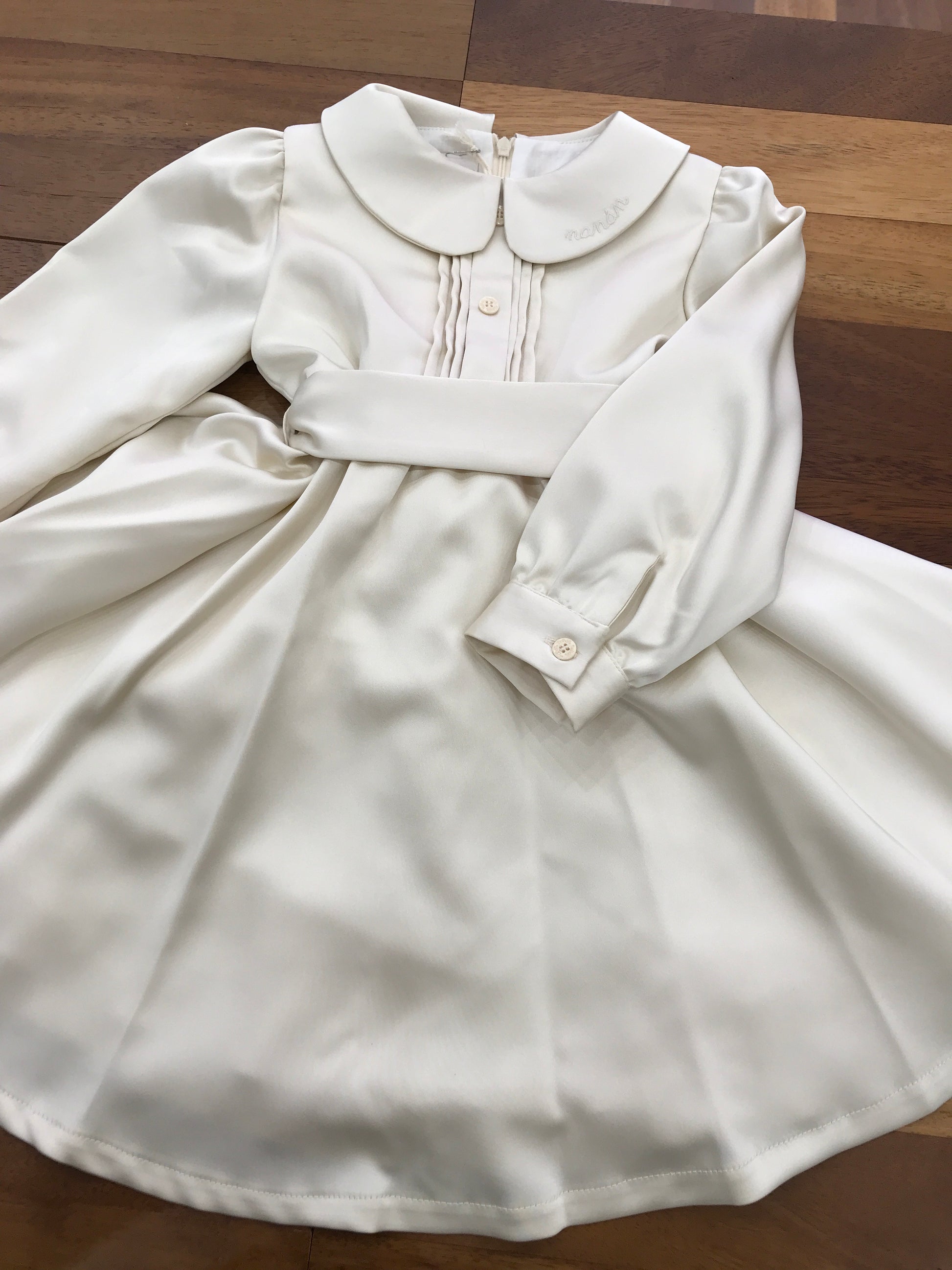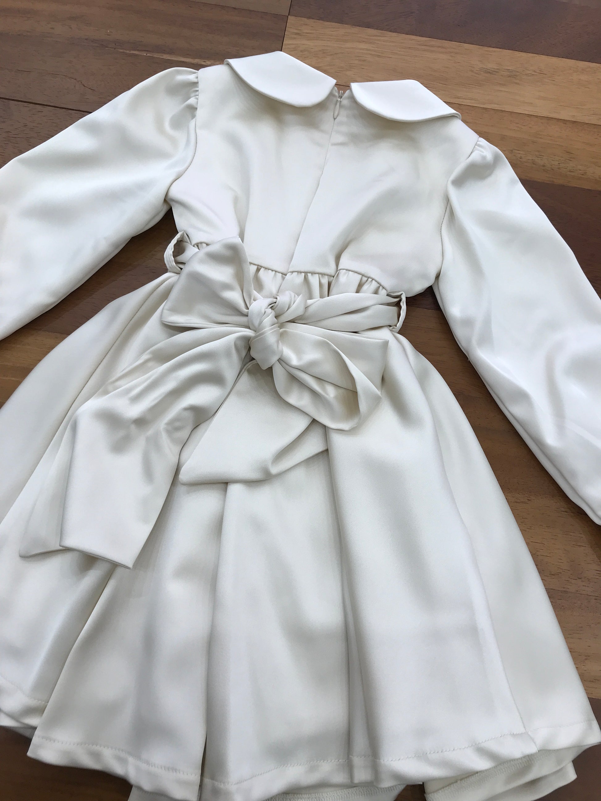L’abitino in raso si caratterizza per una gonna ampia che conferisce una silhouette elegante e fluida. Le maniche lunghe terminano con un raffinato bottoncino che aggiunge un dettaglio di pregio. Al centro del corpetto si trova una fascia plissettata, impreziosita da piccoli bottoncini, che valorizza la parte superiore del capo. La vita è definita da una cintura con passanti, che sul retro si trasforma in un delicato fiocco, donando un tocco di femminilità e raffinatezza. La chiusura posteriore è garantita da una zip, pensata per assicurare comfort e praticità nell’indossare l’abito.