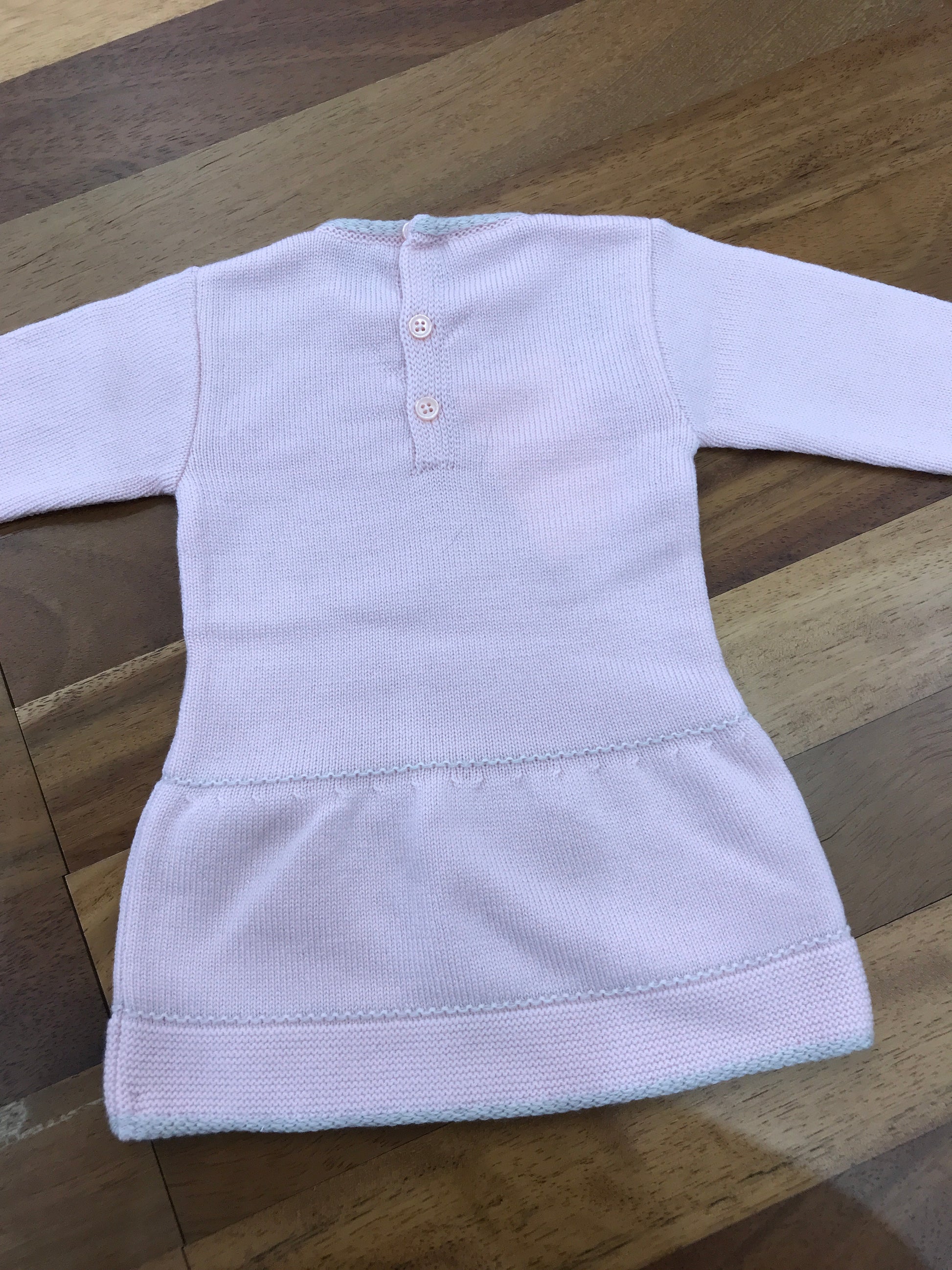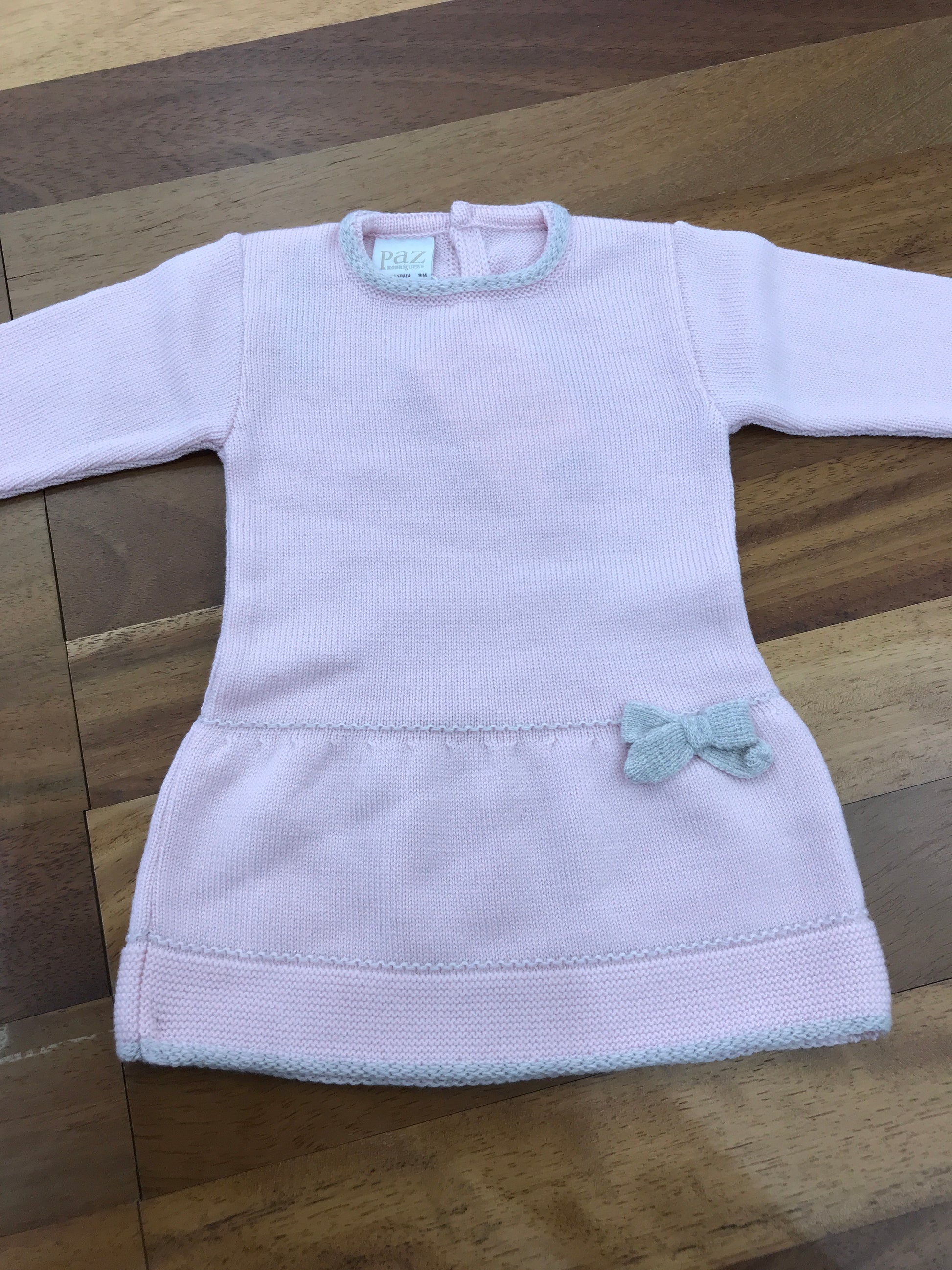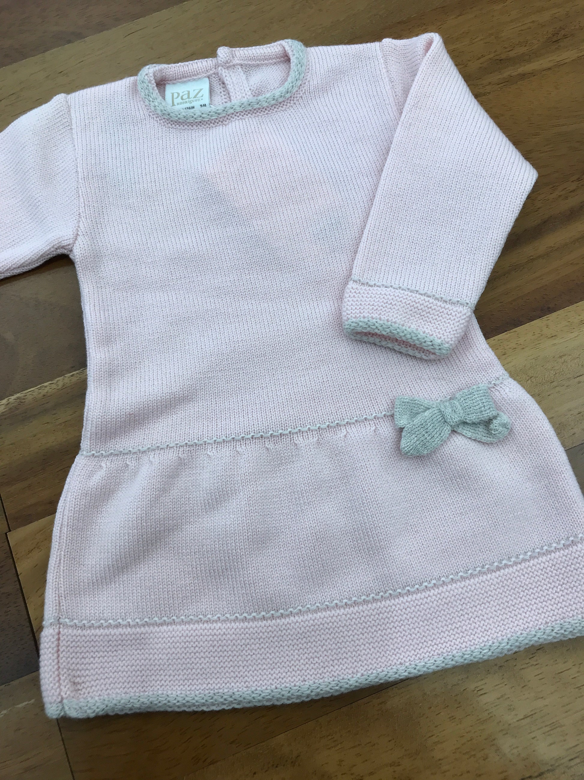 Questo abitino in lana presenta delicati ricami grigi e un piccolo fiocco tono su tono, perfetto per un tocco di eleganza raffinata.