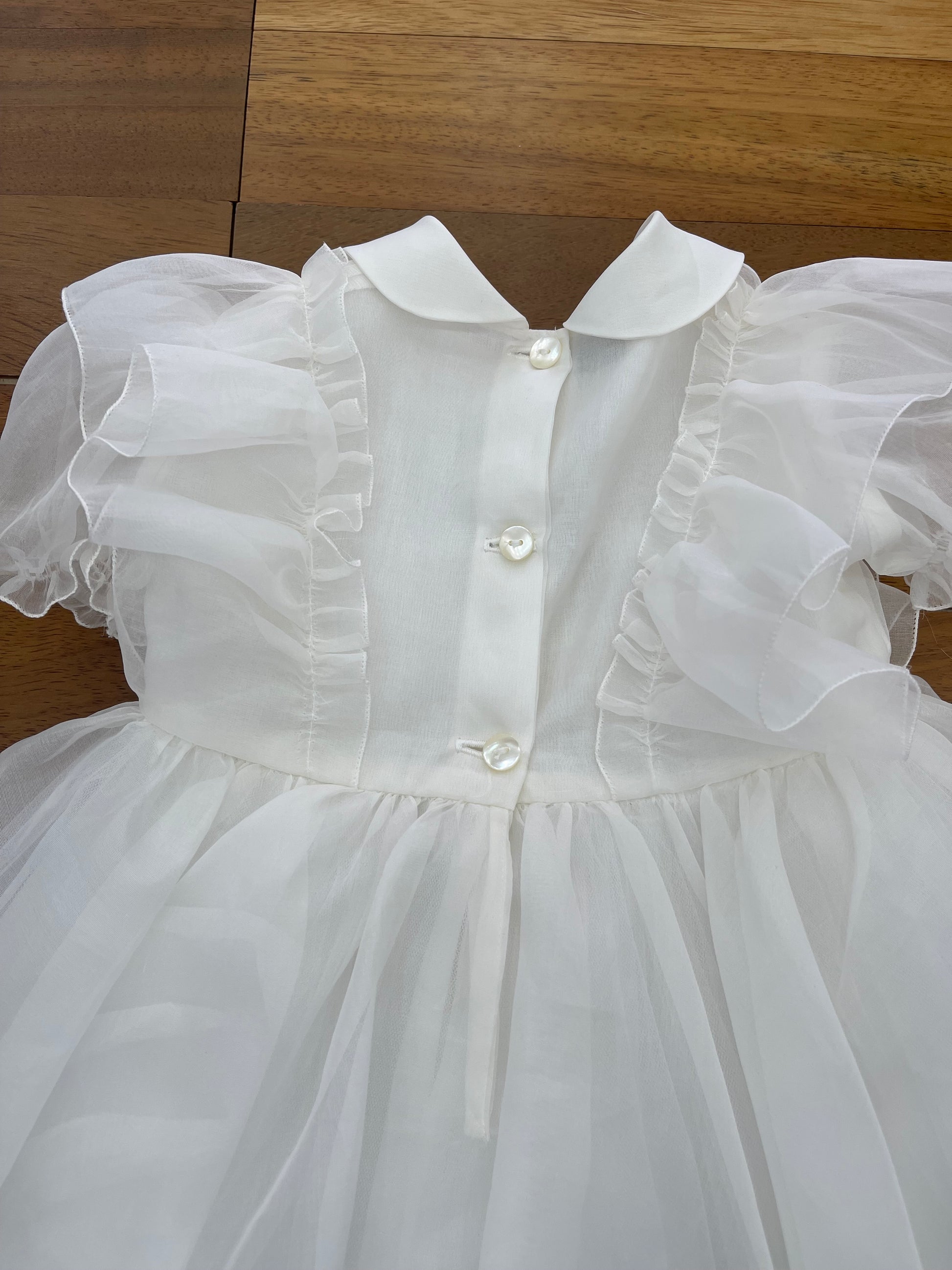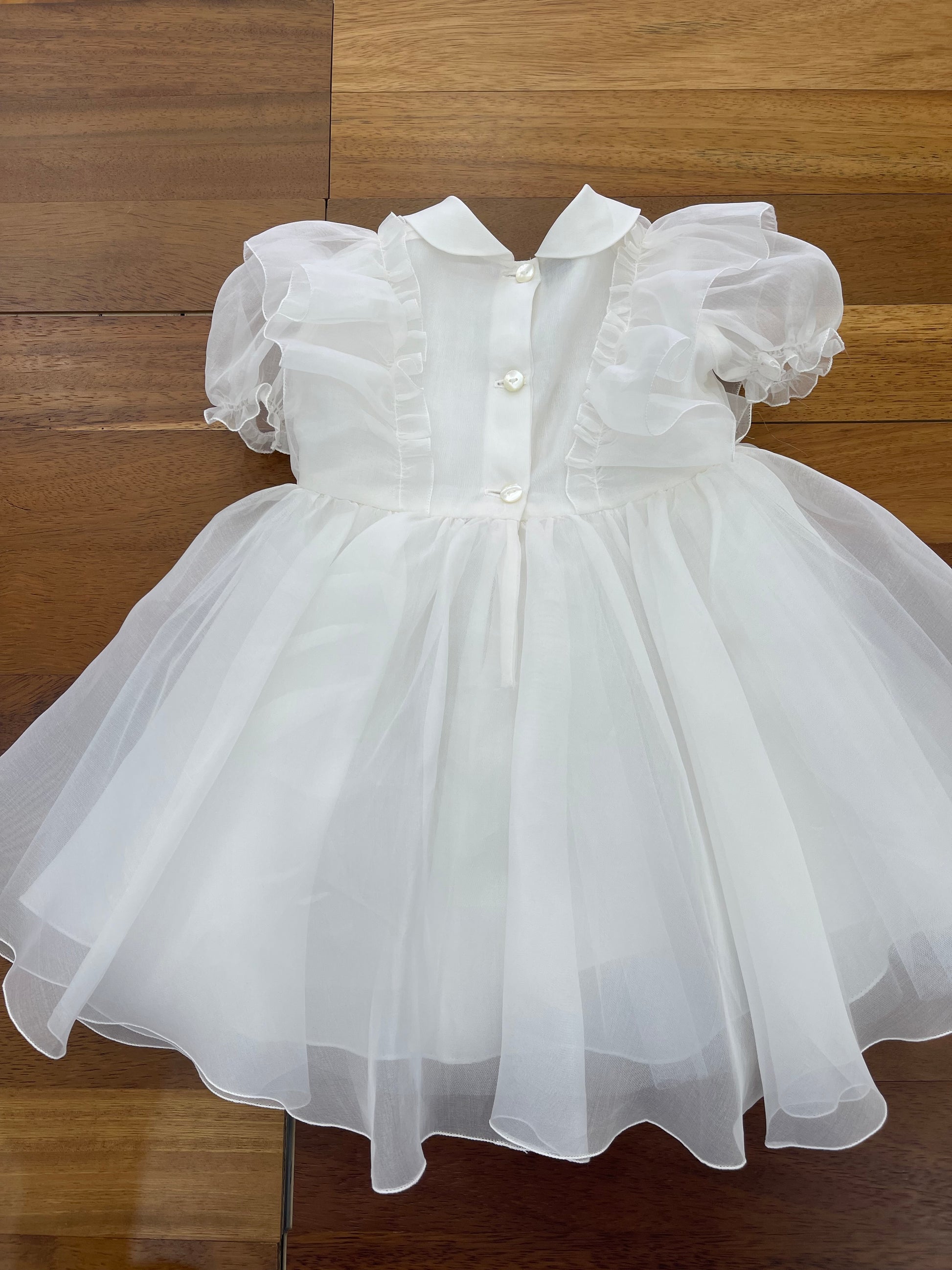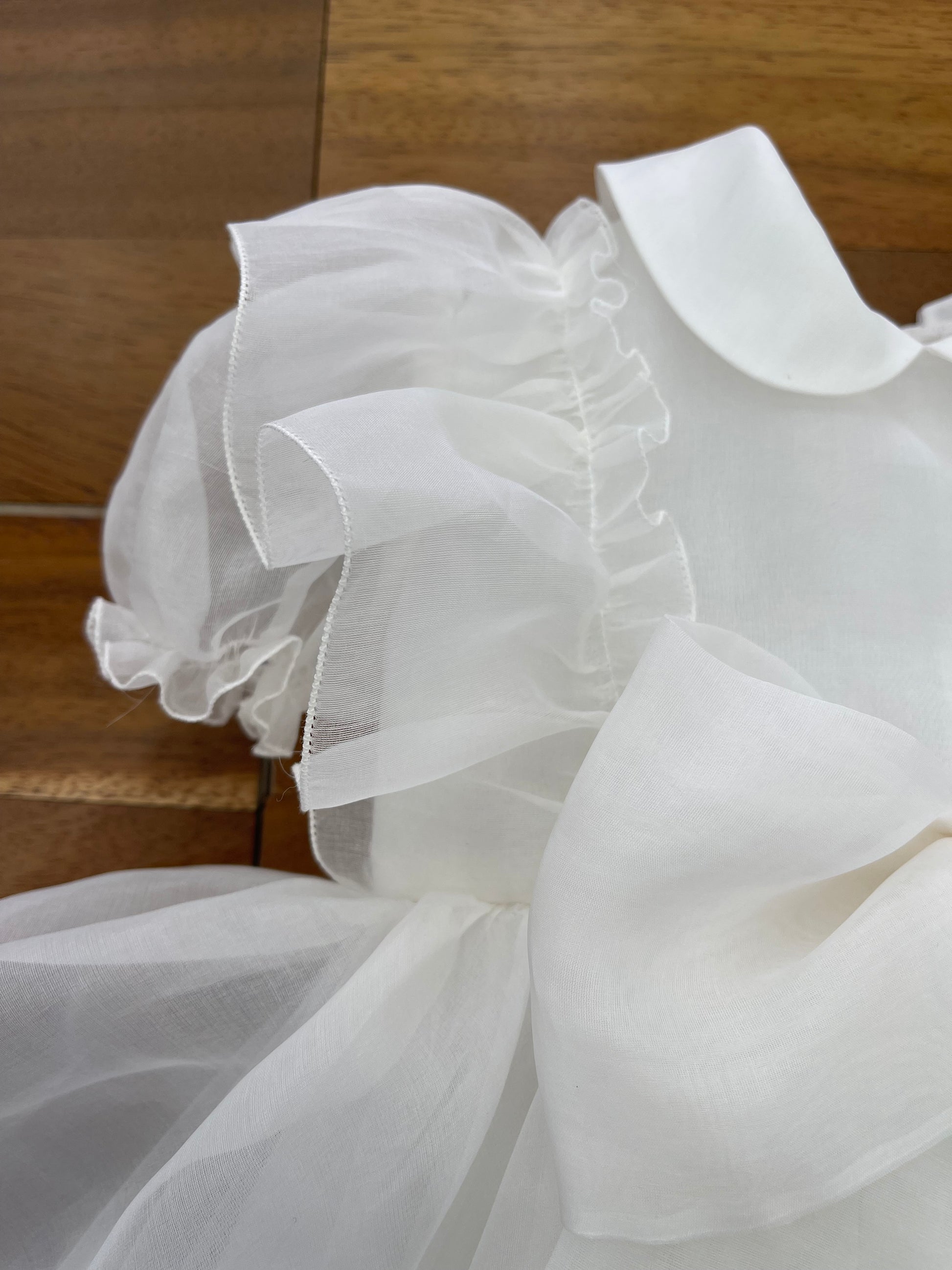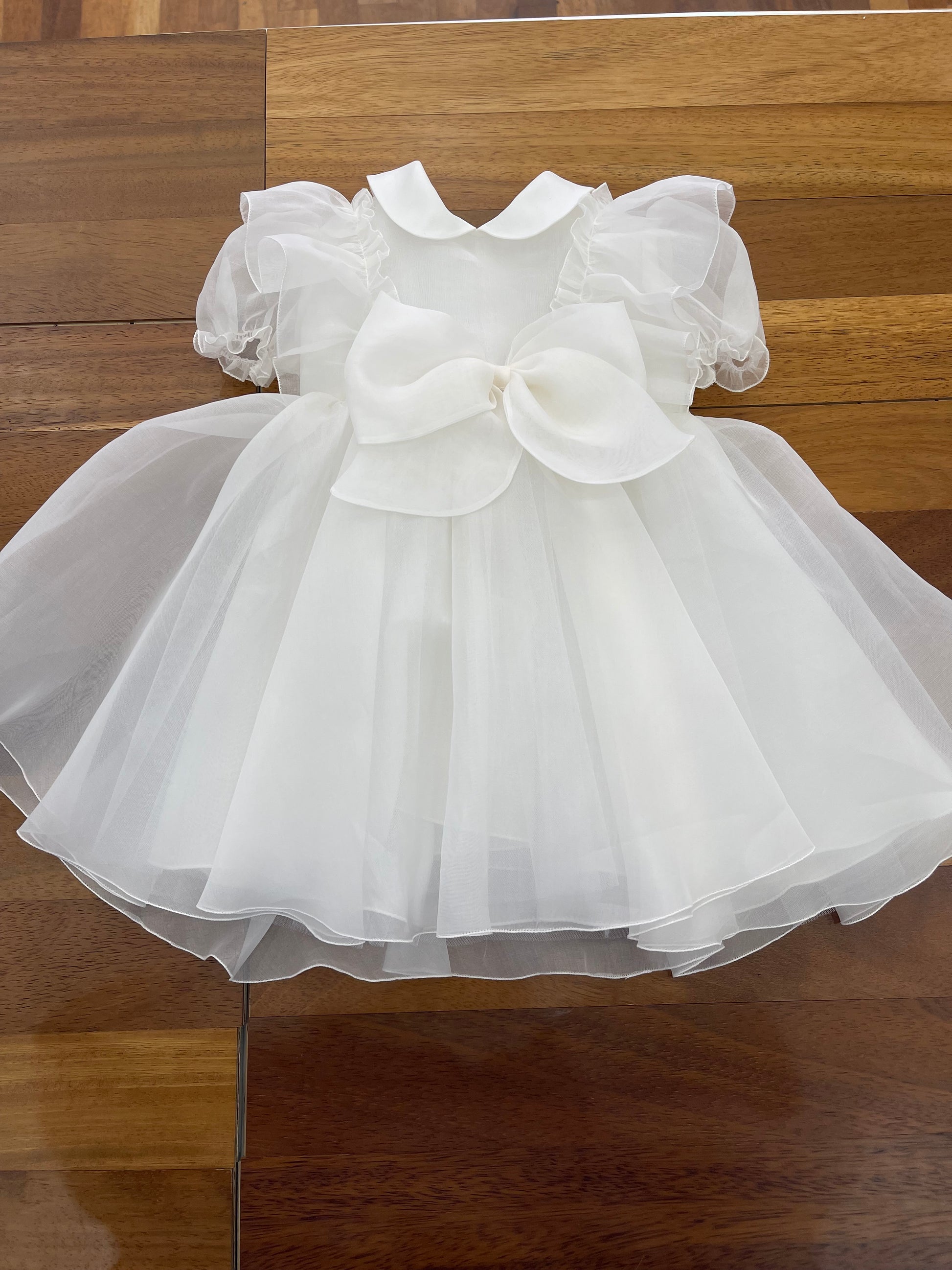 Questo elegante abitino in organza da sera è perfetto per le occasioni speciali. Il suo design pulito e raffinato presenta un colletto tondo, un corpetto liscio e una manica a sbuffo con un grazioso fiocco al centro. Il gonnellone a ruota e la chiusura con bottoni sul retro aggiungono un tocco di eleganza.
