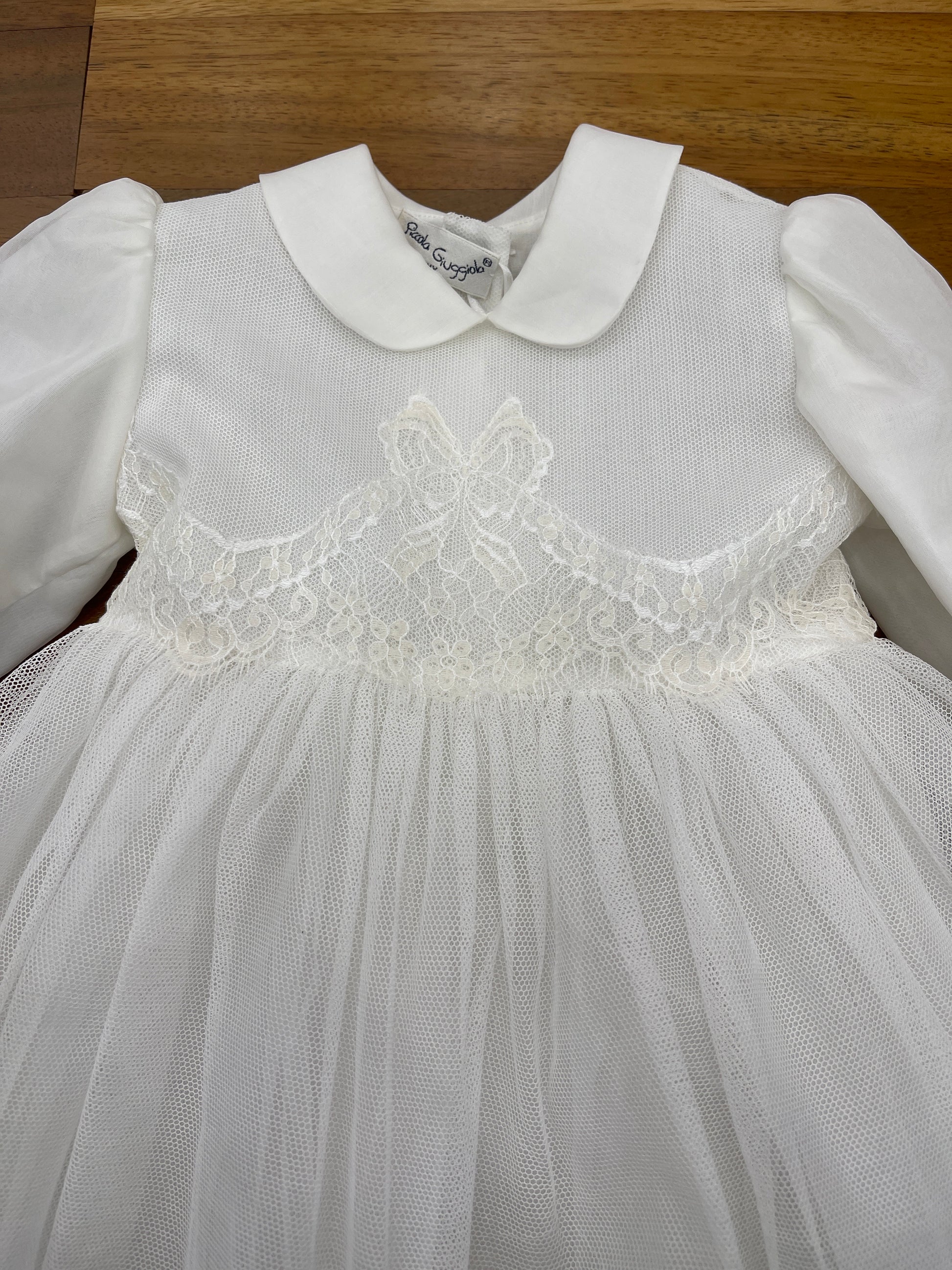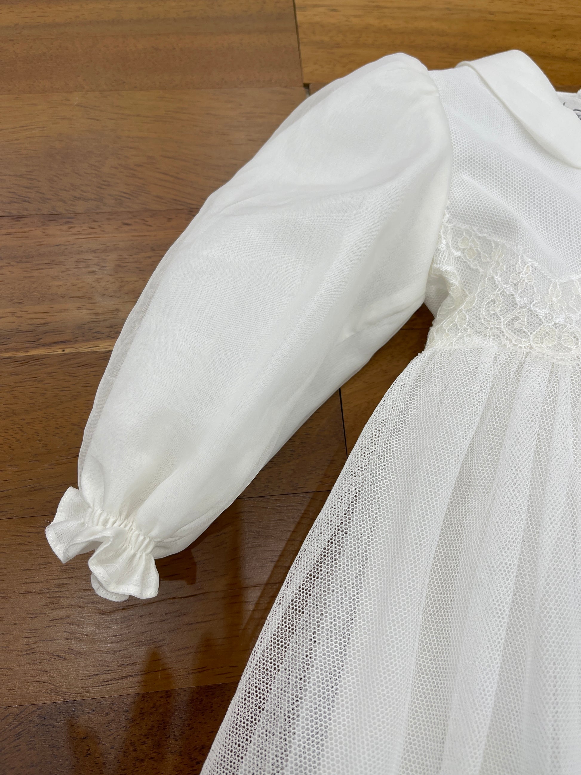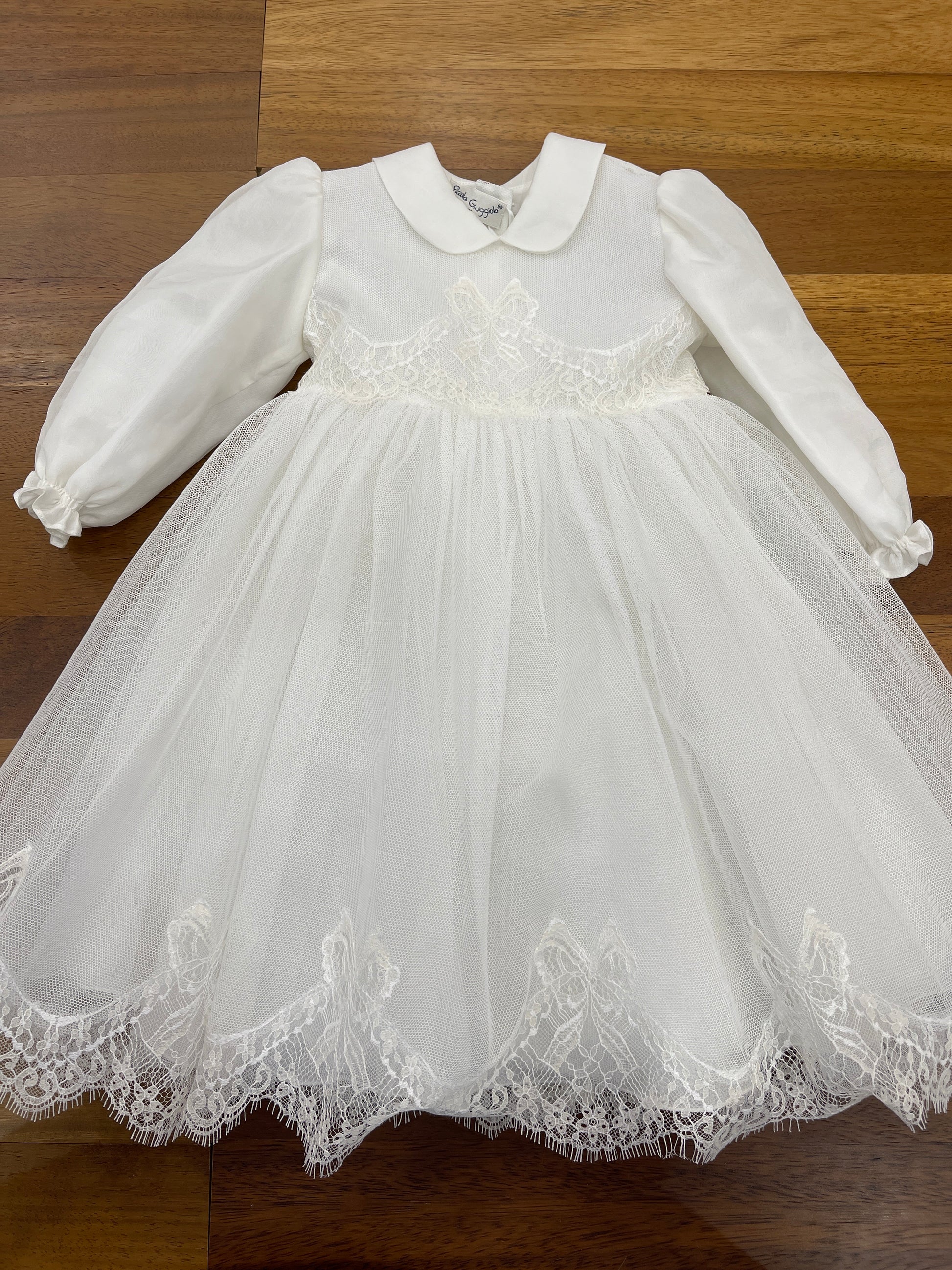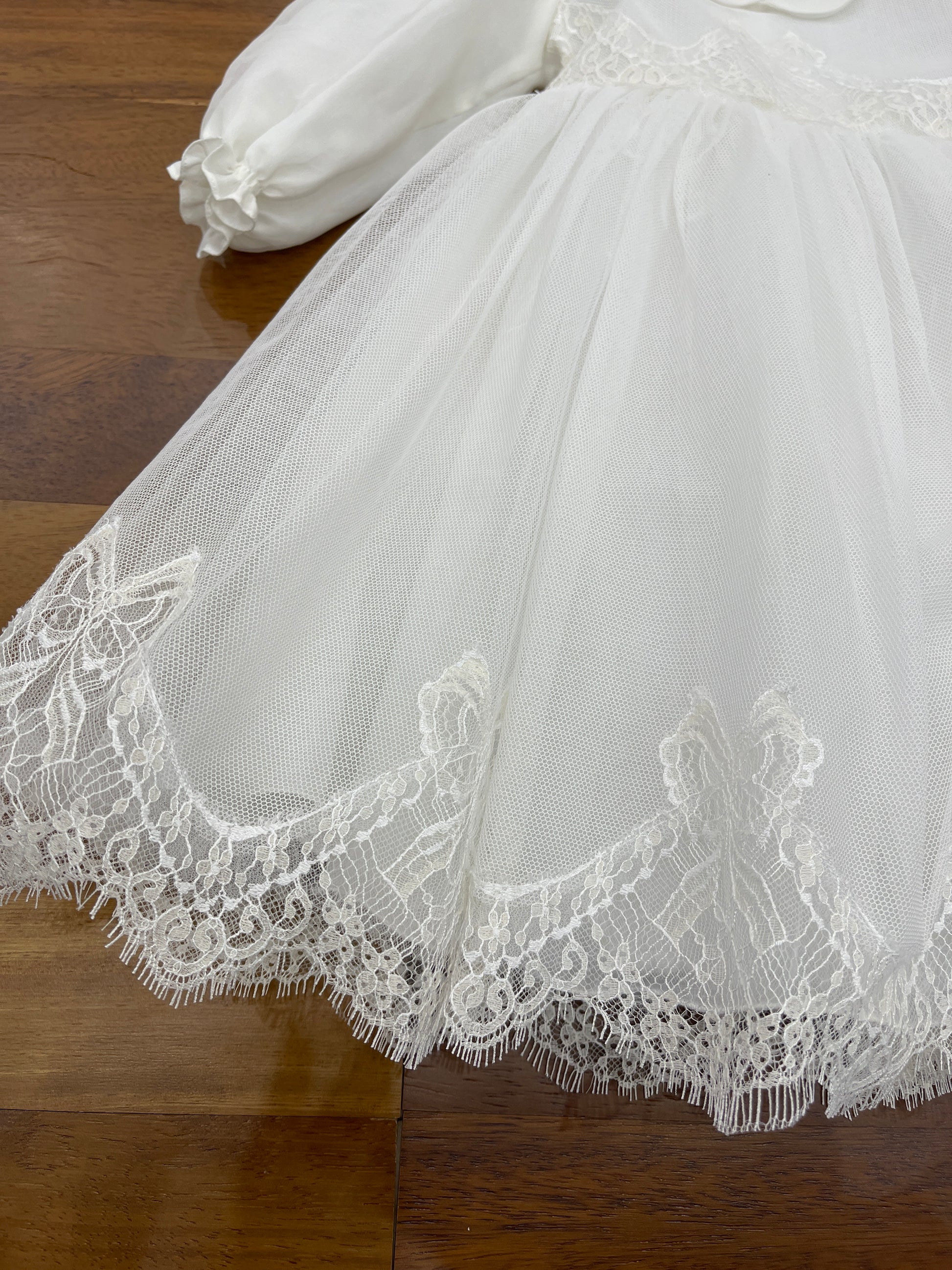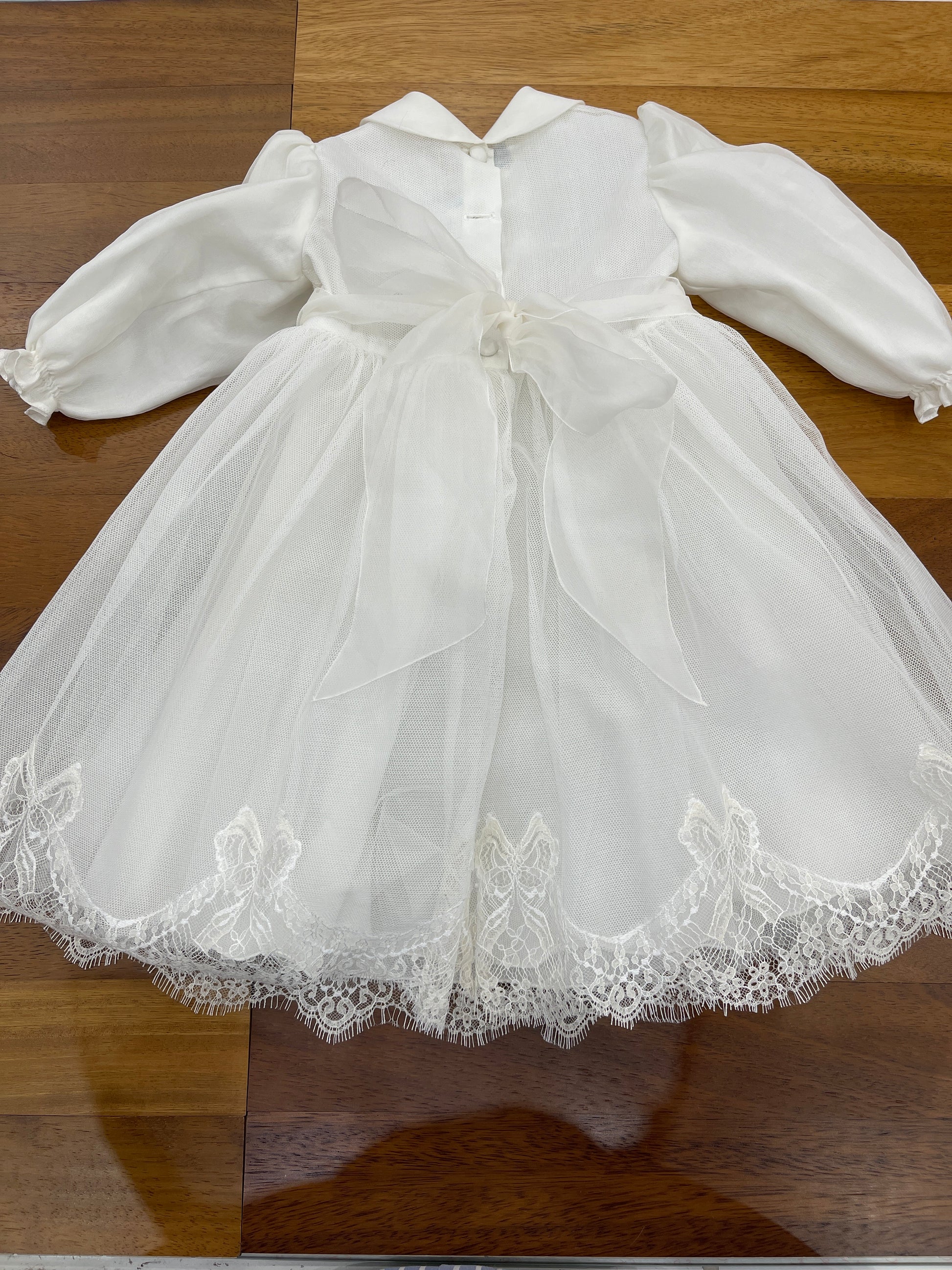 Abitino in seta con organza e tulle, caratterizzato da un collo tondo. Il corpetto è realizzato in microtulle, con un'applicazione di pizzo posta tra il corpetto e la gonna. Lo stesso pizzo rifinisce il bordo della gonna, che presenta una linea molto pulita. Colletto e maniche sono rifiniti in organza liscia, mentre sul retro si trova una chiusura con bottoncini e un laccio in organza.
