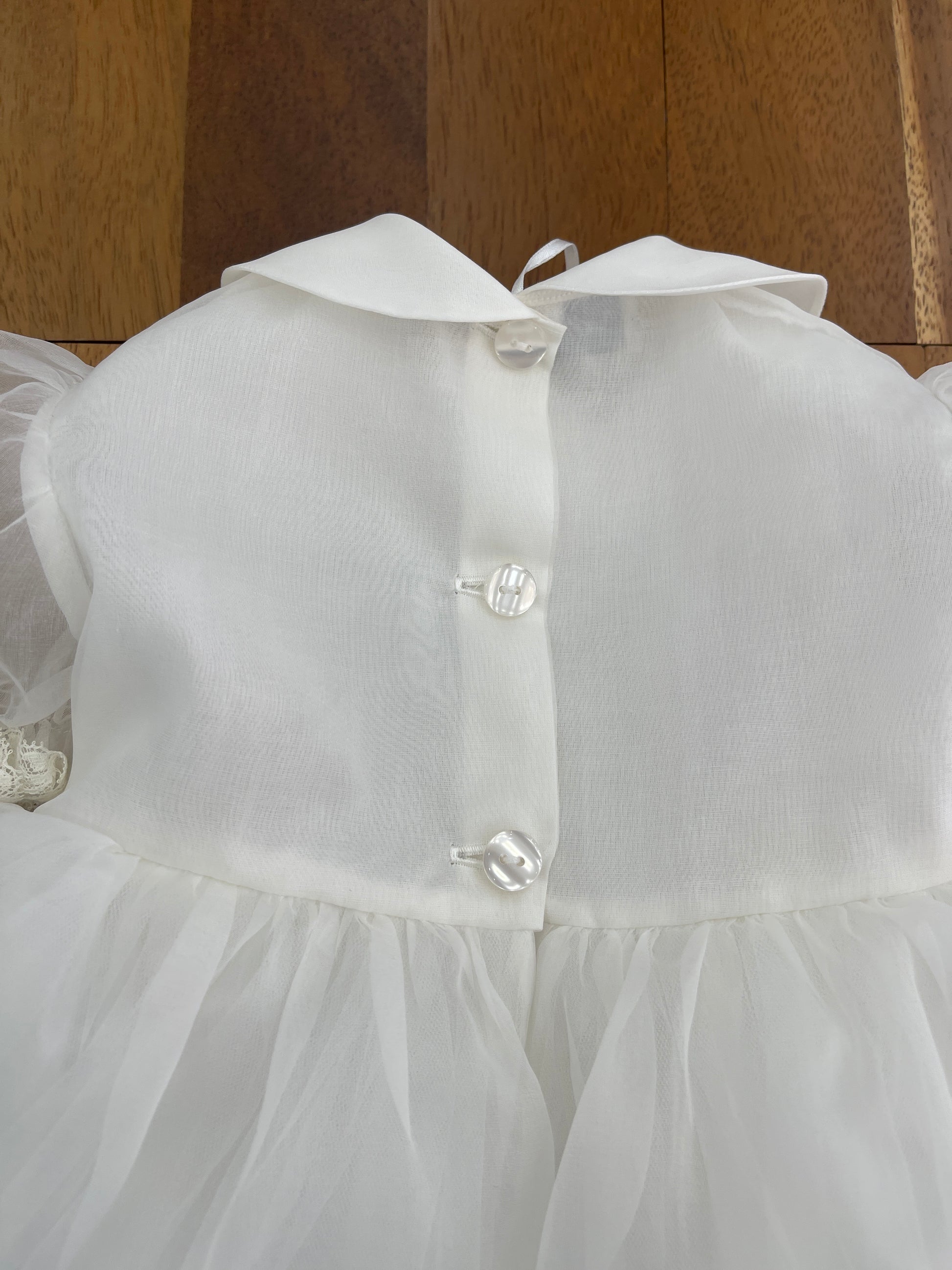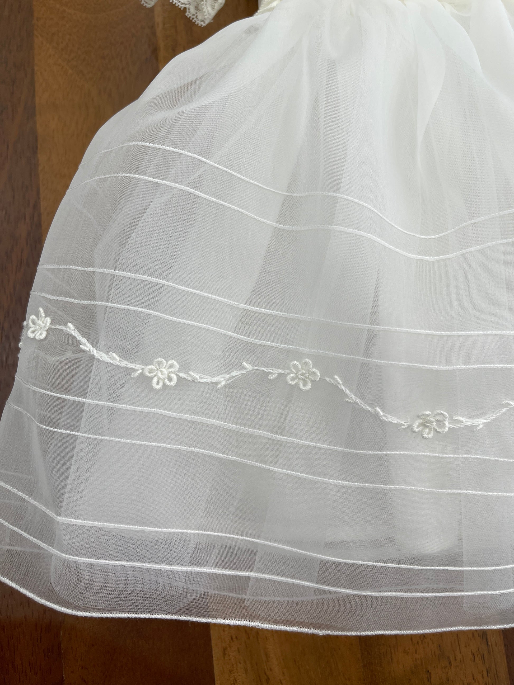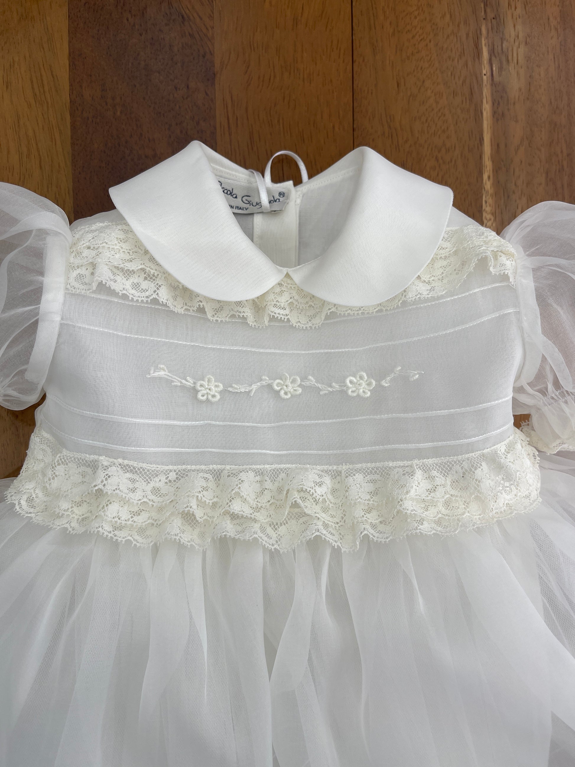 Questo abitino in organza presenta uno scollo tondo e un corpetto arricchito da multiple balze in valancienne lungo i bordi. Al centro si nota una delicata greca di fiorellini finemente ricamata. Le maniche a sbuffo trasparenti sono rifinite con bordi in valancienne. La gonna ampia è ornata da fasce di cordone ricamate a mano con motivi intrecciati che avvolgono l’intero capo. Sul retro, una chiusura con bottoncini garantisce una vestibilità impeccabile. Completa il coordinato una cuffietta in organza di seta, foderata in cotone di Battista e decorata con finiture in valancienne e greca di fiorellini ricamati a mano.