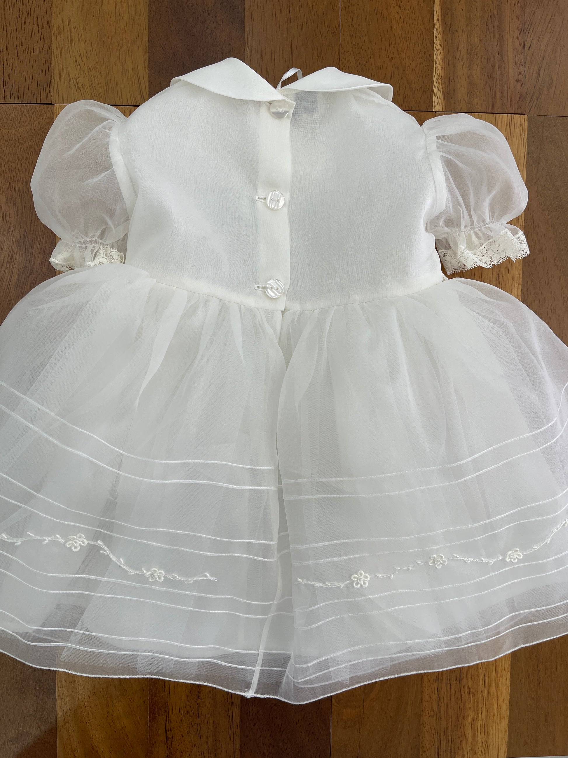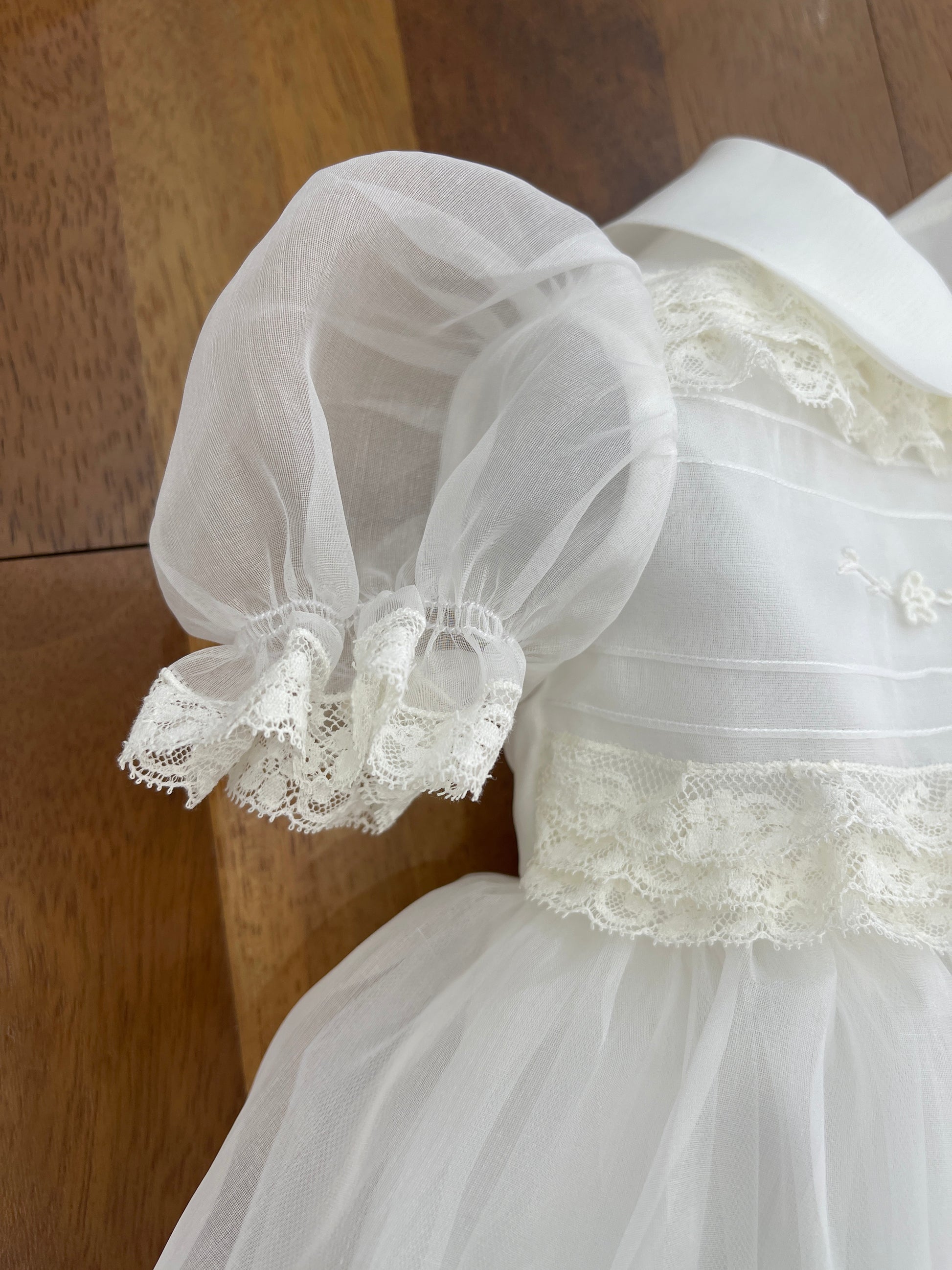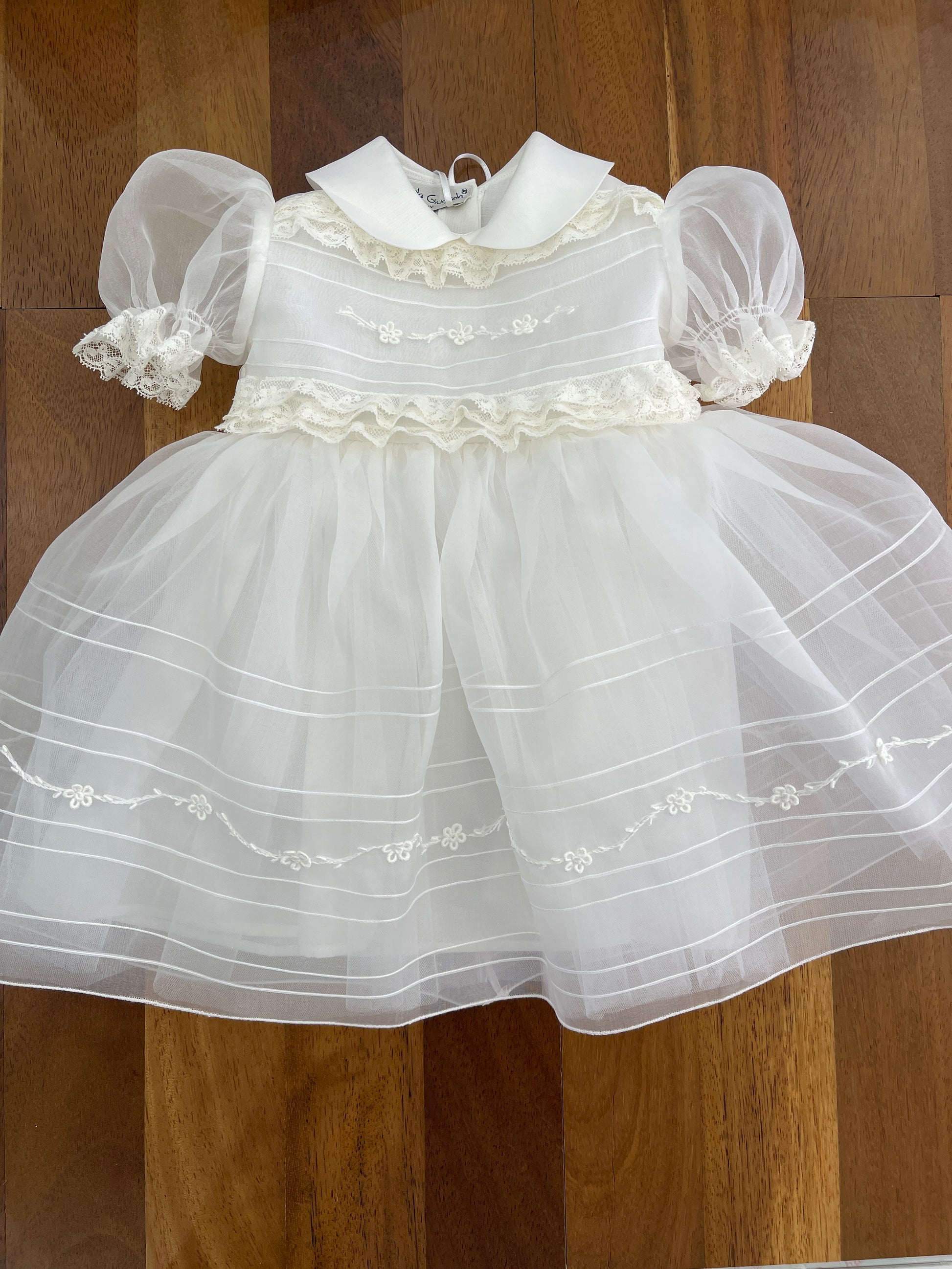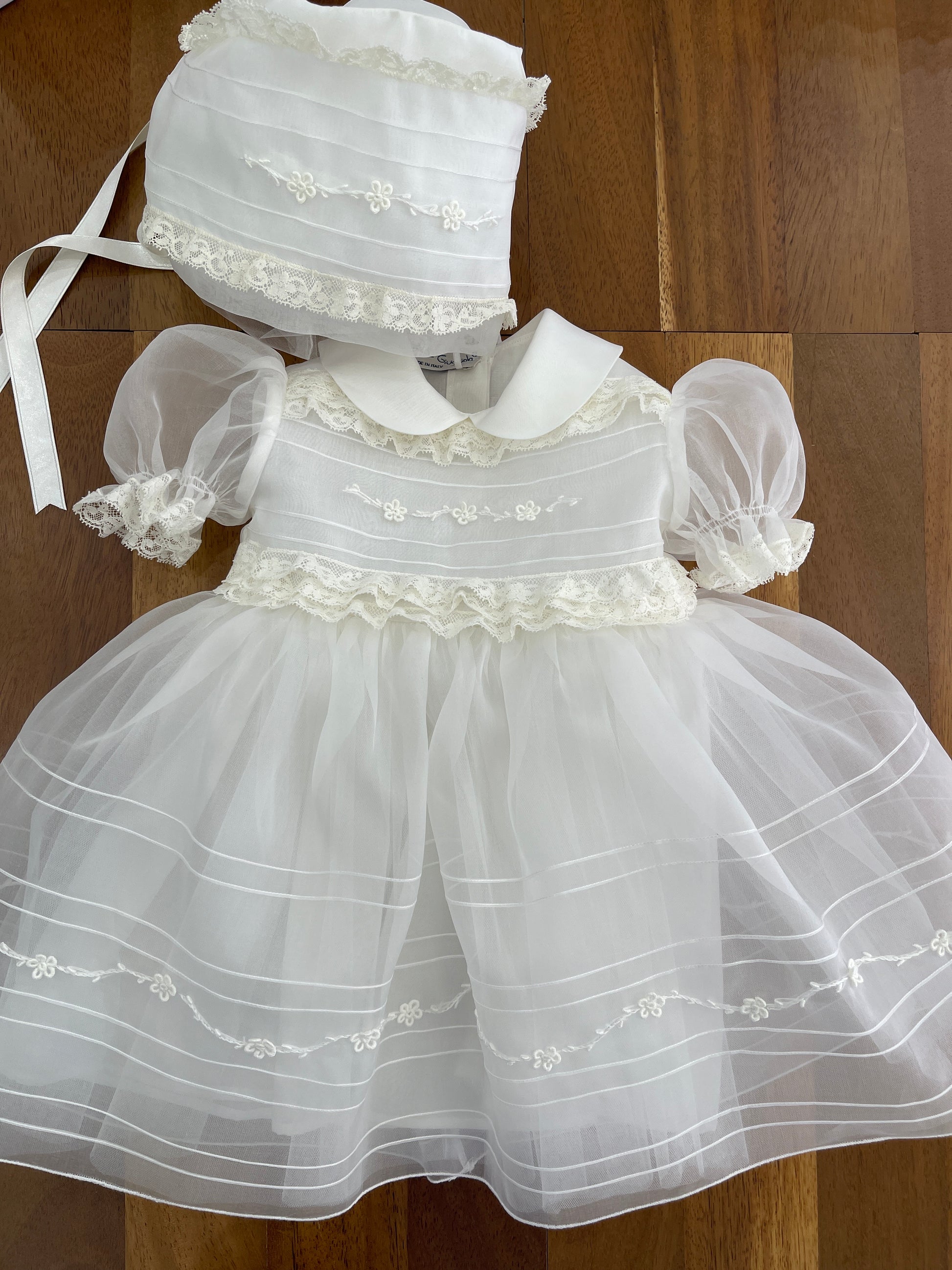 Questo abitino in organza presenta uno scollo tondo e un corpetto arricchito da multiple balze in valancienne lungo i bordi. Al centro si nota una delicata greca di fiorellini finemente ricamata. Le maniche a sbuffo trasparenti sono rifinite con bordi in valancienne. La gonna ampia è ornata da fasce di cordone ricamate a mano con motivi intrecciati che avvolgono l’intero capo. Sul retro, una chiusura con bottoncini garantisce una vestibilità impeccabile. Completa il coordinato una cuffietta in organza di seta, foderata in cotone di Battista e decorata con finiture in valancienne e greca di fiorellini ricamati a mano.