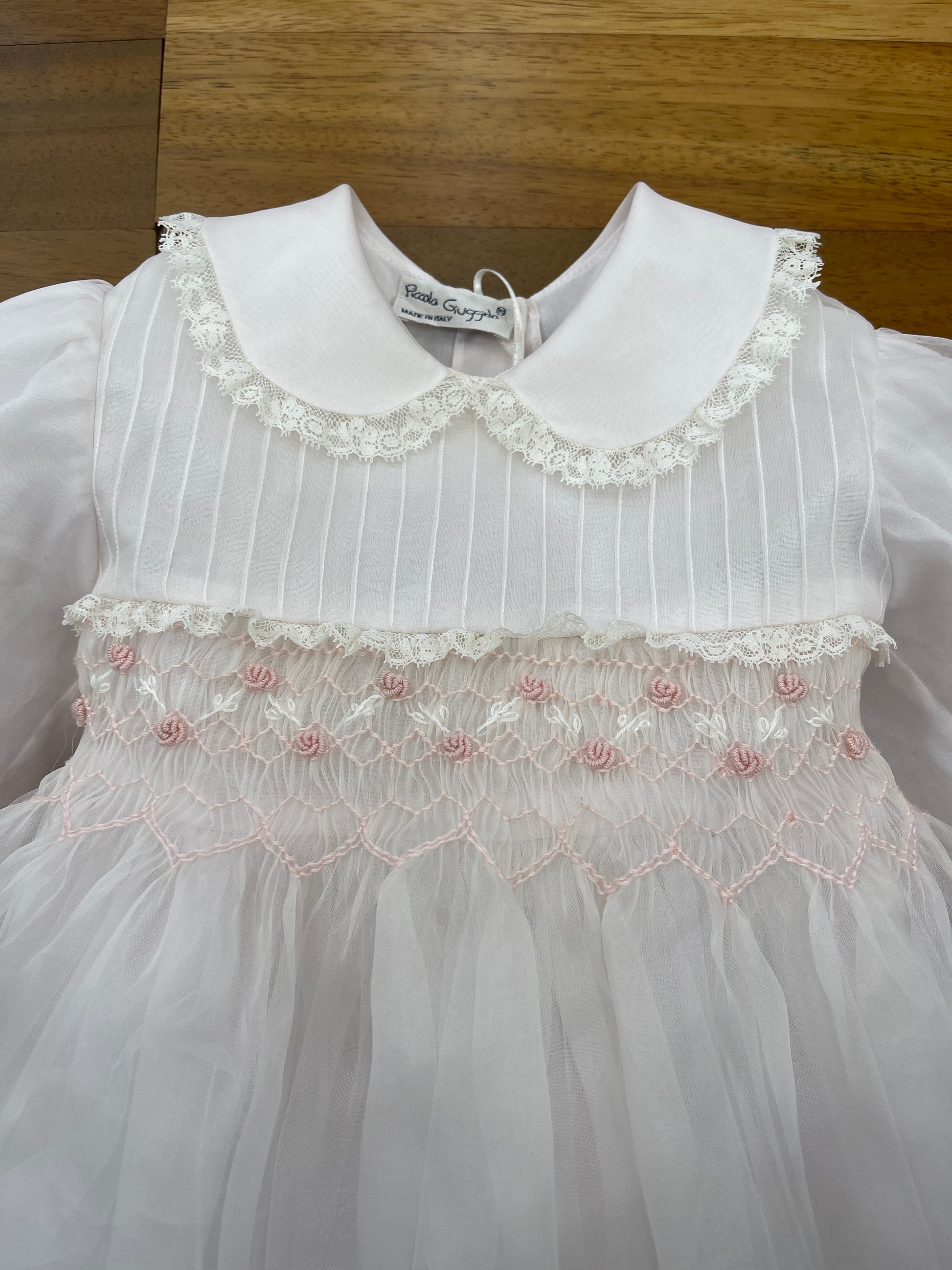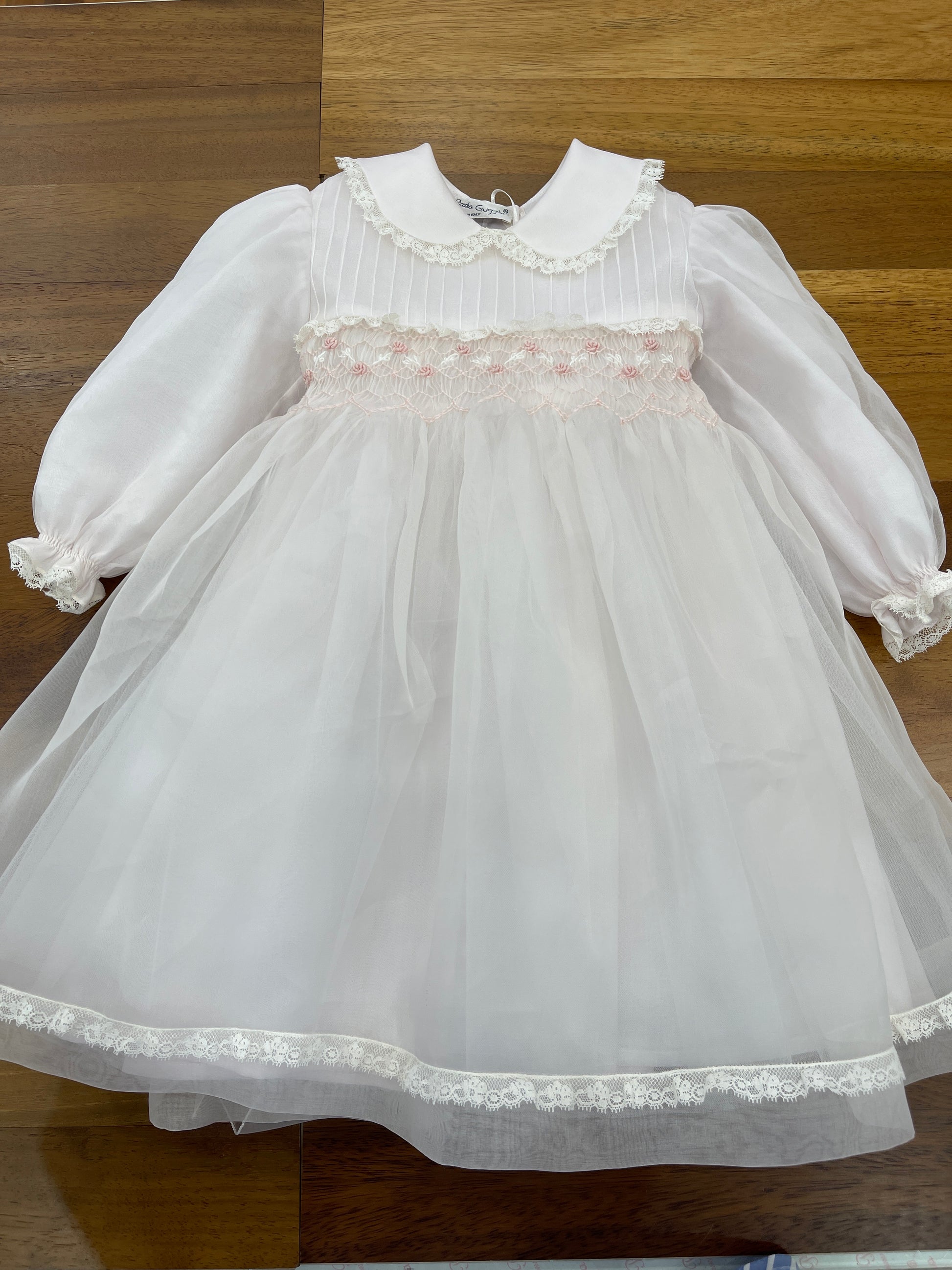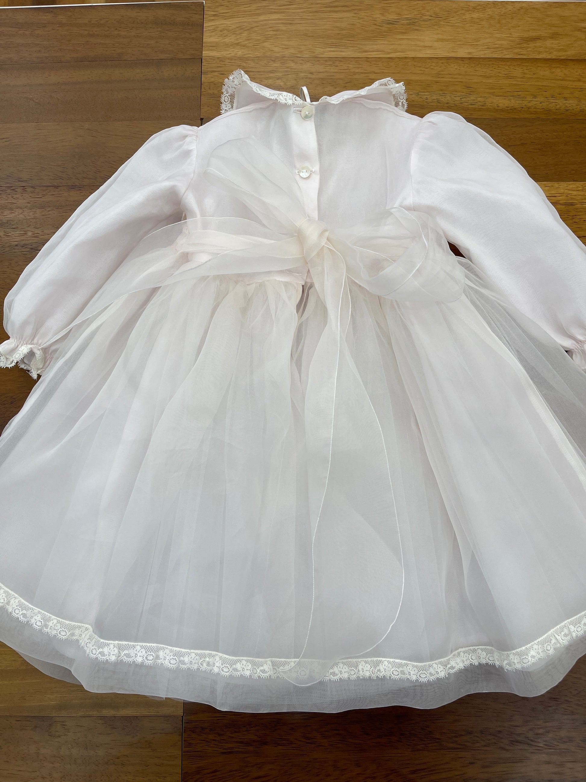 Abitino in organza di seta con collo tondo finemente lavorato e rifinito con balze in Valencienne. La manica lunga presenta un corpino con pieghe e un delicato lavoro a punto smock, arricchito da inserti in Valencienne sul davanti e da un gruppo di rosette ricamate a mano. La gonna liscia è impreziosita da una balza in Valencienne al bordo, mentre il retro è completato da bottoni in madreperla e un fiocco in organza, per un dettaglio elegante e raffinato.