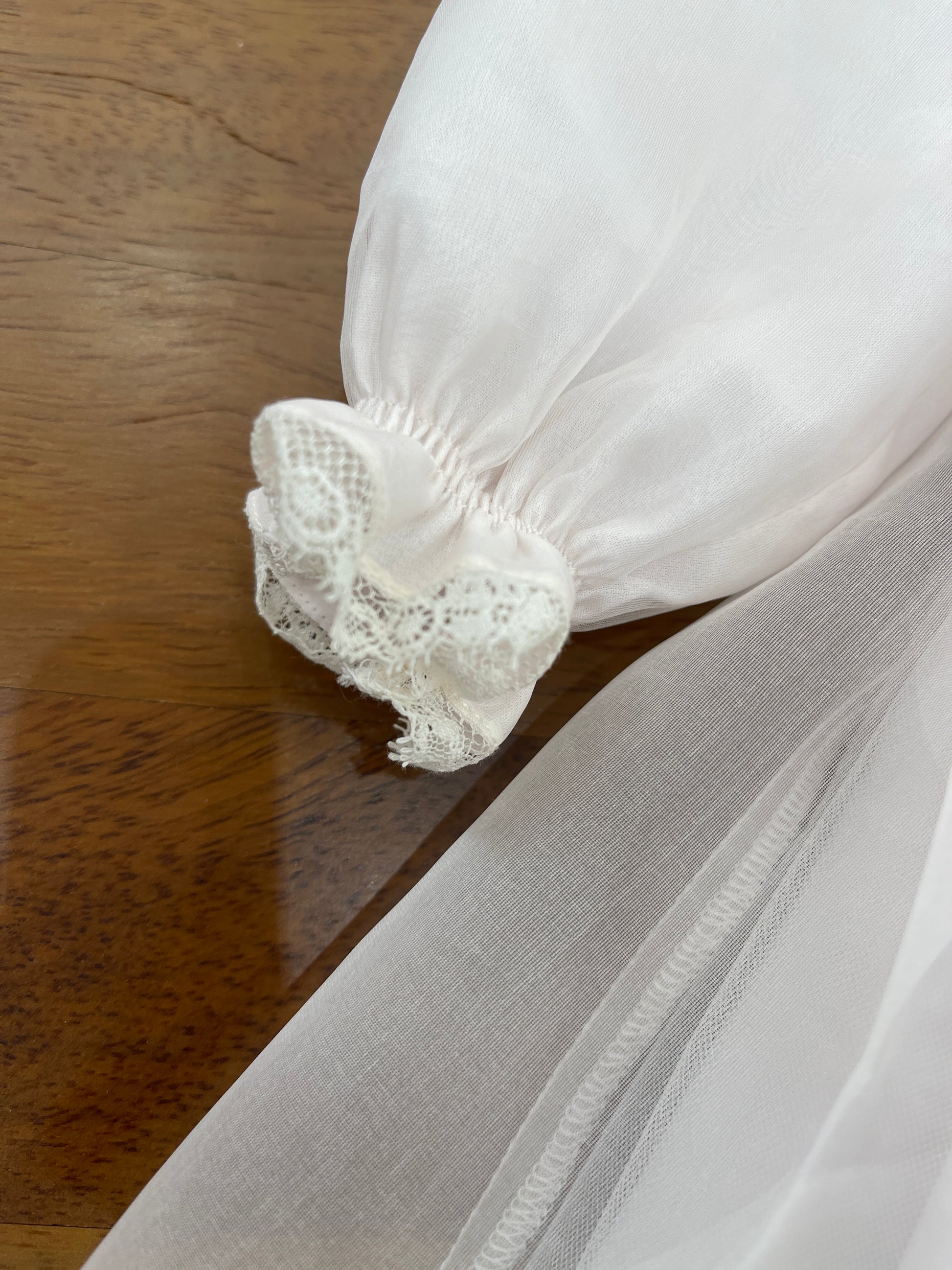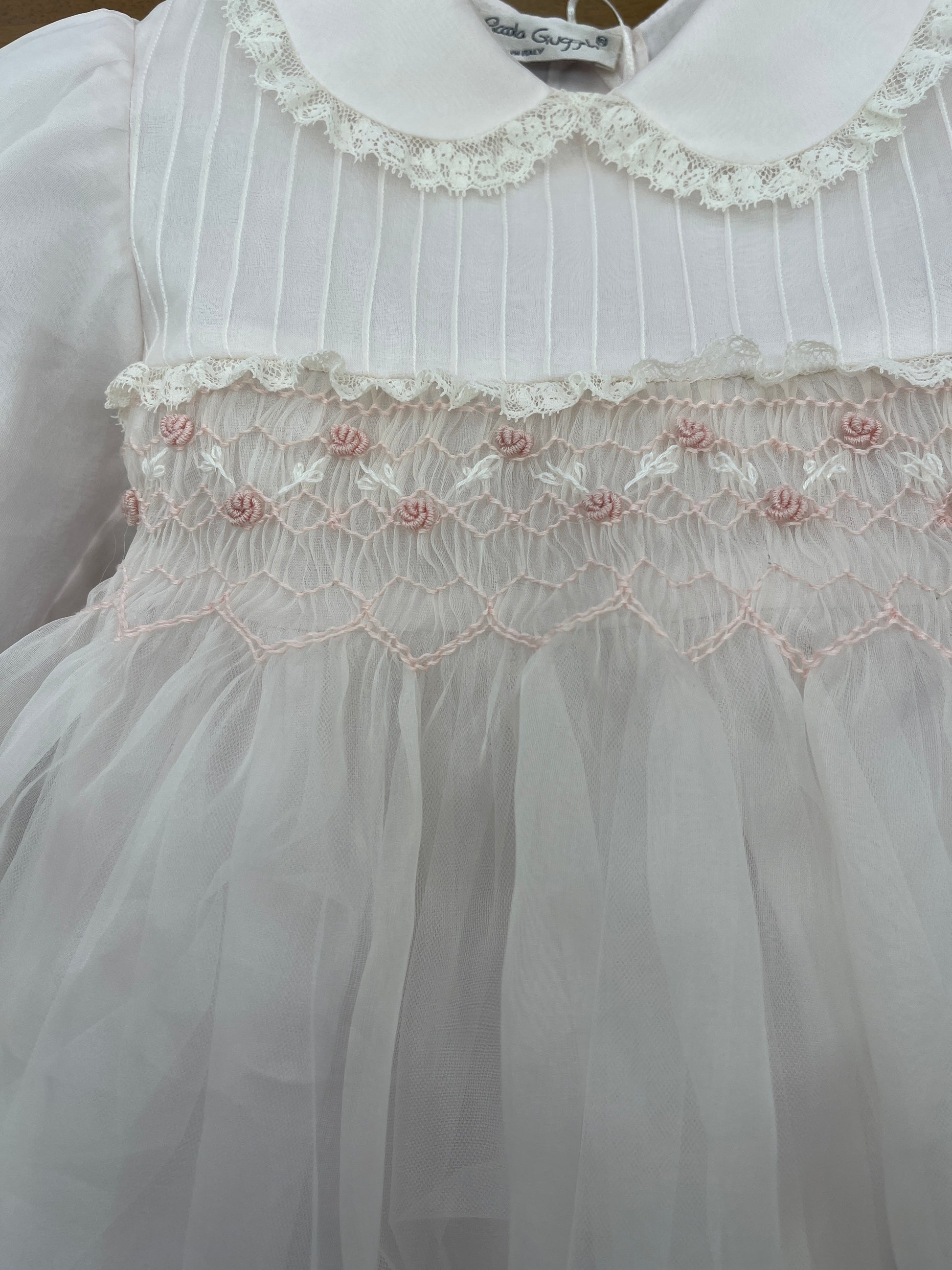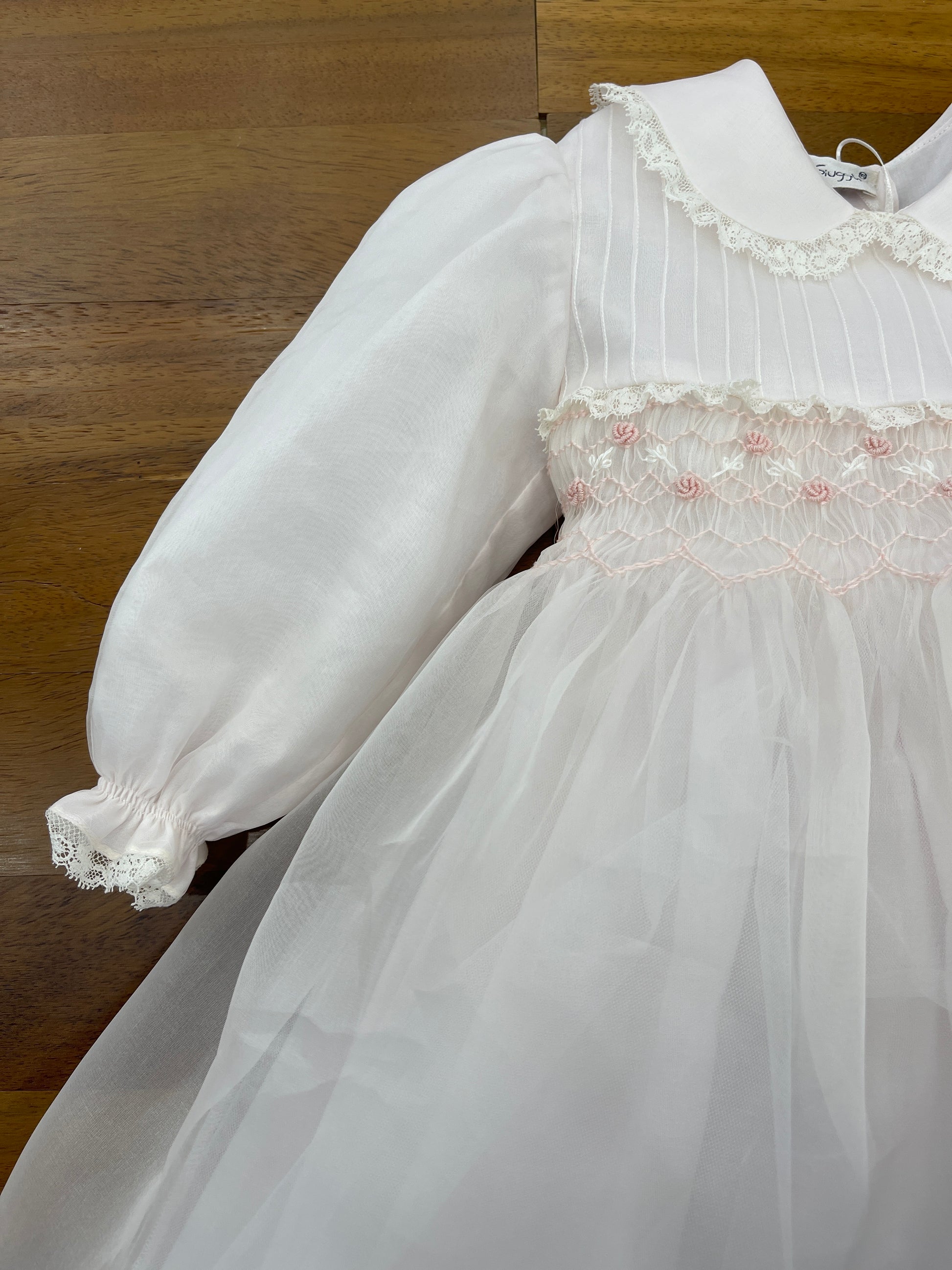 Abitino in organza di seta con collo tondo finemente lavorato e rifinito con balze in Valencienne. La manica lunga presenta un corpino con pieghe e un delicato lavoro a punto smock, arricchito da inserti in Valencienne sul davanti e da un gruppo di rosette ricamate a mano. La gonna liscia è impreziosita da una balza in Valencienne al bordo, mentre il retro è completato da bottoni in madreperla e un fiocco in organza, per un dettaglio elegante e raffinato.