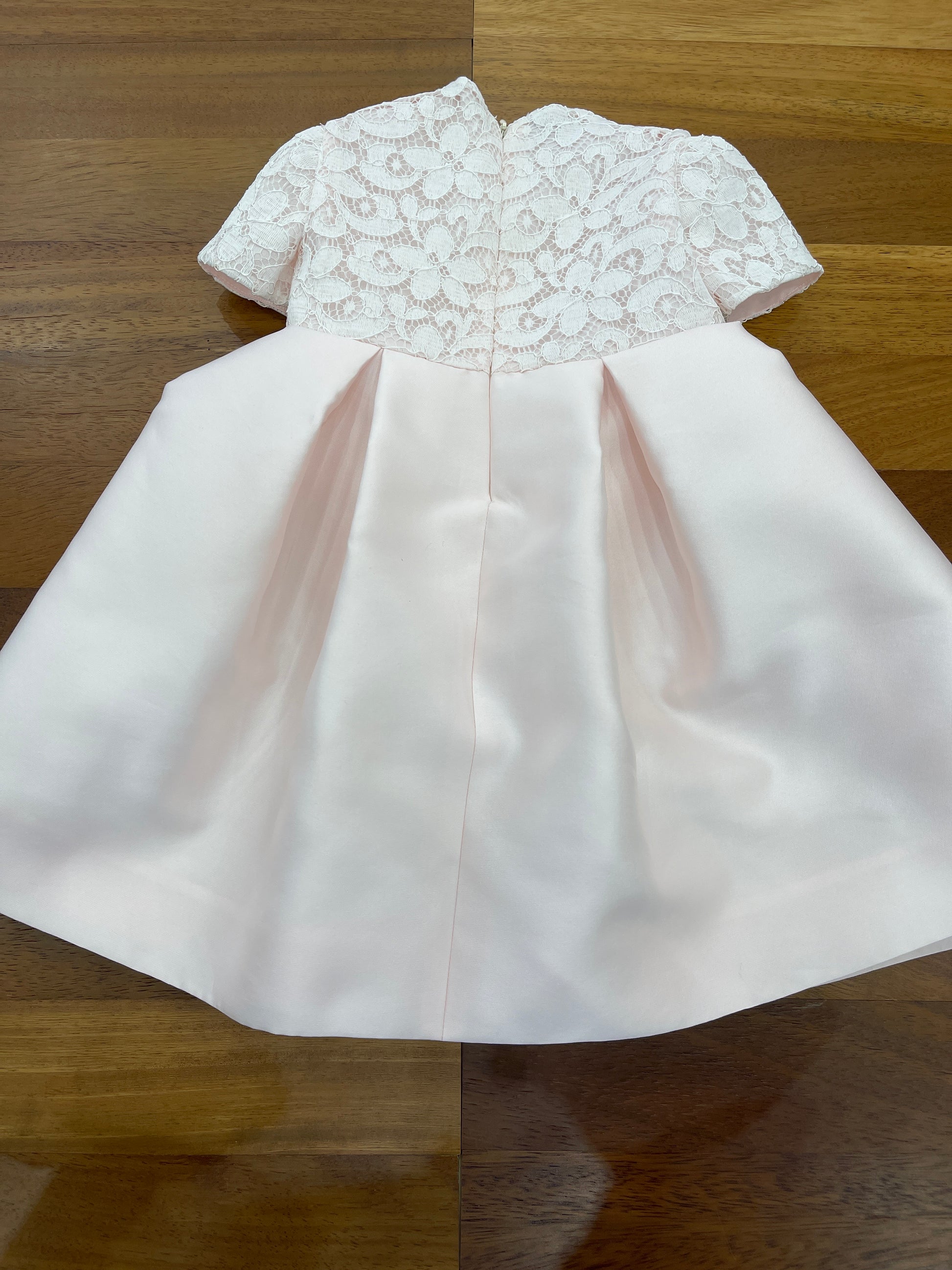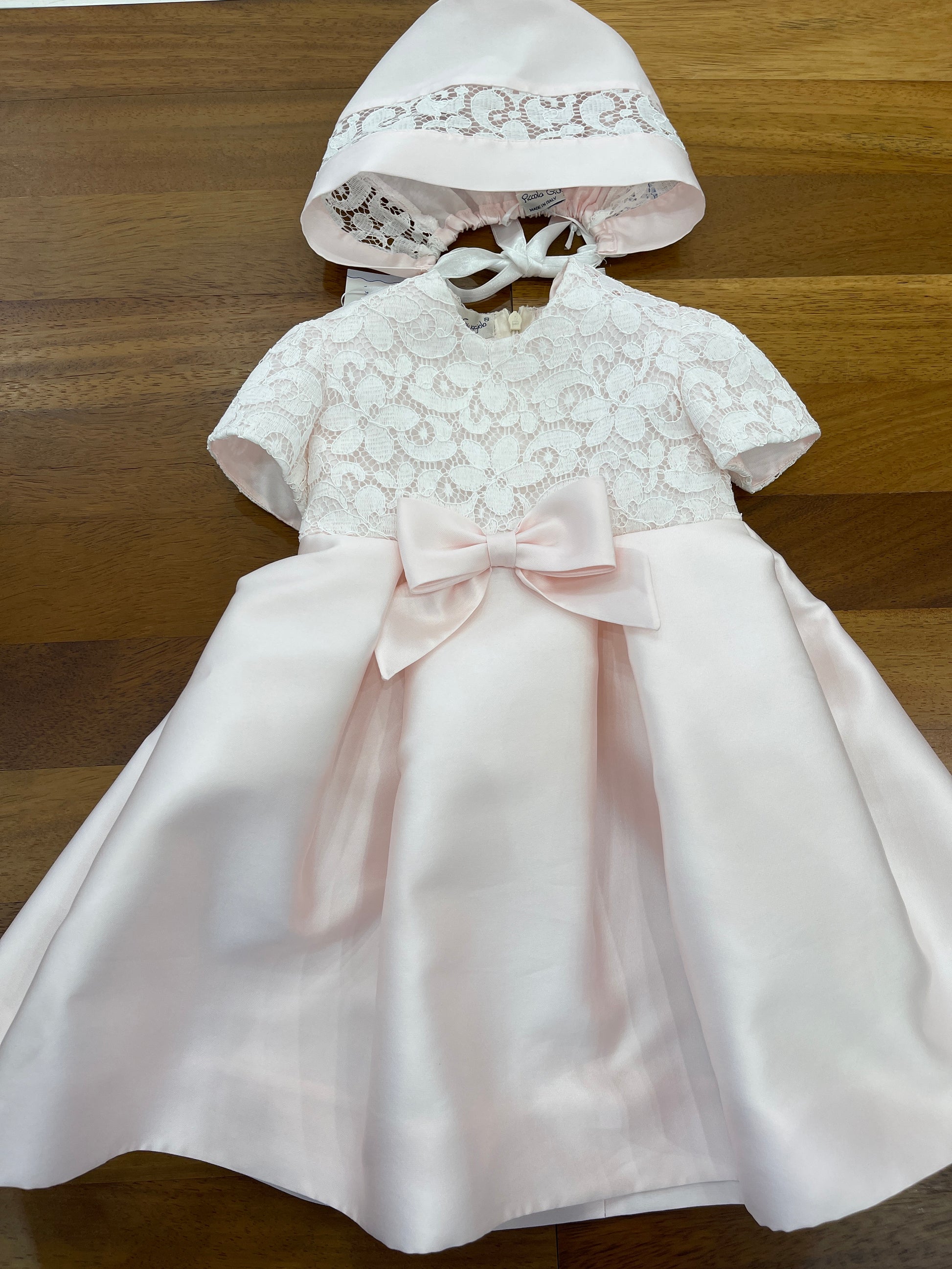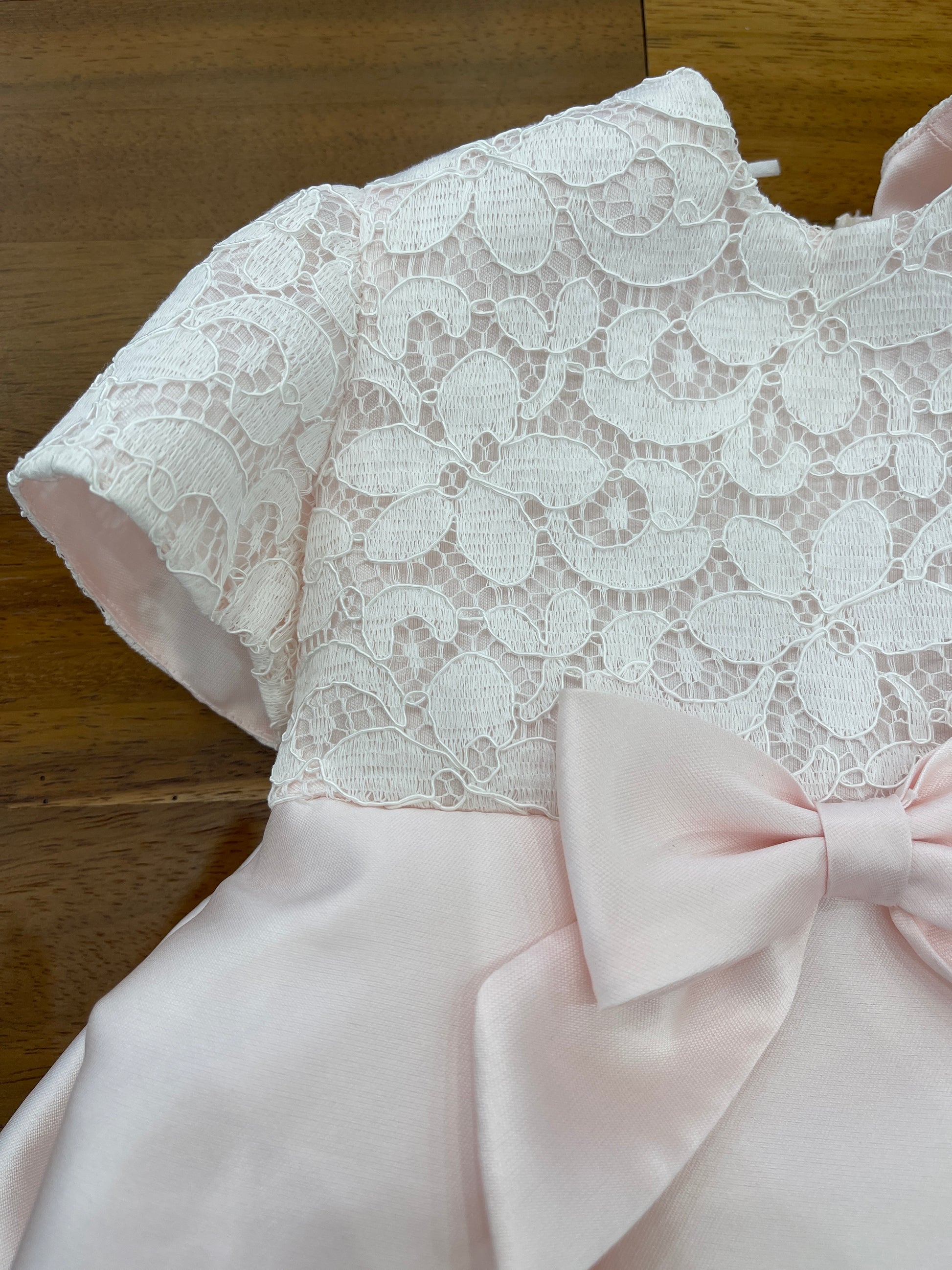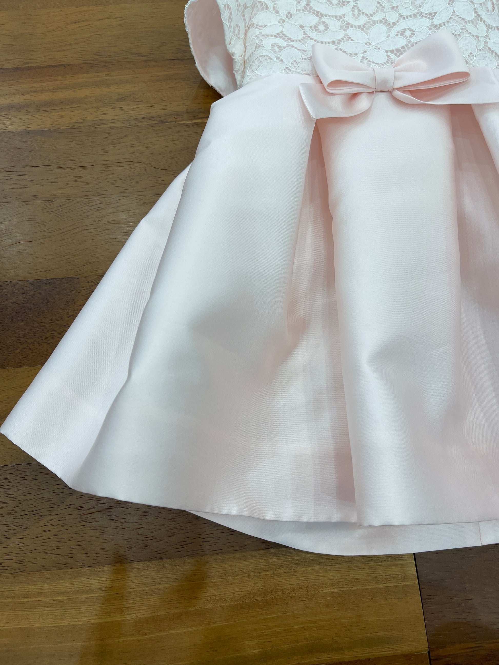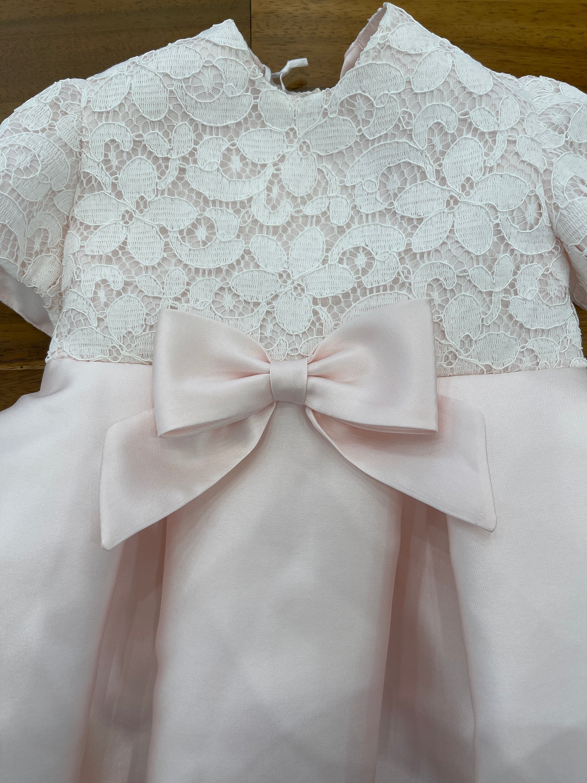 Abitino in micado a mezza manica, senza colletto, con corpetto completamente in pizzo e gonna ampia in micado liscio. Tra corpetto e gonna è applicato un fiocco realizzato interamente in micado.