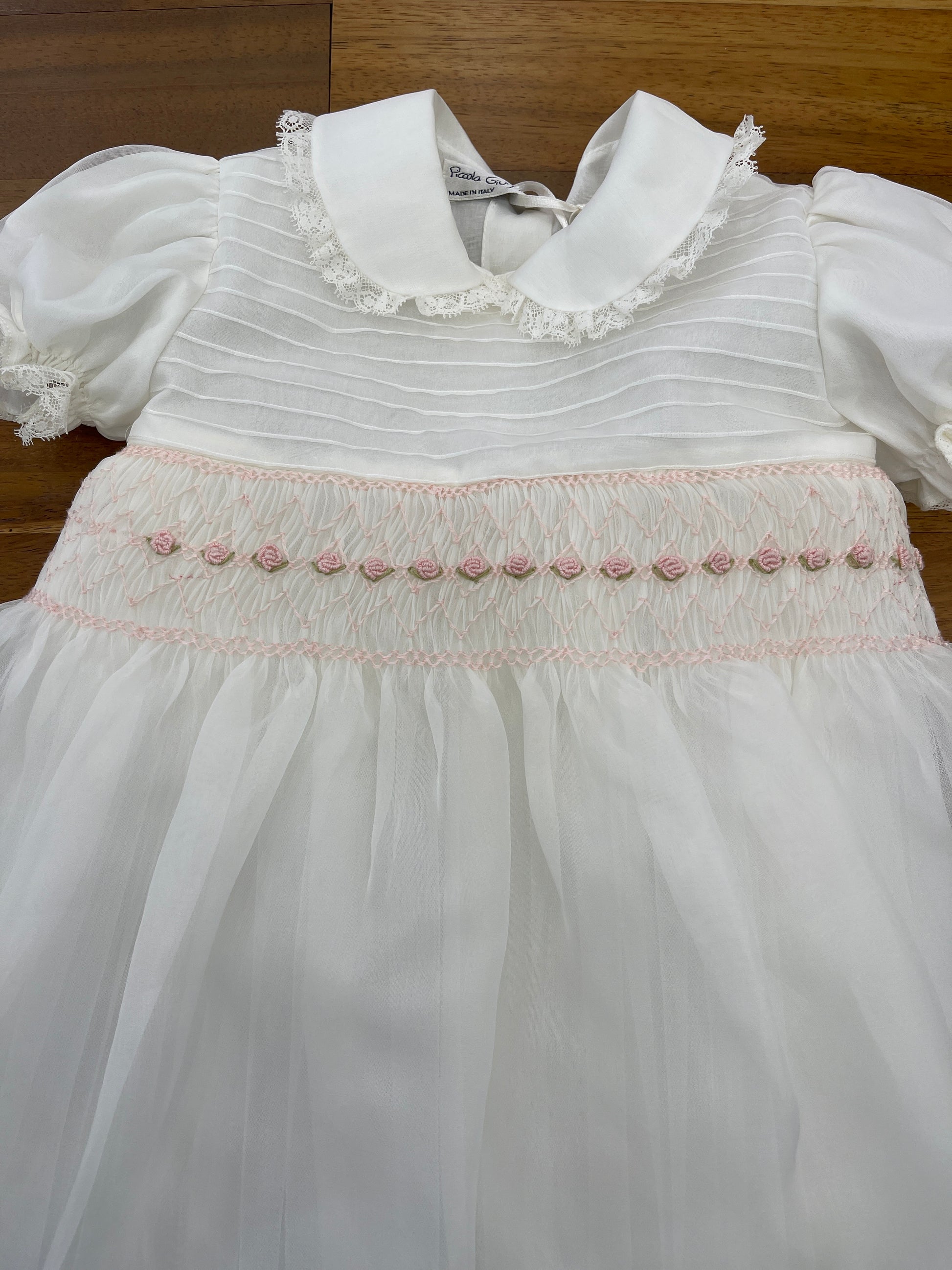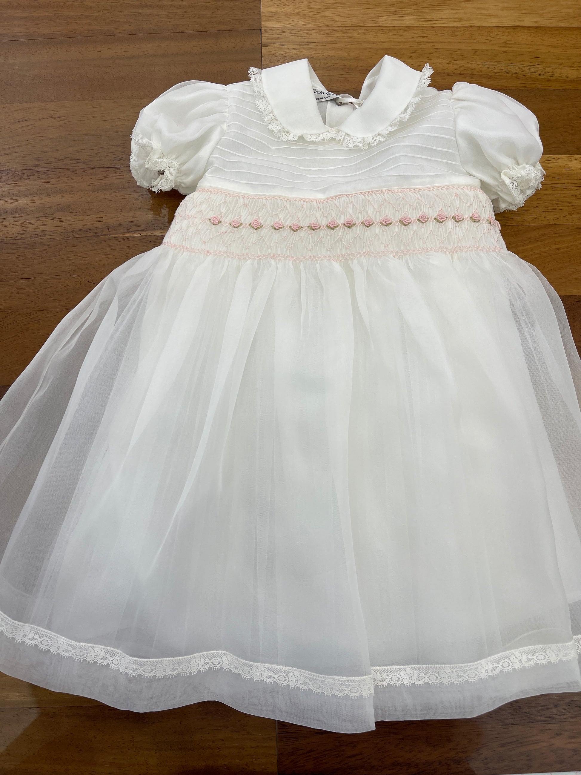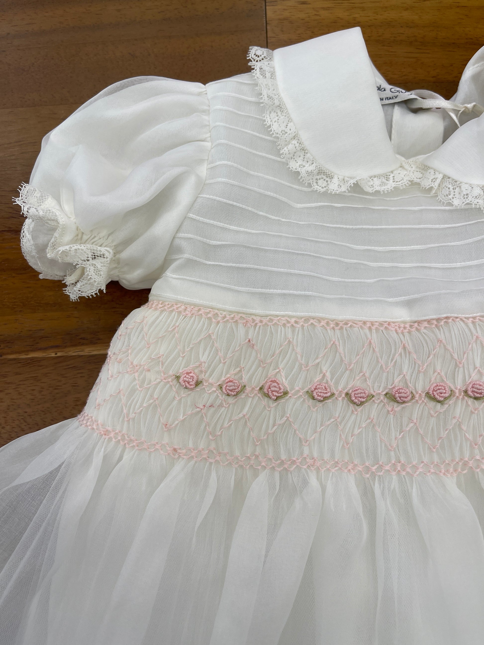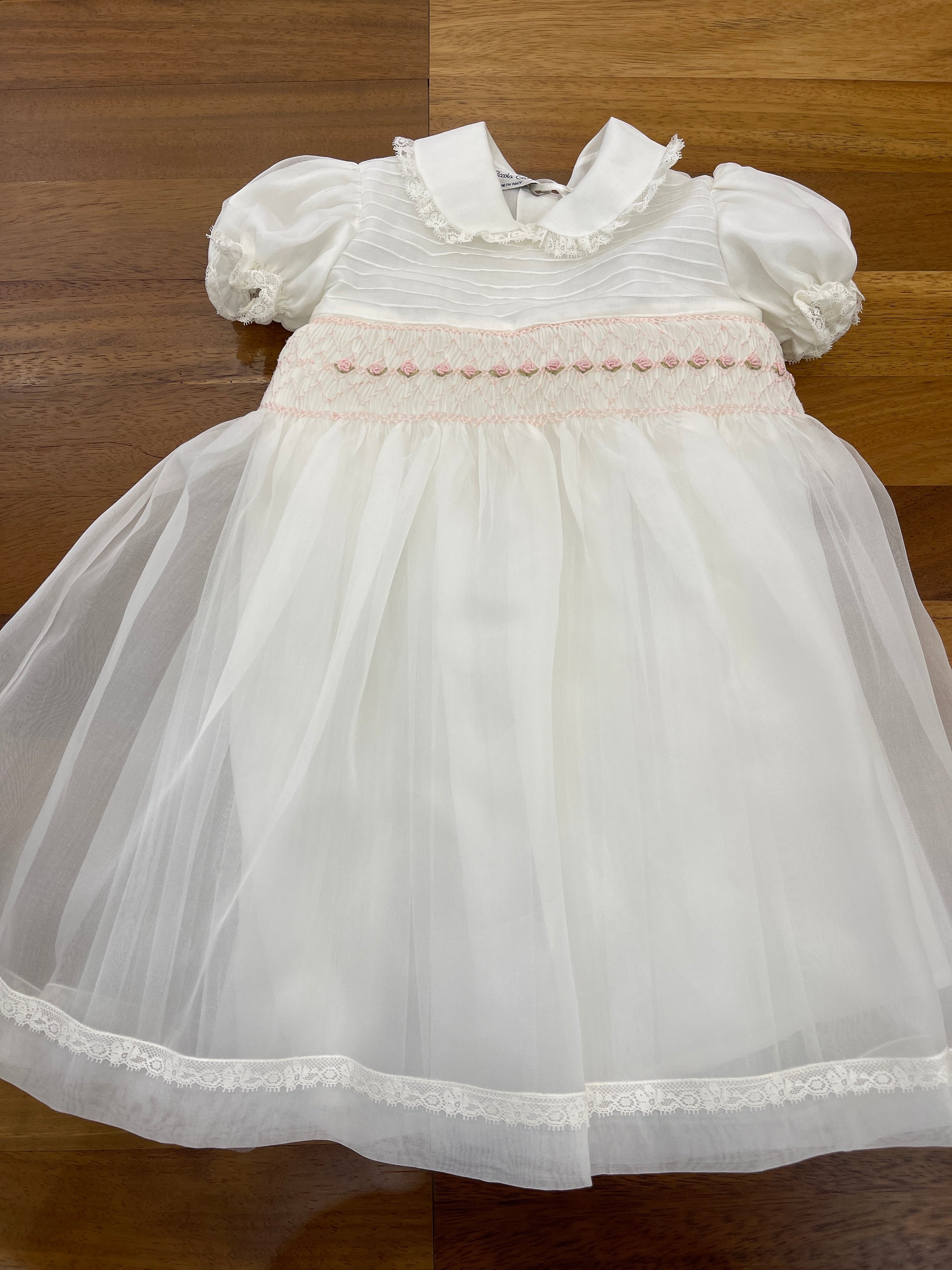 Abitino realizzato in organza di seta, con corpetto decorato da un raffinato punto smock e rosette ricamate a mano. La gonna ampia è rifinita con un delicato bordino valencienne, così come il colletto tondo e le maniche a sbuffo, che presentano lo stesso elegante dettaglio valencienne.
