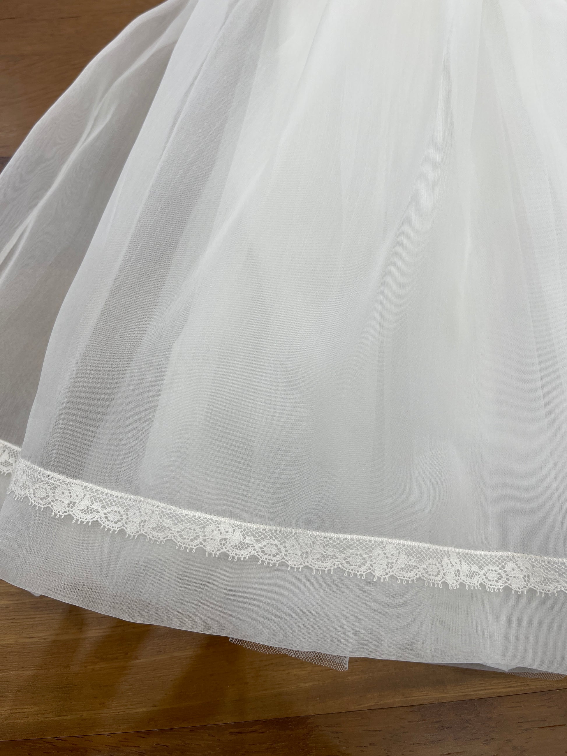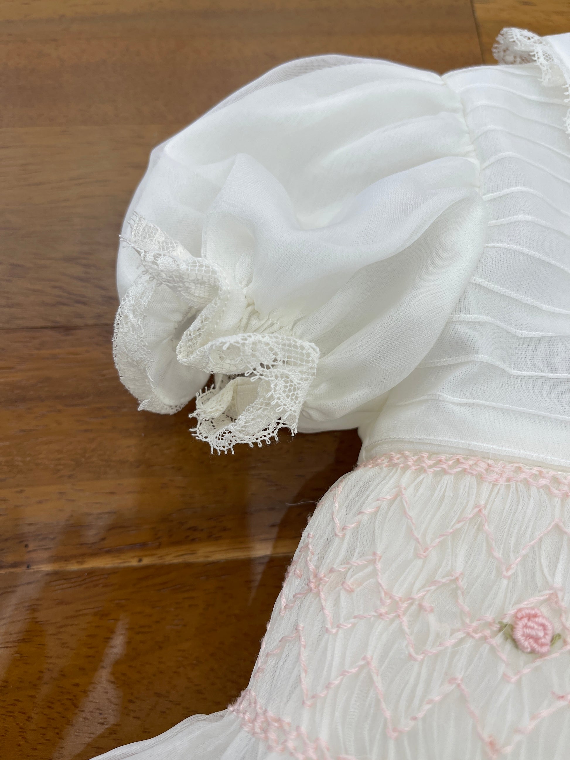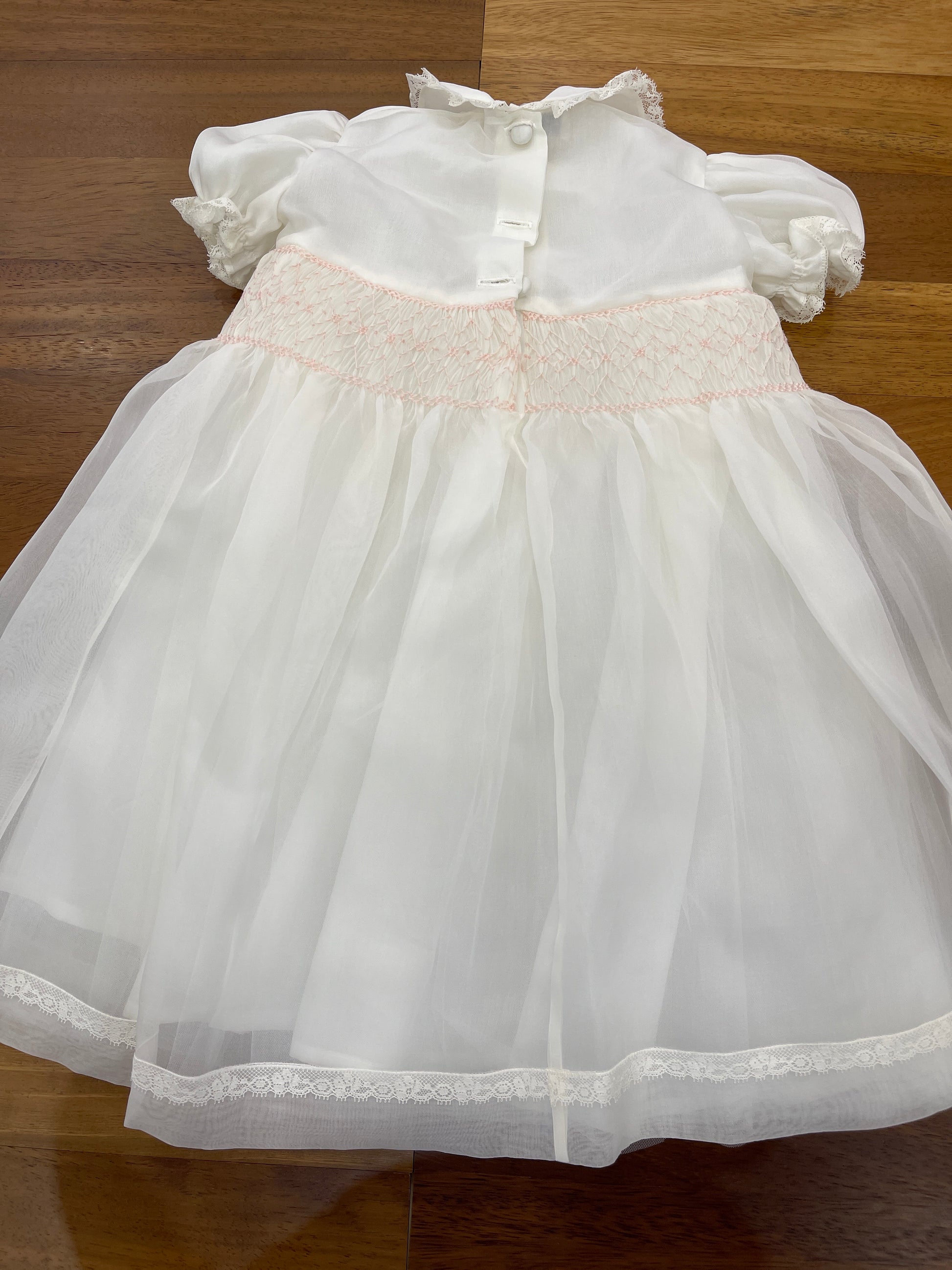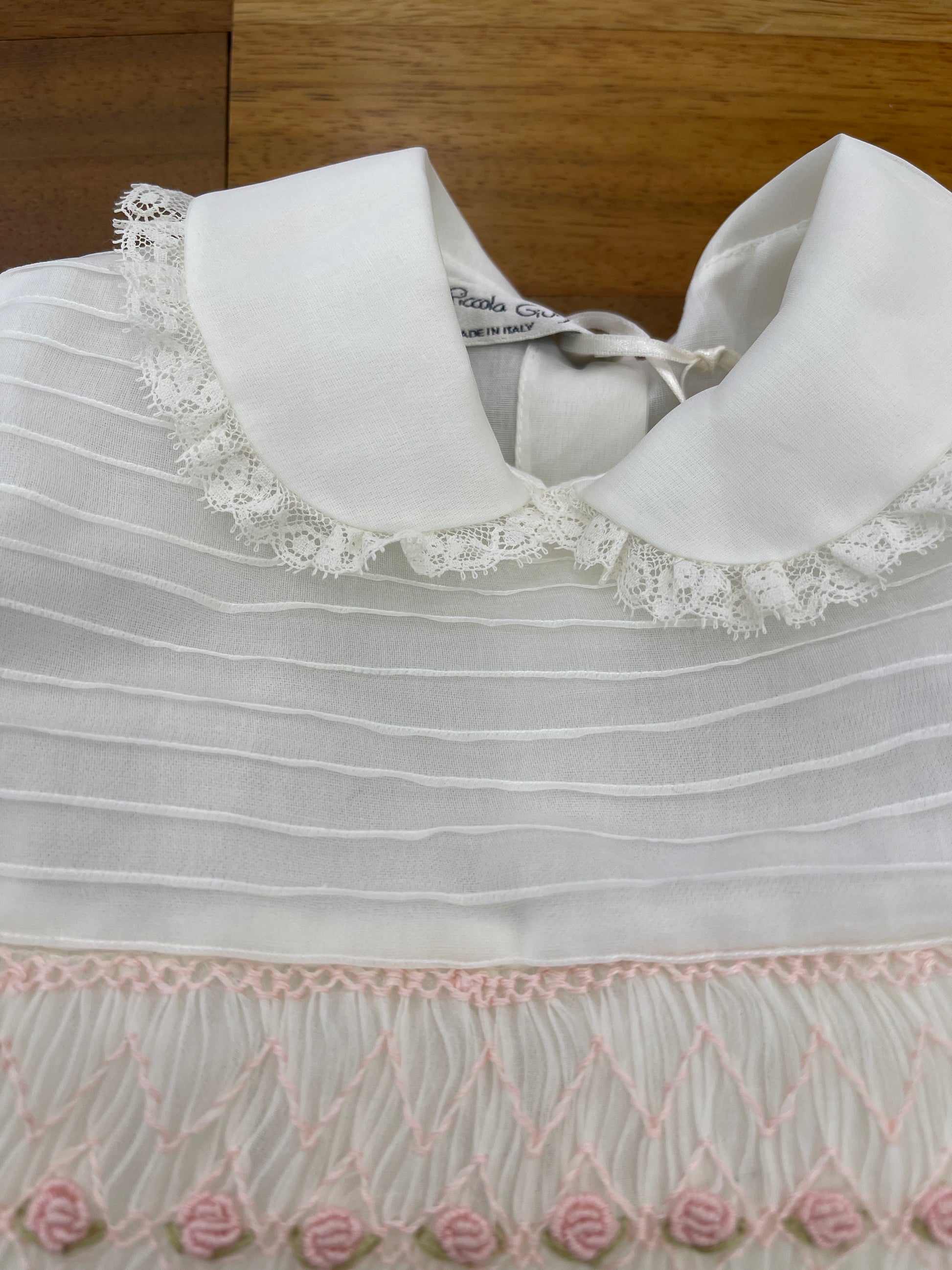 Abitino realizzato in organza di seta, con corpetto decorato da un raffinato punto smock e rosette ricamate a mano. La gonna ampia è rifinita con un delicato bordino valencienne, così come il colletto tondo e le maniche a sbuffo, che presentano lo stesso elegante dettaglio valencienne.
