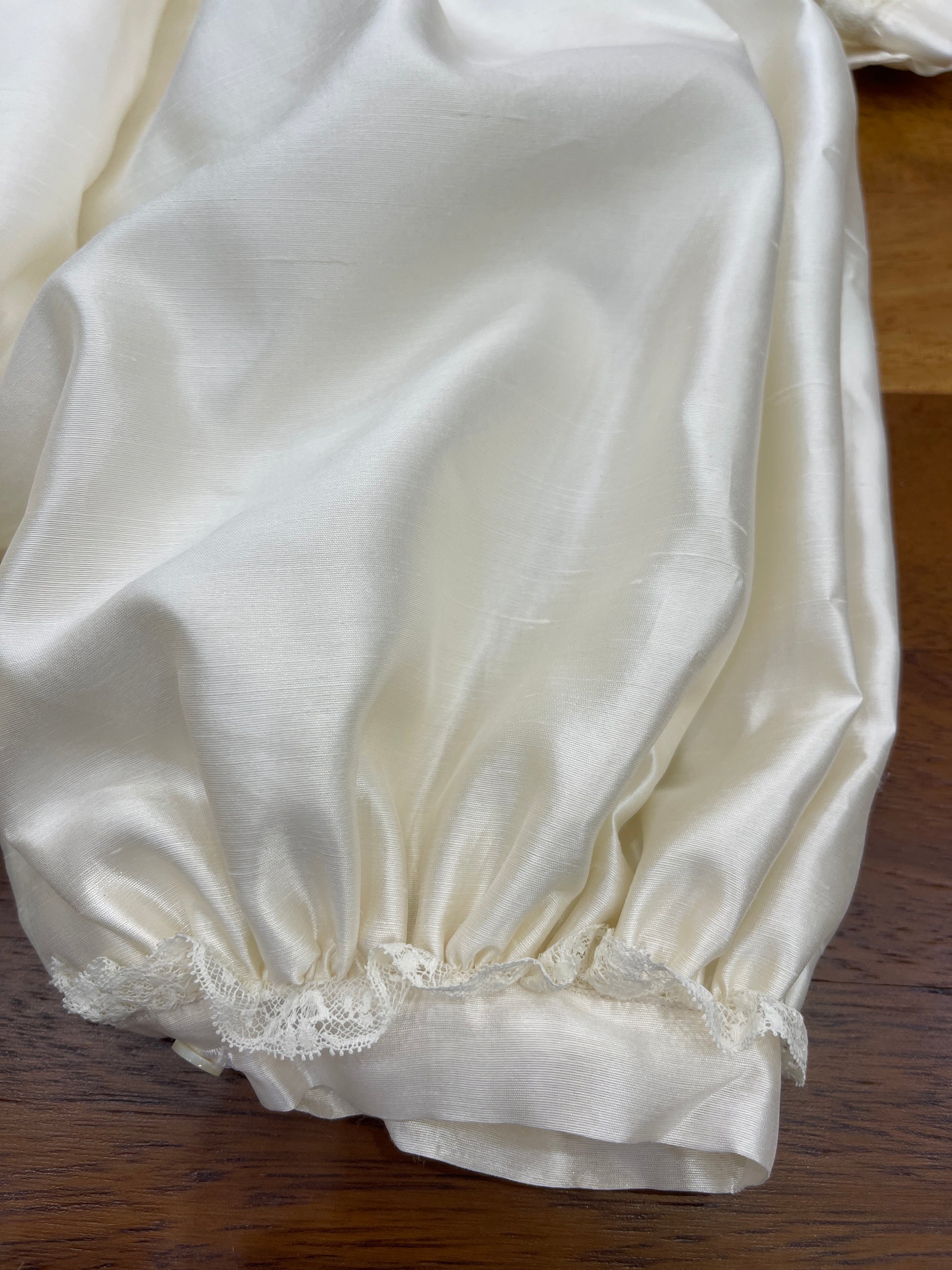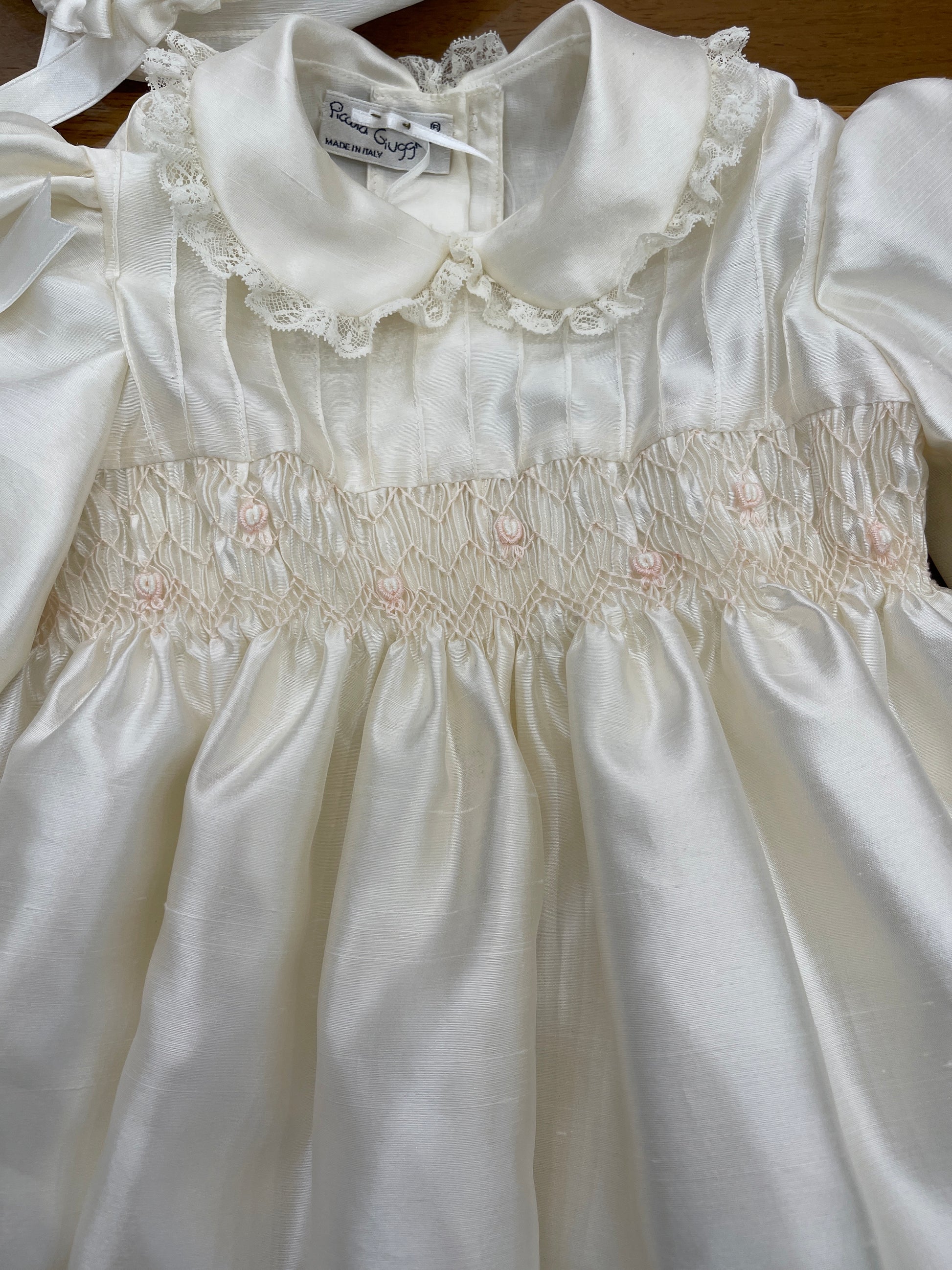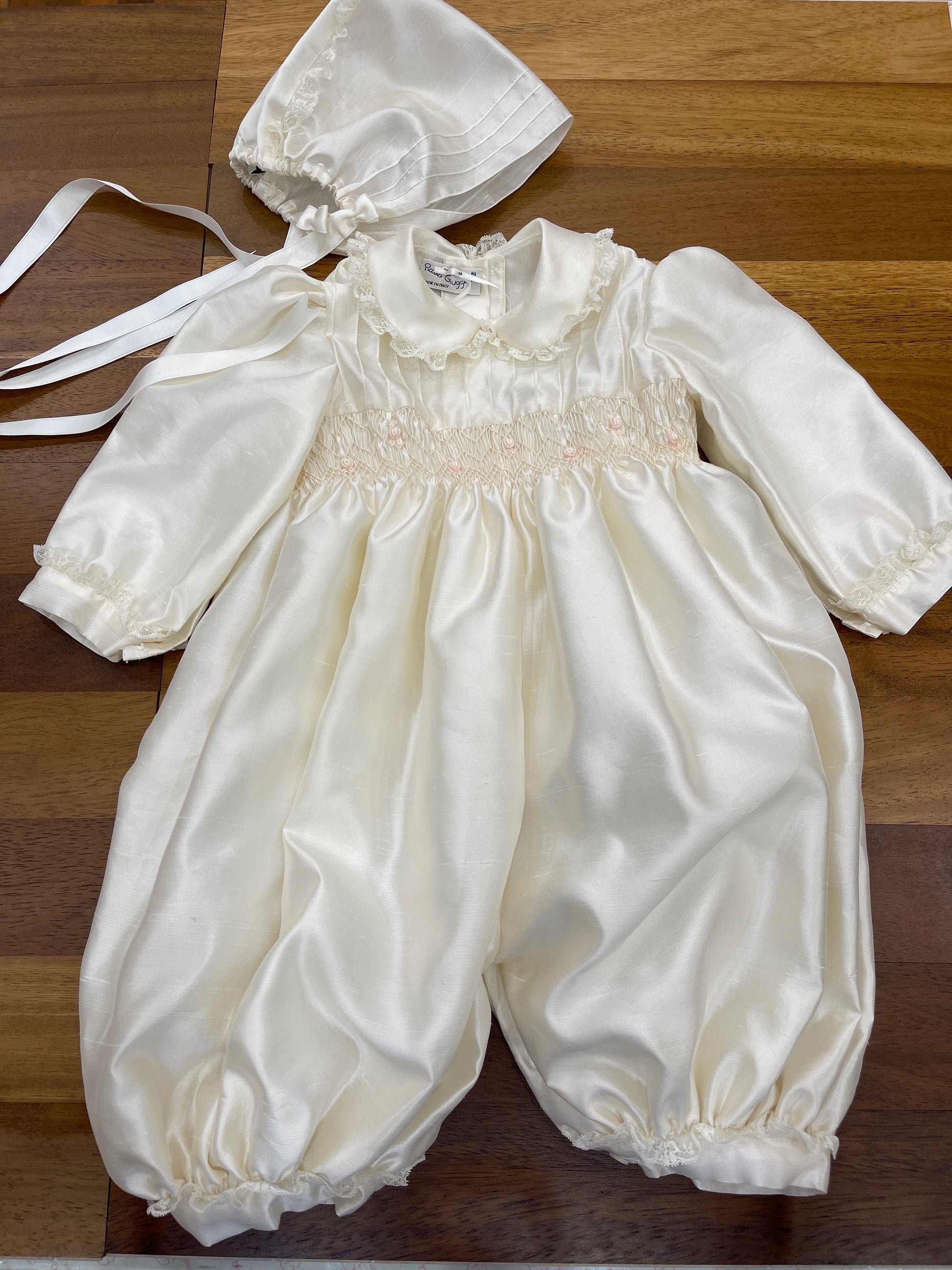 Pagliaccetto in shantung di seta caratterizzato da un collo tondo impreziosito da un delicato rifinitura in valencienne. Il copretto è ornato con fiorellini ricamati a mano e completato da un polsino sempre rifinito in valencienne. Le maniche lunghe, anch’esse decorate con valencienne, si abbinano perfettamente alla cuffia coordinata, creando un insieme raffinato e curato nei dettagli.