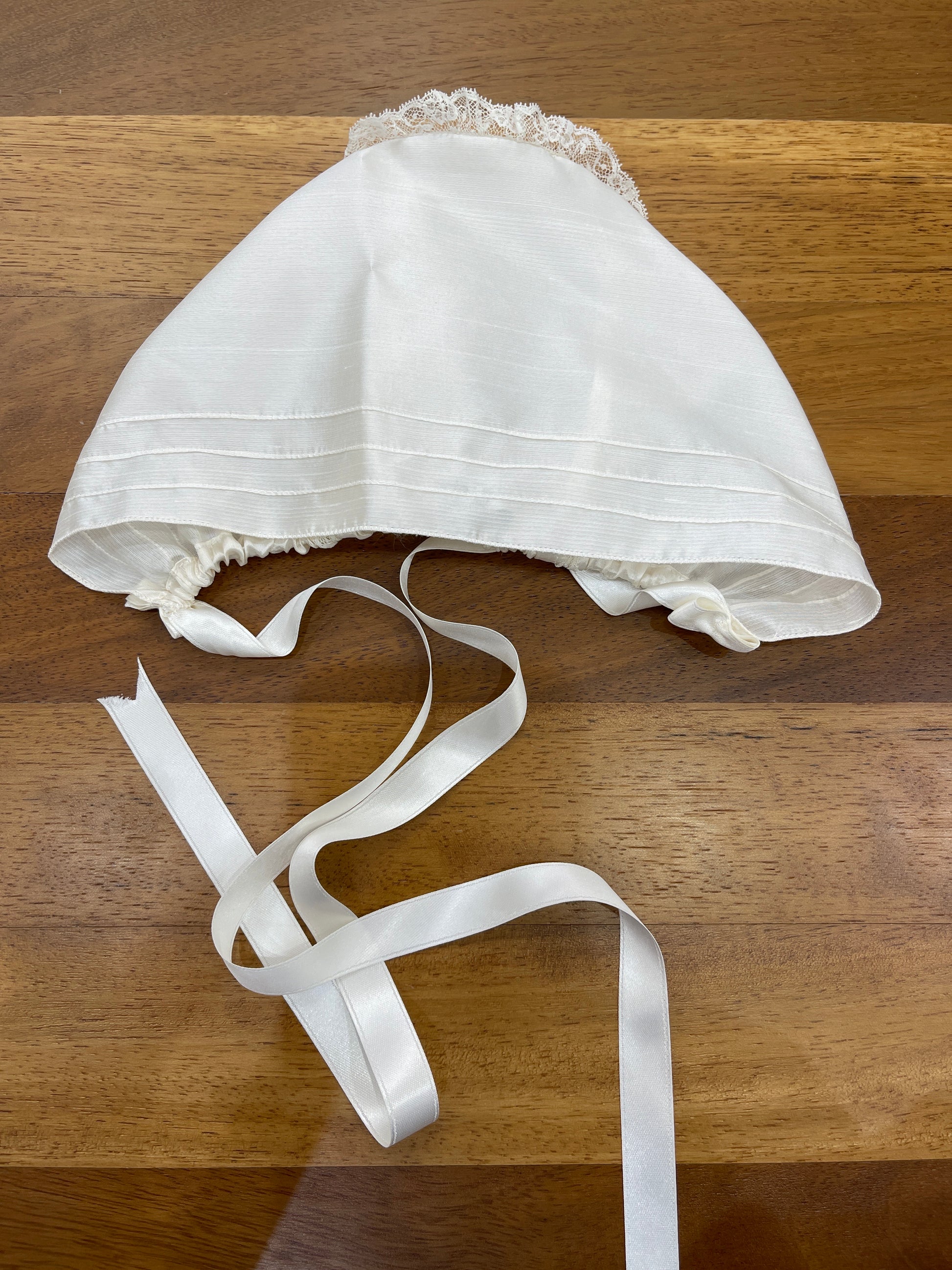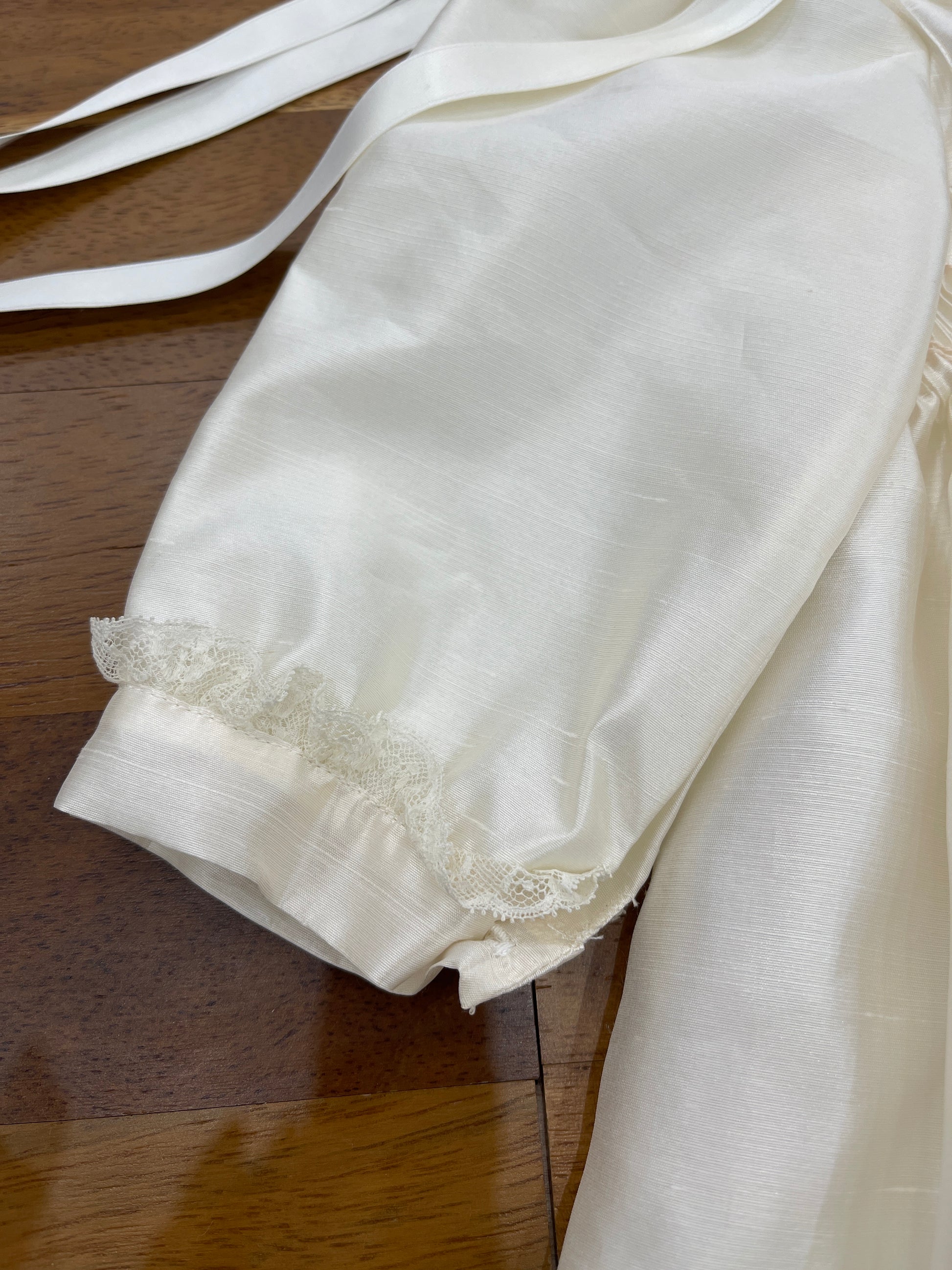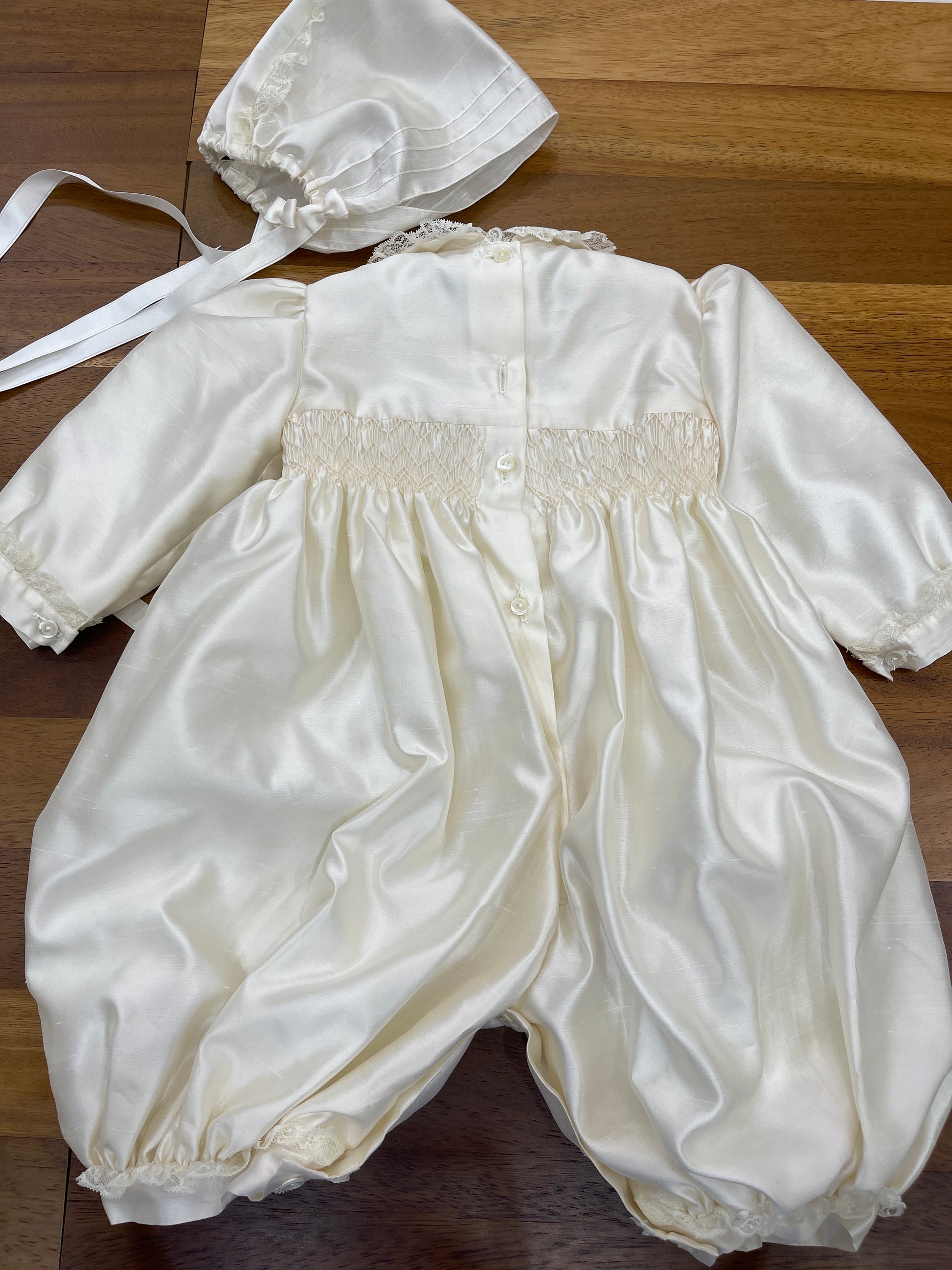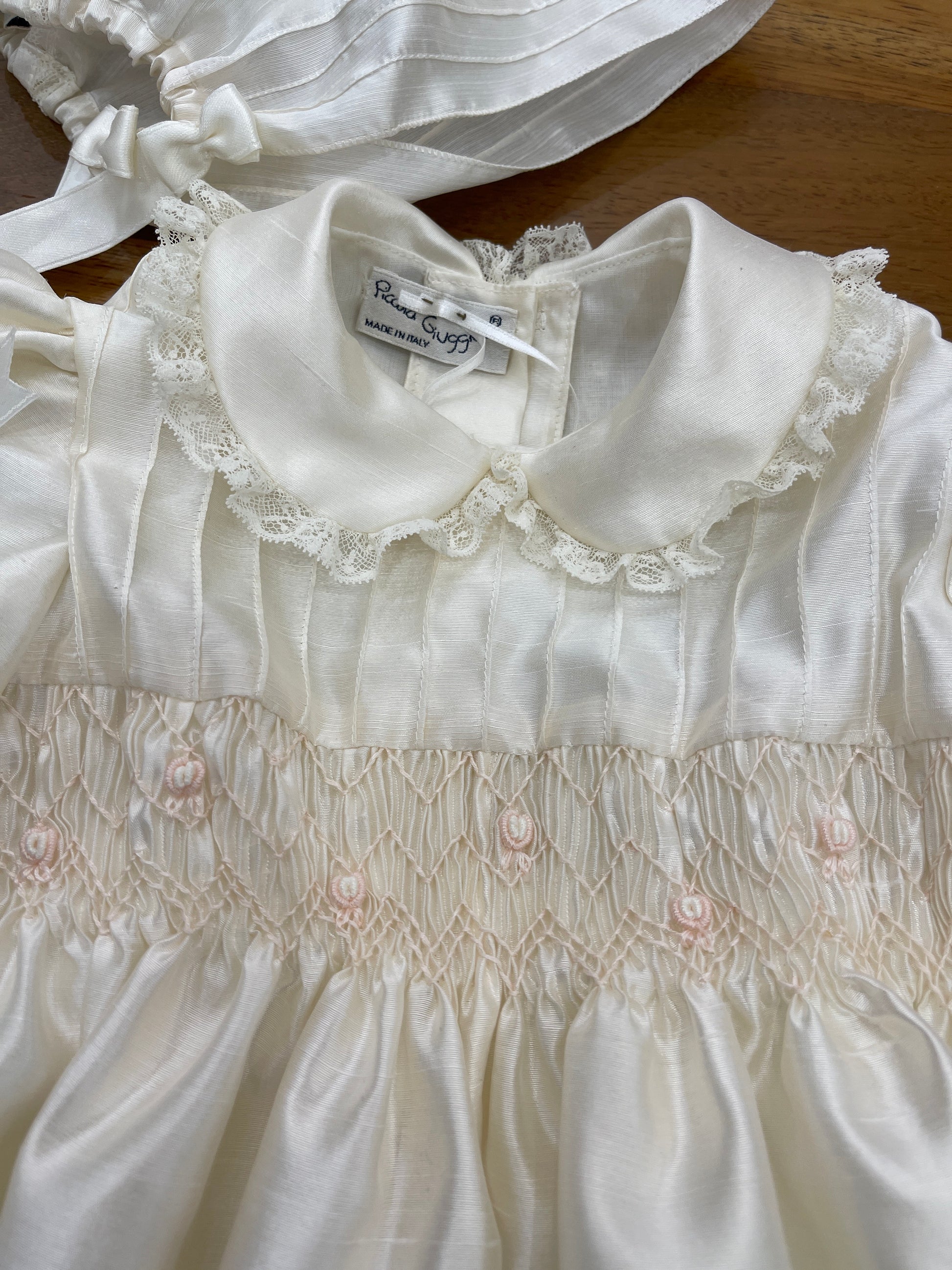 Pagliaccetto in shantung di seta caratterizzato da un collo tondo impreziosito da un delicato rifinitura in valencienne. Il copretto è ornato con fiorellini ricamati a mano e completato da un polsino sempre rifinito in valencienne. Le maniche lunghe, anch’esse decorate con valencienne, si abbinano perfettamente alla cuffia coordinata, creando un insieme raffinato e curato nei dettagli.