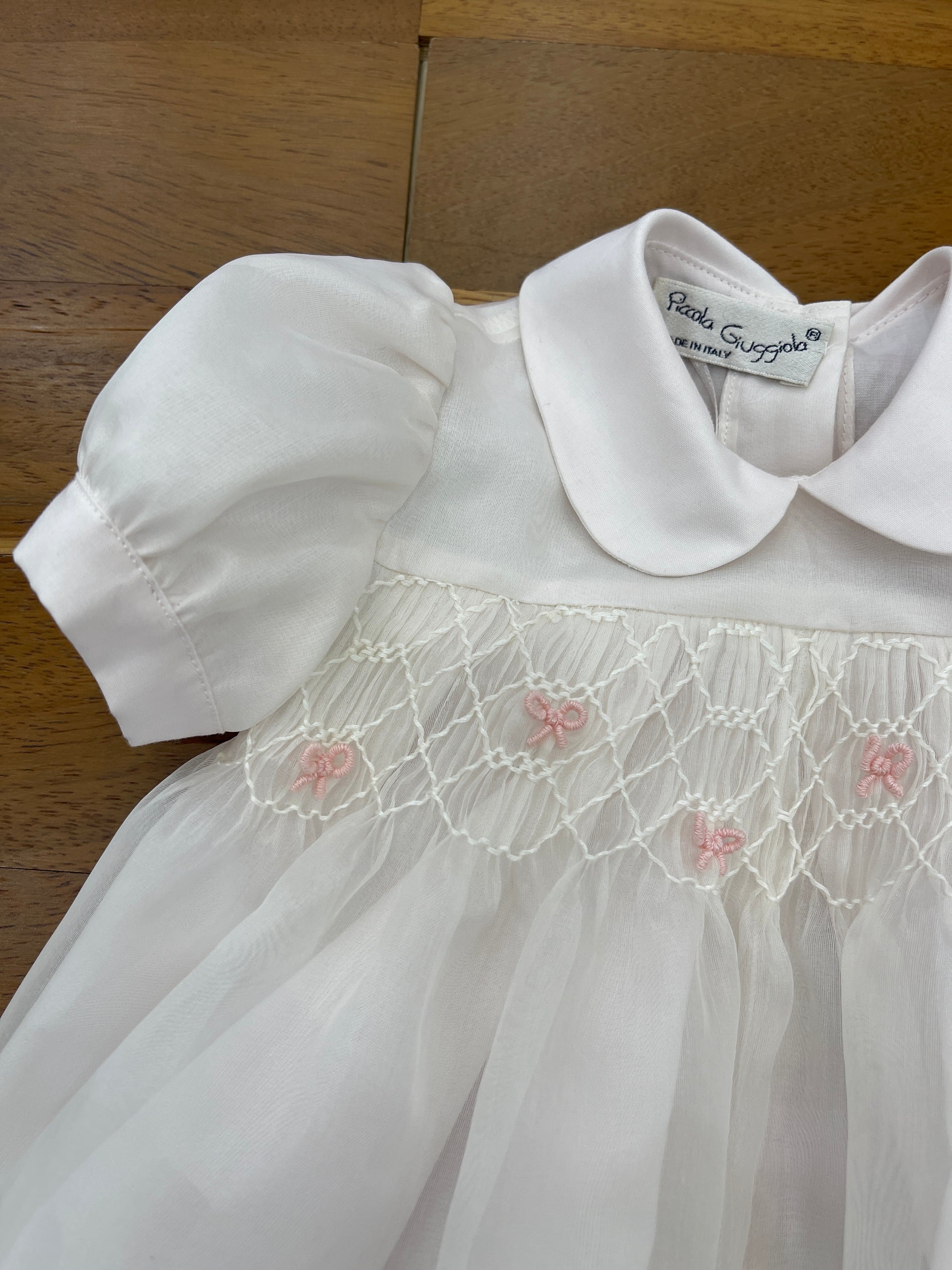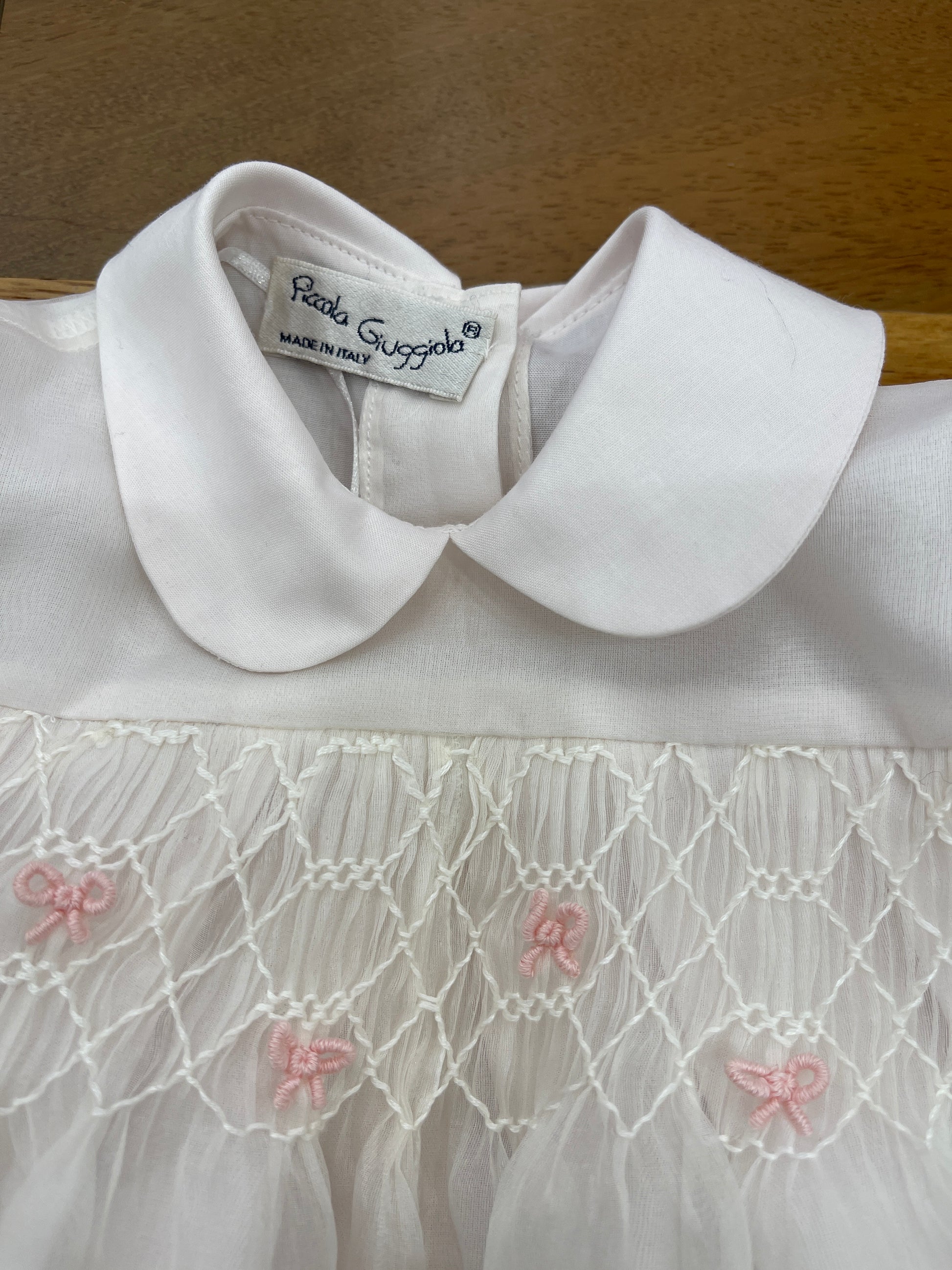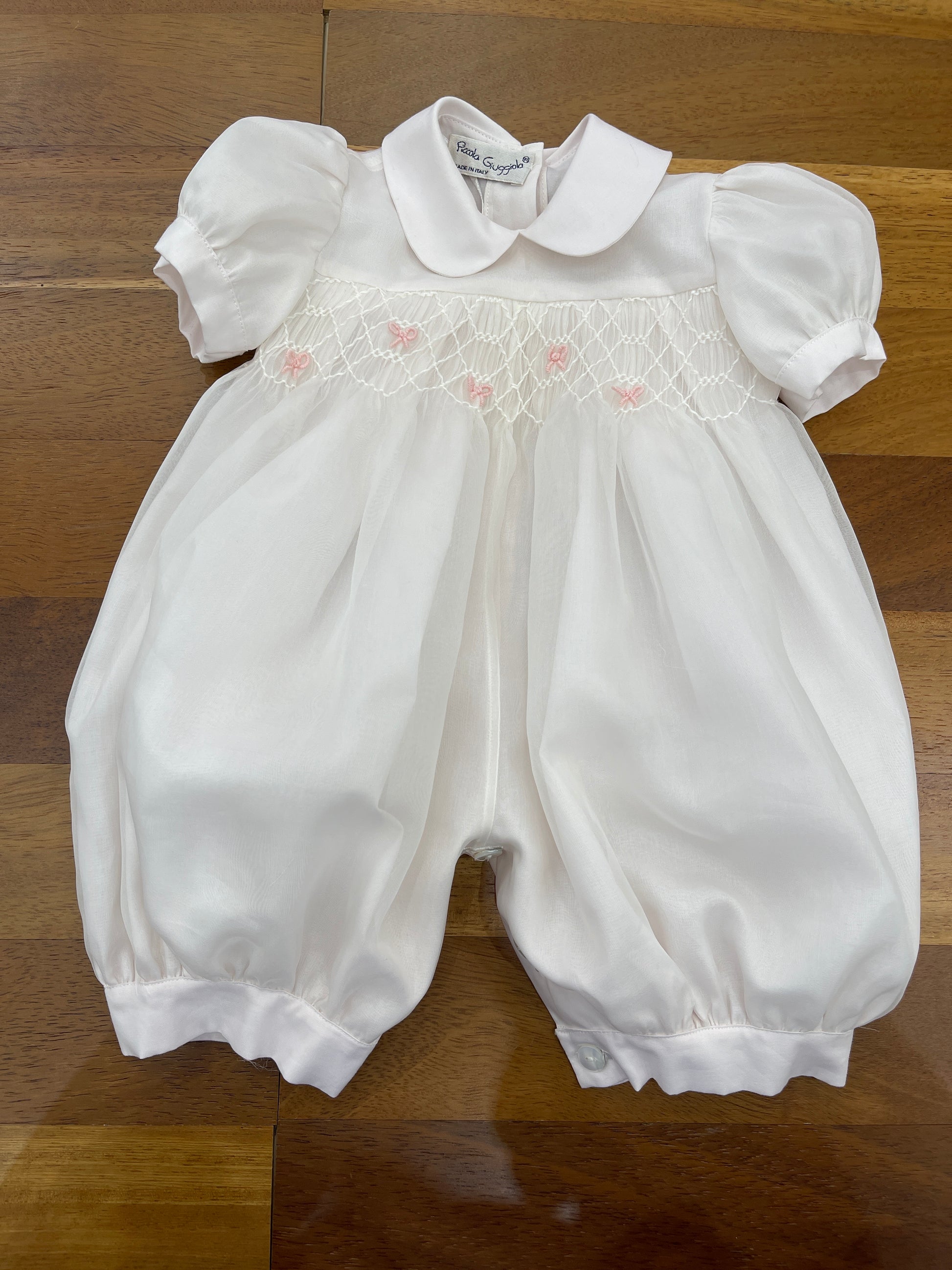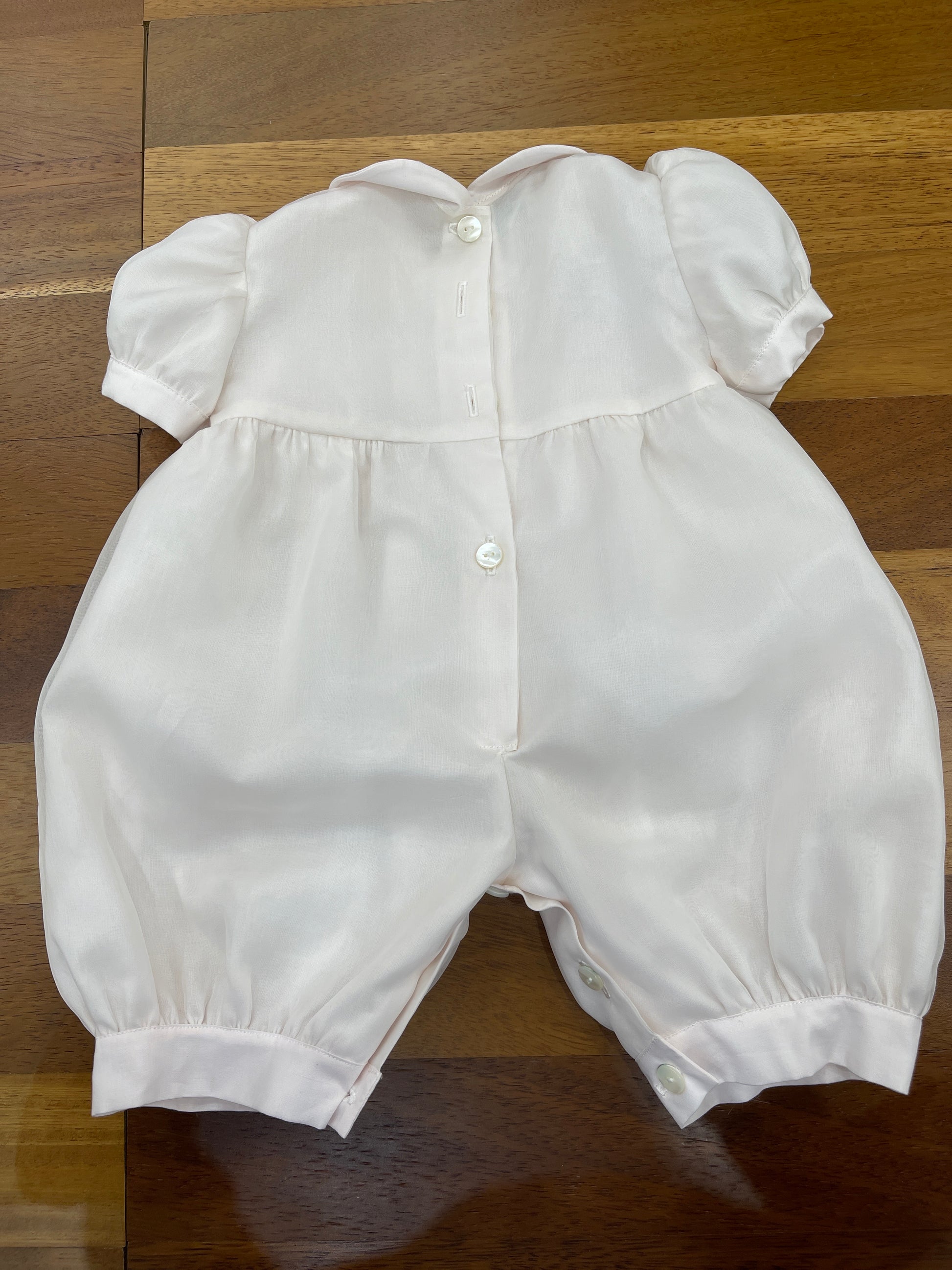Pagliaccetto in seta organza caratterizzato da collo tondo e mezza manica a sbuffo con polsino. Il corpetto presenta un delicato punto smock e fiocchetti ricamati a mano, completati da polsini anche alle gambe.