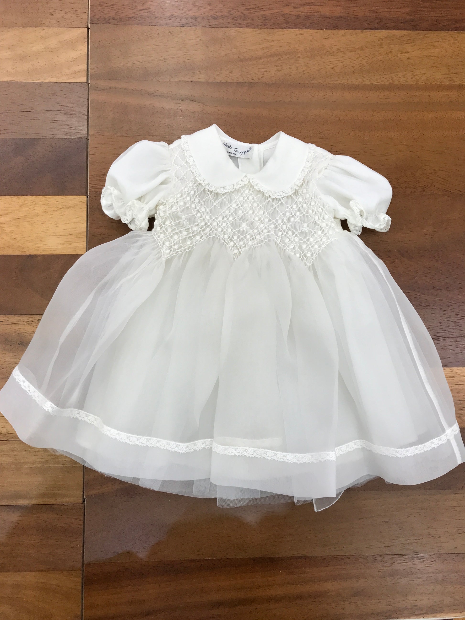Elegante creazione in organza di seta caratterizzata da un raffinato collo rotondo impreziosito da balza Valencienne. Il corpetto presenta una lavorazione smock di pregevole fattura, mentre la gonna è elegantemente bordato dalla medesima balza. Le maniche a sbuffo conferiscono un tocco romantico al capo, completato da una chiusura posteriore con bottoncini e un delicato fiocco in organza.