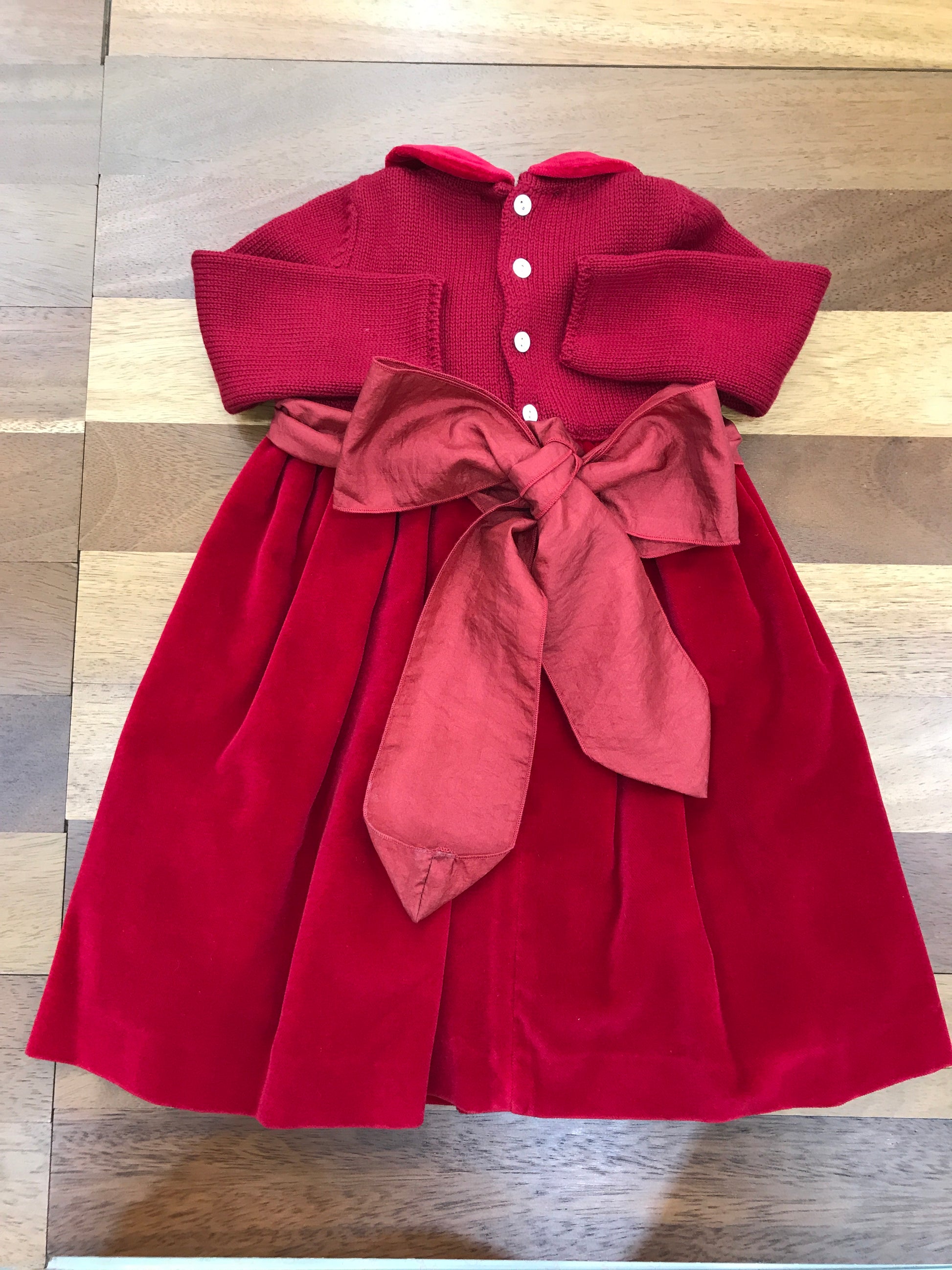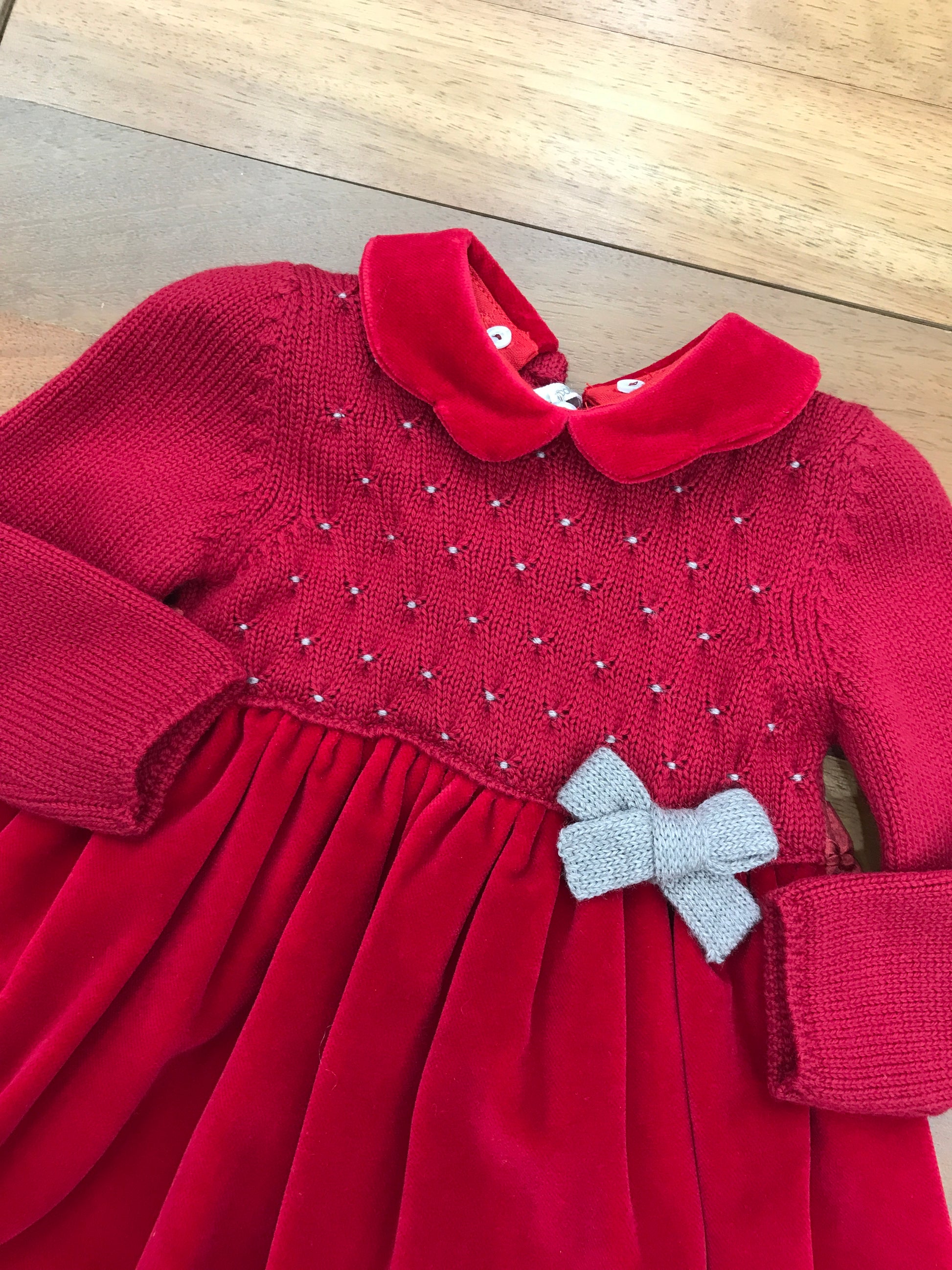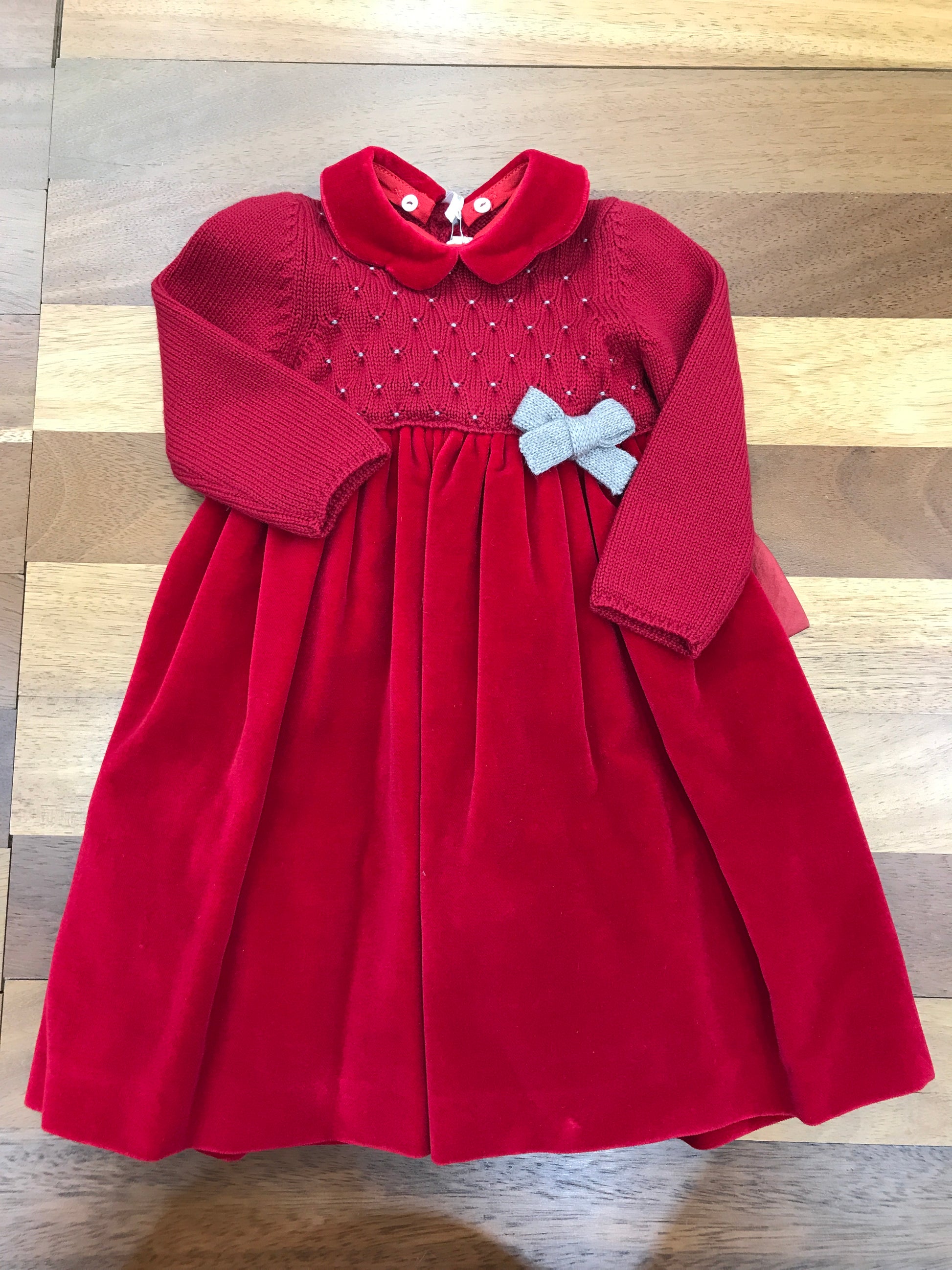 Elegante abitino caratterizzato da un raffinato corpetto in lana con lavorazione a punto smock, proposto nella tonalità tortora. Completano il capo un delicato fiocchetto applicato lateralmente e un ulteriore fiocco sul retro, che conferiscono un tocco di sofisticatezza. La gonna, realizzata interamente in velluto, garantisce morbidezza e comfort, creando un contrasto materico che esalta la qualità costruttiva del capo.