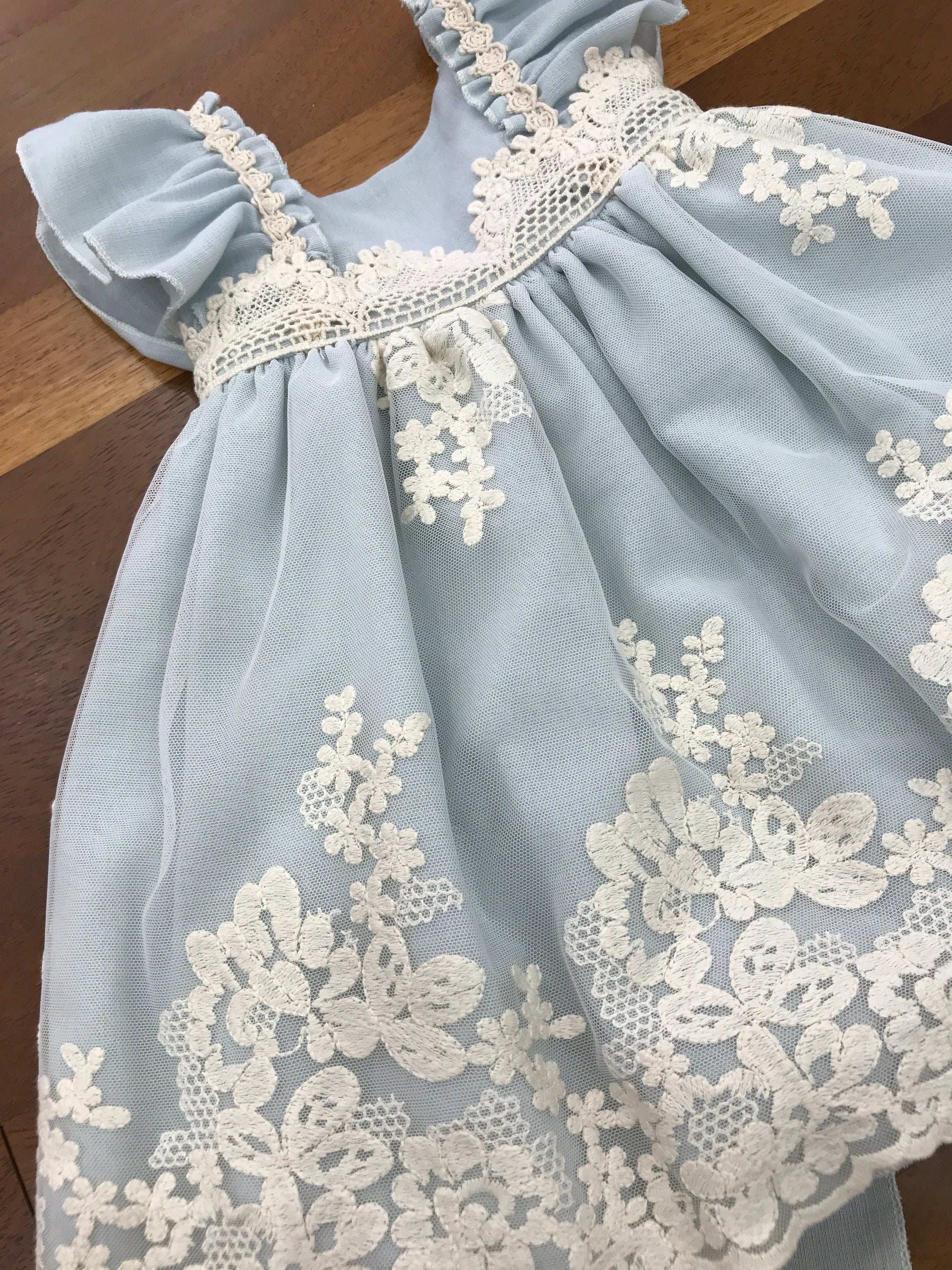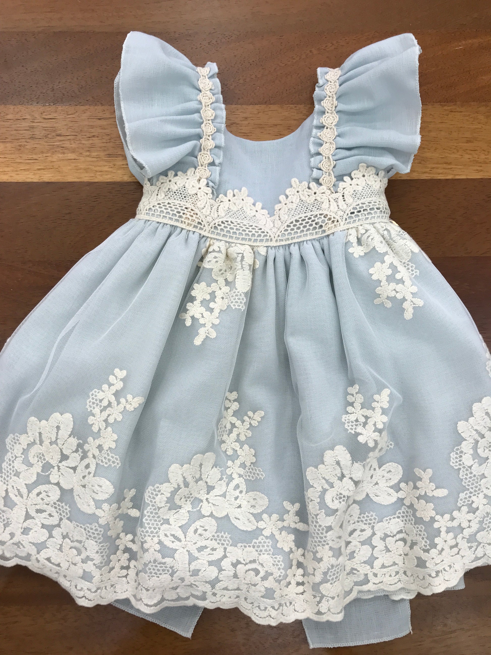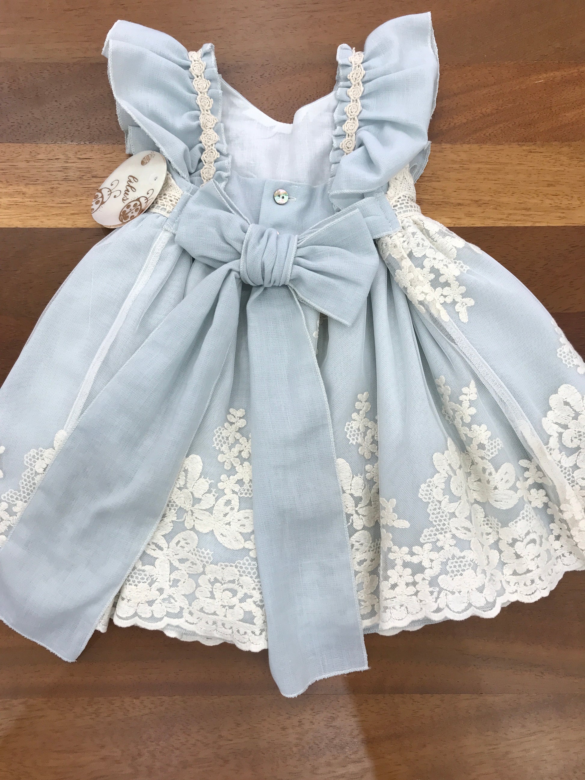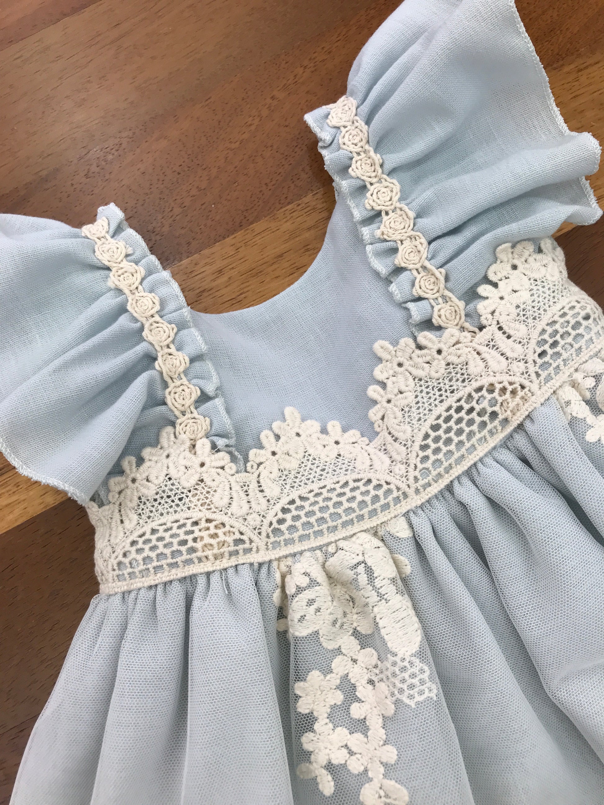 Abito Lilus in cotone smanicato con rusche lavorazione di pizzo su spalline e corpetto gonnellone lavorato da pizzo sul retro elegante fiocco
