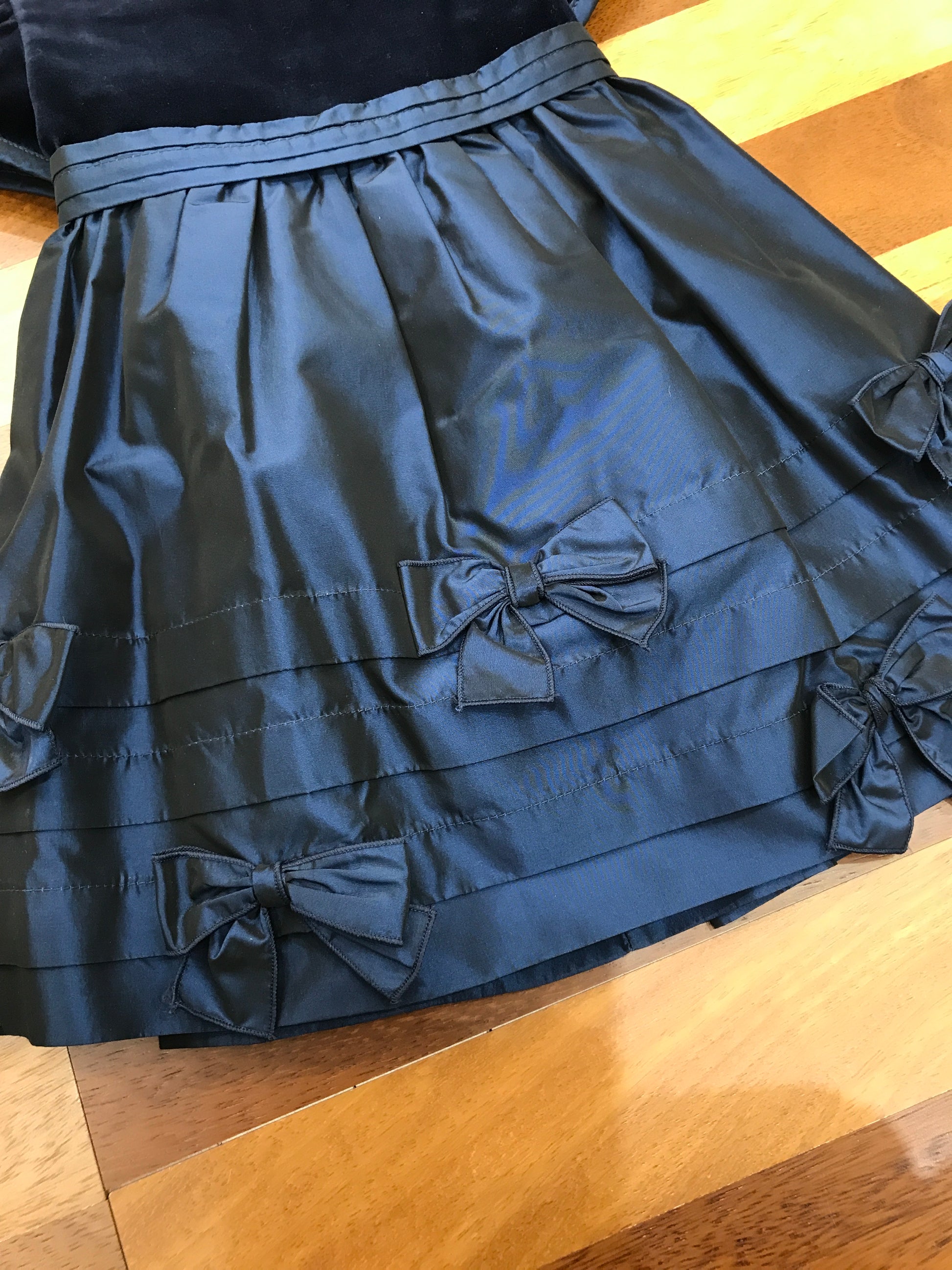Elegante abitino caratterizzato da un corpetto in velluto di pregiata fattura, proposto nella raffinata tonalità del blu scuro. La gonna inferiore è impreziosita da delicati fiocchetti coordinati, che aggiungono un tocco di sofisticatezza al capo. Un'opzione versatile e ricercata per occasioni speciali.