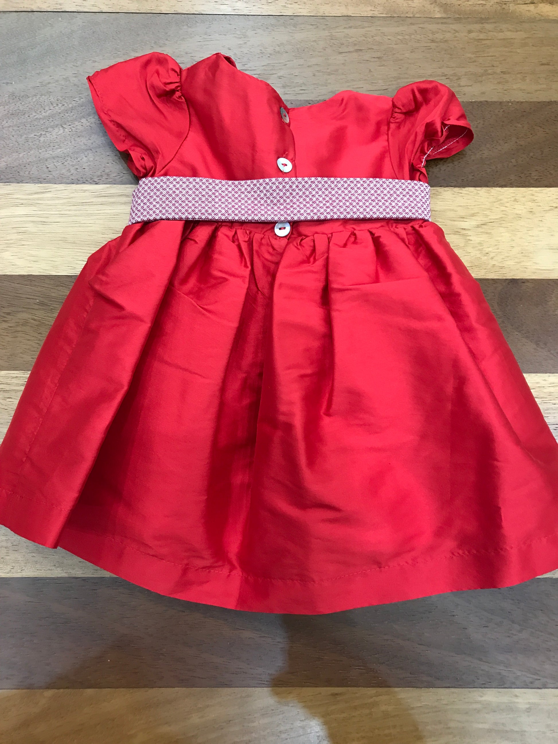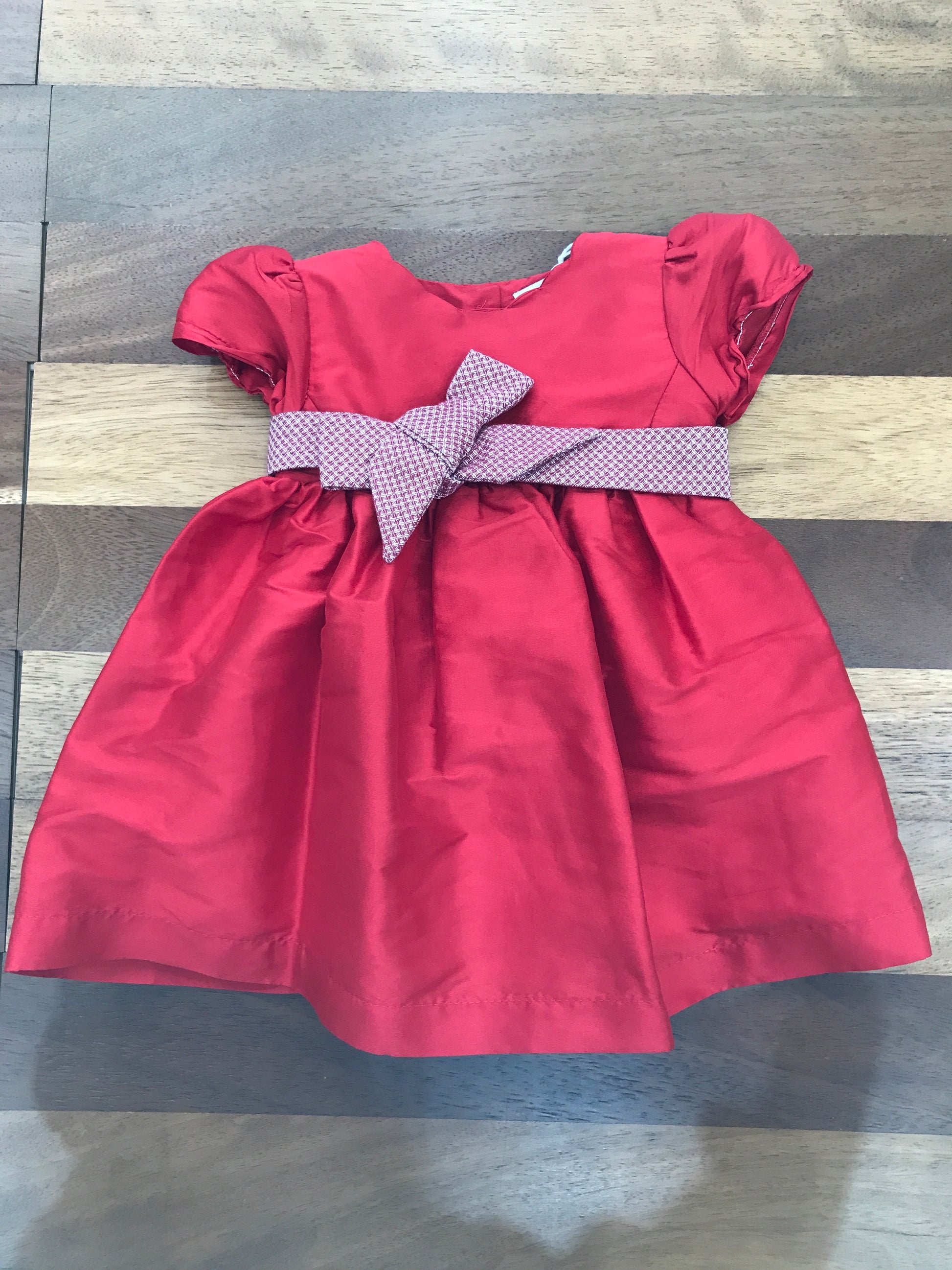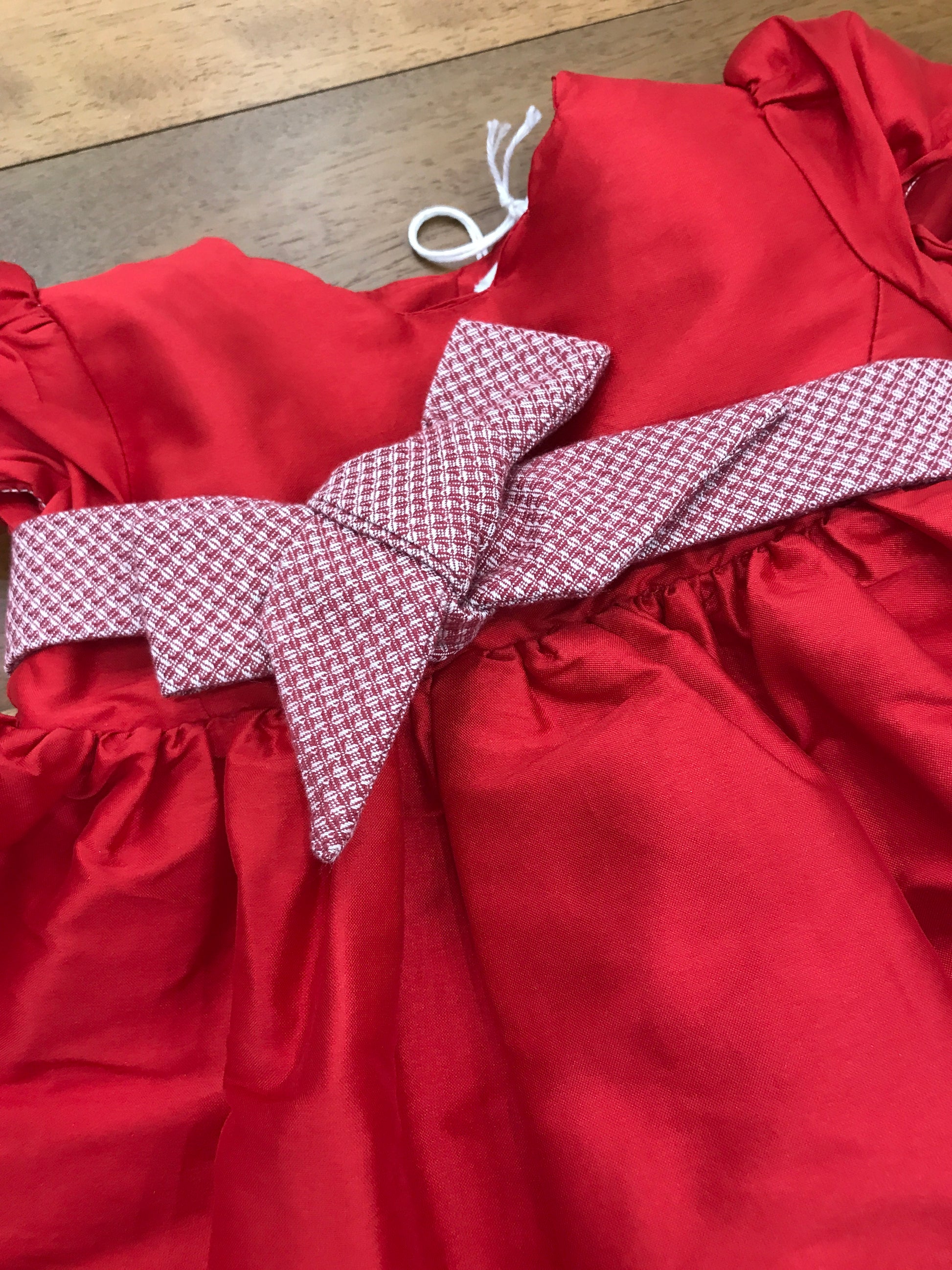 Questo raffinato abitino in satin rosso vanta maniche a sbuffo e una silhouette senza colletto che esalta l'eleganza del capo. La fascia decorativa sul davanti, caratterizzata da un delicato motivo bicolore bianco e bordeaux, si chiude con un fiocco che aggiunge un elemento di stile sofisticato. Un pezzo versatile ideale per occasioni speciali, dove la qualità del tessuto e i dettagli curati fanno la differenza.