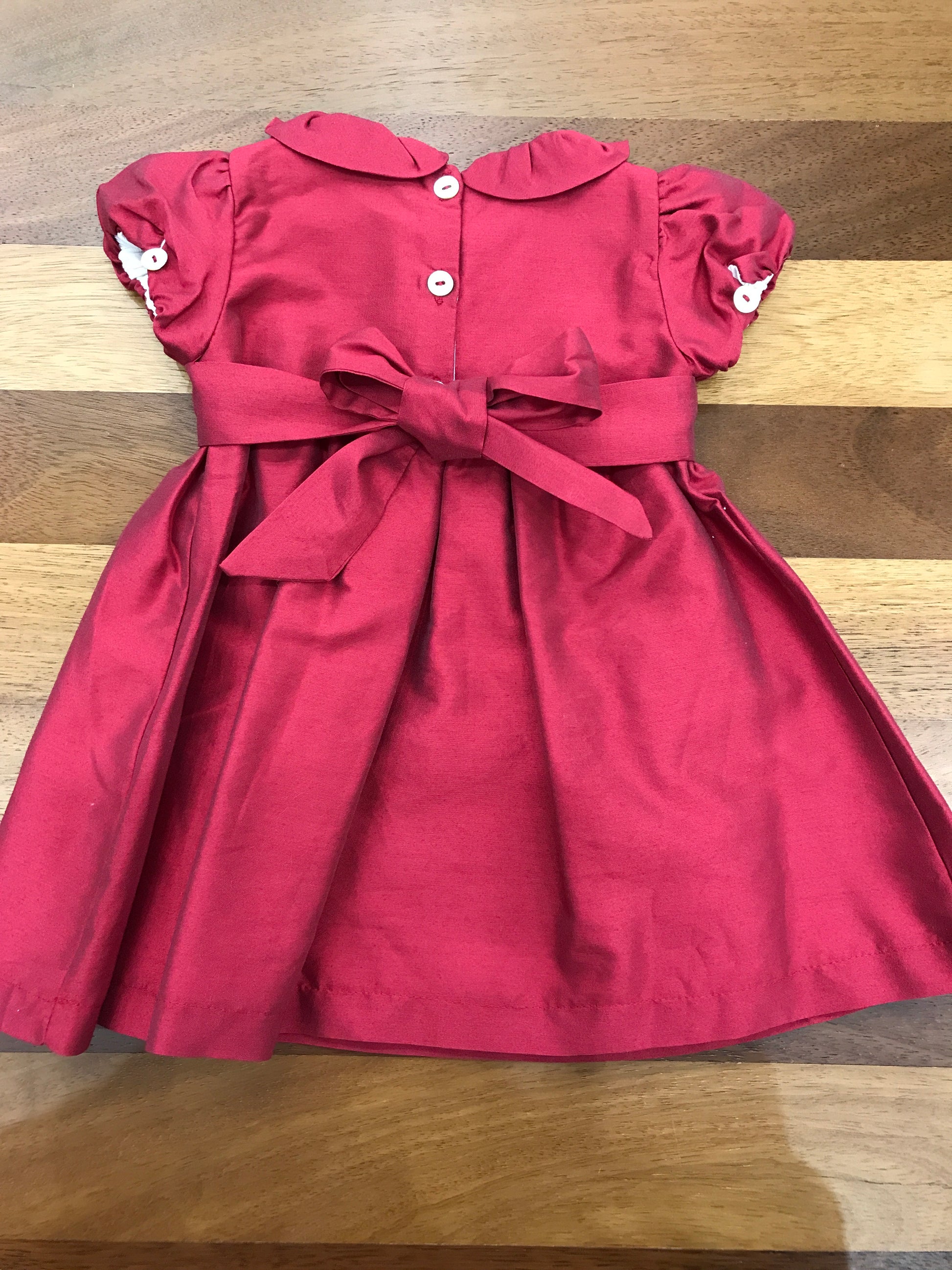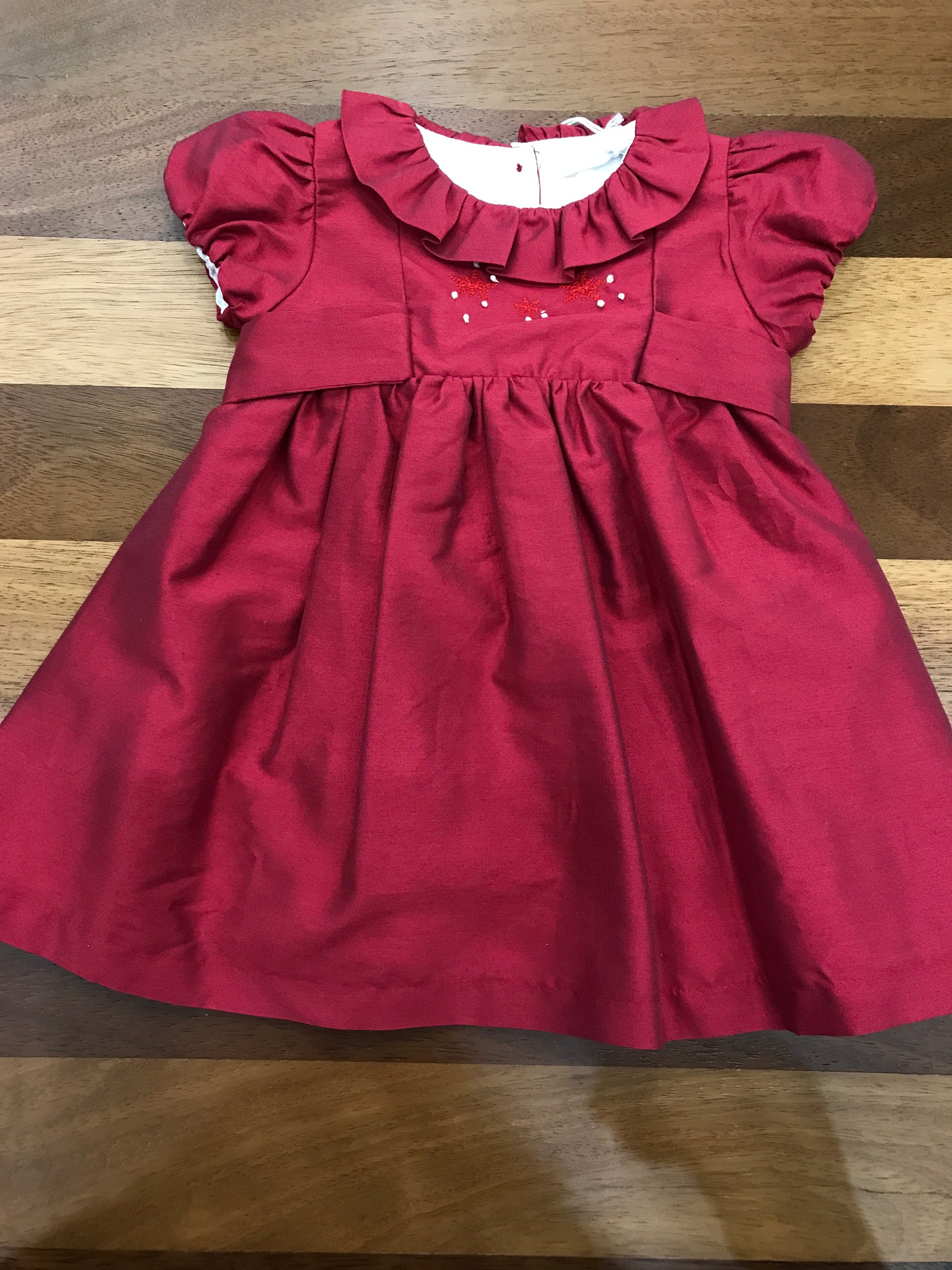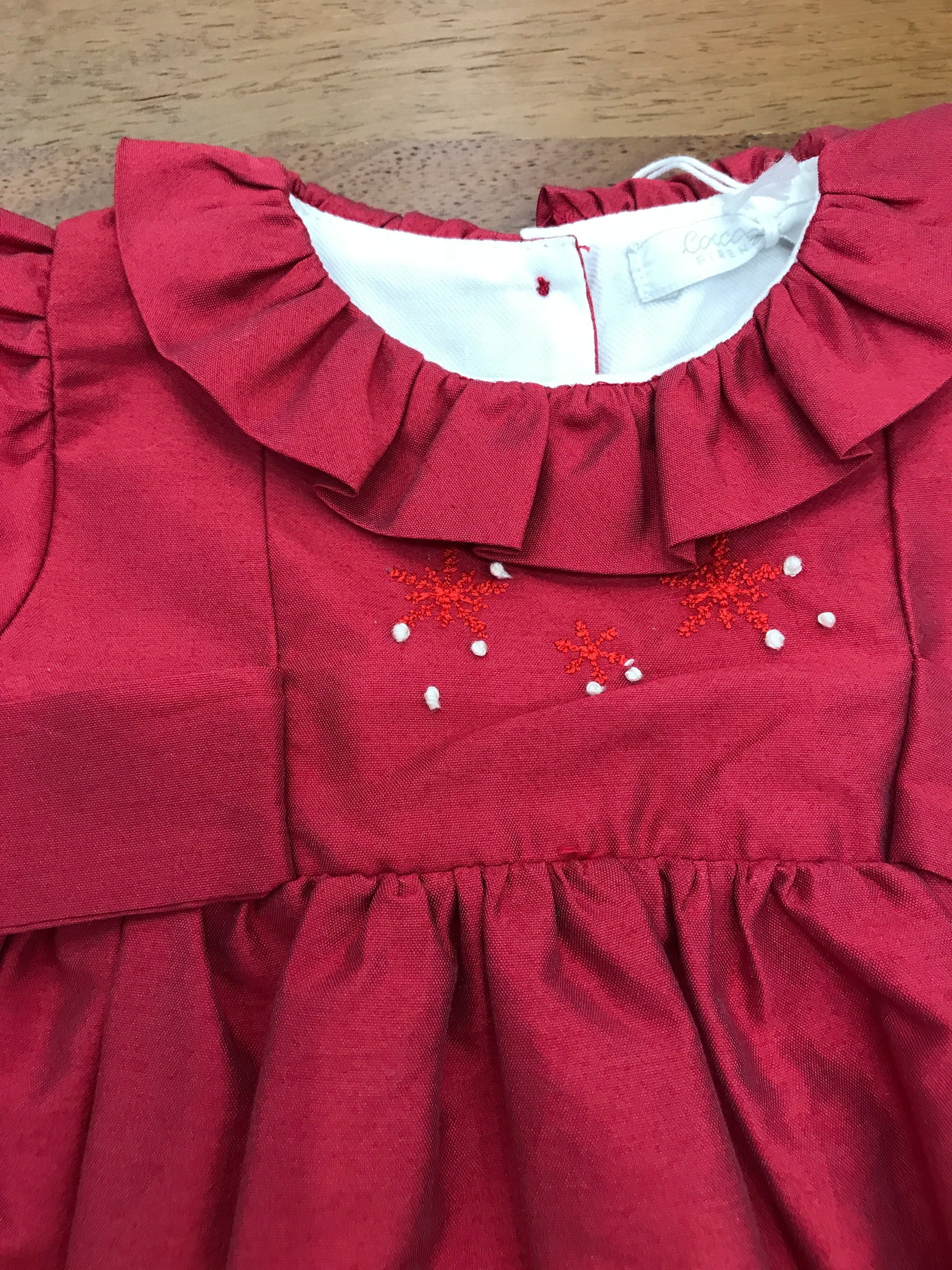 Elegante abitino in taffetà rosso scuro caratterizzato da un raffinato colletto arricchito di ruches e maniche corte a sbuffo. Il capo presenta delicati fiocchi di neve ricamati sul petto, mentre una pratica chiusura a fiocco sul retro garantisce comfort e facilità di indosso. Un'opzione sofisticata per occasioni speciali.