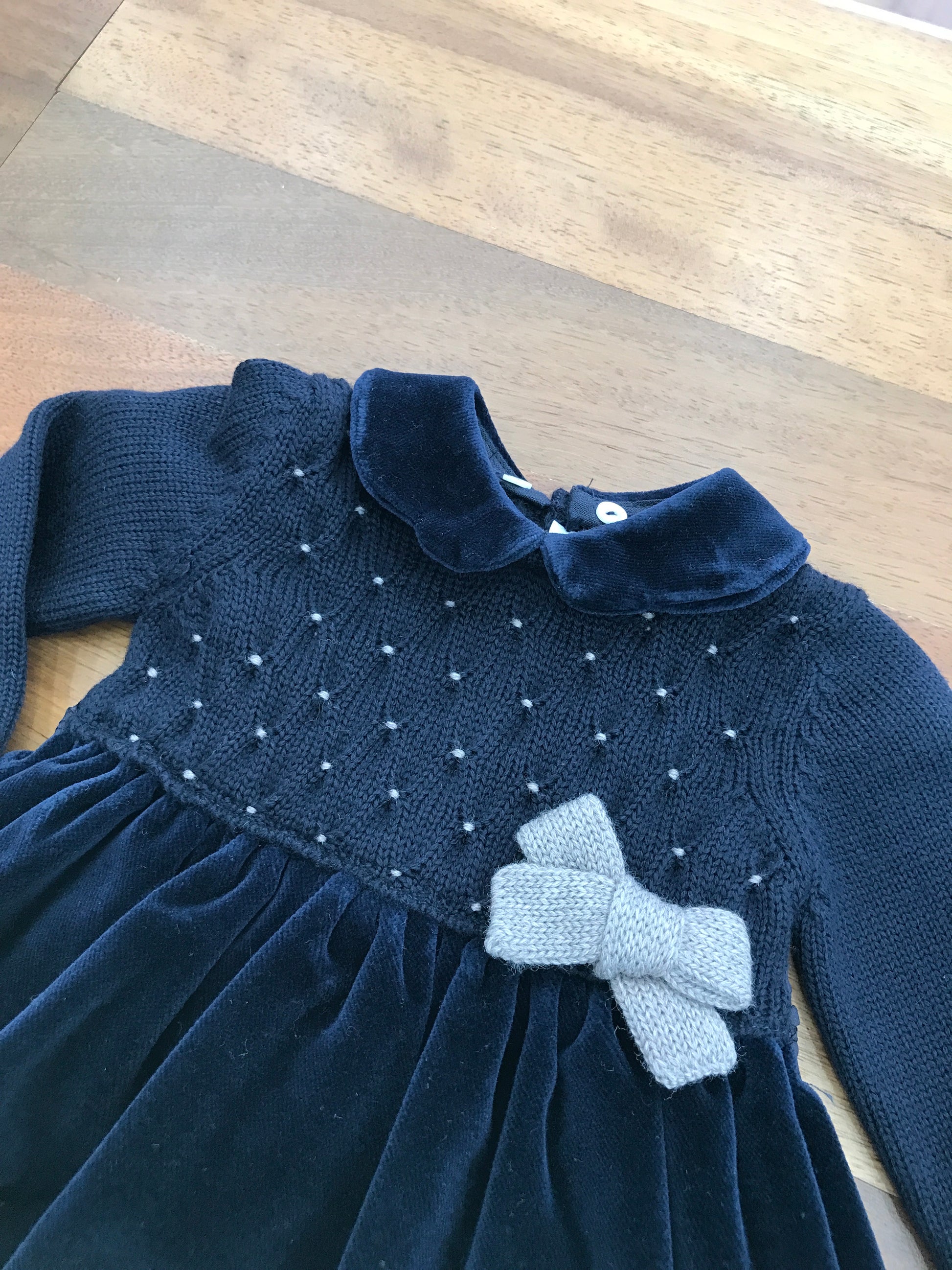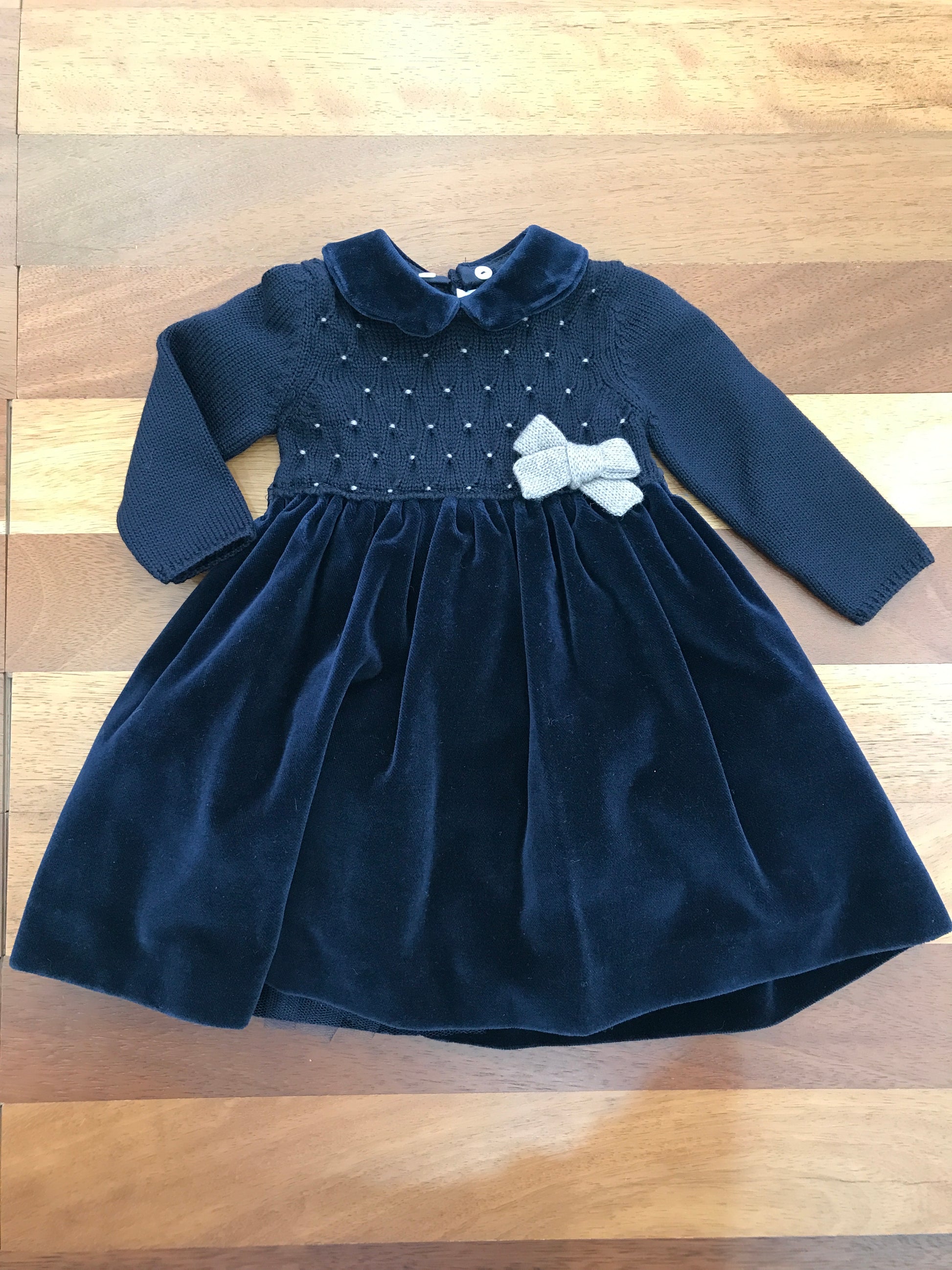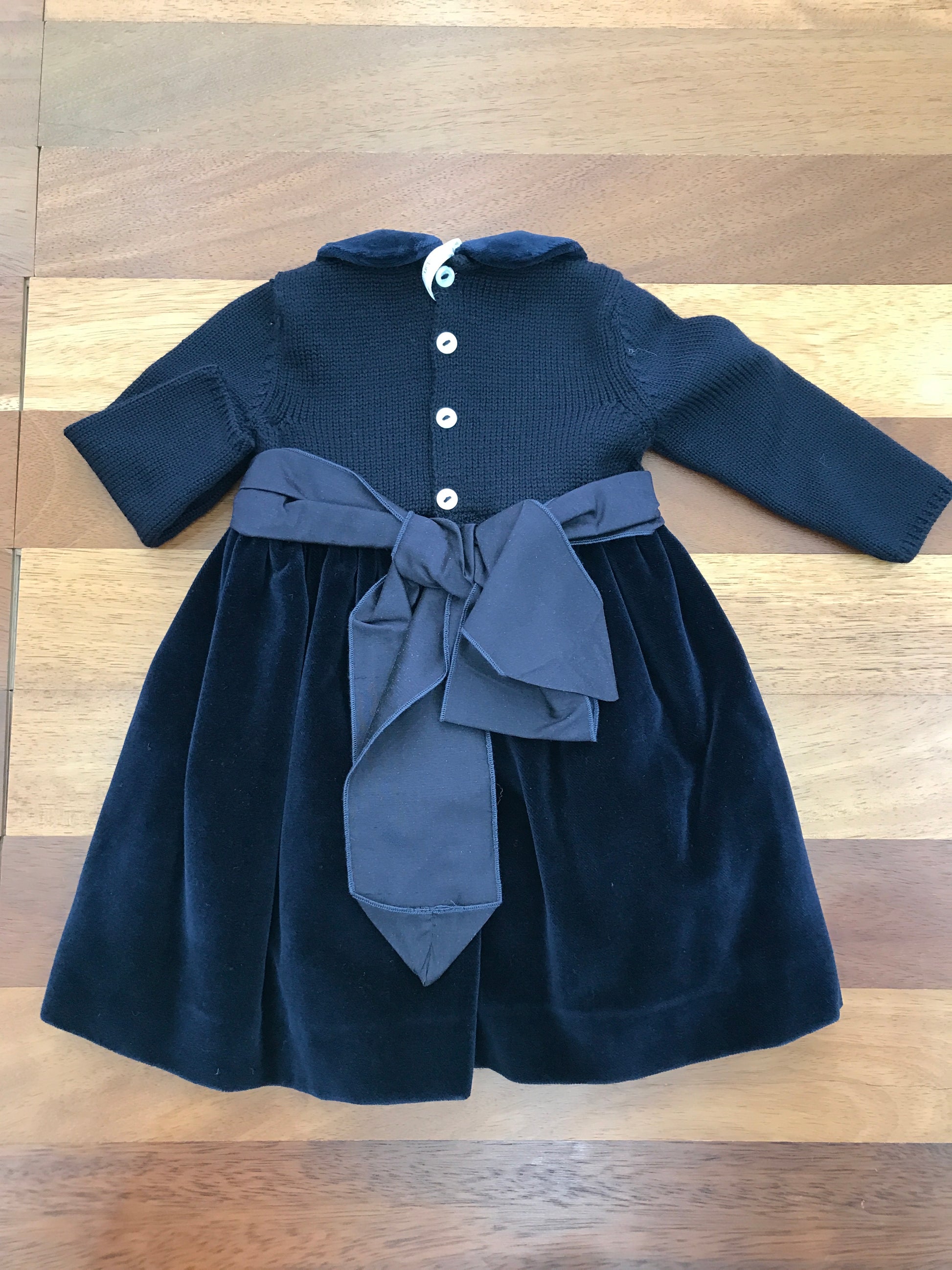 Elegante creazione caratterizzata da un corpetto in lana tortora con dettagli smock raffinati e colletto smerlato in velluto, completato da un delicato fiocchetto coordinato. La gonna in velluto, arricchita da uno strato di tulle sottostante, regala movimento e leggerezza a questo capo sofisticato, perfetto per occasioni speciali.