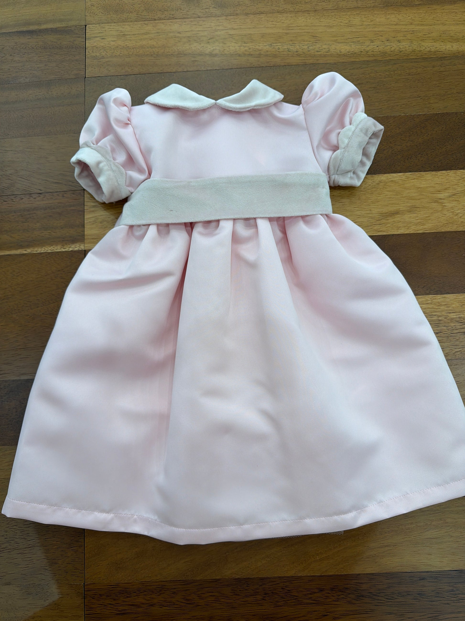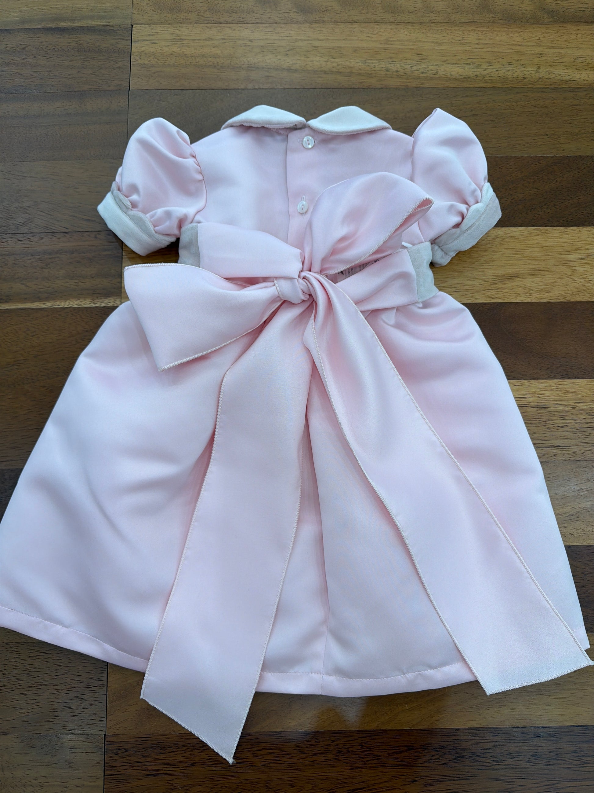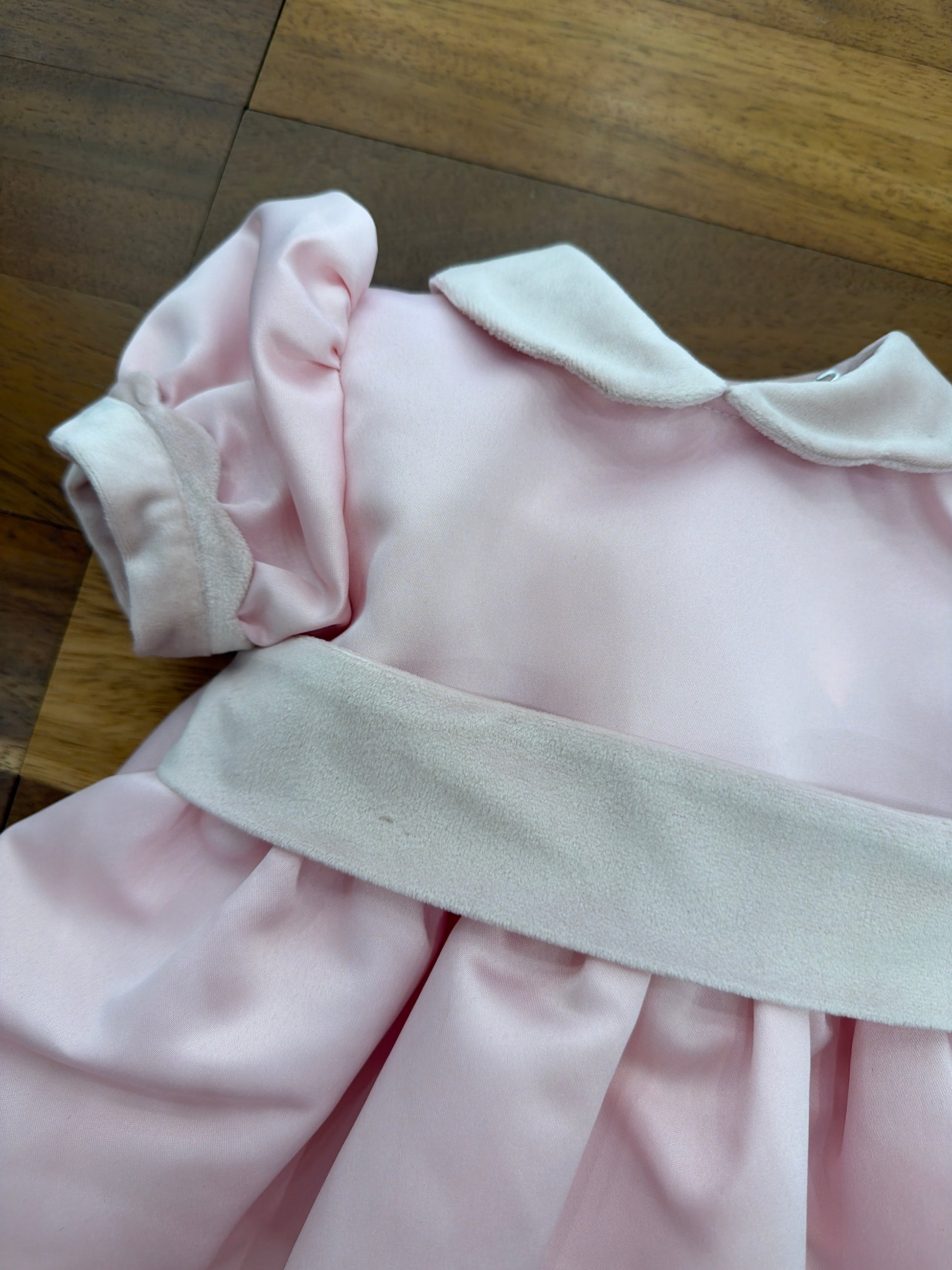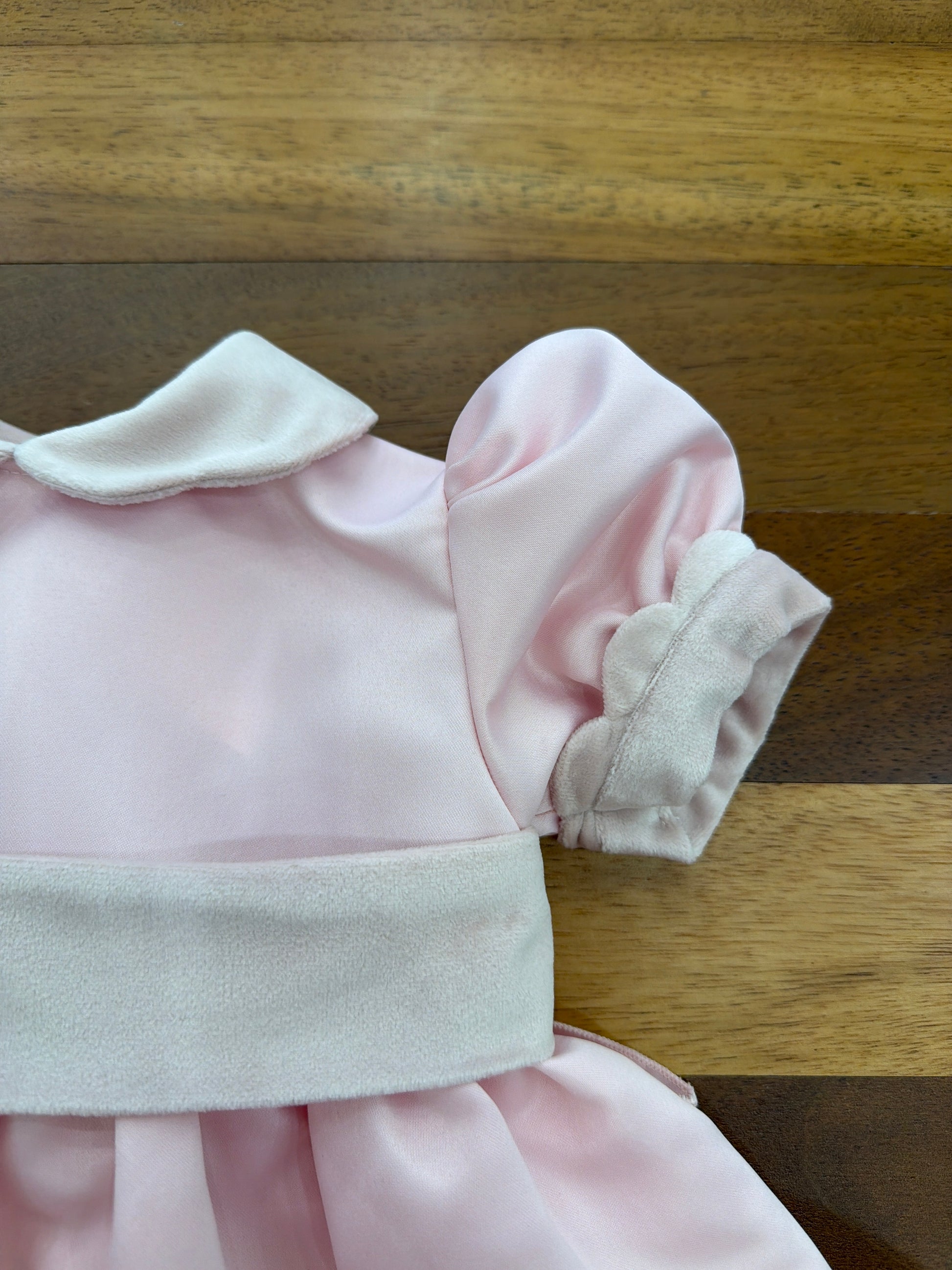 Delicato abitino in rasone color erosa, caratterizzato da maniche corte a sbuffo con raffinati polsini in velluto. Il colletto in velluto aggiunge eleganza, mentre una fascia centrale in velluto percorre il fronte, concludendosi con un generoso fiocco sul retro. Un capo che unisce dettagli sofisticati e comfort per le piccole principesse.