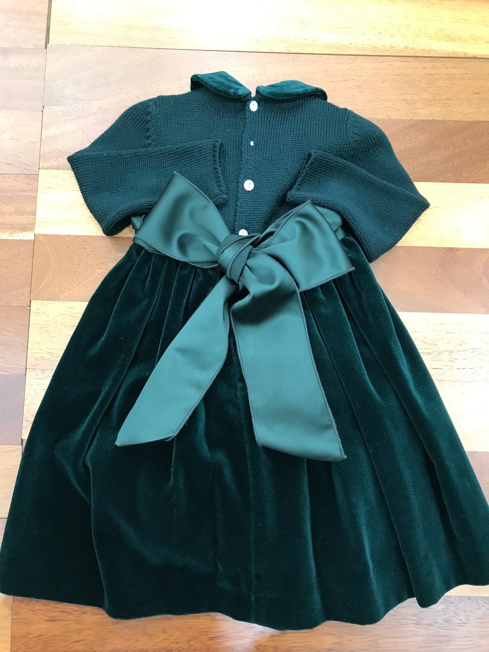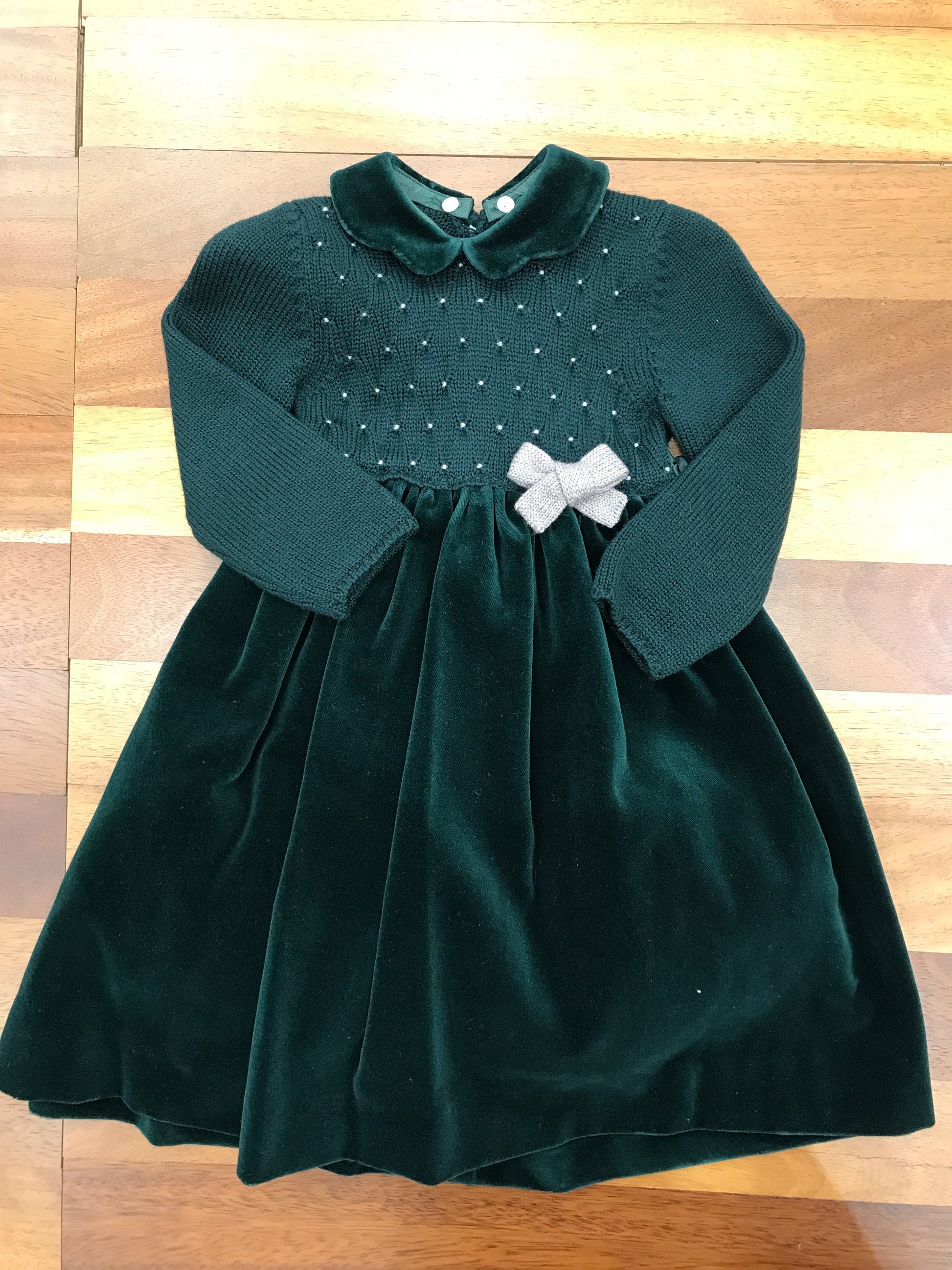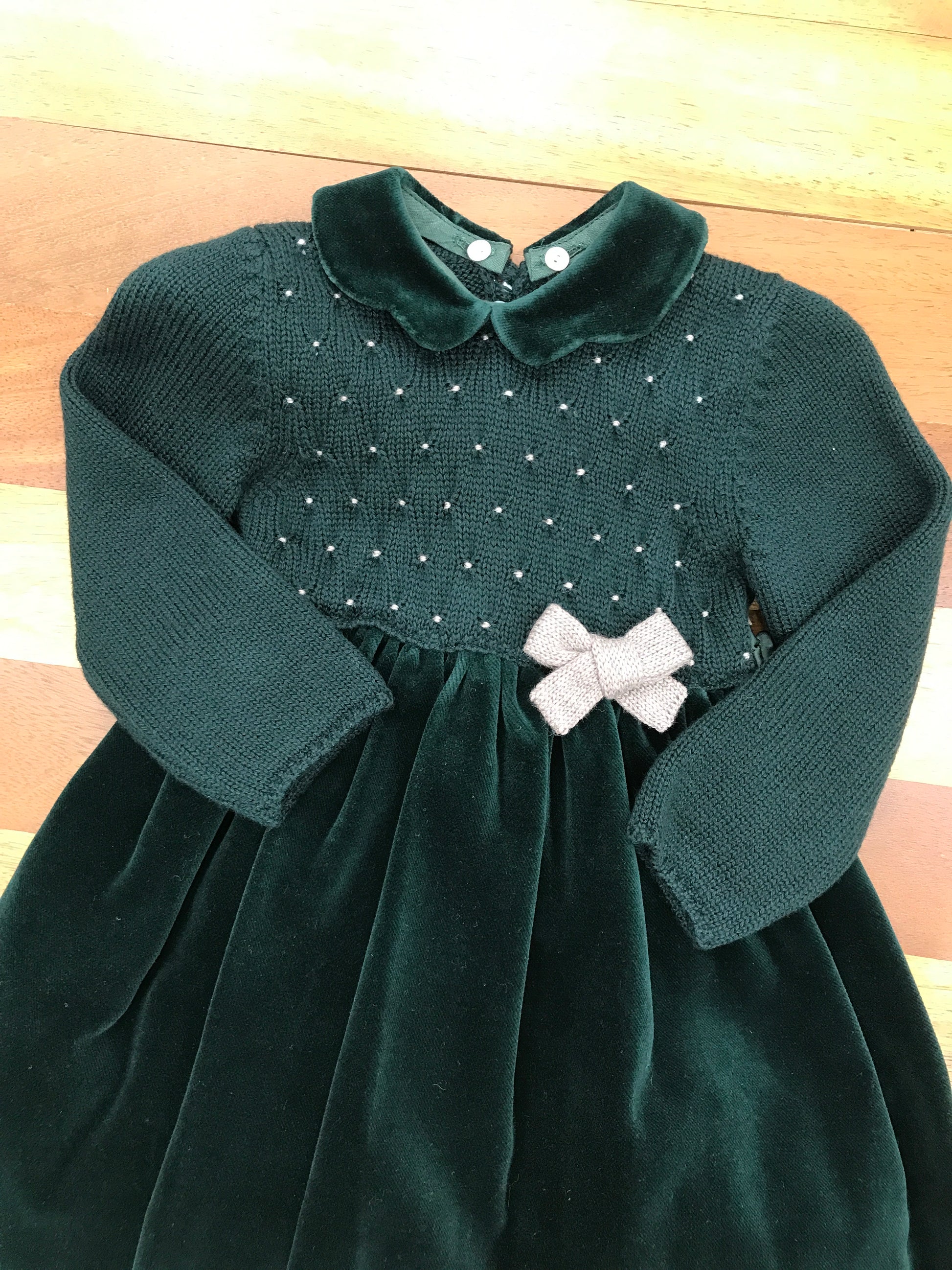 Delicato abitino caratterizzato da un corpetto in lana pregiata, finemente lavorato con punto smock nelle tonalità tortora. La gonna, realizzata interamente in velluto morbido, si abbina perfettamente al colletto e agli orli smerlati in velluto, creando un capo raffinato e elegante. Un'opzione sofisticata per occasioni speciali, dove la qualità dei materiali incontra la ricercatezza del design.