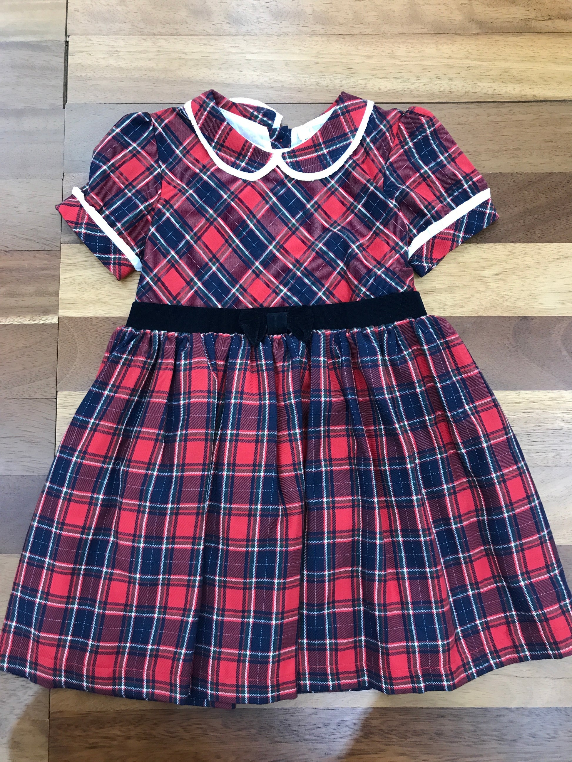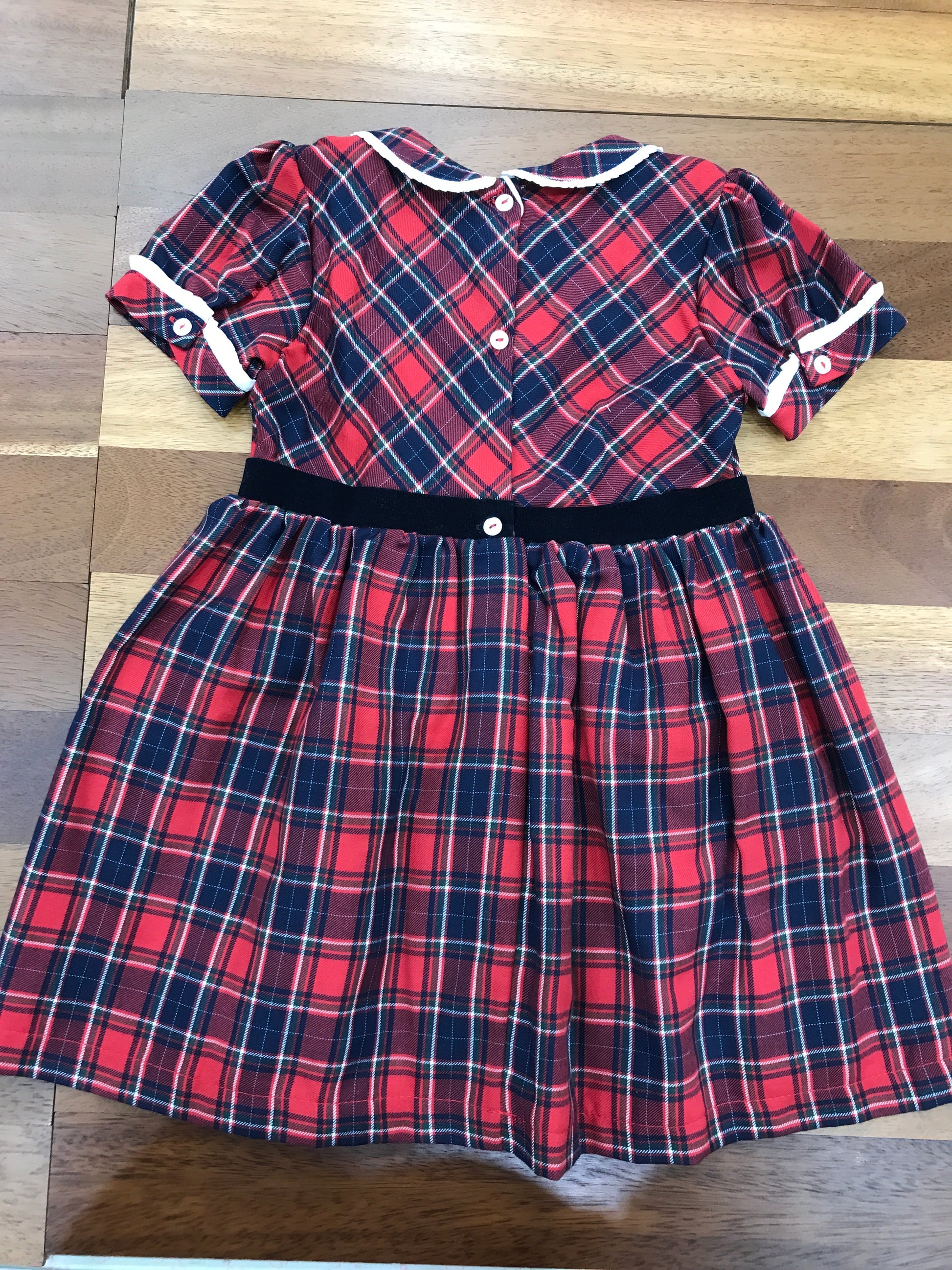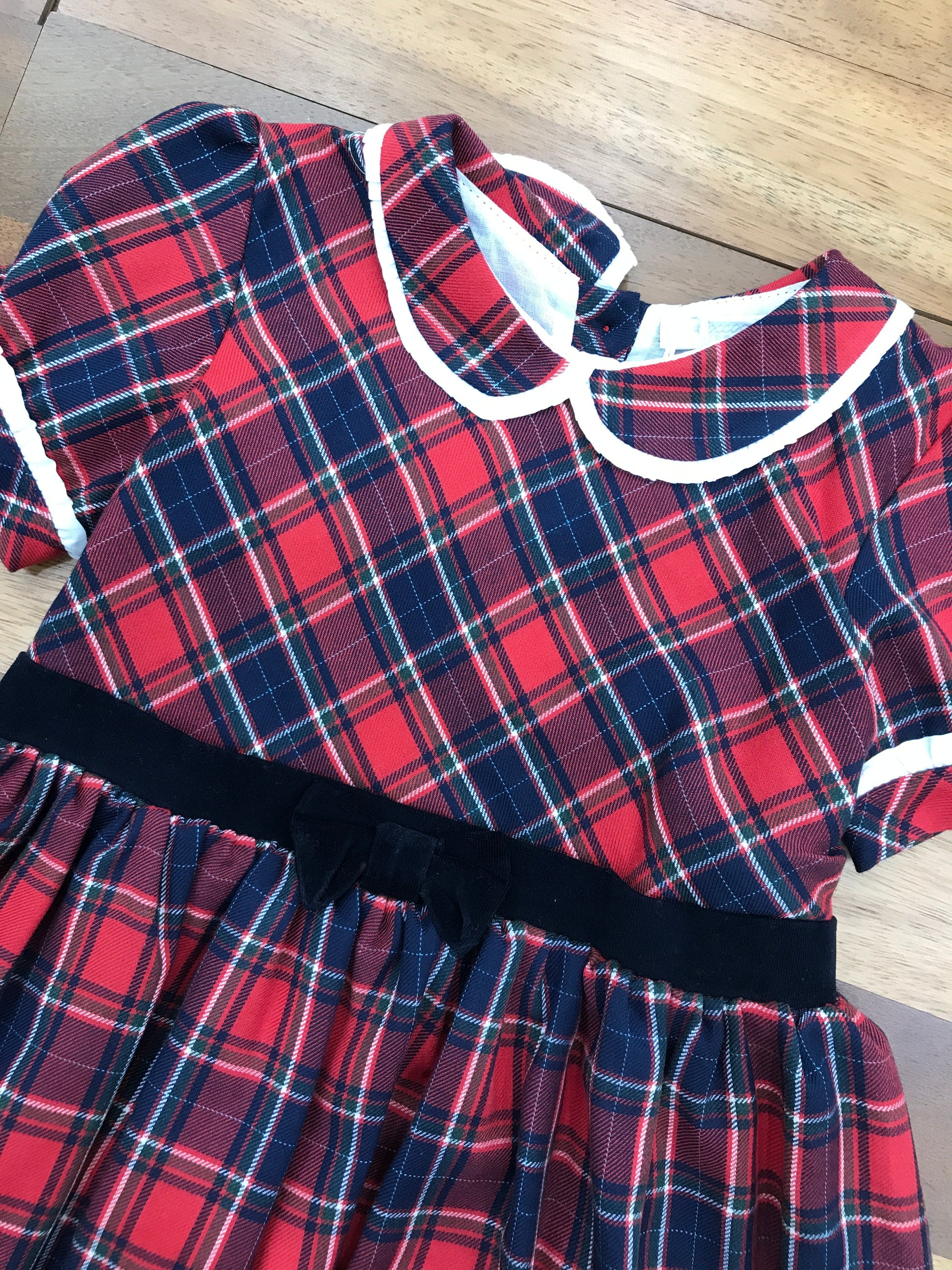 Questo delizioso abitino presenta un affascinante motivo scozzese nelle tonalità classiche di rosso e blu. Le maniche corte a sbuffo conferiscono un tocco di eleganza giocosa, mentre il colletto e i polsini sono impreziositi da delicate rusche bianche che aggiungono raffinatezza. La fascia in velluto in vita definisce perfettamente la silhouette, creando una linea armoniosa. Un capo versatile che unisce tradizione e modernità, ideale per occasioni speciali o per un look quotidiano sofisticato.