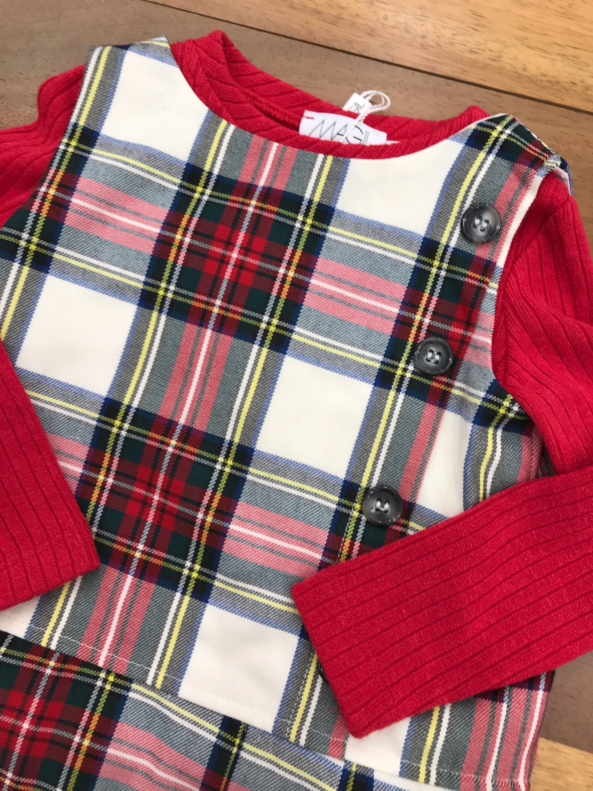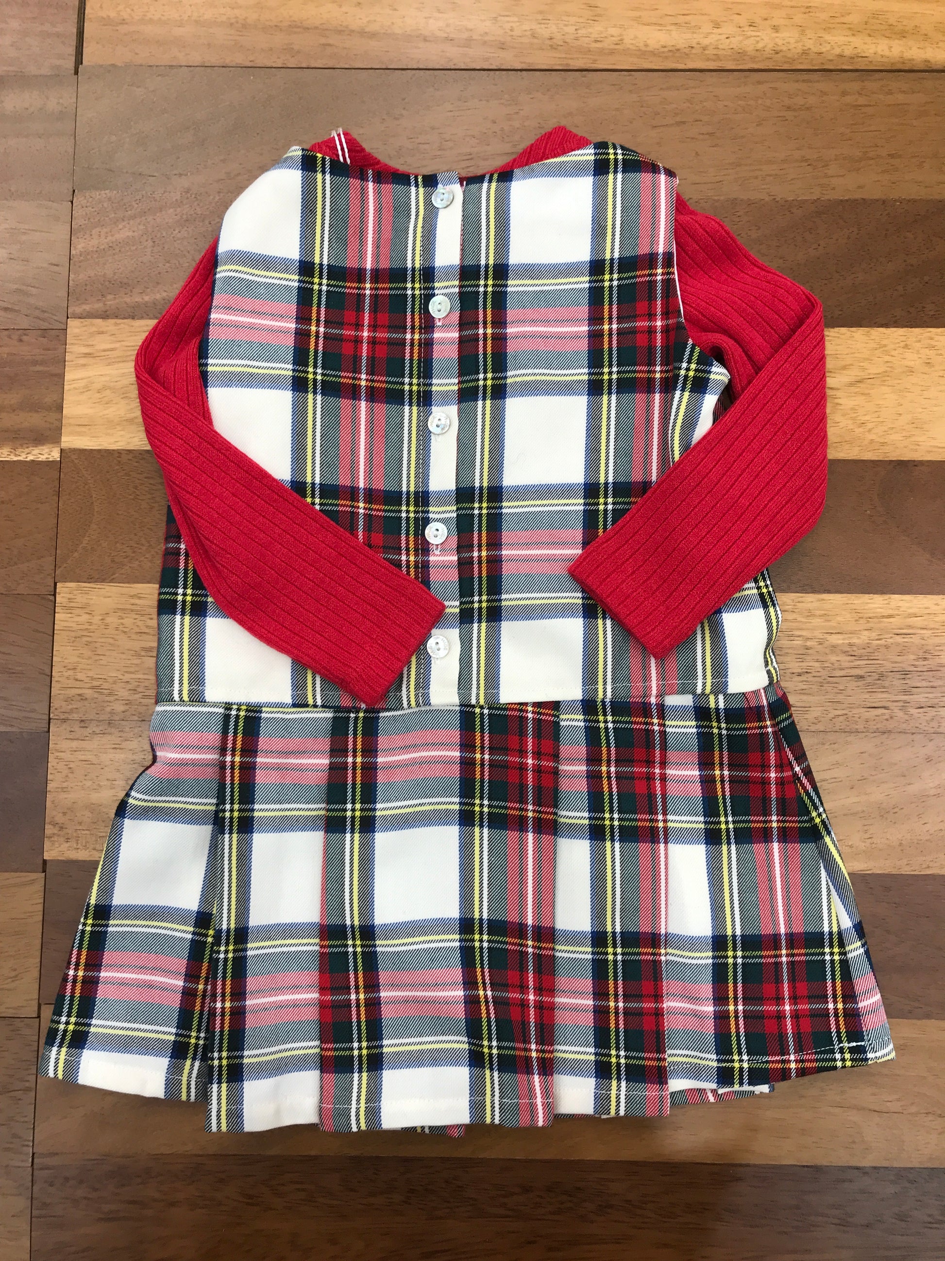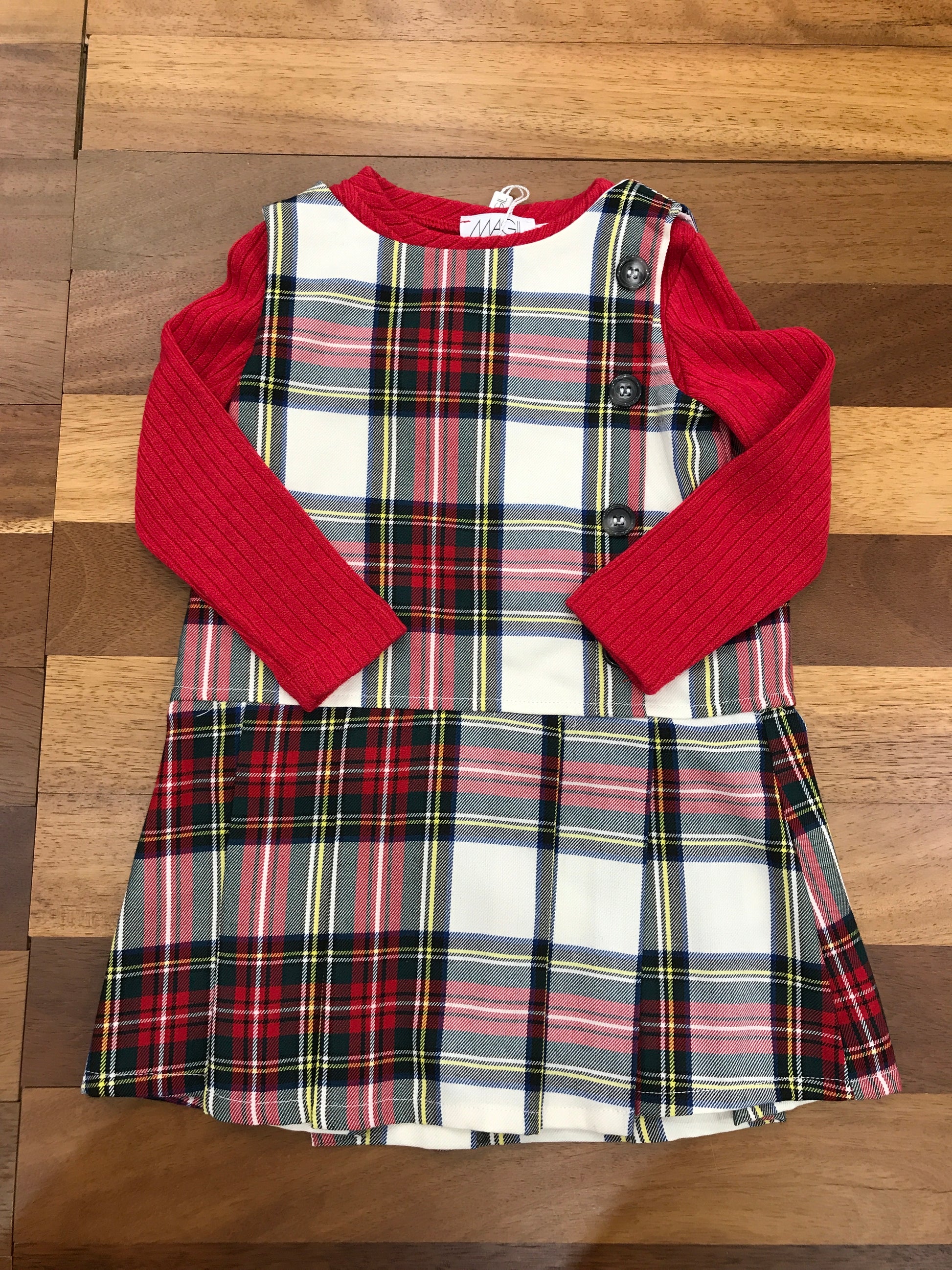 Elegante abitino caratterizzato da un raffinato motivo scozzese e una gonna plissettata che garantisce movimento e grazia. Il capo è completato da un maglioncino in lana di color rosso erosso, creando un'armonia cromatica sofisticata. La silhouette smanicata lo rende versatile e adatto a molteplici occasioni, mantenendo un'estetica classica e ricercata.