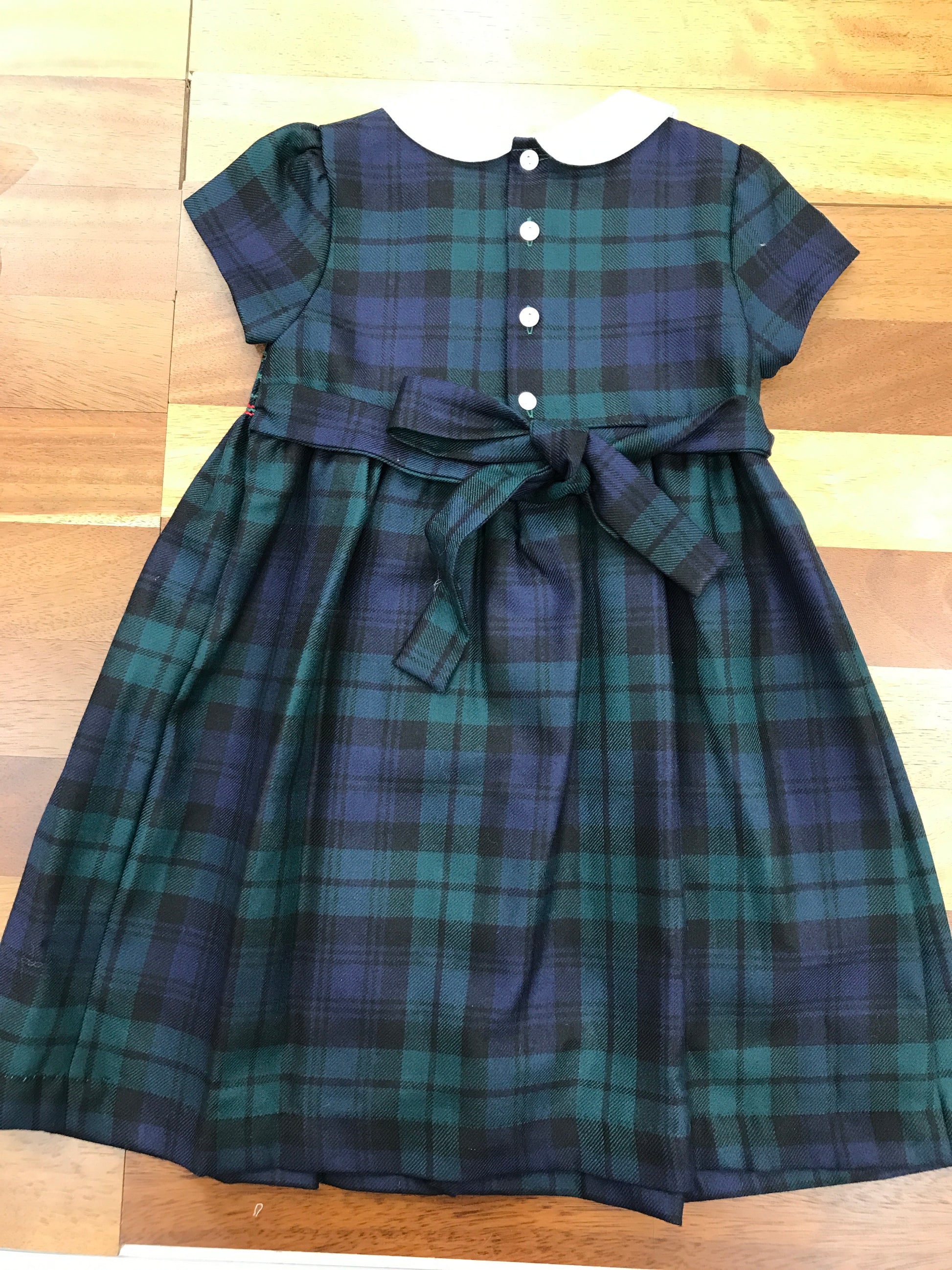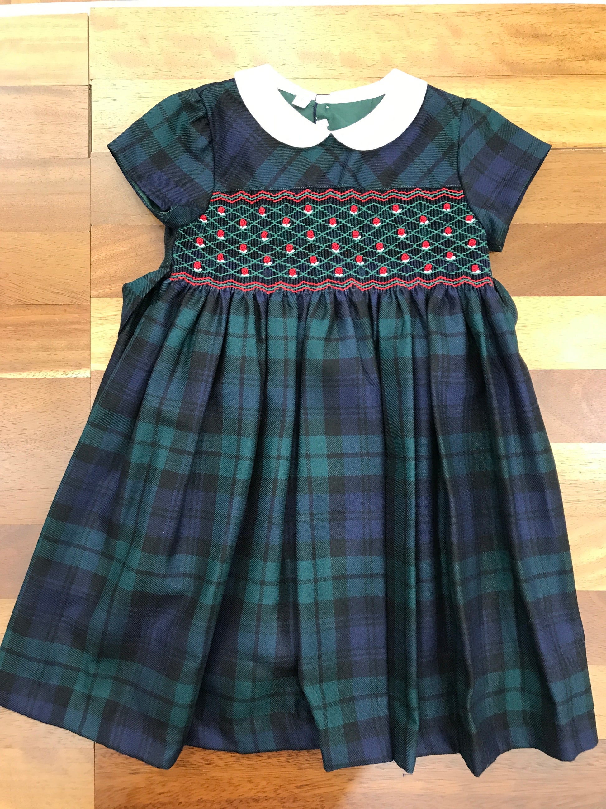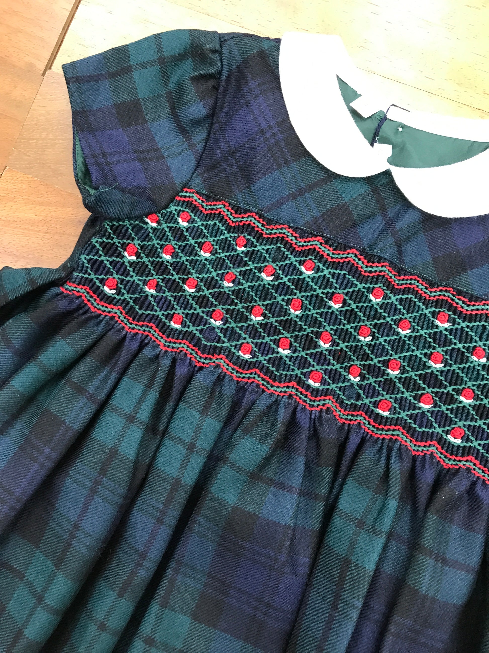 Questo delicato abitino propone un raffinato tartan nelle sfumature di verde e blu, caratterizzato da maniche a mezza lunghezza e un elegante colletto bianco. Il corpetto è impreziosito da una lavorazione smock che raffigura rose rosse, completata da ricami rossi che aggiungono profondità e movimento al capo. Un pezzo che unisce tradizione e dettagli artigianali di qualità.
