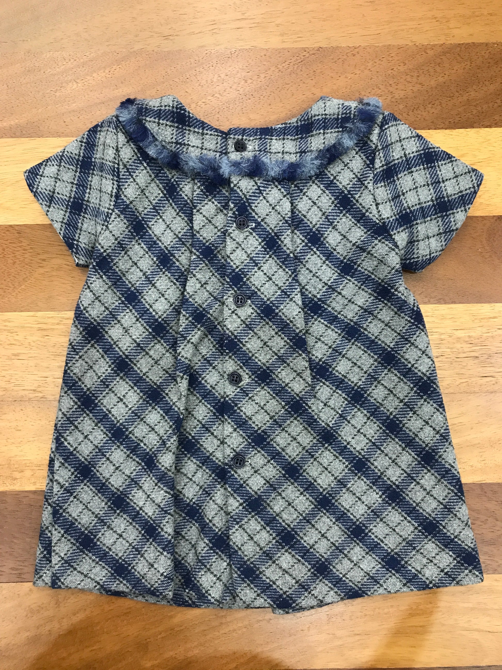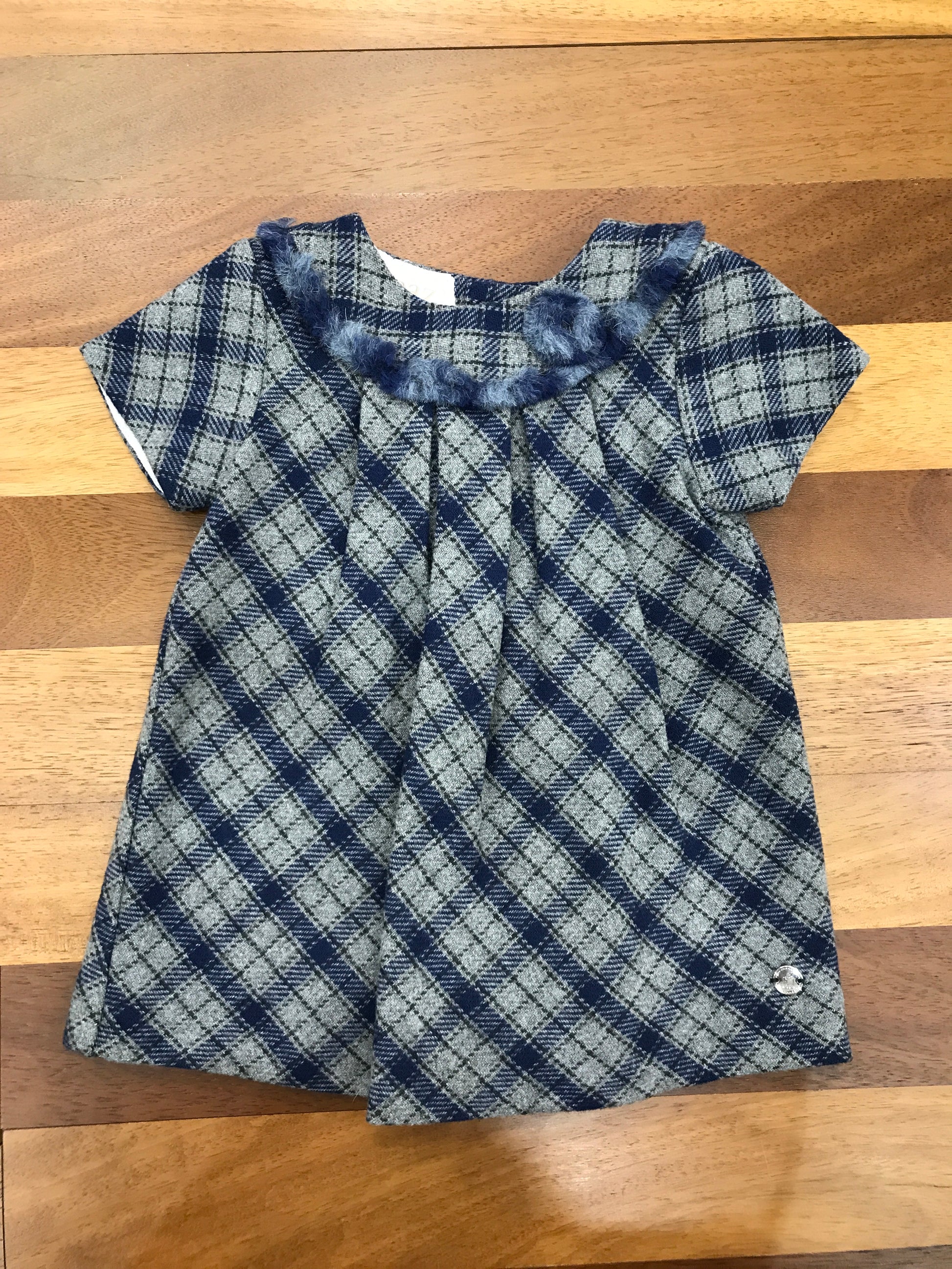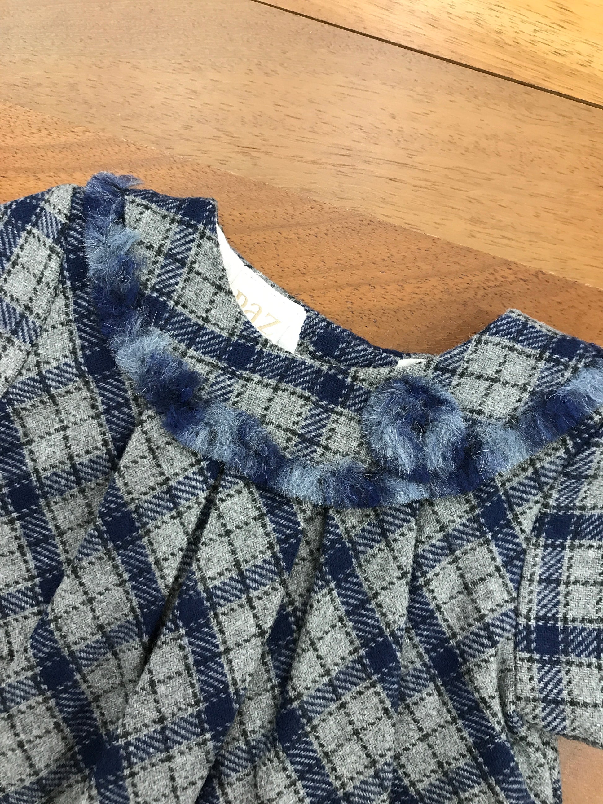 Questo delicato abitino combina sfumature di grigio e blu in una composizione armoniosa. La manica corta lo rende pratico per le stagioni più miti, mentre il colletto caratterizzato da un orlo in morbido pile è impreziosito da un piccolo pompon coordinato che riprende i toni dell'abito. Un capo raffinato che unisce comfort e dettagli ricercati.