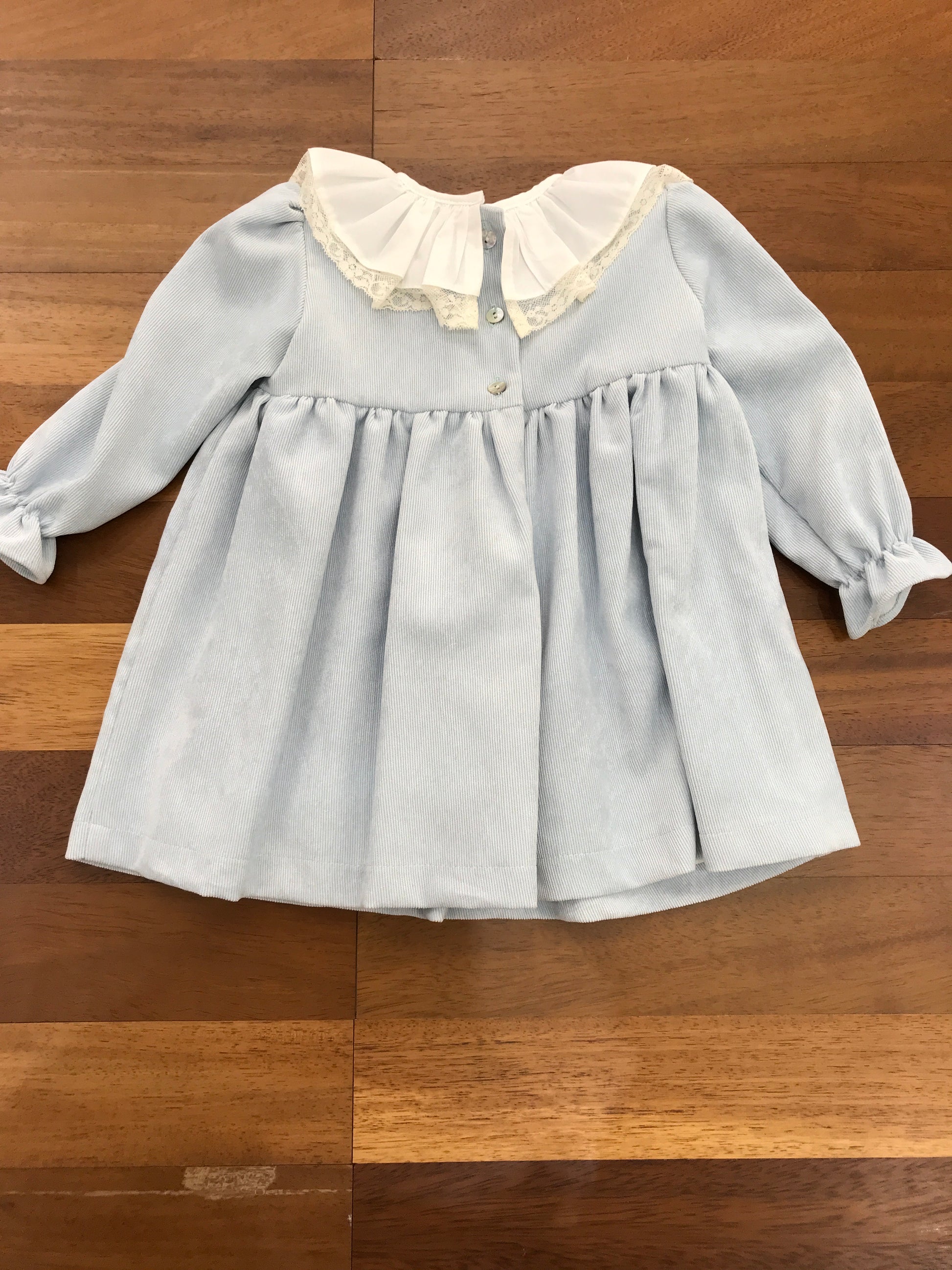 Delicato abitino in velluto a coste celeste, impreziosito da un colletto rifinito con pizzo ricamato. Il corpetto presenta una raffinata lavorazione a punto smock decorato con rose rosa, che conferisce eleganza e movimento al capo. Un'opzione sofisticata per occasioni speciali.