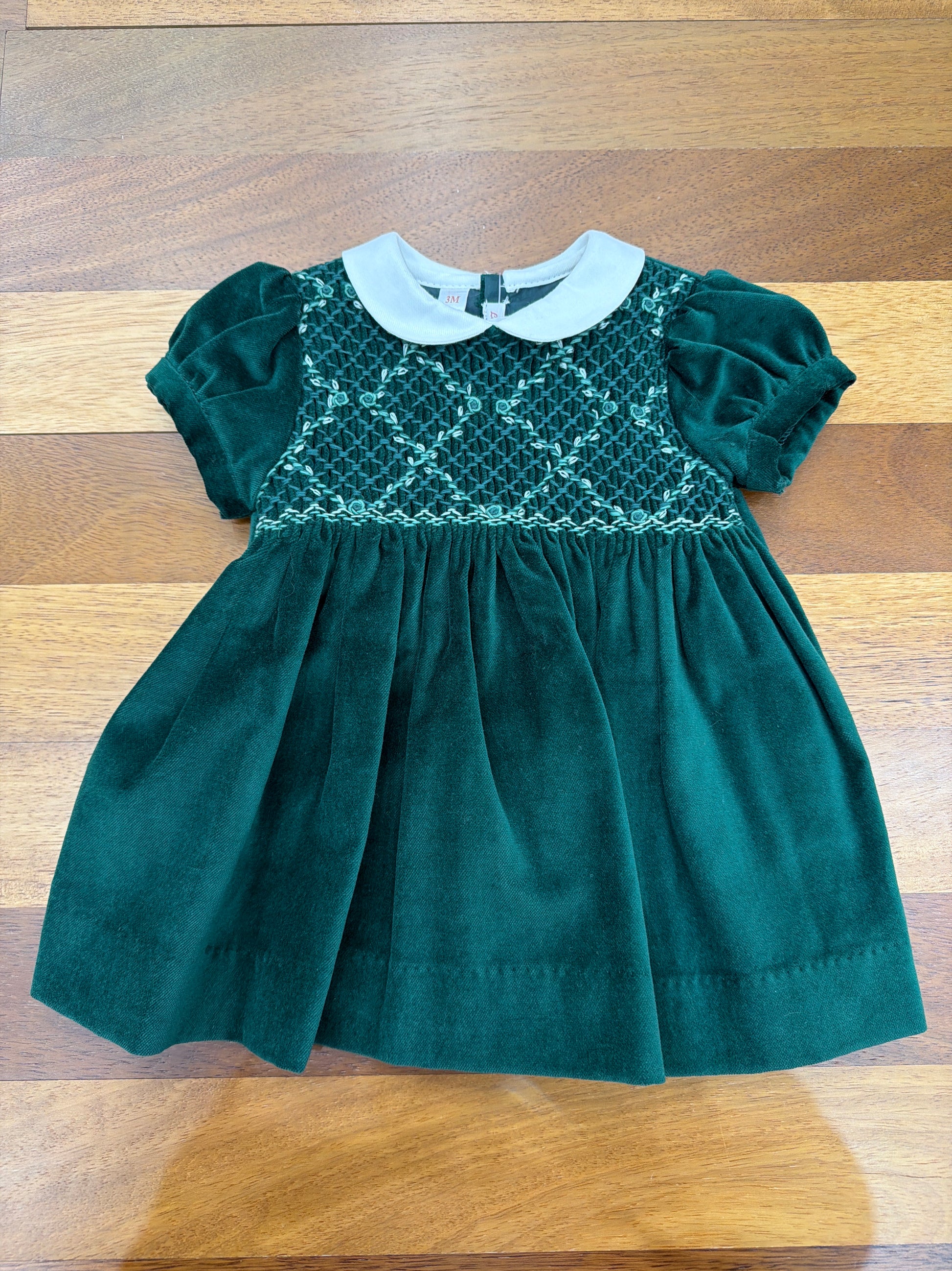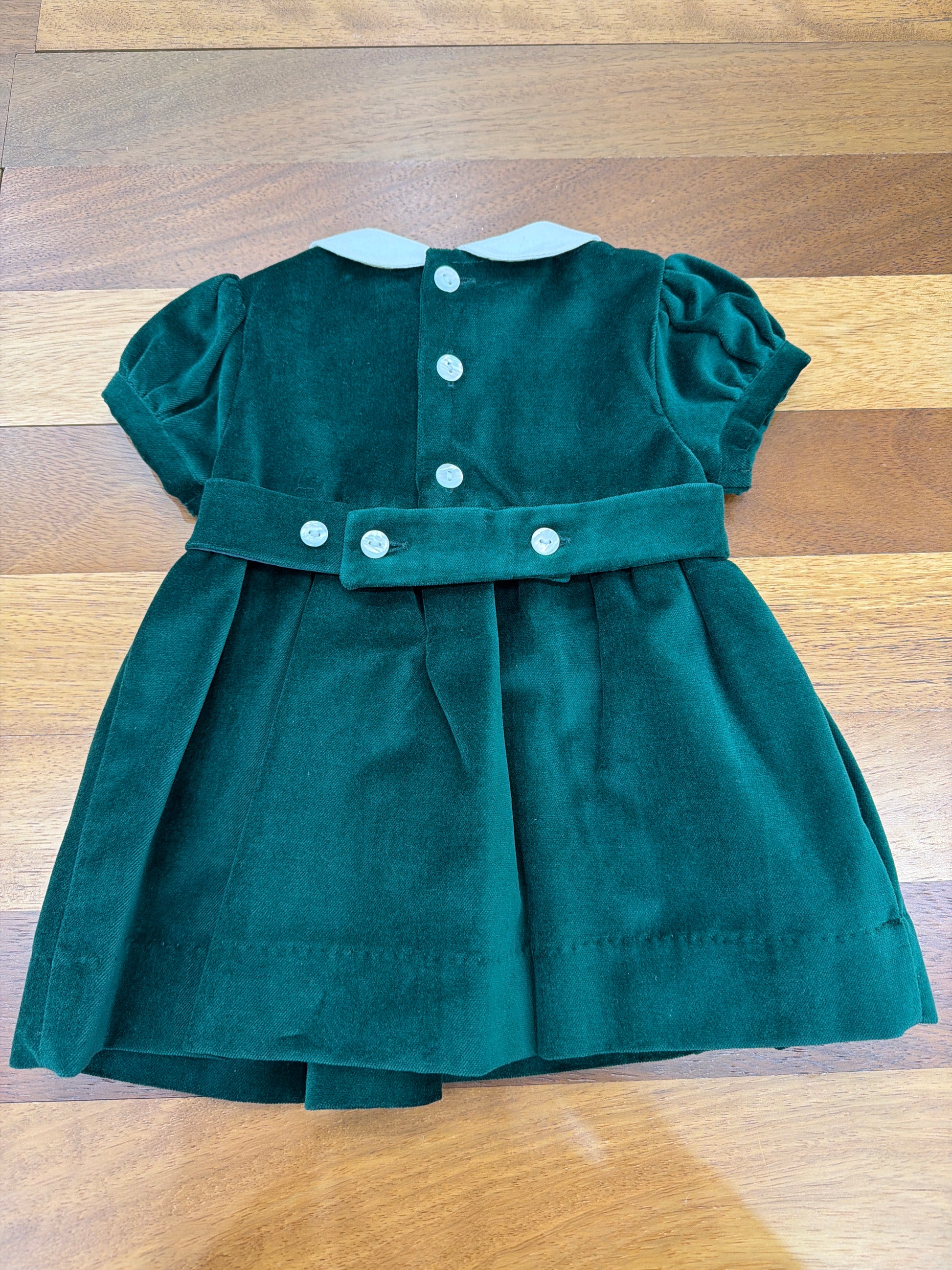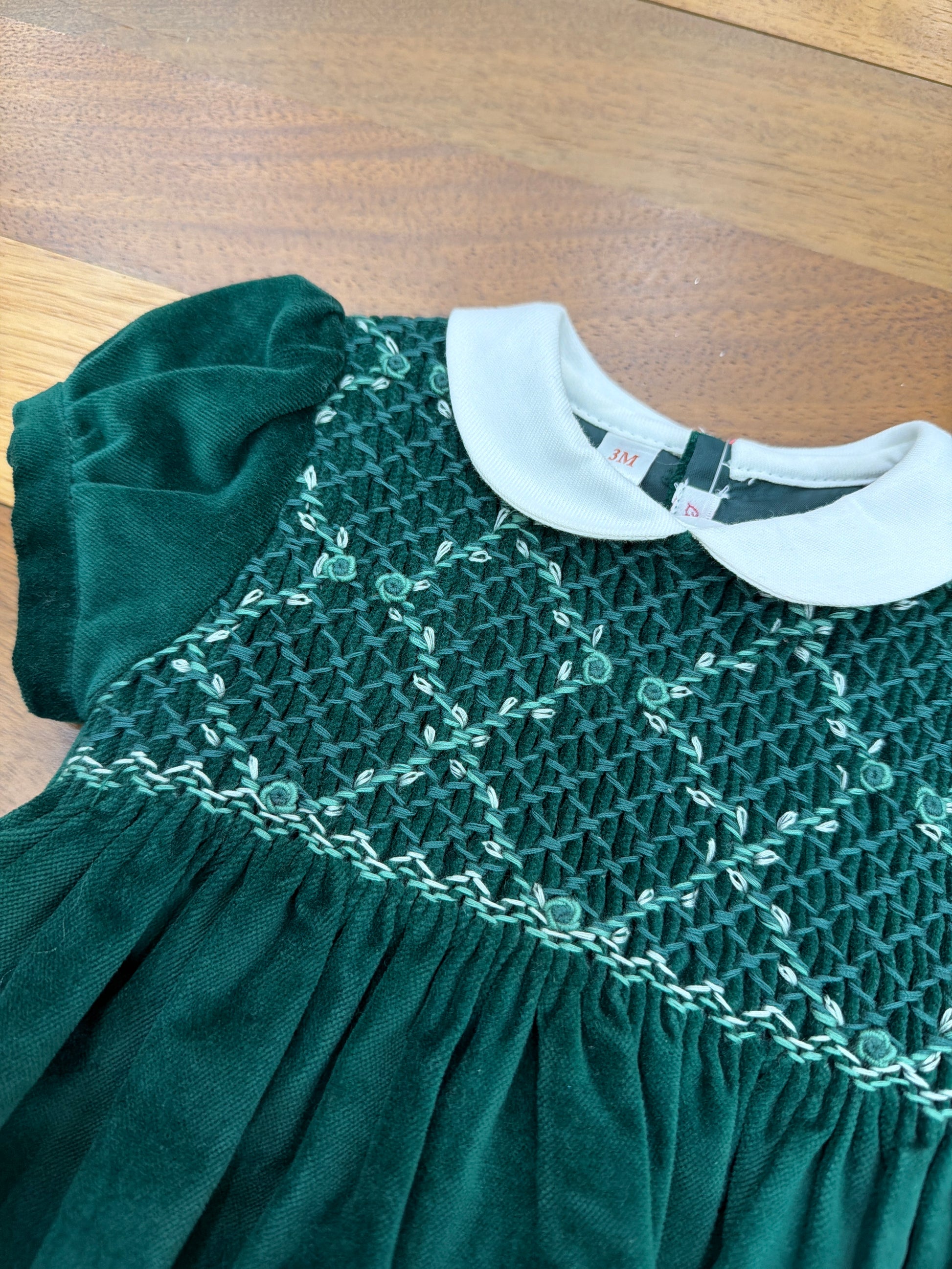 Questo delicato abitino in velluto verde scuro presenta maniche corte a sbuffo e un elegante colletto bianco che incornicia il viso. La lavorazione a punto smock crea un raffinato motivo a rombi sul petto, aggiungendo profondità e movimento al capo. La gonna in velluto liscio completa il design con semplicità e grazia, perfetto per occasioni speciali o momenti quotidiani ricercati.