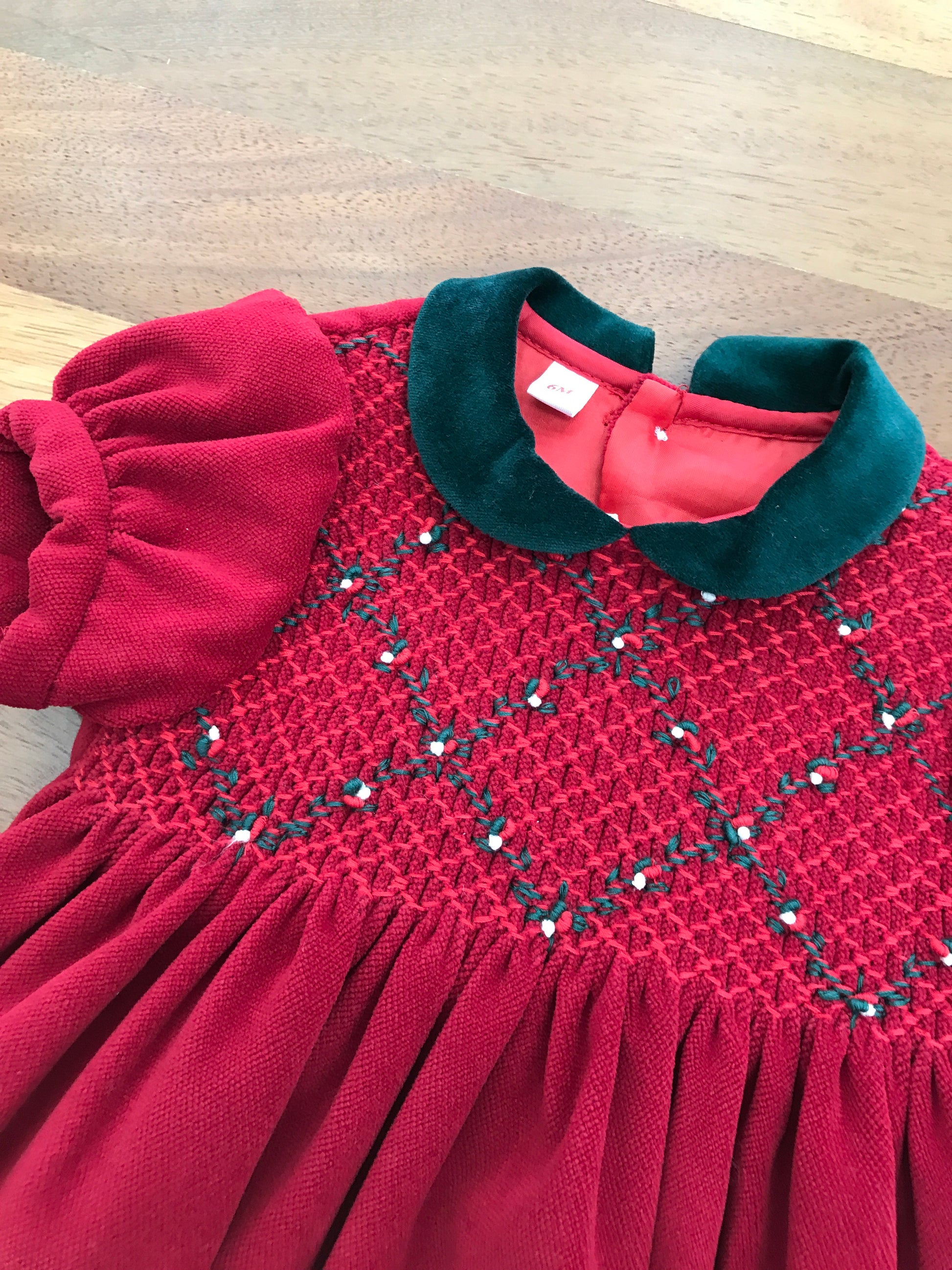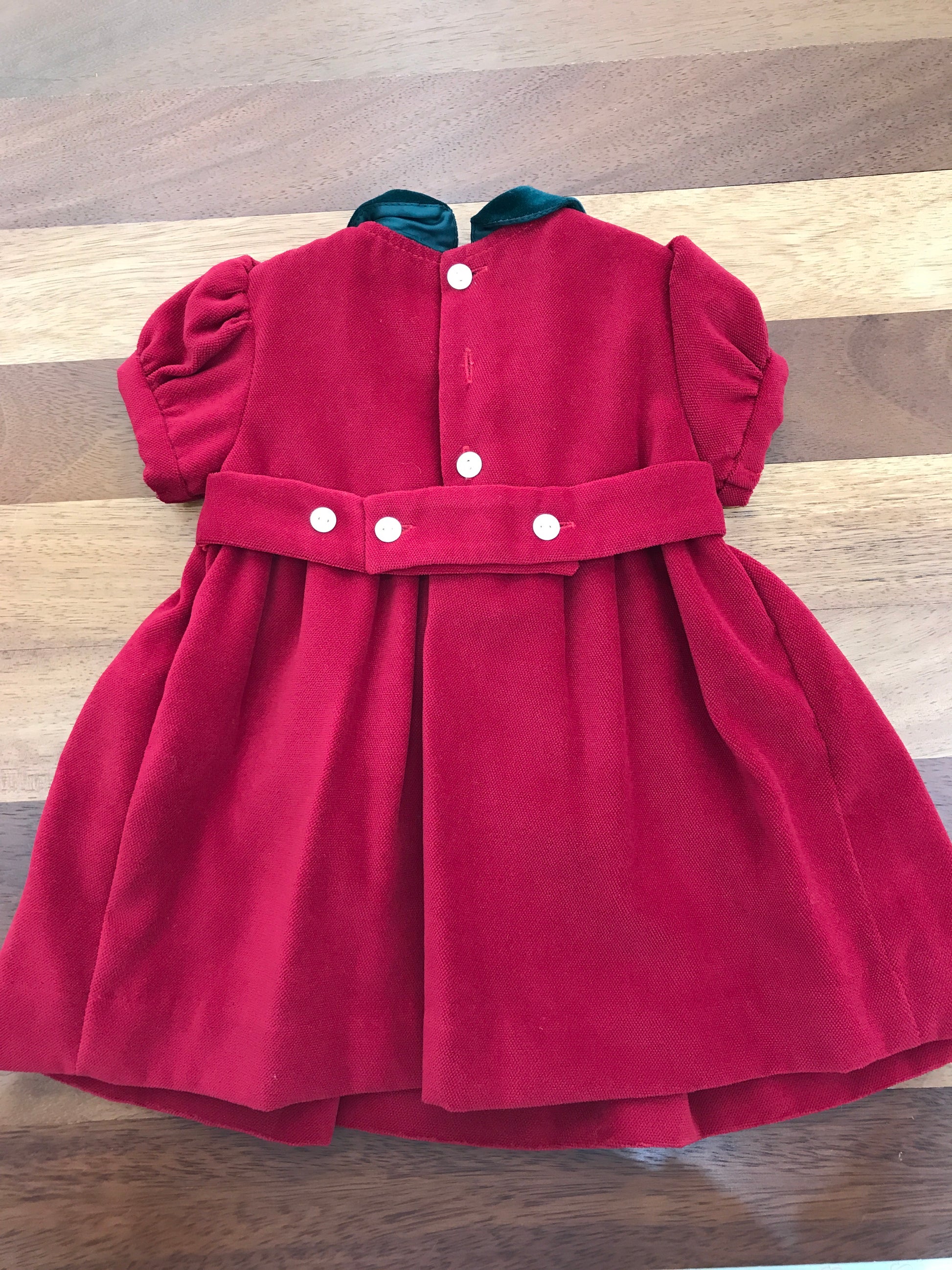 Elegante abitino in velluto a costine rosso, impreziosito da un raffinato colletto in velluto verde. Il corpetto presenta una delicata lavorazione a punto smock che forma un motivo geometrico a rombi, mentre il retro è completato da un elegante martin gala. Un capo sofisticato che unisce dettagli artigianali e design ricercato, perfetto per occasioni speciali.