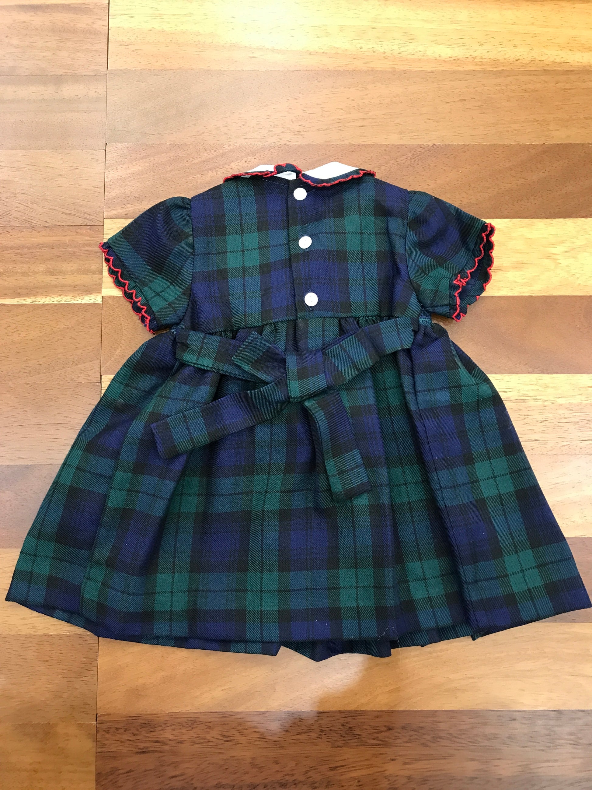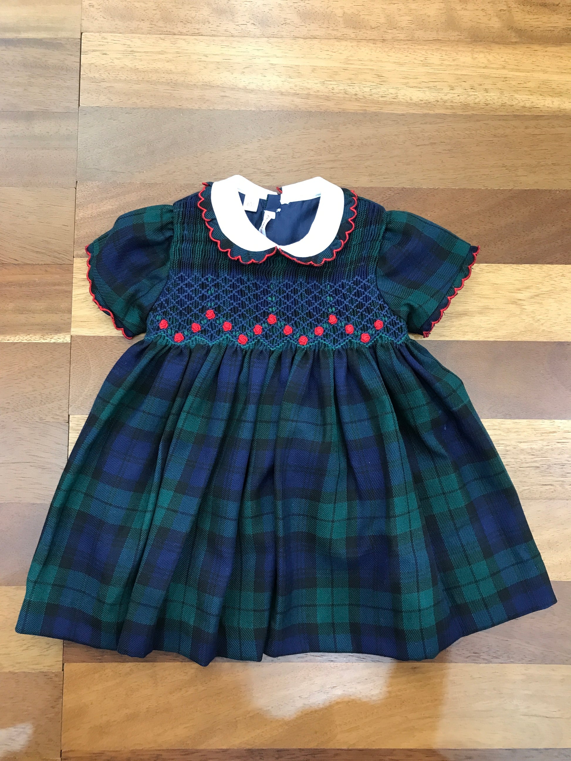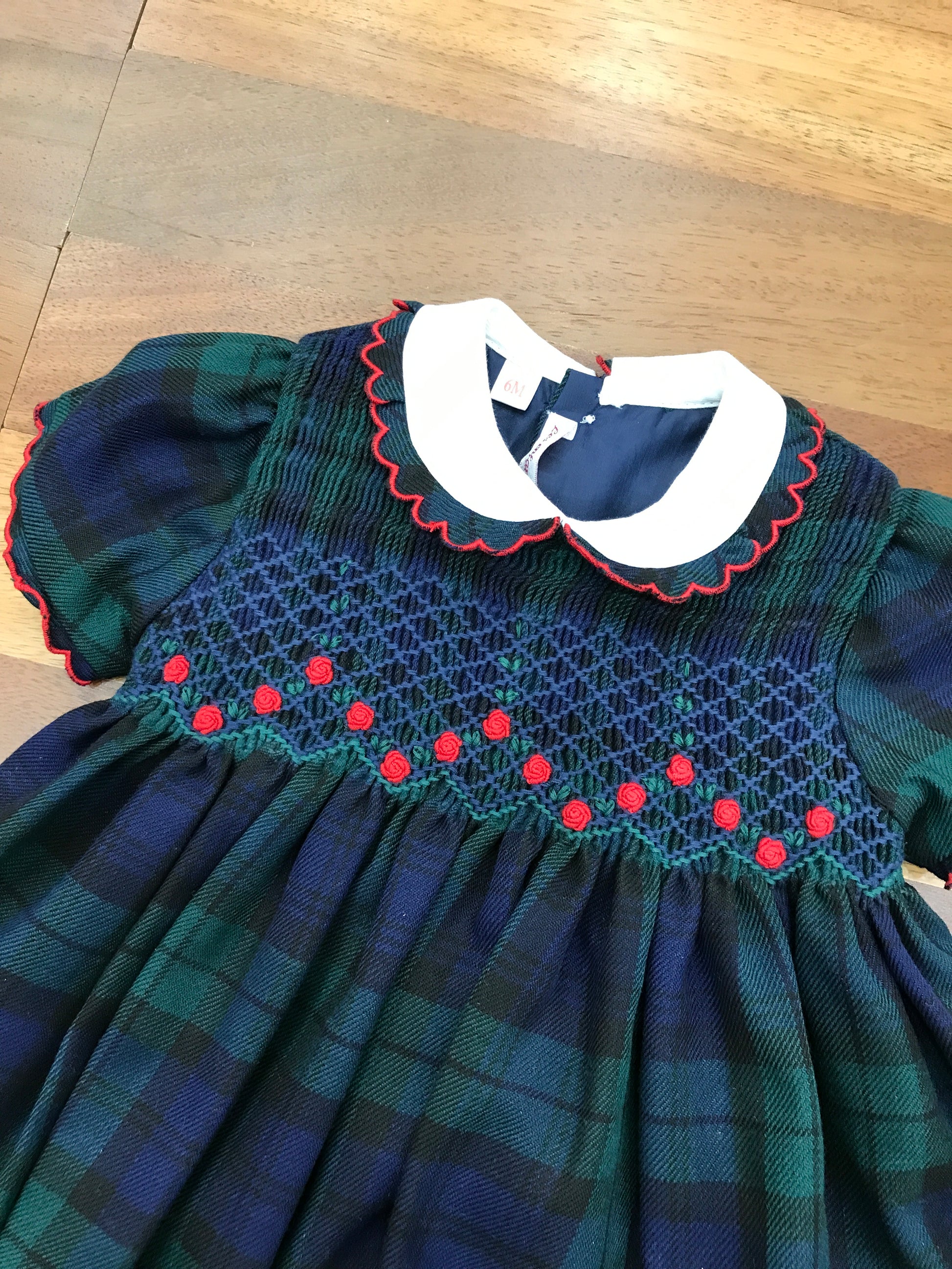 Questo delizioso abitino tartan combina il fascino tradizionale scozzese con dettagli raffinati. La palette di blu e verde crea un'elegante base, mentre le maniche corte a sbuffo presentano un ricamo rosso al bordo che aggiunge vivacità. Il colletto bianco smerlato, anch'esso impreziosito da ricami rossi, incornicia il viso con grazia. Il corpetto, lavorato con la tecnica dello smocking, è decorato con rose rosse ricamate che conferiscono un tocco di sofisticatezza e femminilità al capo. Un'opzione versatile per occasioni speciali e momenti di eleganza quotidiana.