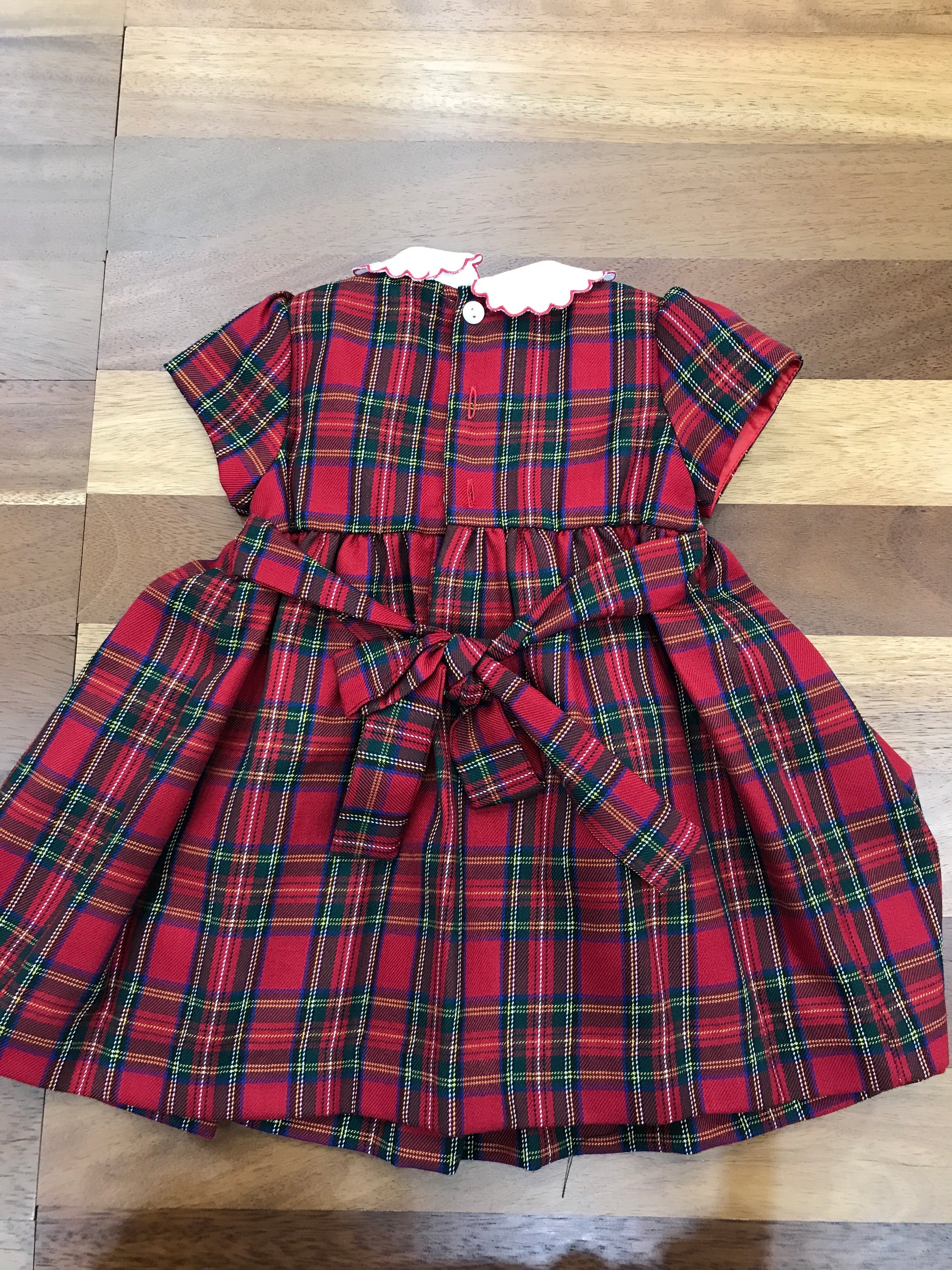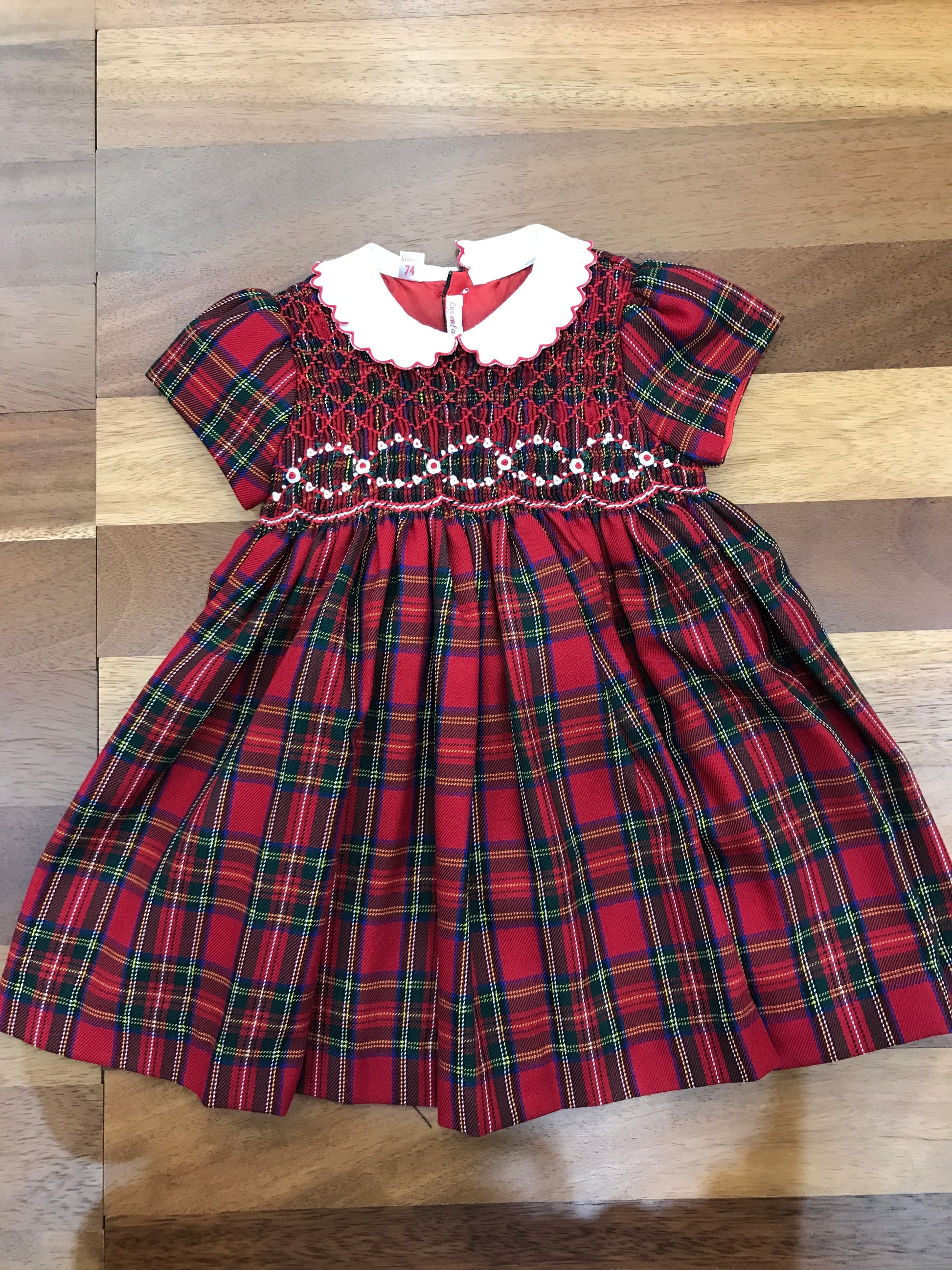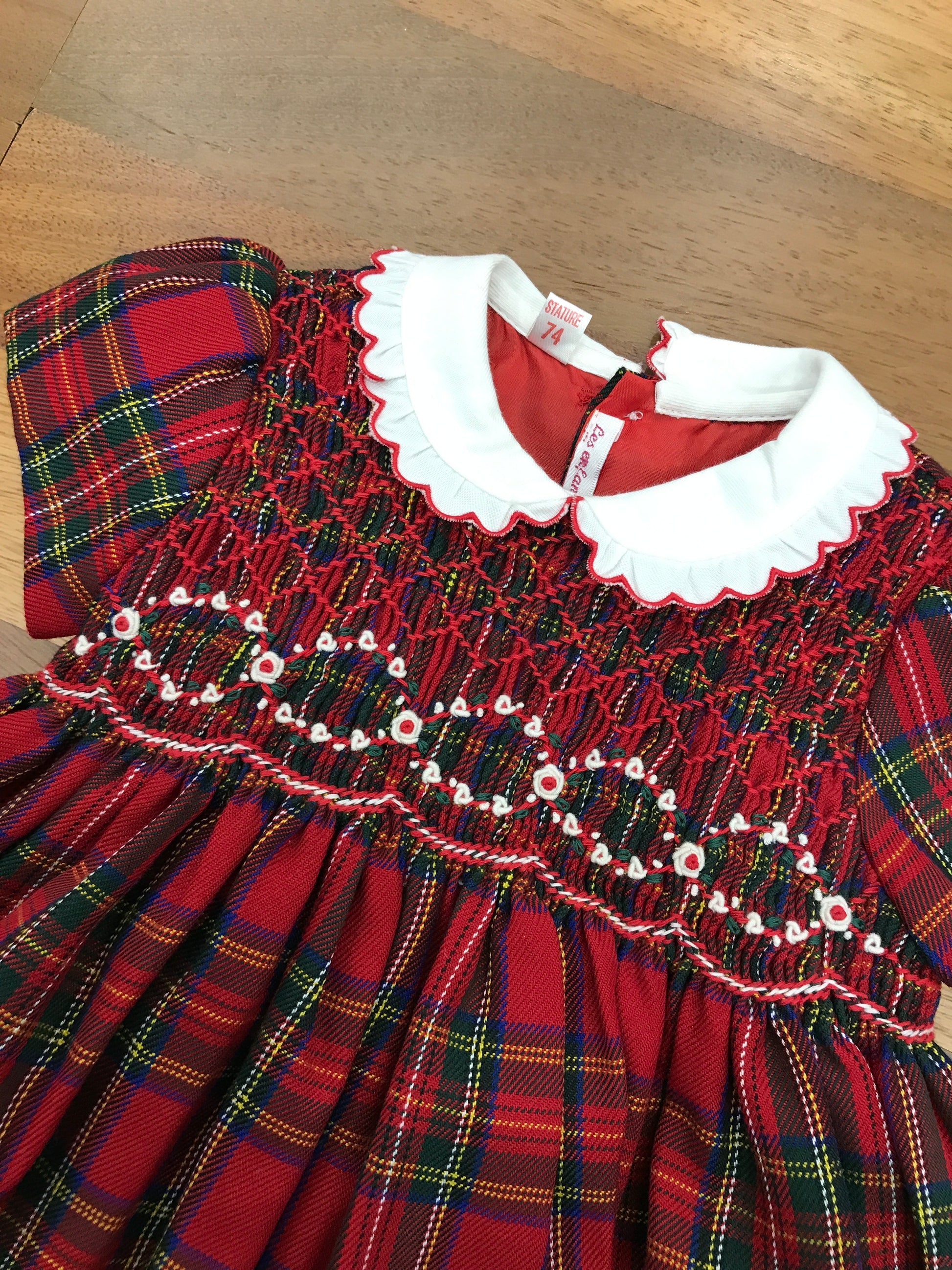 Questo delicato abitino propone un classico motivo scozzese nelle tonalità di rosso e verde, caratterizzato da maniche corte a sbuffo e un elegante colletto bianco con orlo smerlato. Il corpetto presenta una raffinata lavorazione a punto smock, arricchita da dettagli ricamati in rosso e fiori decorativi che conferiscono un tocco di sofisticatezza al capo. Un'opzione versatile e ricercata per occasioni speciali.