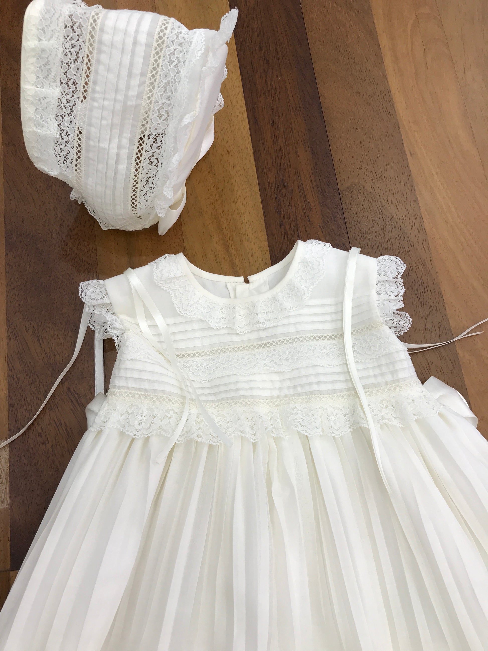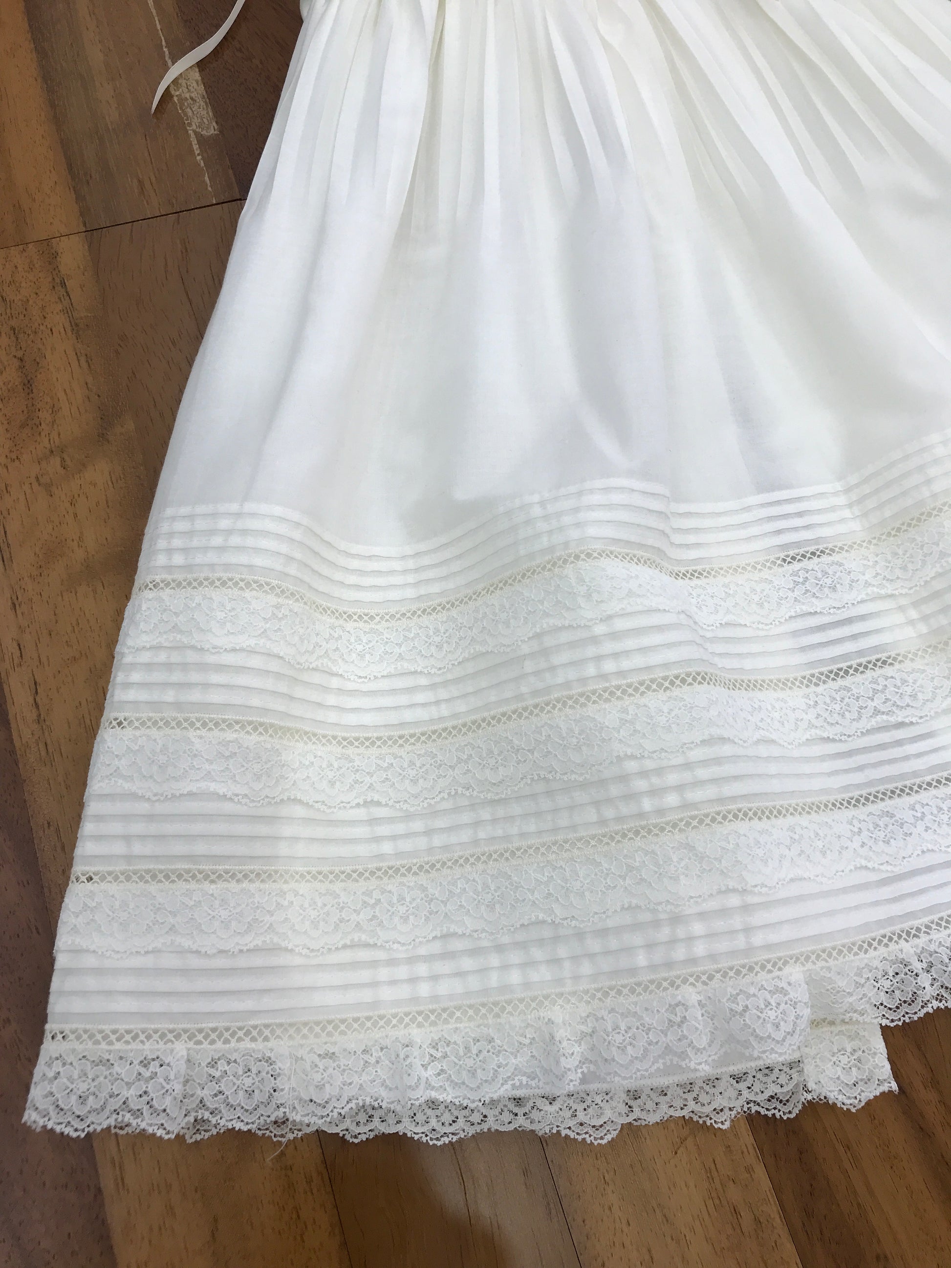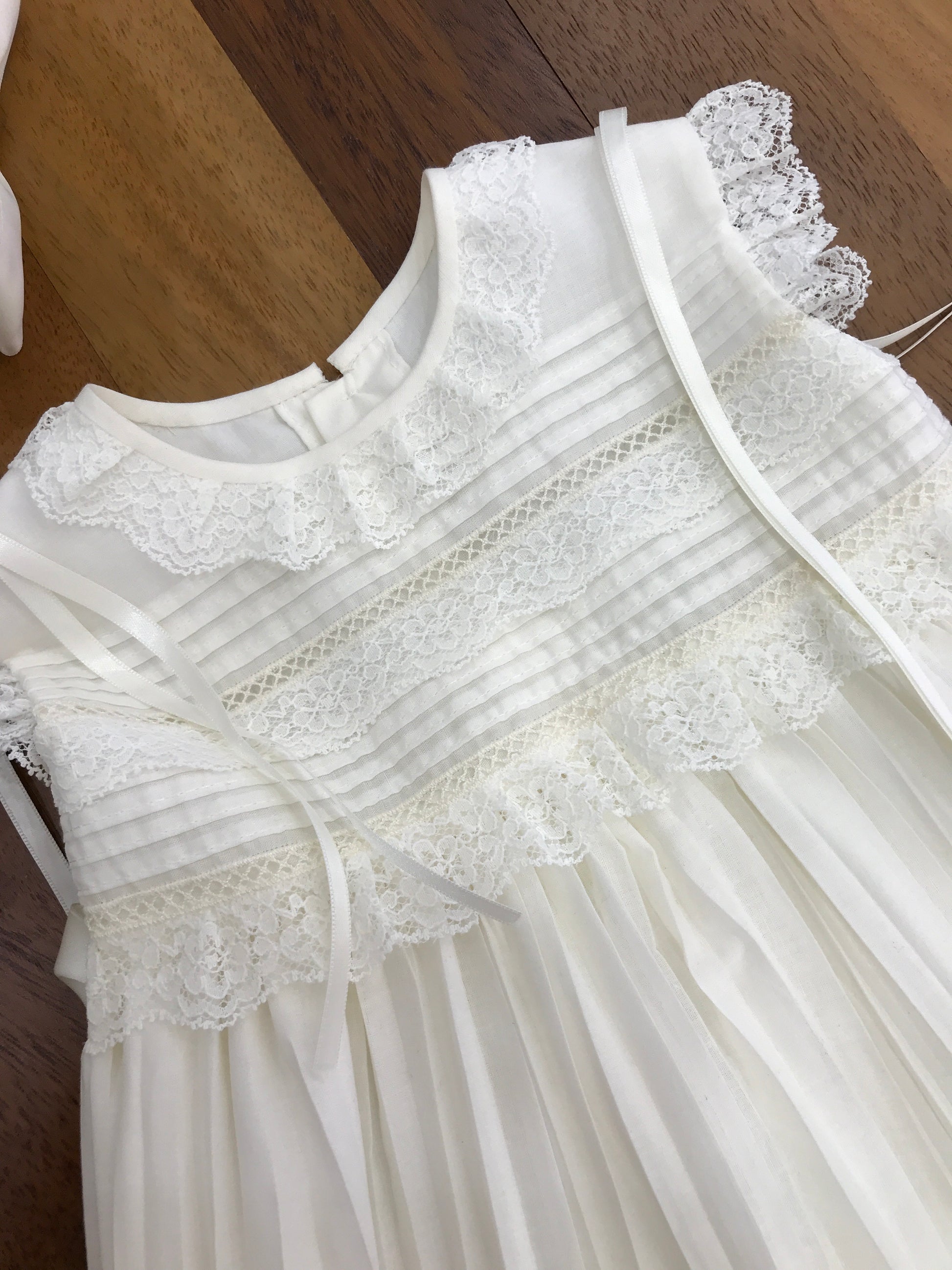 Abito battesimale in cotone smanicato con rifinitura di merletto al braccio ed al collo il corpetto a pieghe e balza di pizzo mentre il gonnellone porta 4 fasce di pieghe e meroletto sul finale il tutto rifinito con balza dello stesso merletto e cuffia coordinata