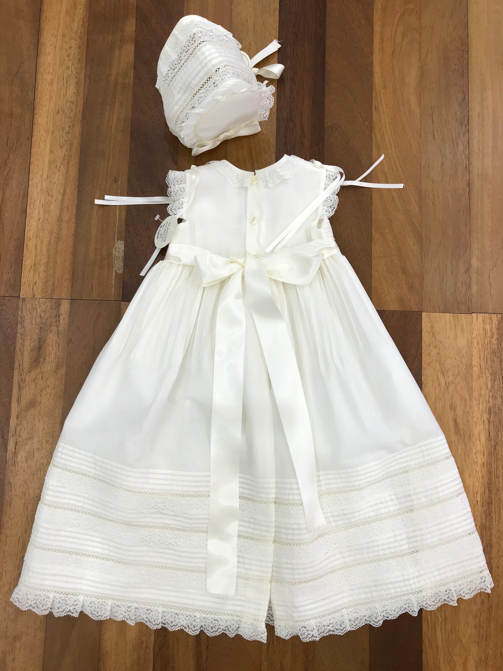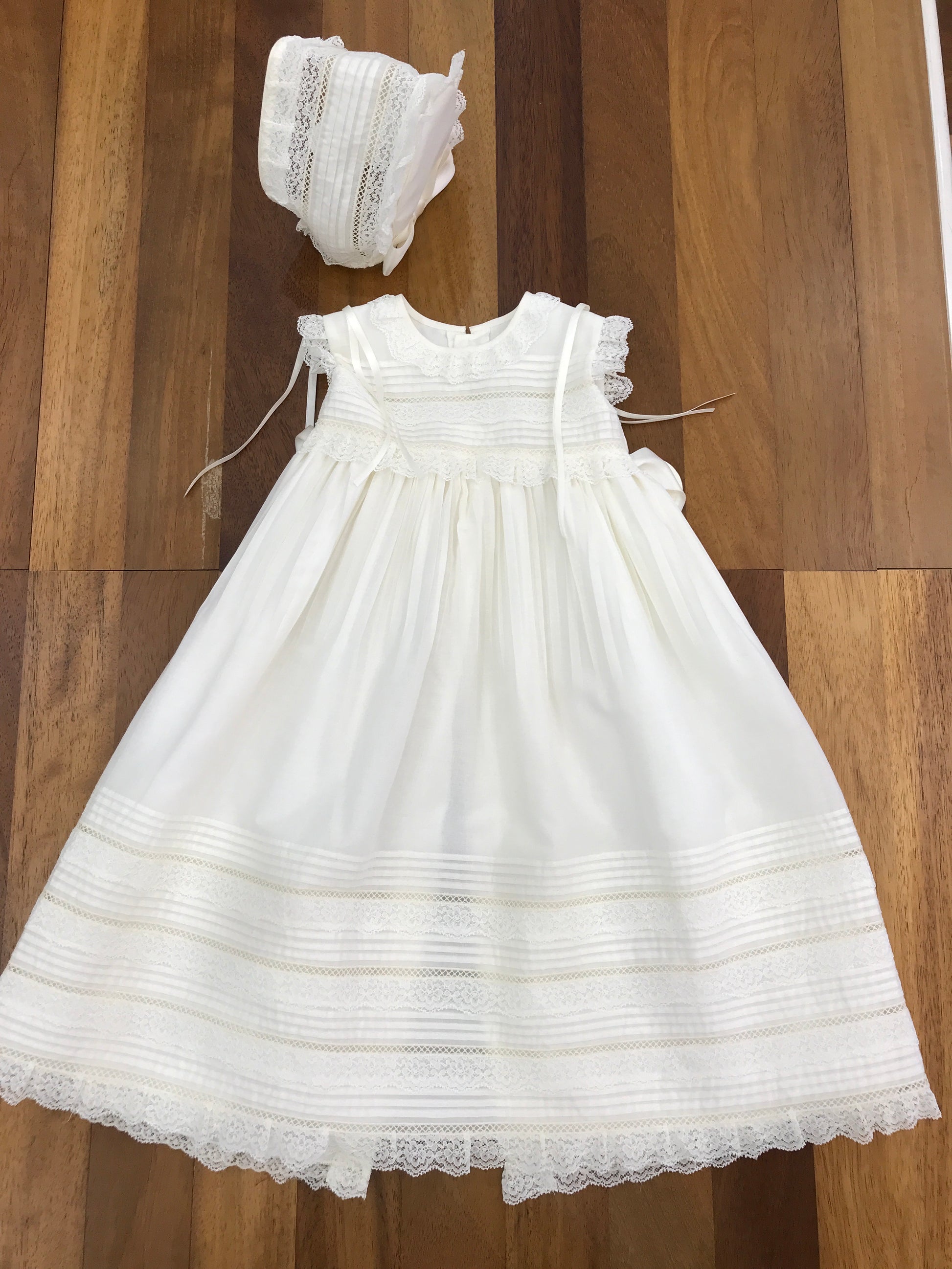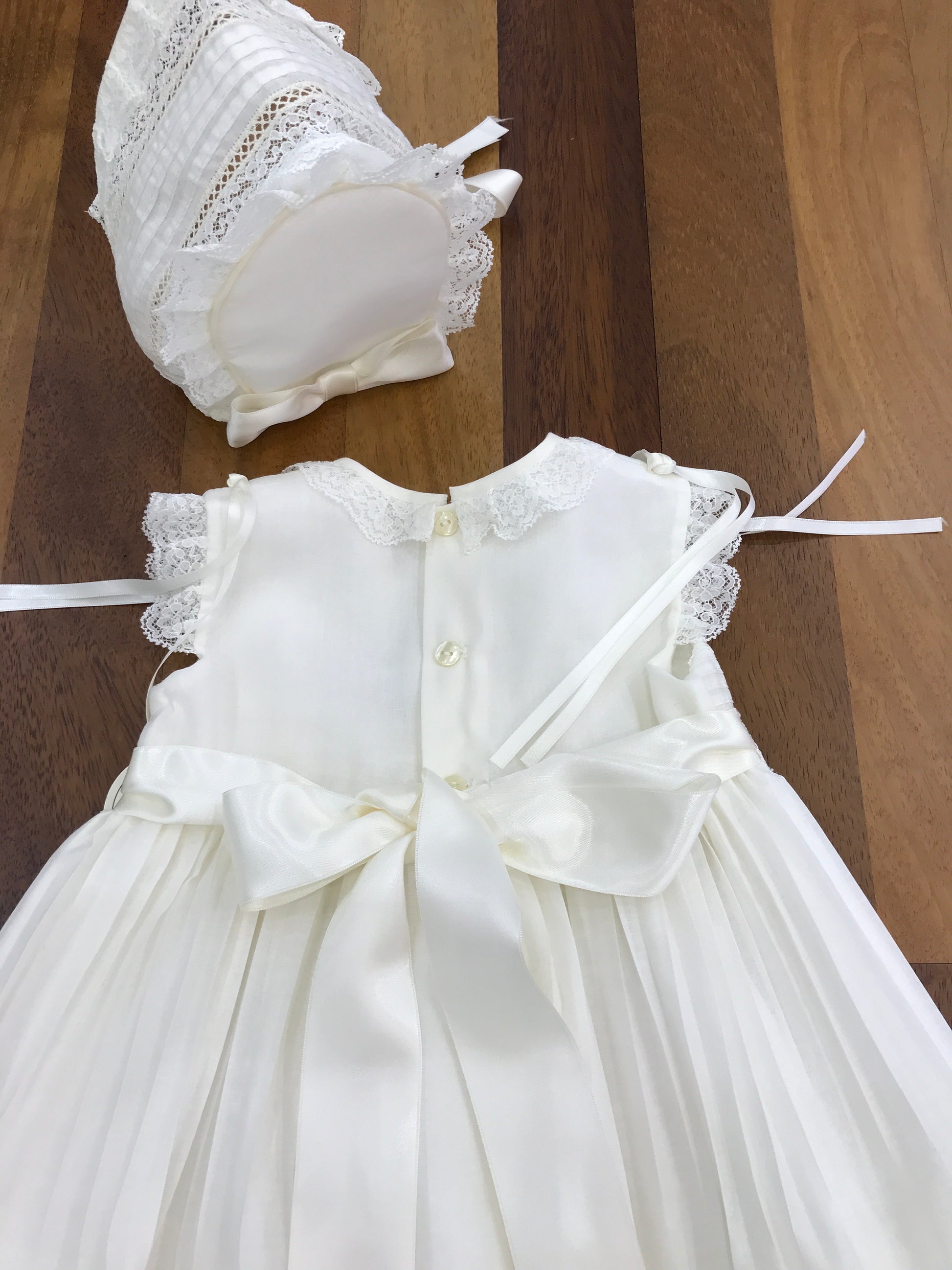 Abito battesimale in cotone smanicato con rifinitura di merletto al braccio ed al collo il corpetto a pieghe e balza di pizzo mentre il gonnellone porta 4 fasce di pieghe e meroletto sul finale il tutto rifinito con balza dello stesso merletto e cuffia coordinata
