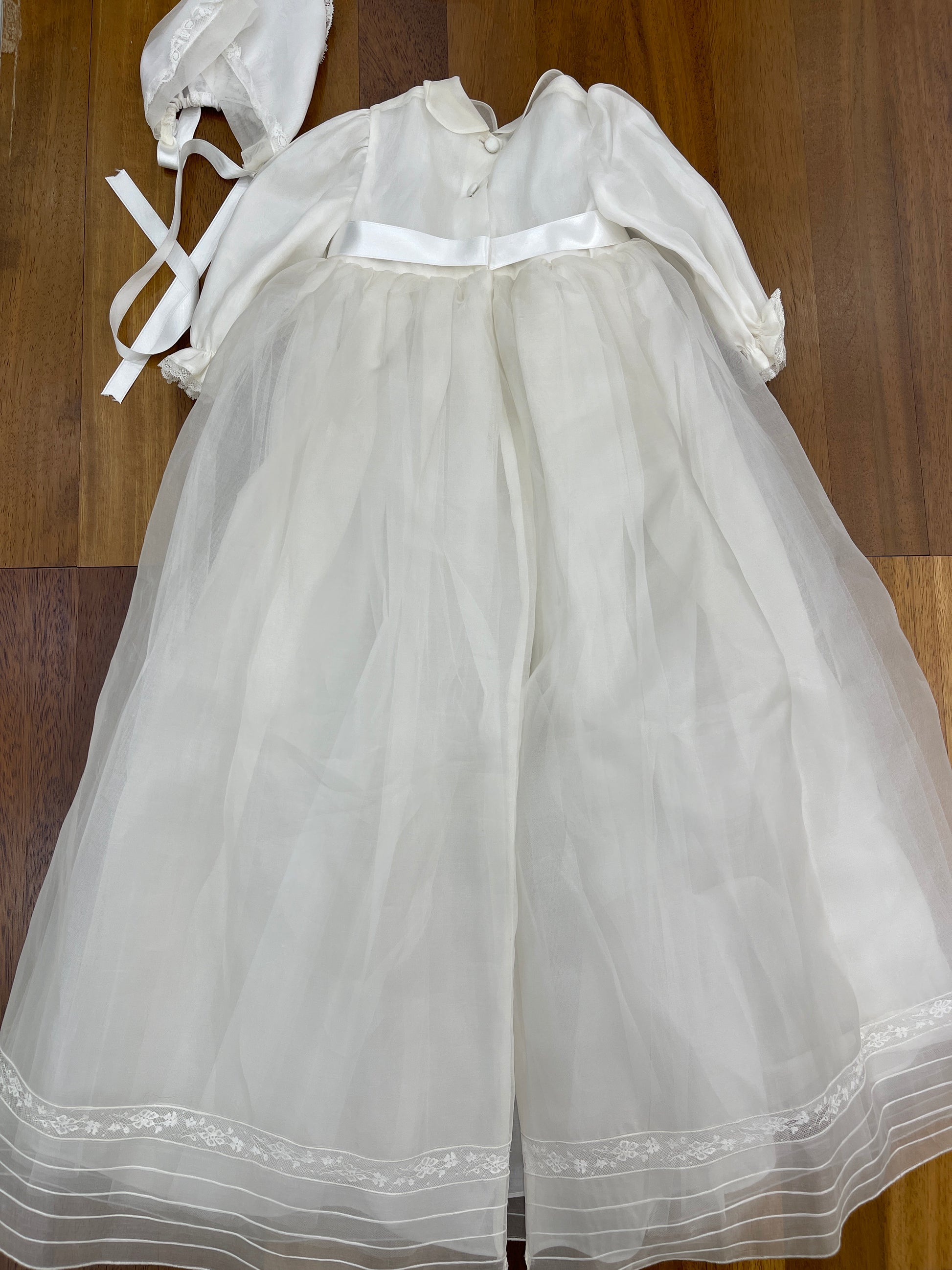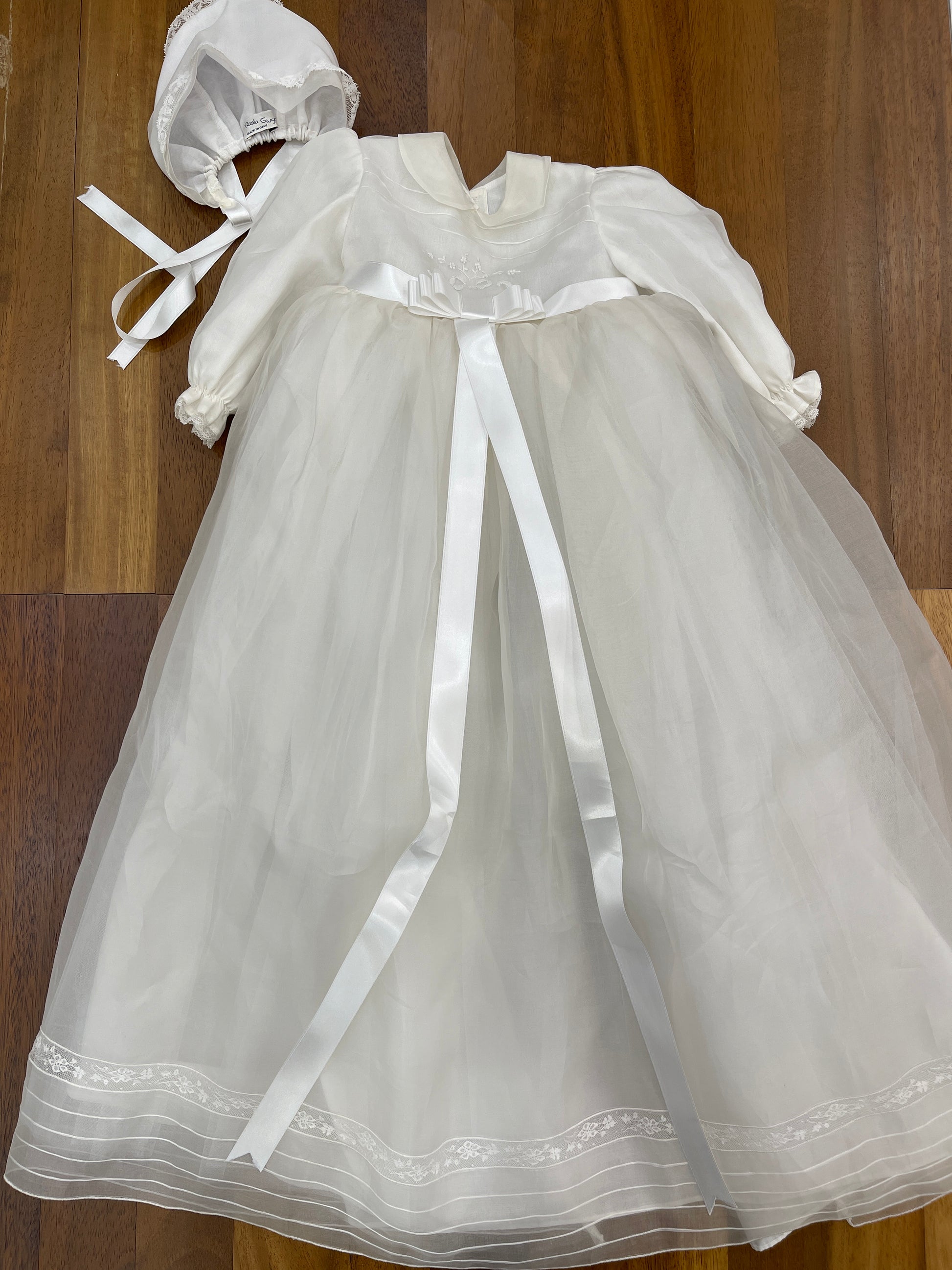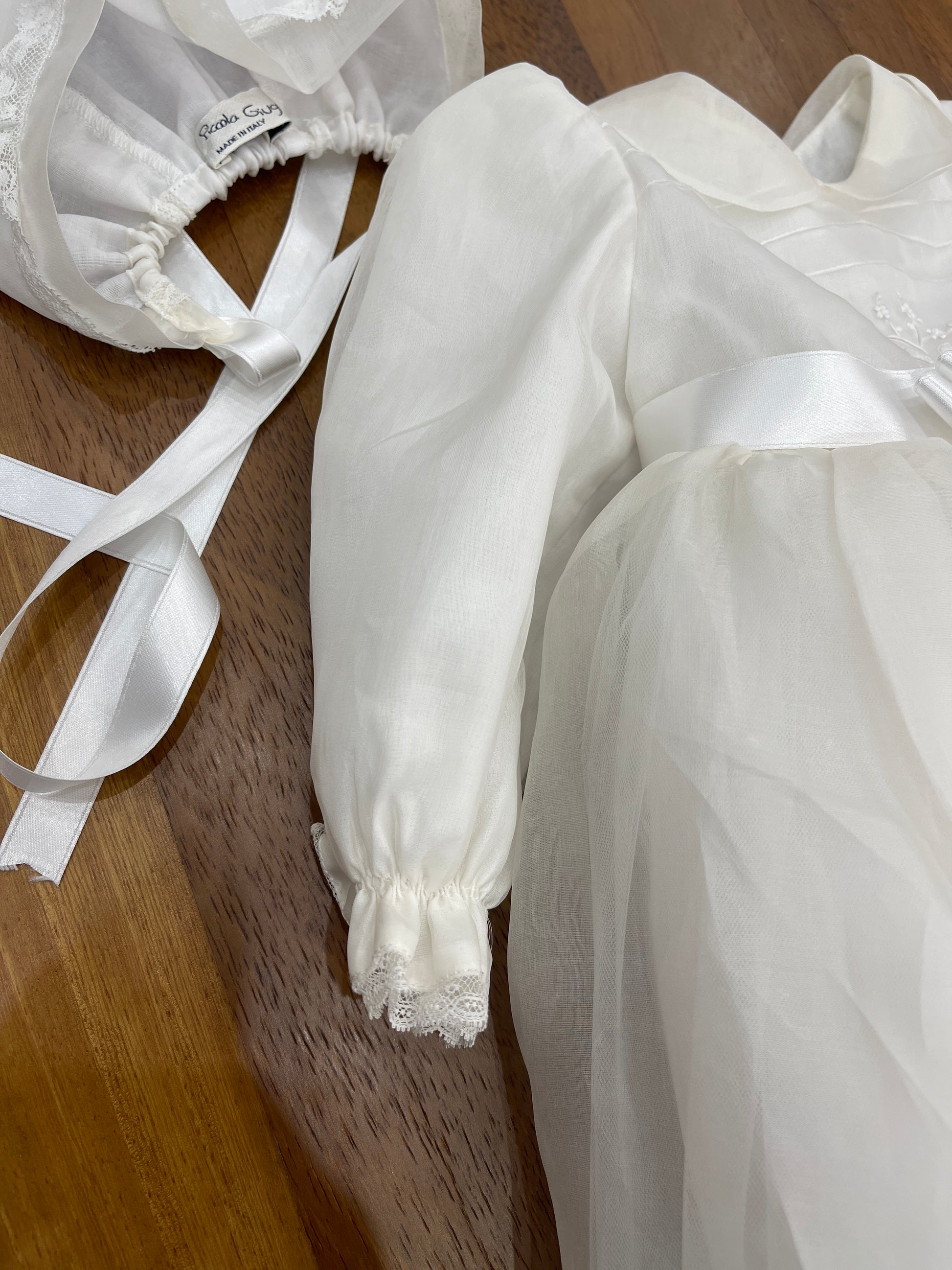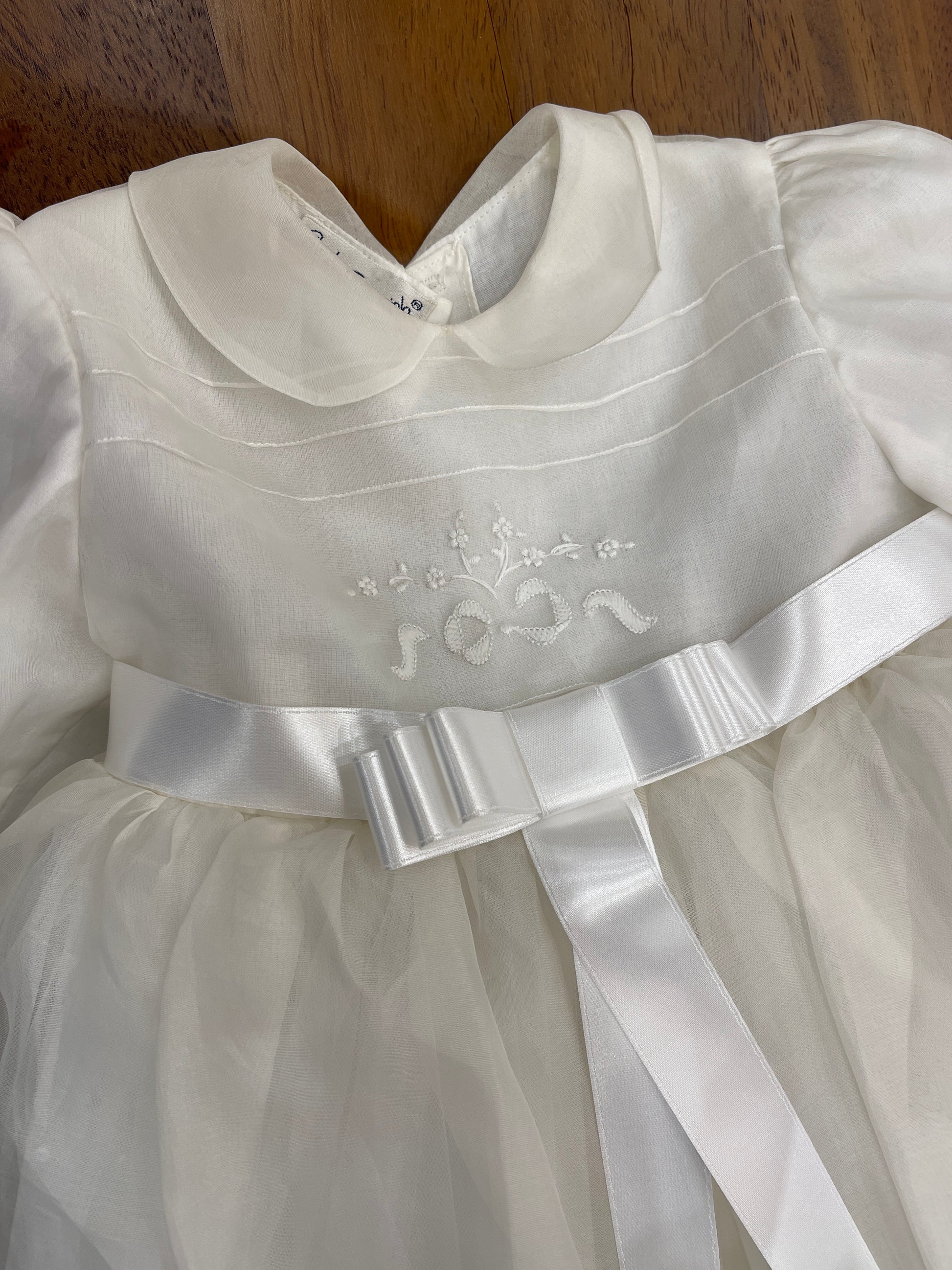 Abito in organza di seta completamente realizzato con collo liscio e pulito. Il corpetto presenta ricami fatti a mano e un nastro posizionato a rifinire, creando un fiocco elegante. La gonna ampia è decorata con rifiniture in valencienne, completata da una chiusura posteriore con bottoncini e una cuffietta anch’essa rifinita in valencienne.