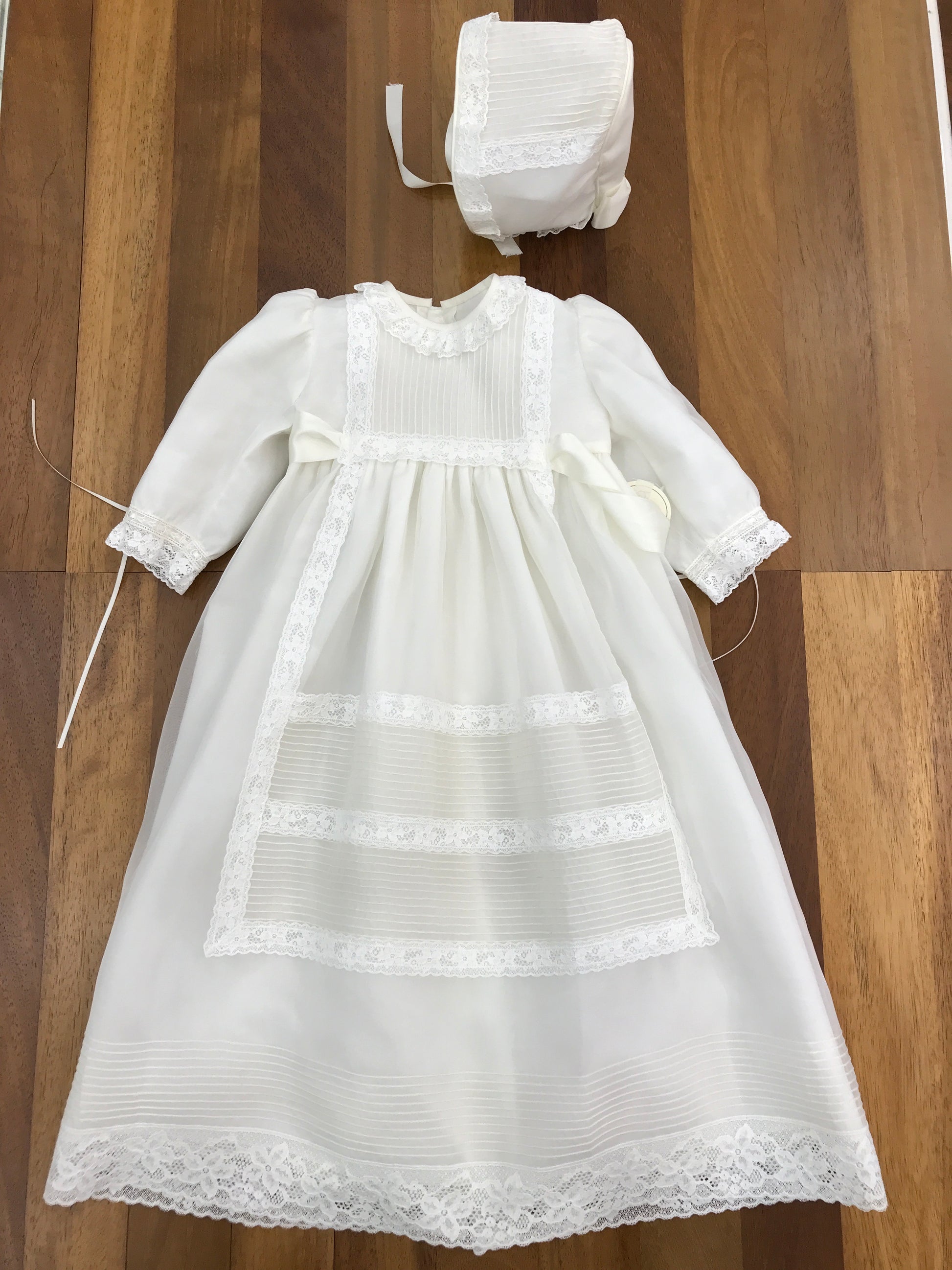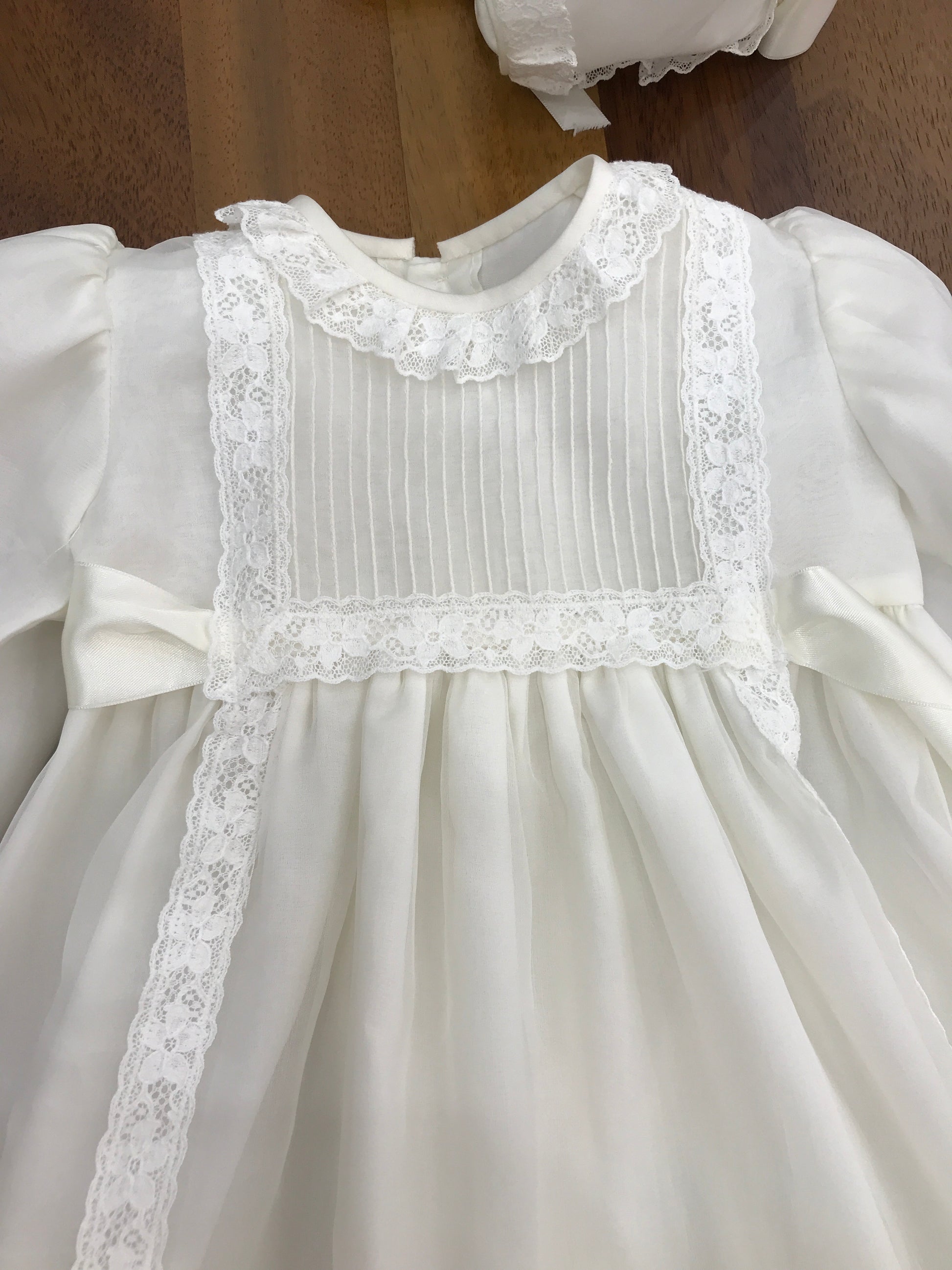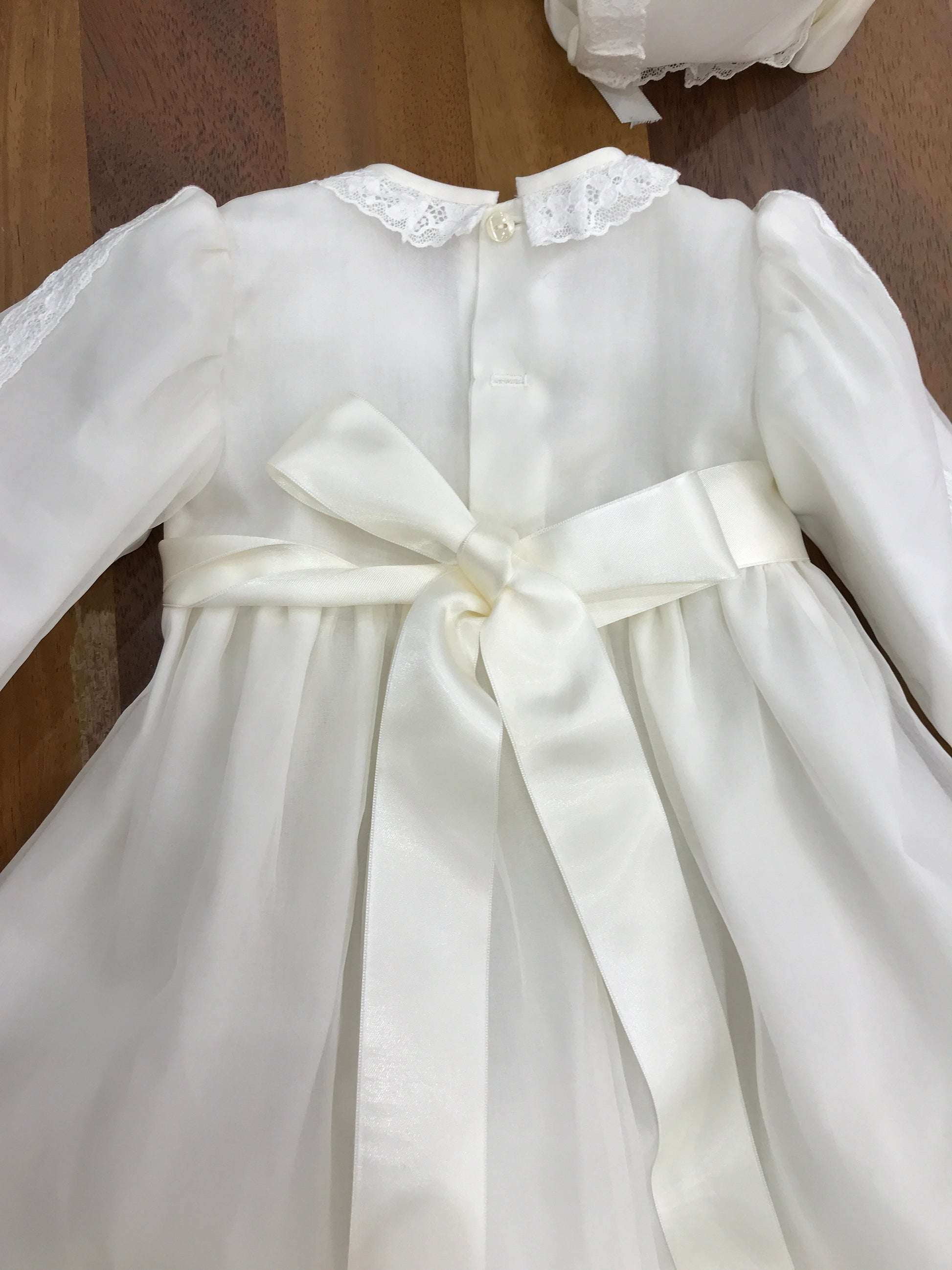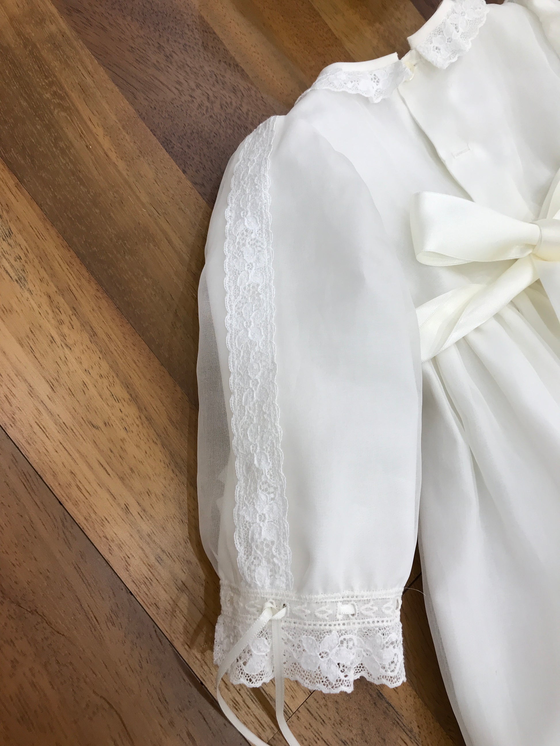 Abito lungo battesimale con maniche lunghe tutto in organza il corpetto è rifinito con merletto al collo e tutto sul davanti mentre la stessa lavorazione la ritroviamo sul gonnellone il tutto coordinato con la sua cuffia