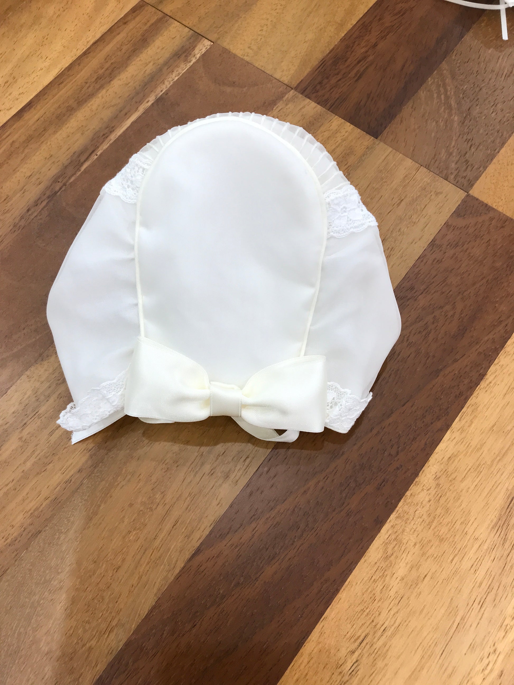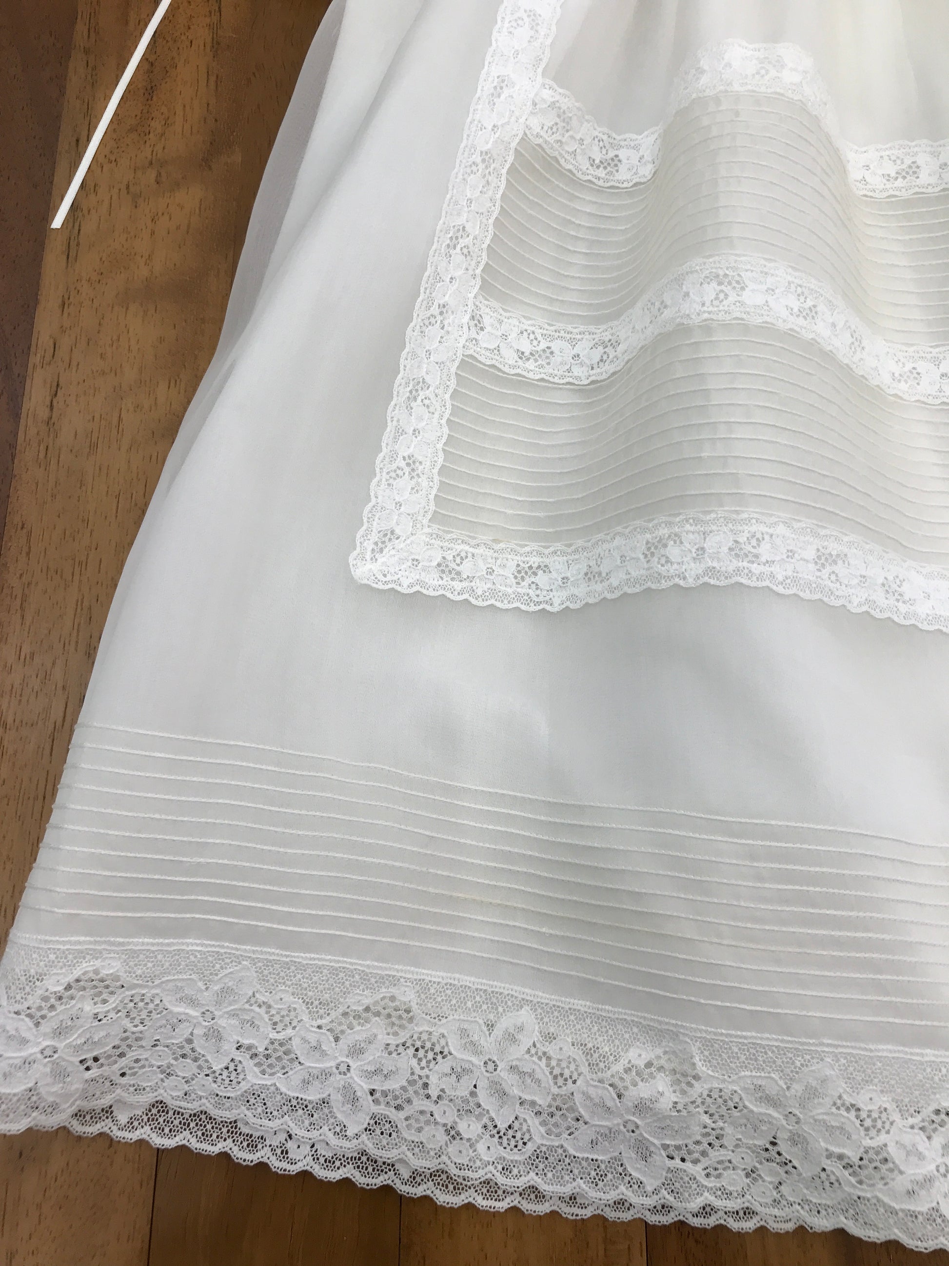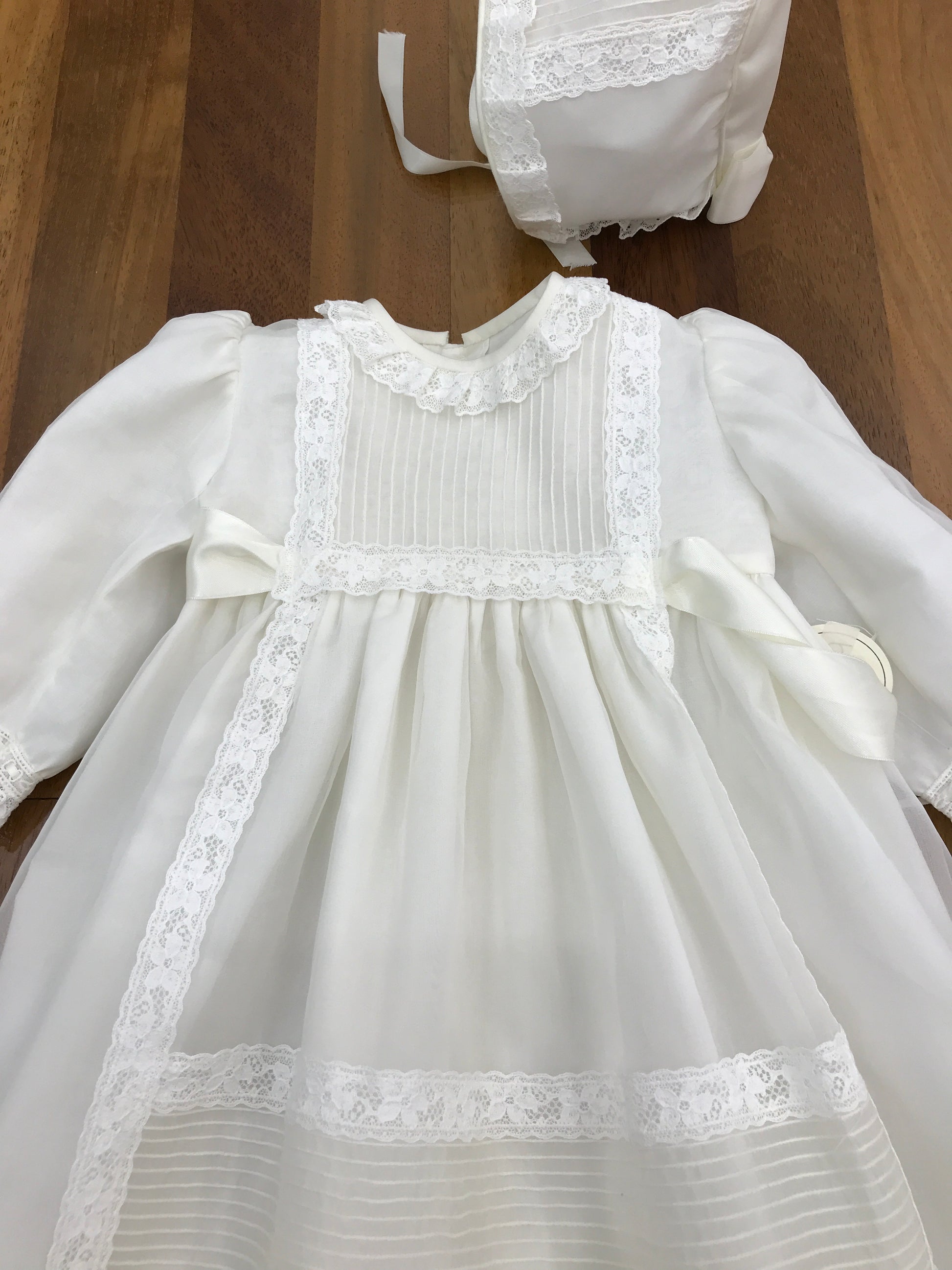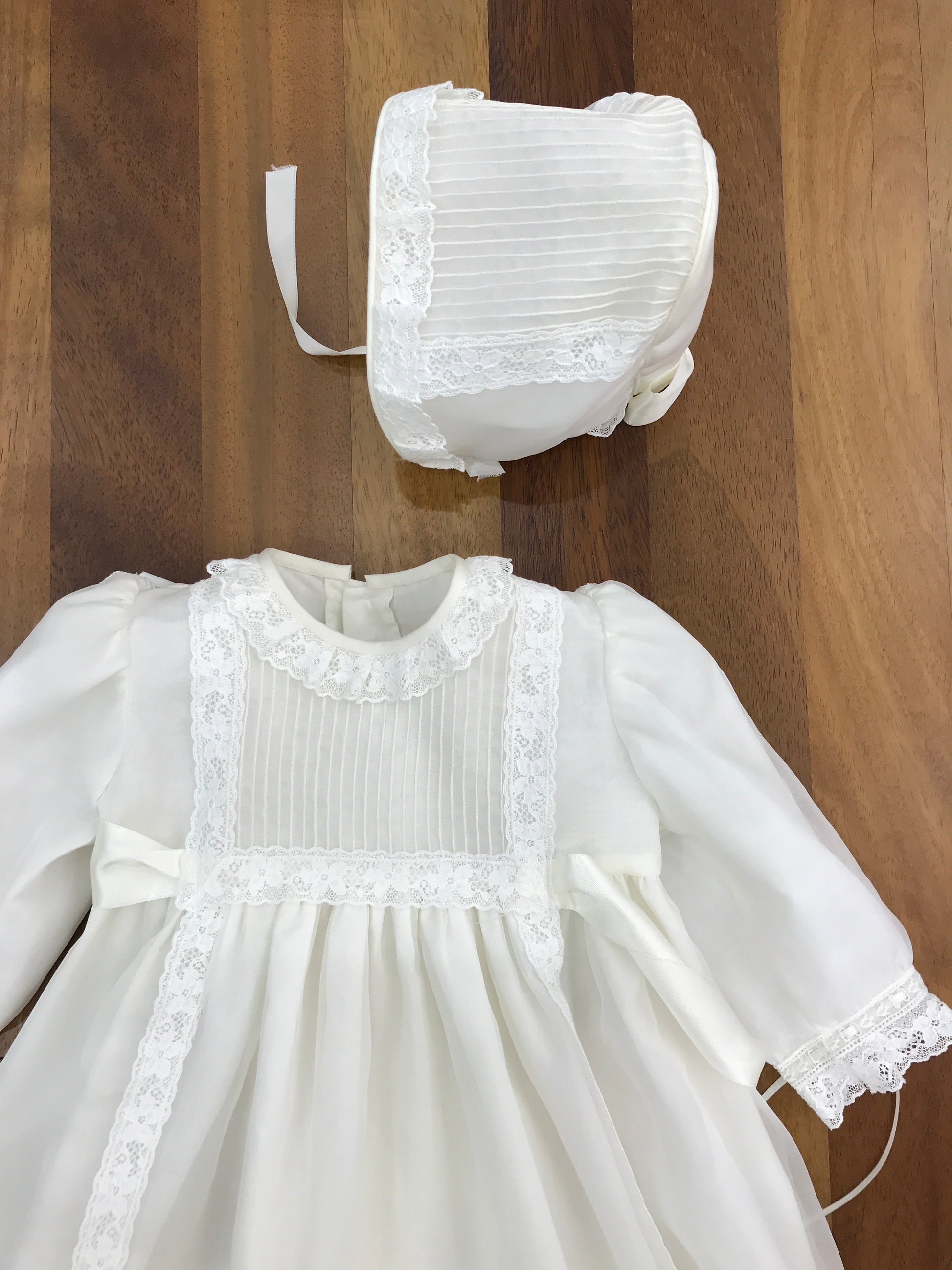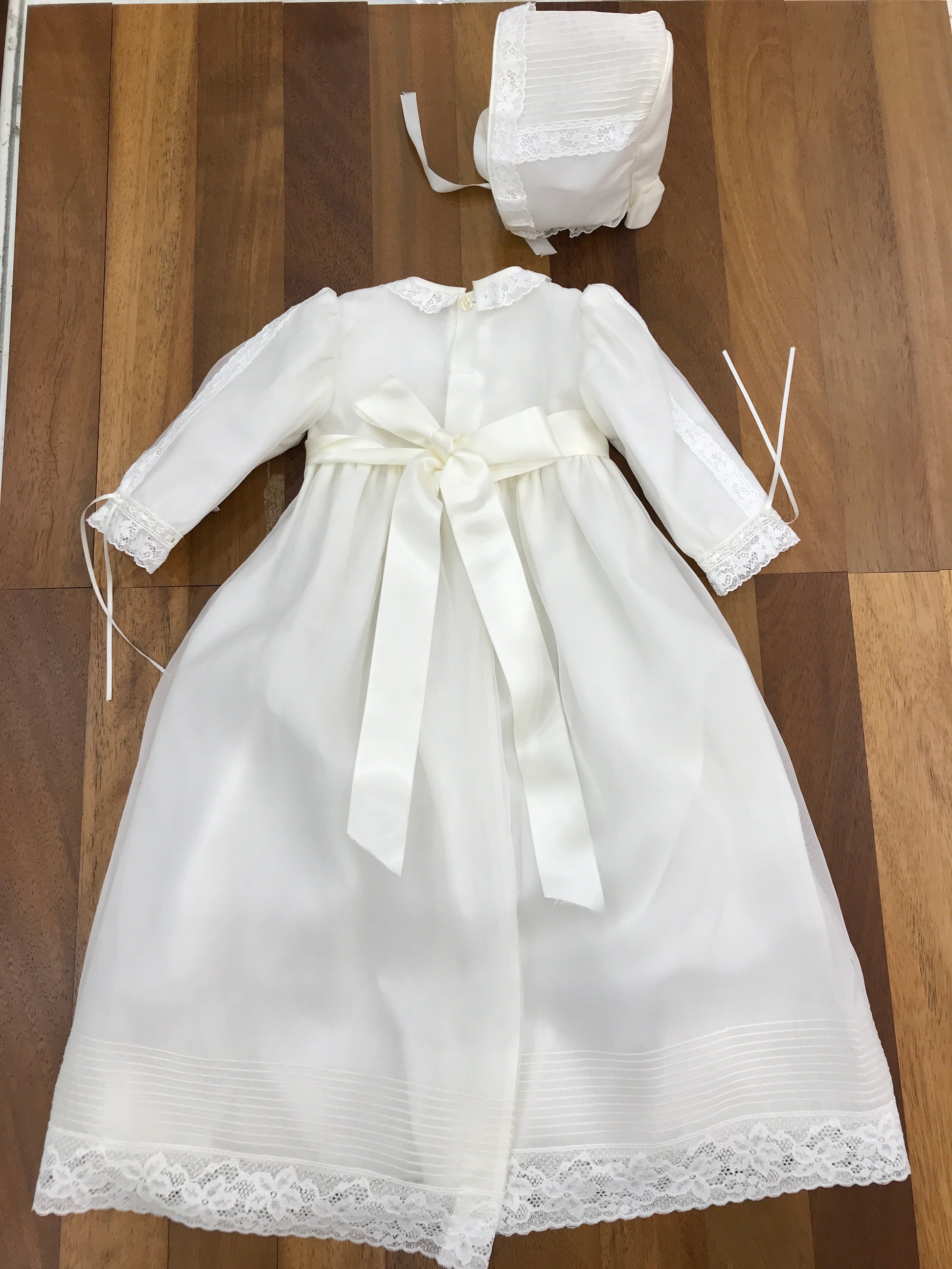 Abito lungo battesimale con maniche lunghe tutto in organza il corpetto è rifinito con merletto al collo e tutto sul davanti mentre la stessa lavorazione la ritroviamo sul gonnellone il tutto coordinato con la sua cuffia