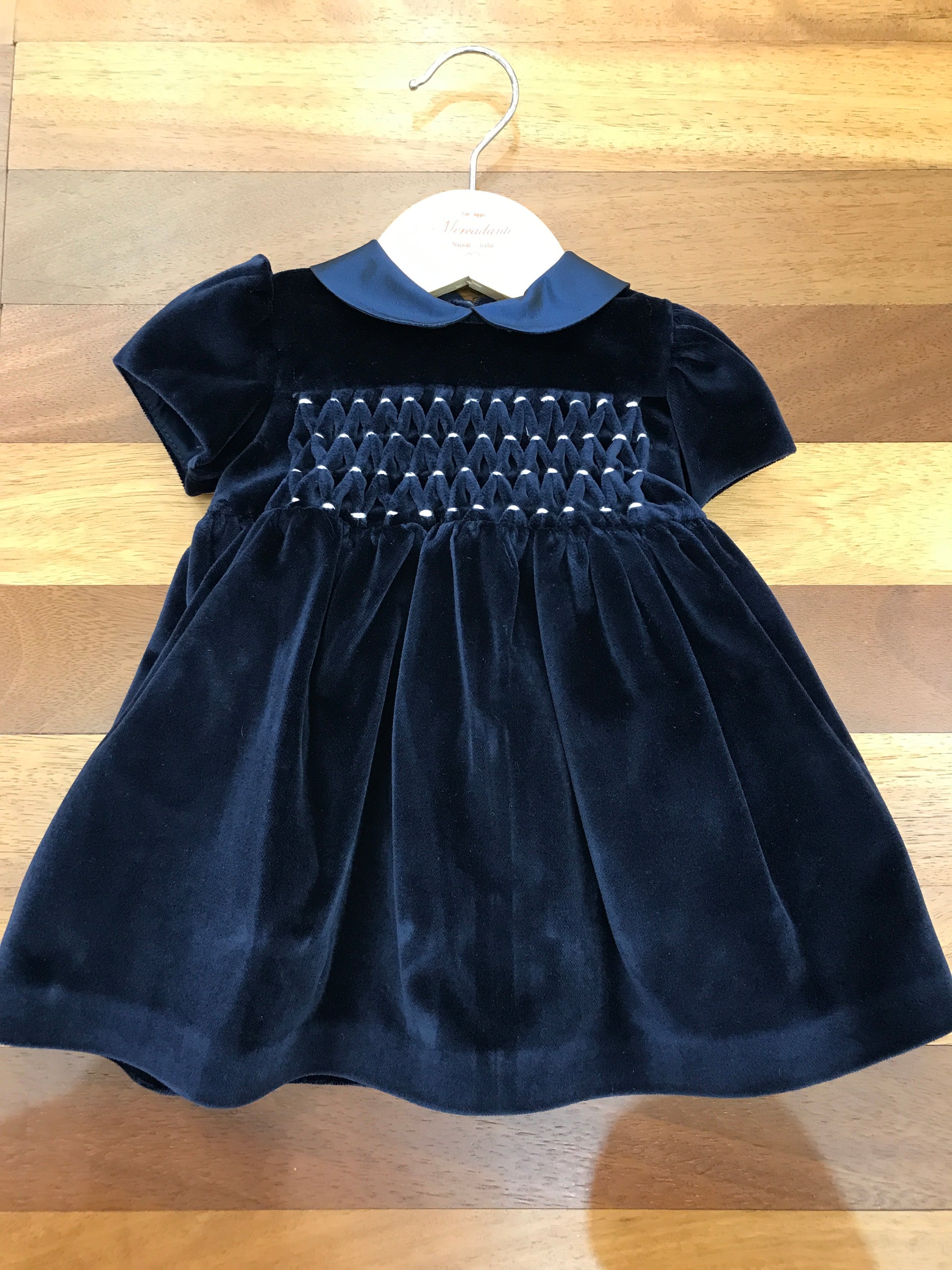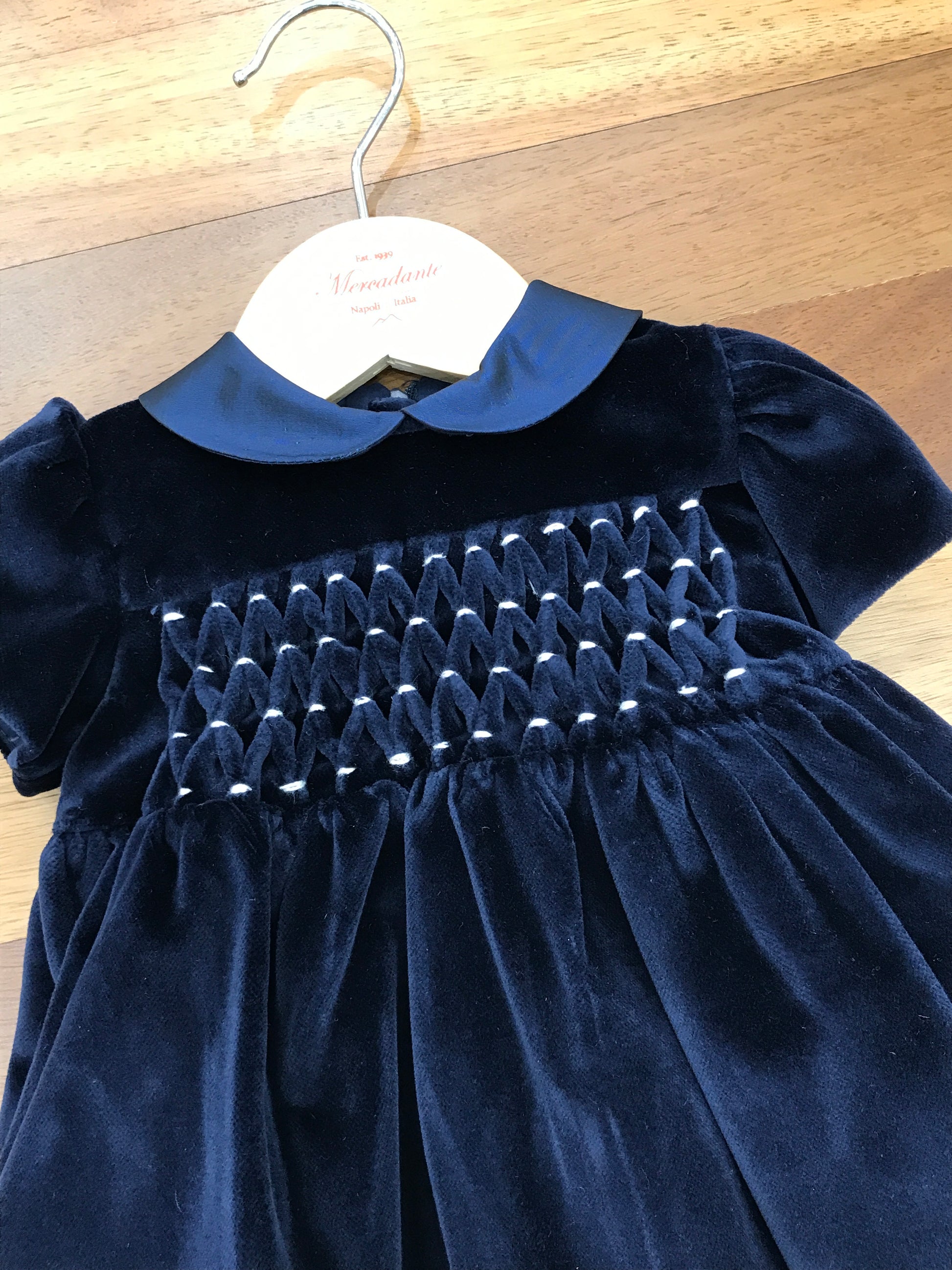 Questo elegante abitino in velluto blu scuro incarna la sofisticatezza con dettagli ricercati. La gonna in tulle aggiunge movimento e leggerezza, mentre le maniche corte a sbuffo conferiscono un fascino vintage. Il corpetto presenta un delicato lavoro a punto smock che arricchisce la texture, completato da un colletto in raso. Un raffinato fiocco sul retro conclude il design con un tocco di distinzione, rendendo questo capo perfetto per occasioni speciali.