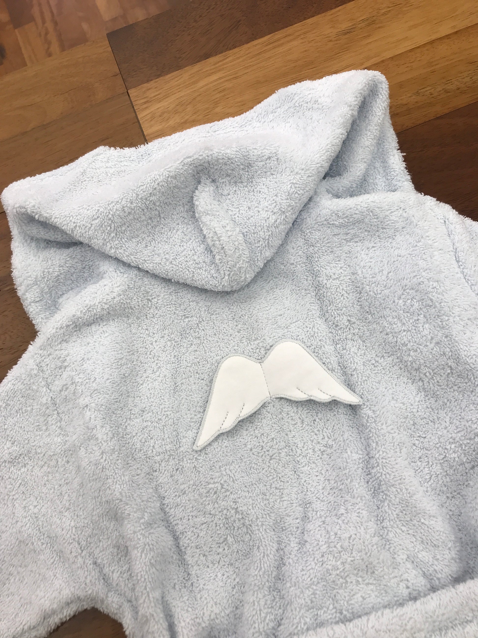 Realizzato in morbida spugna, questo accappatoio per bambini è progettato con un pratico laccio in vita per una vestibilità regolabile e un cappuccio che offre comfort e protezione dopo il bagnetto. A impreziosire il design, sul retro è applicata una decorazione con piccole ali, che aggiunge un tocco originale e giocoso al capo, rendendolo perfetto per i più piccoli.