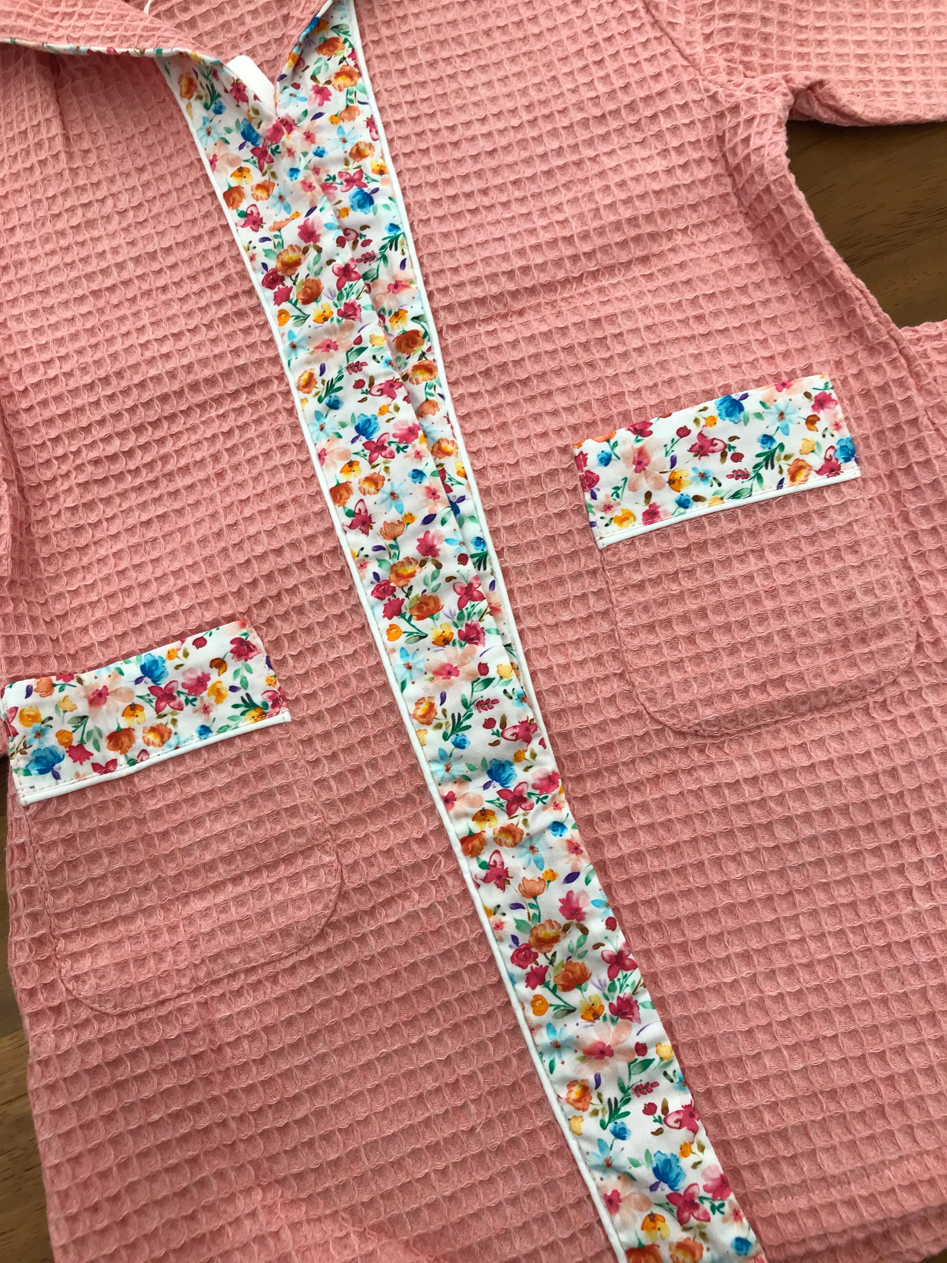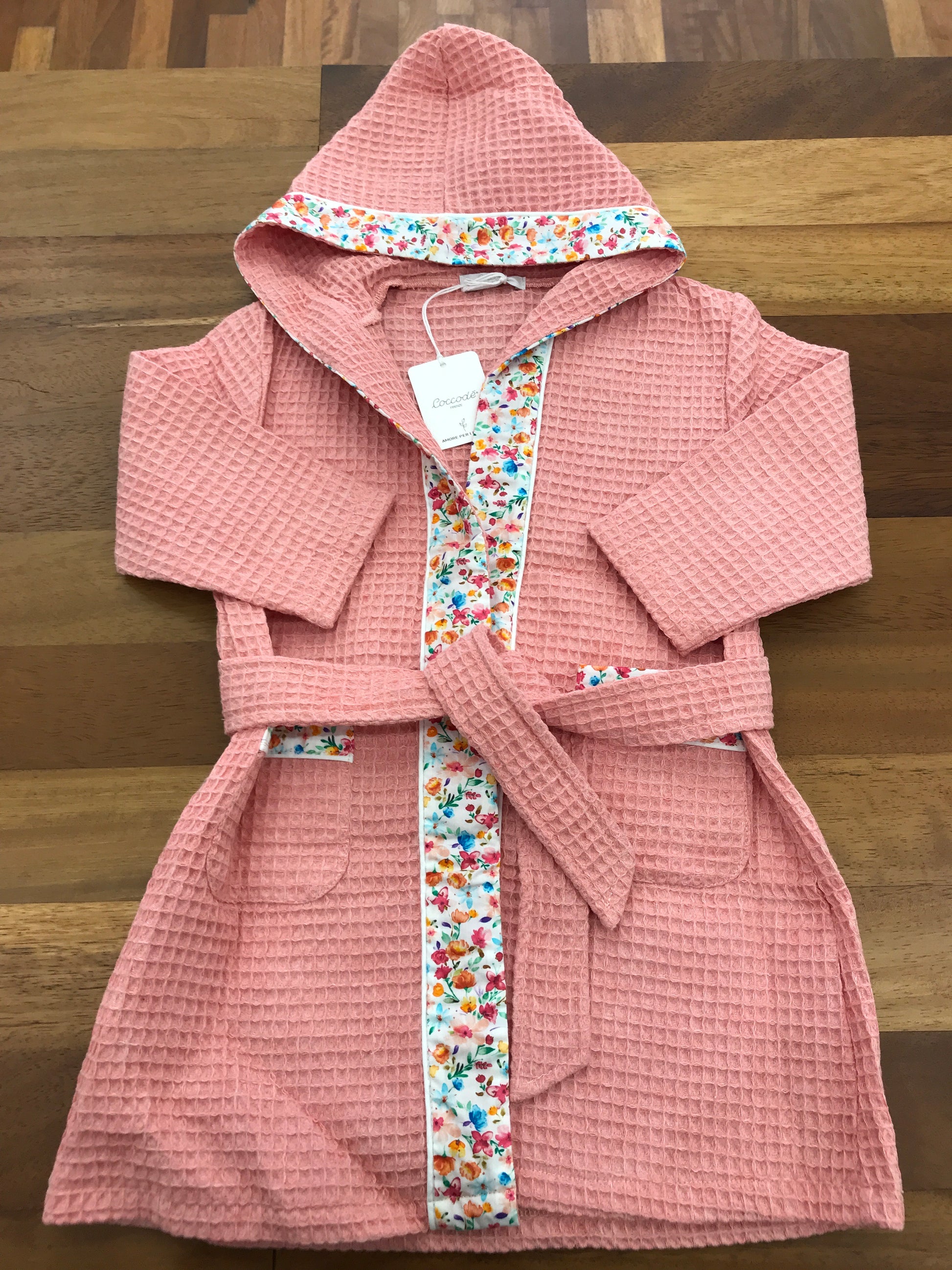 Accappatoio in spugna rosa caratterizzato da un laccio in vita che garantisce una calzata perfetta e un cappuccio per offrire maggiore comfort e protezione dopo il bagno. Il bordo anteriore è elegantemente decorato con motivi floreali, aggiungendo un dettaglio raffinato al capo. Completano il design due piccole tasche frontali, ideali per tenere a portata di mano piccoli oggetti, rendendo questo accappatoio non solo pratico ma anche piacevole da indossare.