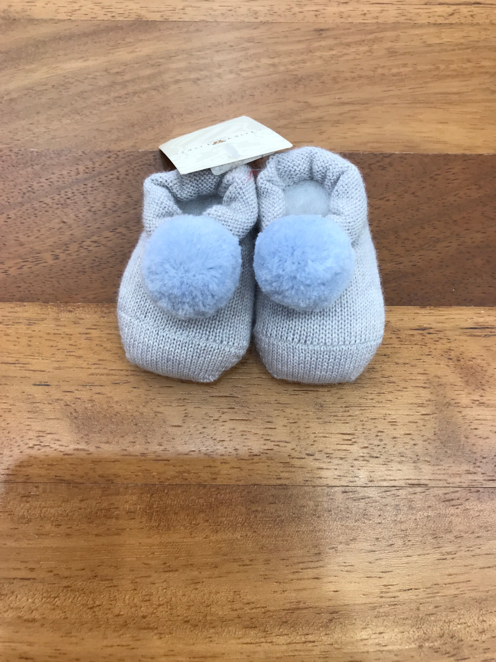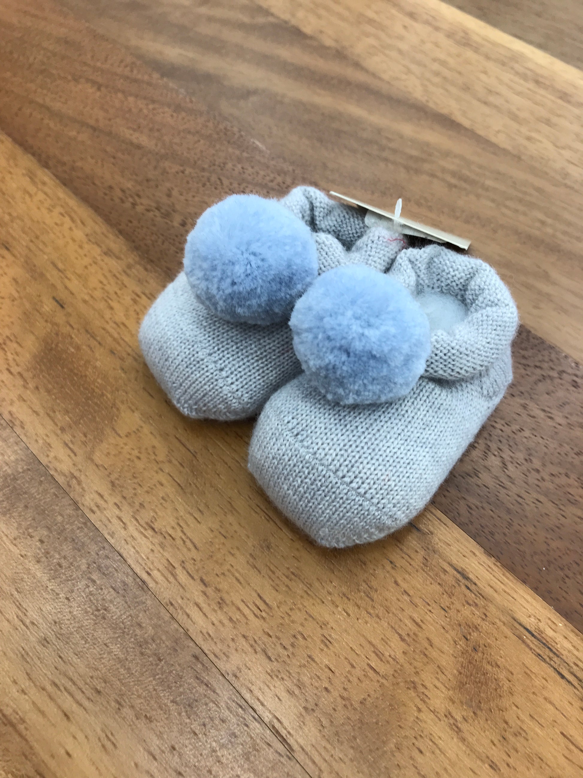 Morbide babbucce grigie in lana, decorate con un pon pon celeste sulla parte frontale.